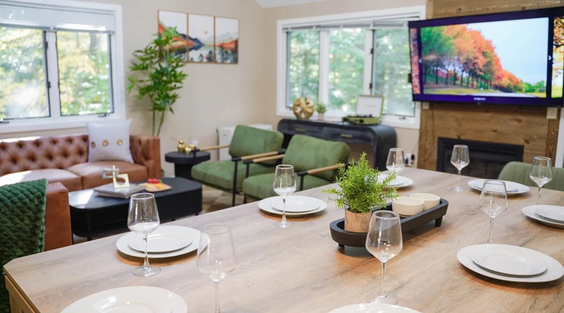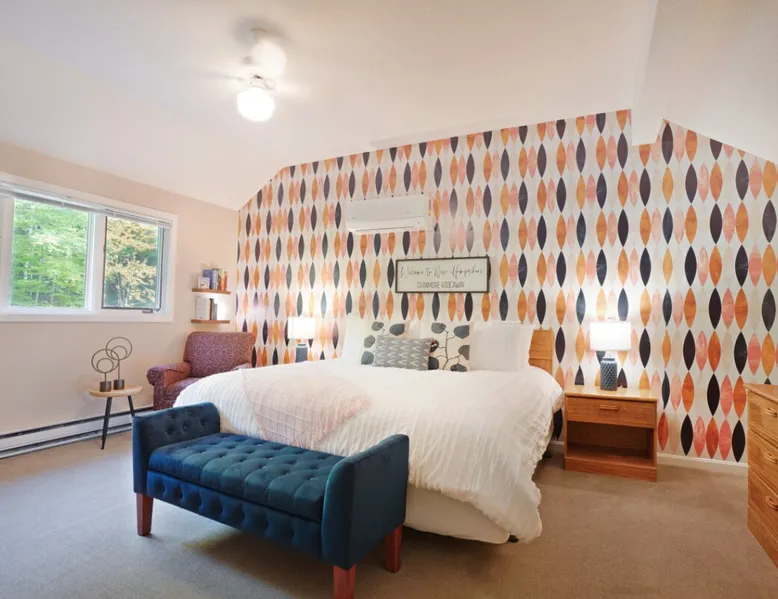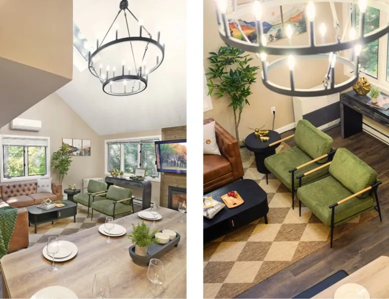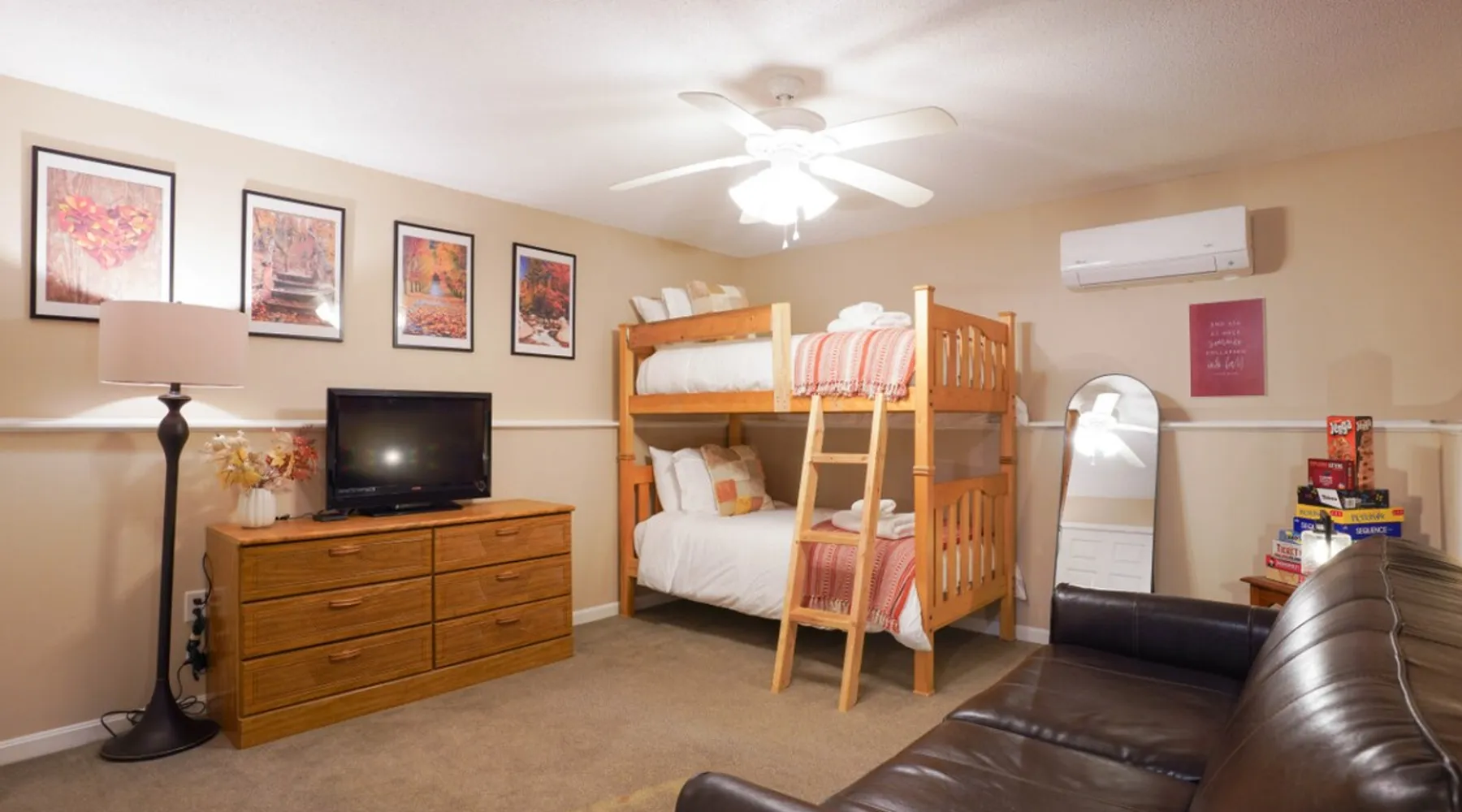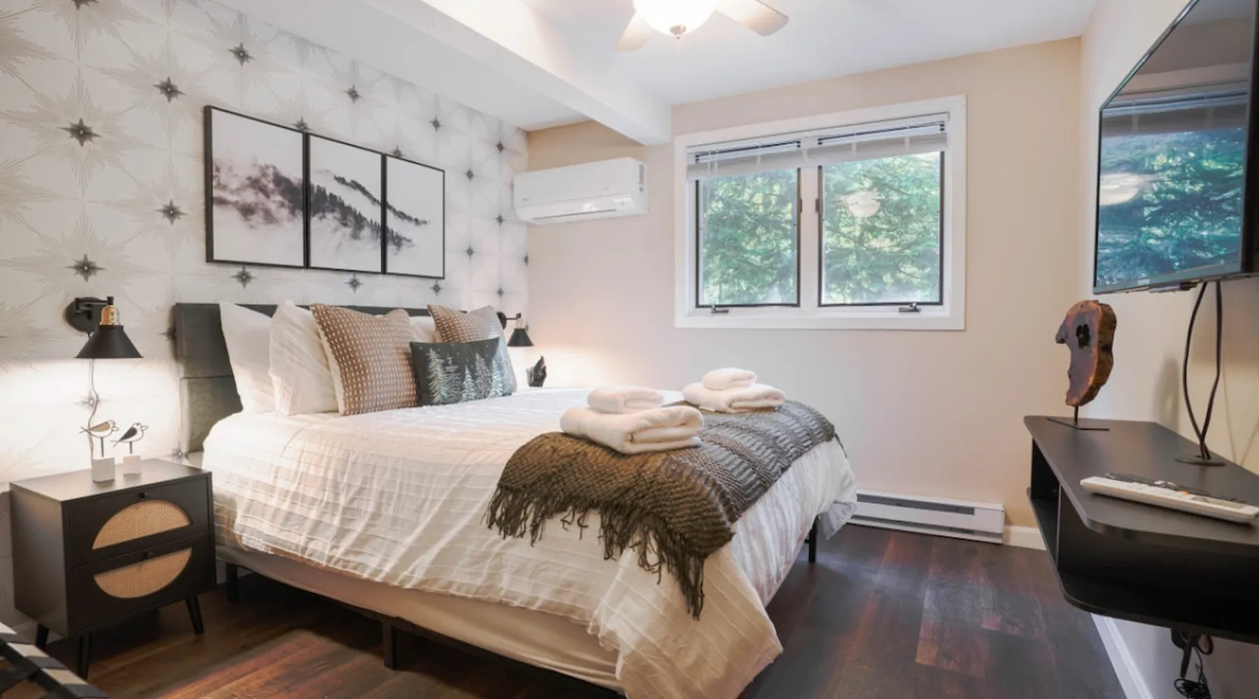 Welcome to Cranmore Hideaway — a cozy, newly designed 3-bedroom, 2-bath townhome tucked away in the heart of North Conway. Surrounded by peaceful forest views, this charming retreat offers the perfect blend of rustic character and modern comfort, ideal for families, couples, or small groups year-round. The space Whether you're visiting for a snowy ski getaway, a vibrant fall foliage tour, a summer hiking adventure, or a springtime escape, you'll find comfort and inspiration here. Just 5 minutes from Cranmore Mountain Resort and close to downtown's shops, restaurants, and attractions, the location is perfect for exploring everything the White Mountains have to offer. After a day of adventure or relaxation, return to your private deck and unwind in the fresh mountain air. Cranmore Hideaway is your four-season sanctuary — book your stay today and make lasting memories in every season. This 3-level townhome is the perfect family-friendly retreat for your next White Mountain adventure, offering 3 bedrooms and 2 baths, with sleeping arrangements for up to 8 guests. Thoughtfully designed for comfort and relaxation, this cozy escape provides plenty of space for everyone to spread out while making the most of your time together. Main Level: The main level features an open-concept kitchen and living area with soaring vaulted ceilings and gorgeous wagon wheel chandelier. The living room boasts a wood-accented gas fireplace, creating a perfect spot to relax after a day on the slopes. This level also includes a bedroom (queen) and bathroom, along with a cozy coffee bar stocked with local brews for your enjoyment. Upper Level: The entire upper level is a large primary bedroom (king) suite with a bathroom, a standing shower and separate soaking tub for apres-ski relaxation. Lower Level: It includes bunk beds (twin over twin) and a full sofa bed, offering additional sleeping space. This area can also serve as a second living room, perfect for playing games or watching TV. Amenities include fully stocked kitchen, furnished bedrooms, smart TV (in living room and all bedrooms), central heating, split ACs in all rooms and exclusive access to the community's tennis court and playground. DINING AREA + GAME SPACE: We have a lovely dining nook (seats 8) where you can enjoy a relaxed meal or enjoy board games with your family and friends. The nook includes billiards, table tennis, and a dining table with dual storage bench seating (all in one). Challenge your companions to various games for a laid-back evening indoors. PARKING: House comes with 2 car dedicated parking spots (right outside the house) KITCHEN + COFFEE BAR When it's time to refuel, the fully equipped kitchen provides everything you need to whip up delicious meals and snacks. Enjoy your culinary creations at the dining table. Our coffee station provides a variety of local brews and teas. OUTDOOR: Step right outside from the main living area to a charming porch, perfect for summer dining or enjoying a BBQ grill session. ABOUT THE LOCATION: After a day of outdoor fun, come home to unwind by the cozy gas fireplace. Whether you're here for skiing, hiking, or simply soaking in the serene surroundings, this condo is the perfect base for your Conway adventures. Book now for a memorable mountain escape! ADDITIONAL: We do have video surveillance of the front door, parking and backyard which helps us in maintaining the property from a distance. The video is motion activated, but can be checked at any time by the hosts via live feed. Any attempt at disabling or obscuring the cameras is prohibited. PETS: - Up to 2 pets allowed ($100 fee per stay). Approval needed for more, with extra fees. - Keep pets leashed while walking in the neighborhood. - No unattended pets - No pets on furniture (sofas, beds, etc). - Clean up after them inside and outside - Prevent excessive barking or noise. While $100 pet fee covers extra cleaning, but additional charges apply for uncollected pet waste, soiled linens, or damaged furniture. Thanks for keeping our space pet-friendly for all! SMOKING/DRUGS POLICY This is no smoking and no drug use house. Use of such is strictly prohibited inside or outside on premises. $500 fee for evidence of smoking or drug use plus additional cleaning fees apply. The nightly rates are reflective of minimum guest booking with no pets. We request you to add the exact count of guests, children and pets at the time of reservation for the nightly rates to be accurately reflected for any additional charges.