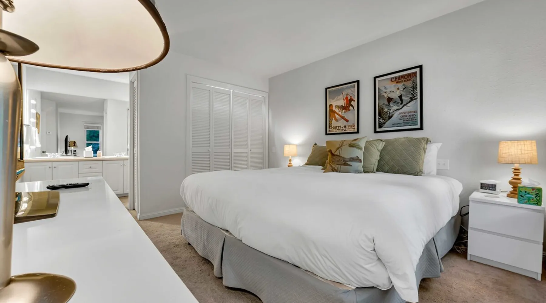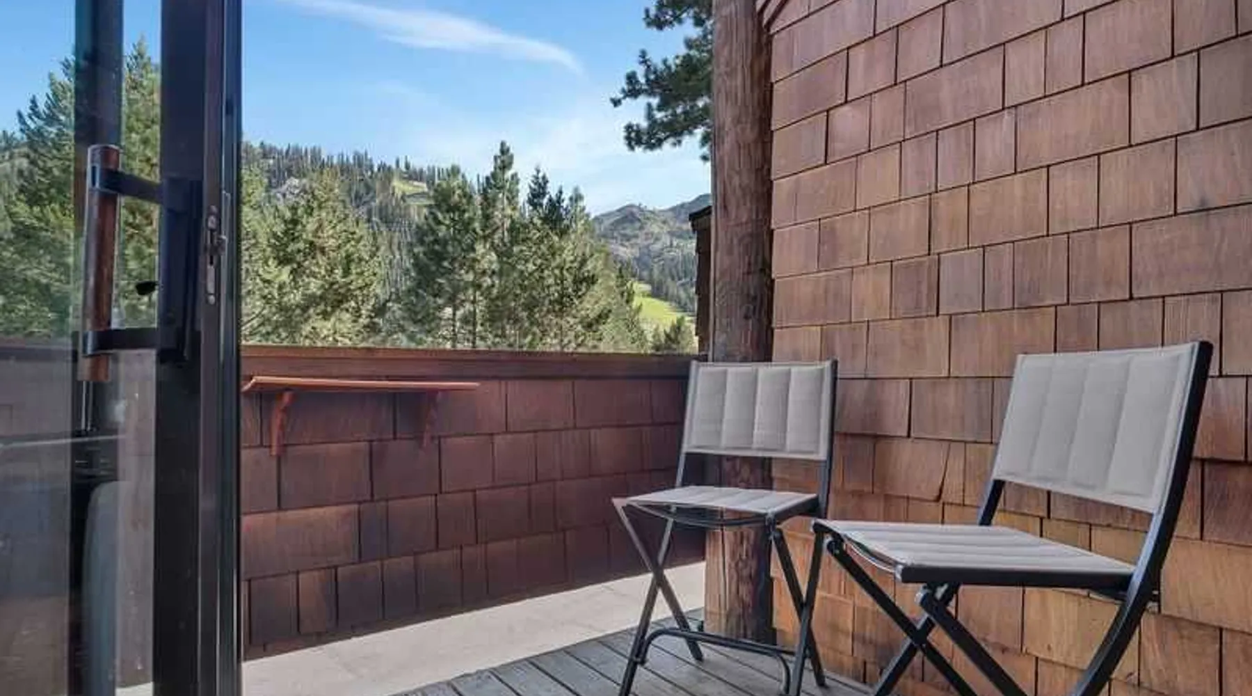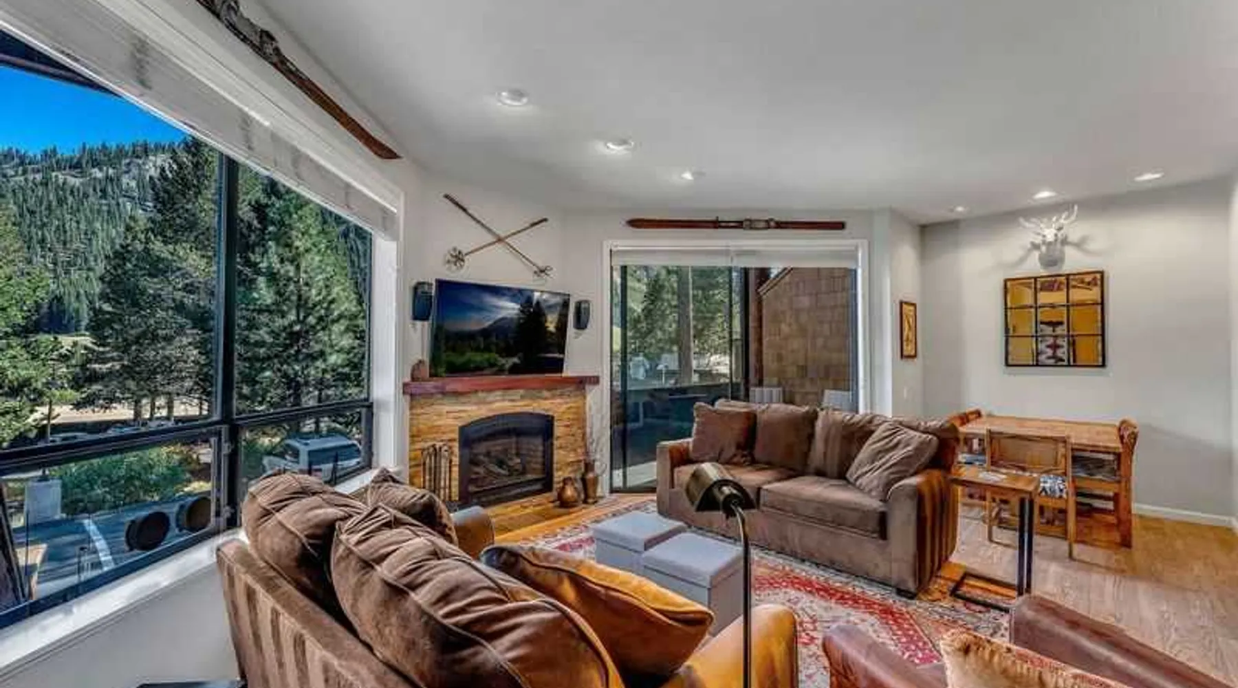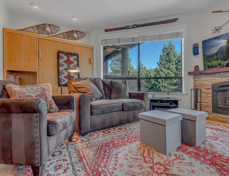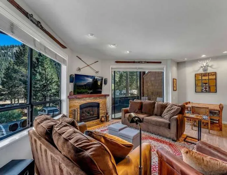 The ultimate Palisades Tahoe vacation rental! This bright 2-bedroom condo places you within walking distance of both the slopes and shops of Palisades Tahoe. Catch a ride on the FREE shuttle, the Mountaineer, which stops just outside your door and be at the Village & lifts within 1 to 2 minutes. After a day of adventure, relax in the plush living room, warm up by the gas fireplace, and enjoy the views through large windows that frame beautiful mountain scenery. The space Location perks: 700 yards to ski lift, The Village at Palisades Tahoe (0.4 miles), Olympic Valley Park (1.9 miles), Alpine Meadows (5.5 miles), Tahoe City (7.1 miles), Commons Beach (7.3 miles) Interior: - Well-equipped kitchen (drip coffee maker, Nespresso, waffle maker) - 5-person dining table - Gas fireplace - Boot dryers - Washer and dryer - Central heating, no A/C Exterior: - Step-out balcony - View of Palisades Tahoe - 700yards to ski lift! Main Level: Living room, kitchen, 2 bedrooms, 1 en suite bath, 1 full bath This inviting Palisades retreat is the perfect home base for year-round fun in Tahoe! Situated in a stunning setting, nature enthusiasts will love the surroundings, and your entire group will appreciate the convenience of being within walking distance of the ski lifts and bustling village at Palisades Tahoe. As you step inside, you will be greeted by a spacious entryway, complete with a large closet featuring a boot dryer, making it easy to unload your outdoor gear before settling in. The bright shared living space is filled with natural light from large windows that frame impressive views of Palisades Tahoe. This area seamlessly blends the living room, dining room, and kitchen into an open layout perfect for groups to stay connected. The living room features breathtaking mountain views, 2 couches, a 46” TV, and a gas fireplace. This space can also serve as an additional sleeping area with a full Murphy bed. From the living room, step out onto the balcony to enjoy the fresh mountain air, or head into the well-equipped kitchen where you will find everything needed to prepare home-cooked meals to share at the 5-person dining table. Down the hallway from the living area, you will find 2 bedrooms, providing a great separation of space for added privacy. The master bedroom is an inviting space with a king-size bed, dresser, closet, a 42” TV, and an en-suite bath featuring a double-sink vanity and a bathtub/shower combo. Adjacent to the master is the guest bedroom, perfect for sharing, with 3 twin beds including a twin-over-twin bunk bed and a twin Murphy bed. Down the hallway, you'll find a laundry closet with a stacked washer and dryer and a shared bathroom with a spacious single-sink vanity and a step-in shower. STR License Number: STR24-8930 Max Occupancy: 6 Parking Info: There are 2 parking spaces available. 1 in the assigned carport and 1 in the shared parking lot. Guest access Guests have access to the entire home and to 2 parking spaces, 1 in the assigned carport and 1 in the shared parking lot. Other things to note Please note that like most homes in the area, this home does not have A/C. Please keep in mind that if you plan to ski, you are responsible for verifying the ski resorts' opening and closing dates. Registration Details STR24-8930