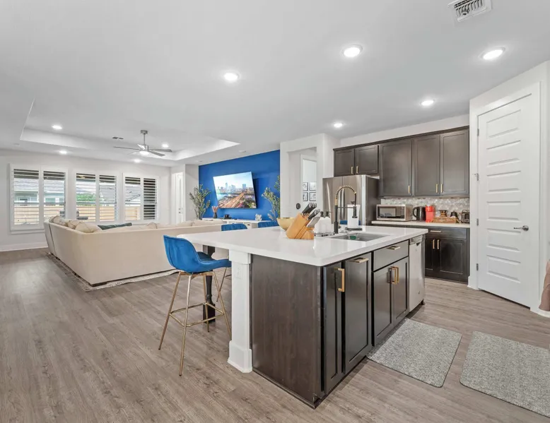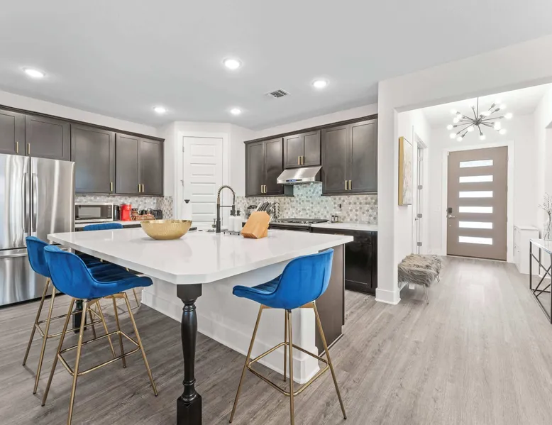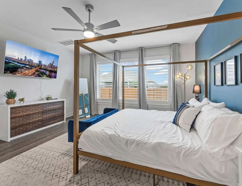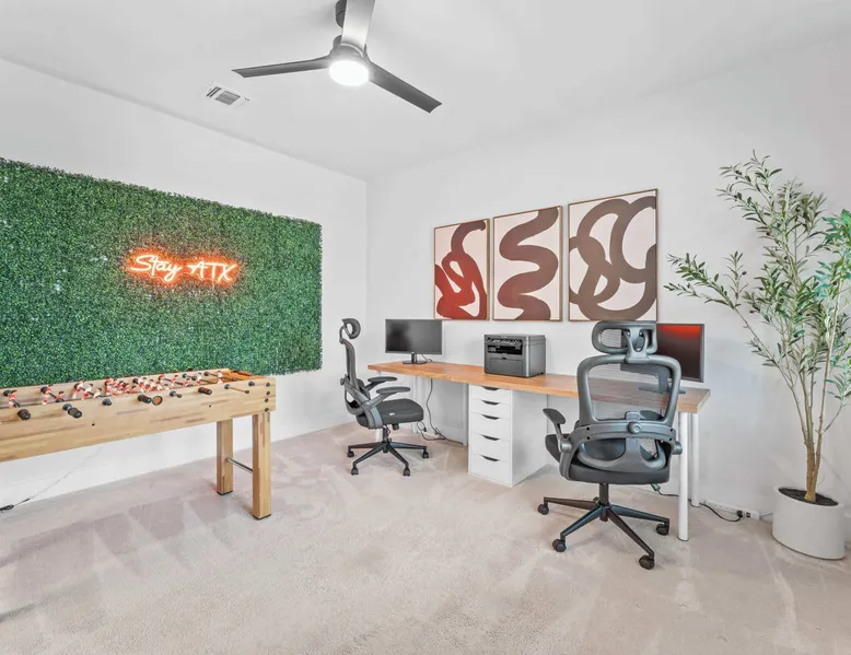 Summary: Welcome to your new home in Easton Park - adjacent to McKinney Falls State Park, an urban state park that is home to waterfalls, hiking trails, camp sites, and minutes from CotA, DT, and the airport. Our 2,475 sqft house is pet-friendly (pet fees apply) and comes with a fully-stocked kitchen, & ultra-fast internet to accommodate you in the modern times. ► CotA Race Track - 16 min. drive ► Downtown (Rainey Street) - 18 min. drive ► Zilker Park / ACL - 22 min. drive ► Airport - 13 min. drive The Space: Vibrant locality, home-inspired design, and redefined simplicity; these are the design principles that we aim to achieve when creating this space that you will be calling home during your stay with us. Working, relaxing, or living to the fullest, our spaces have all the essentials you (and your pets!) need for your stay in Austin. ** Please note that only 4 cars are allowed to be parked at the house at any given time. If your group has more than 4 cars, please make sure to make plans to consolidate everyone into 4 cars. If you have questions about parking, please send us an inquiry! ★ Comfort ★ - King-sized bed in master bedroom), king-sized bed in second master bedroom, 2 full beds in each of the other 2 bedrooms w/ 12” memory foam mattresses, memory gel & gusseted pillows, down comforters, and ultra-soft linens - Oversized, super comfortable sofa with chaise great for the whole group to relax together and watch movies - Central air conditioning and heat - Fresh towels and bathroom essentials - Professionally cleaned prior to your arrival - En-suite / On-site laundry - Complimentary coffee and tea w/ Keurig machine and pour-over coffee - Free onsite parking on driveway and street curb - Fully-equipped kitchen with pots & pans, bakeware, dinnerware, silverware, cookware, blender, toaster, rice cooker, and more! - Backyard patio - Pet-friendly so that you can bring your favorite fur babies (pet fees apply, please see house rules) ★ Work & Entertainment ★ - Ultra-fast WiFi with the latest in router technology enabling optimal productivity when working from home - Roku-enabled 85” smart TV in living room with complimentary access to live cable (YouTubeTV), Disney+, Amazon Prime Video, HBO Max, Hulu, and ESPN+ for all your binge-watching needs - Roku-enabled 65" smart TV in master bedroom and 55" smart TV in second master bedroom (no complimentary access to streaming apps for bedroom TVs, guests' own account required) - Party games and video games (PS4) for your family and friends to enjoy - Community playgrounds, miles and miles of beautiful walking/running tralis, and food truck court with amazing food only a short walk away - Dedicated office space with 2 workstations w/ 24" monitors, laser black-and-white printer (USB cable connection and software driver on guest computer required to print, * printing paper not included and must be purchased by guests *), ergonomic desk chairs, and foosball table for that much needed down time ★ Space Layout ★ - 4 bedrooms - 3.5 bathrooms - 2,475 sqft - Single-story home, no stairs ★ Service ★ - Contactless self-check-in and checkout - 24/7 virtual support with instant communication and responsiveness Guest Access: All guests have access to the entire property, including the community amenities such as the various playgrounds, walking and hiking trails, and food truck park. The Neighborhood: This neighborhood is a serene suburb-like neighborhood located in Southeast Austin, right next to McKinney Falls State Park. It is located on a hill and can provide great hilltop-like views of Downtown Austin and the Texas Hill Country from the neighborhood park that's within a 2-minute walk (amazing for catching the official annual Austin city fireworks show if you are here for July 4th). Miles and miles of walking and hiking trails weave through the neighborhood and the community parks provide great entertainment for adults and children alike. Getting Around: We recommend that guests rent a car during your stay in Austin as many of Austin’s best attractions and fun things to do are scattered around the city and much more convenient when accessed by car. While there are certainly public transportation options such as buses and individual transportation options such as scooters/bikes/mopeds, these options are mainly convenient and readily available around the downtown Austin area and quickly becomes sparse even a couple miles outside of city center. Rideshare apps such as Uber and Lyft are also great options but expenses can quickly add up as Austin rideshare rates are on the higher end and can surge very high during busy times, such as 2AM on weekends and during large events such as SXSW, conferences, F1, etc. Other Things to Note: ★★★ PRE-STAY GUEST VERIFICATION IS REQUIRED ★★★ To abide by all legal requirements and property security rules, you may be asked to provide a copy of your official government-issued photo ID, confirm your contact information, pass through our verification portal, and/or, in some instances, complete a criminal background check. Important note: The information is collected for screening and verification only and is not stored or used for any other purposes. Please be advised that all guests will be asked to sign a rental usage agreement that governs the terms of the stay. By completing the reservation you agree to the following: « You agree to be bound by our rental terms and conditions. « You acknowledge that you will be required to provide a copy of a valid government-issued ID prior to check-in. « You acknowledge that you may be required to undergo a background check if mandated by the property management company or the owner, as stated in accordance with your rental agreement and condition of the booking. « You understand that your check-in instructions might be withheld until you have successfully completed our verification portal. All guests are subject to verification checks and are 