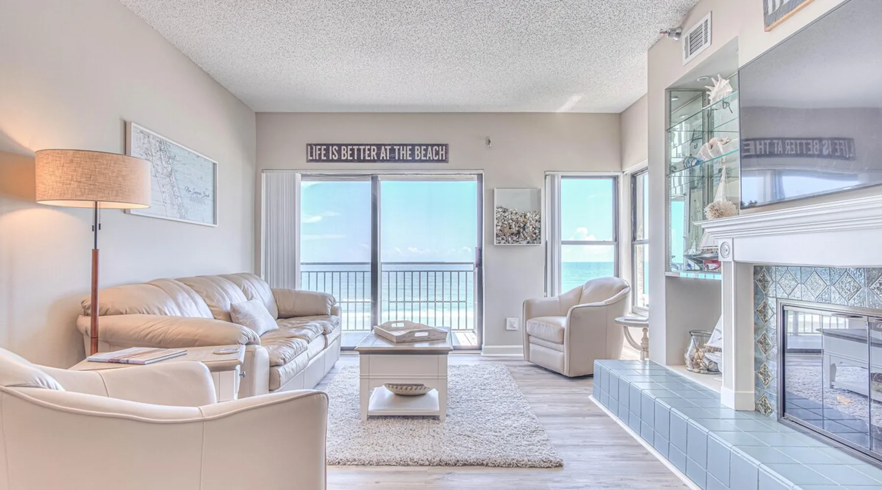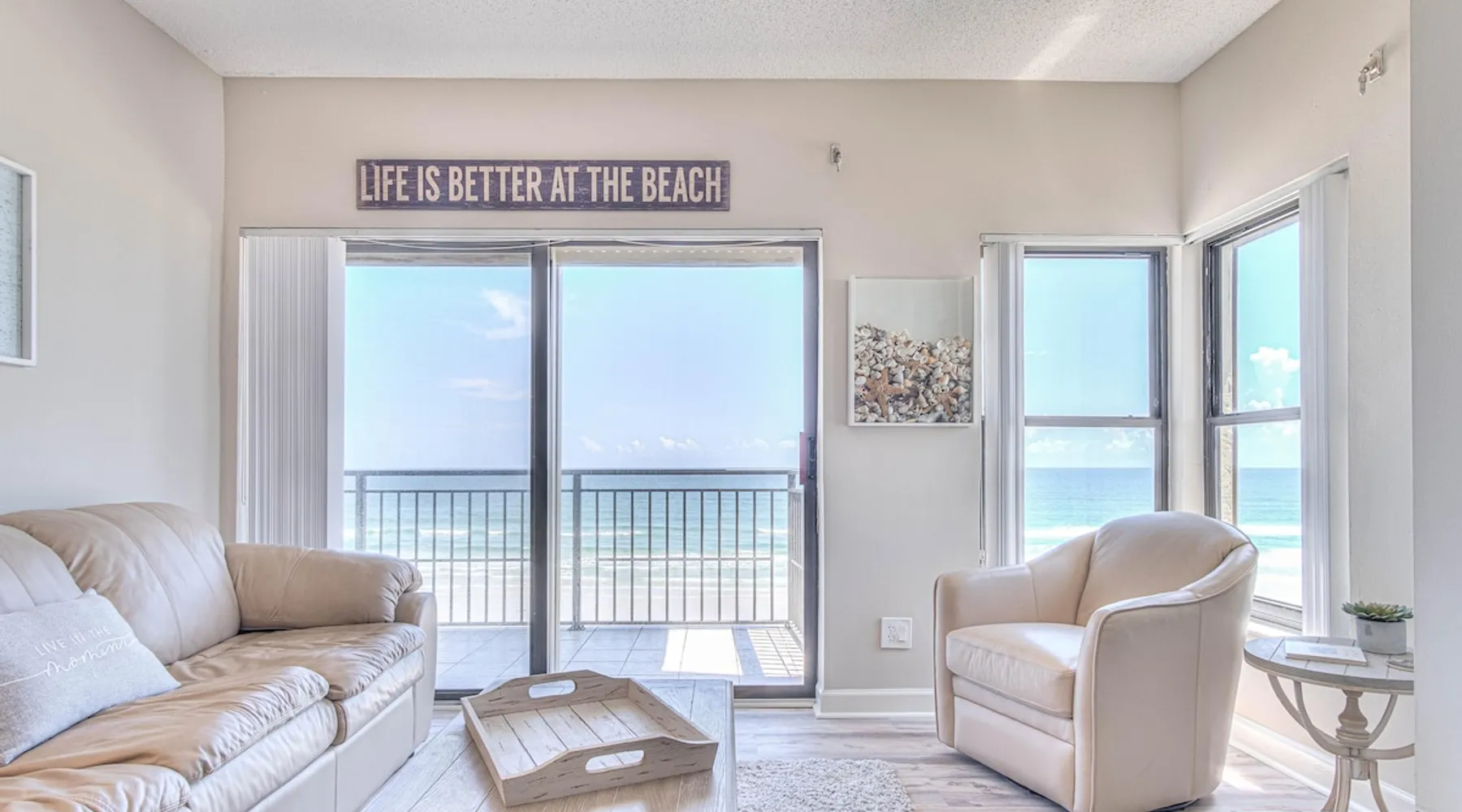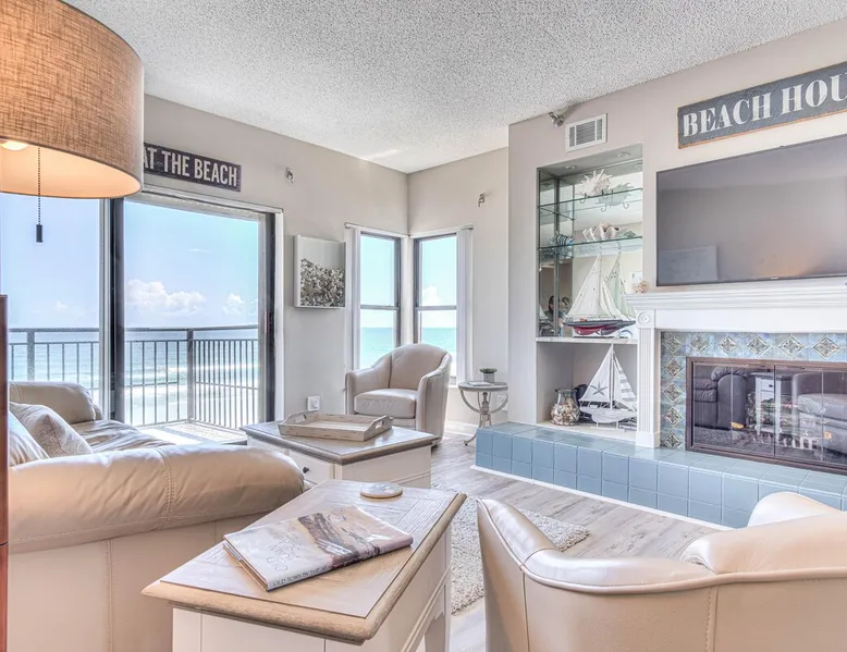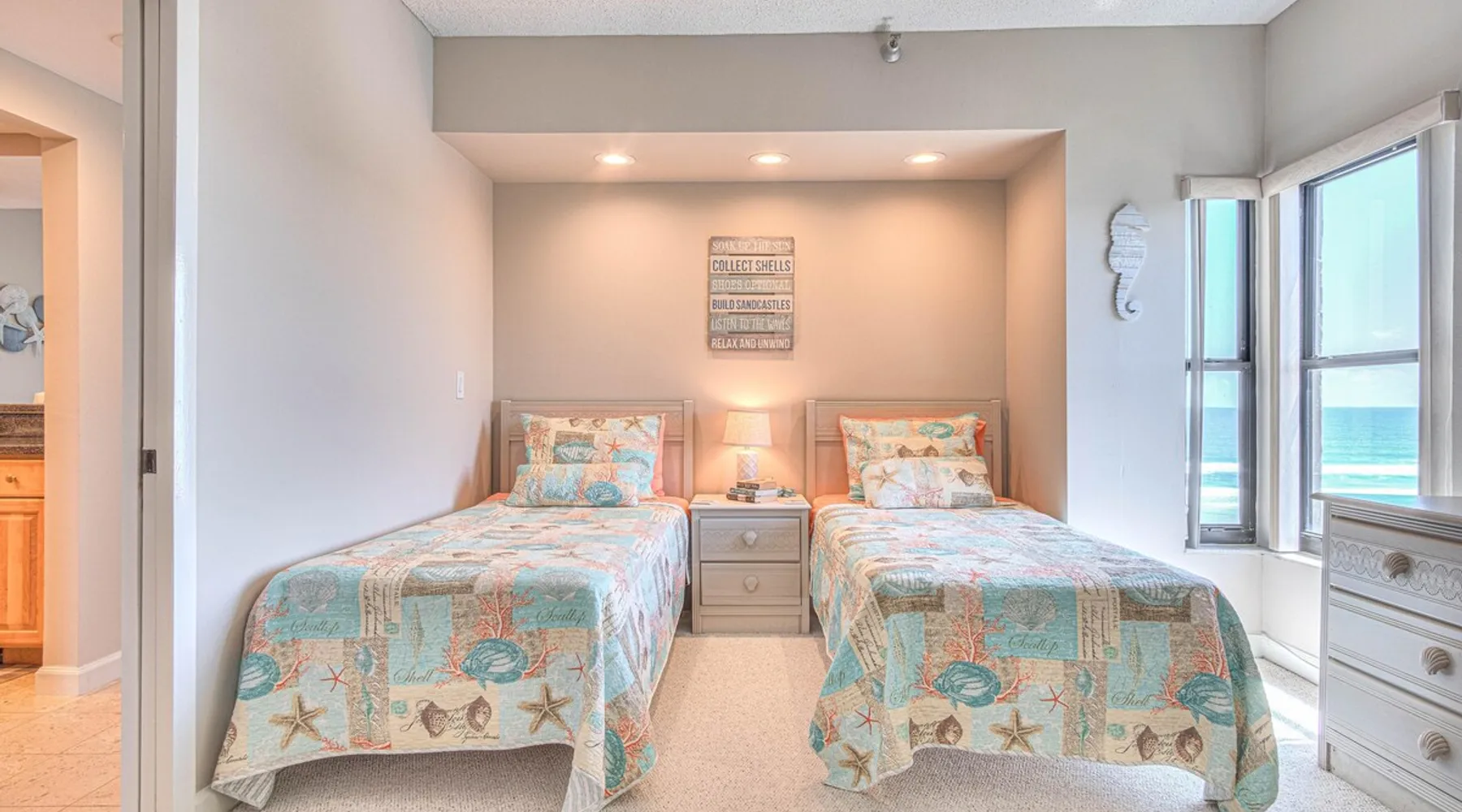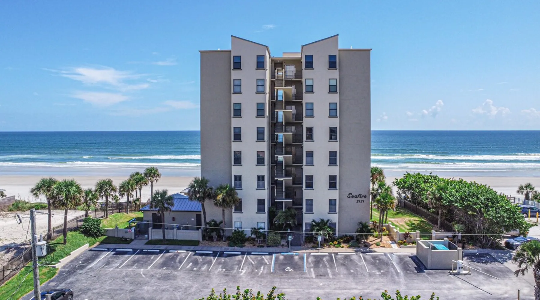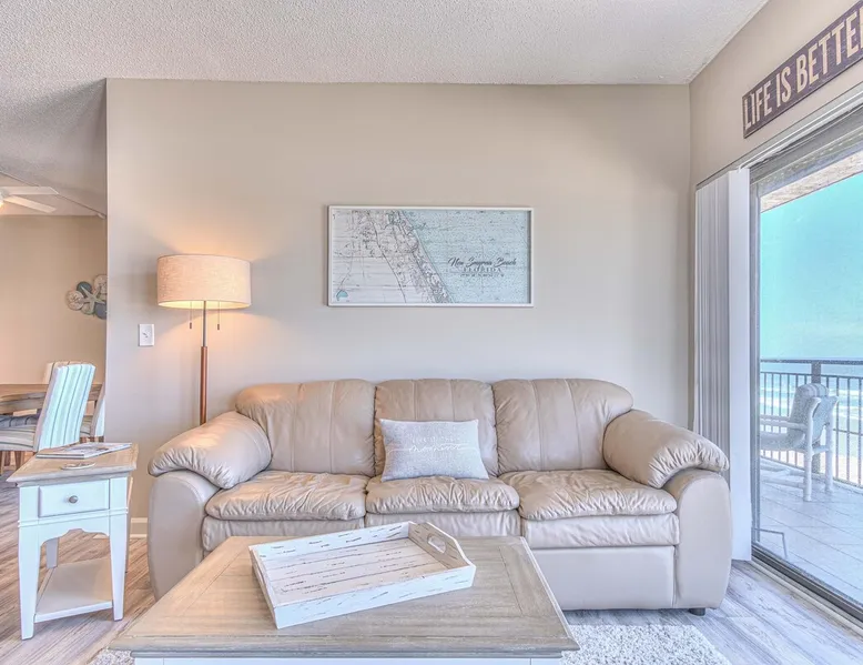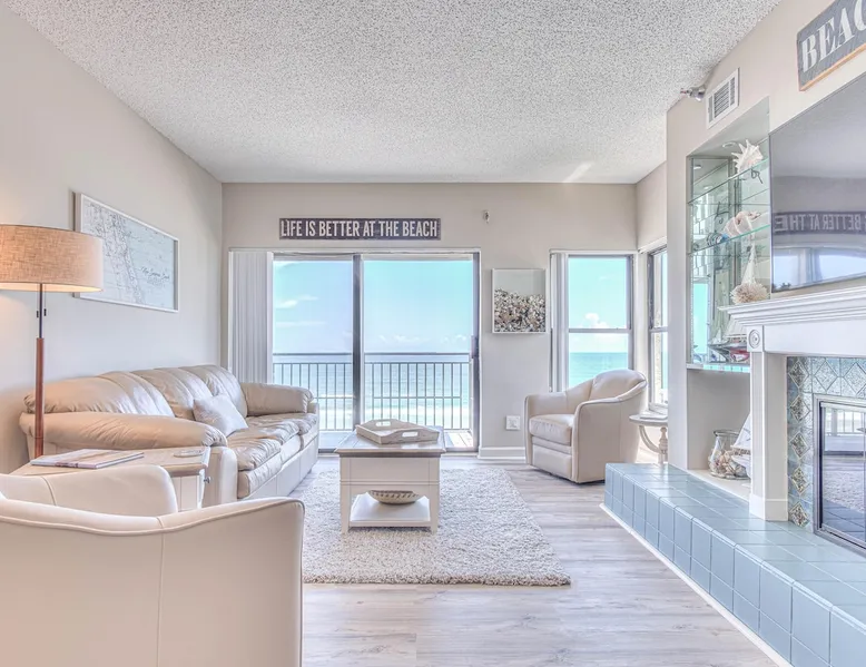 Seafire 5B - 2 bedroom 2 bath oceanfront paradise The space Welcome to your oceanfront retreat! This elegant 2-bedroom, 2-bath condo is located right on the beach, providing stunning panoramic views of the Atlantic Ocean from both the living room and kitchen. As a highly sought-after corner unit, it features a generously sized master suite with a king-size bed, ensuite bath with a walk-in shower, and a vanity area—your own personal retreat. The second bedroom, complete with two single beds, is ideal for accommodating additional guests. The second bathroom, also with a walk-in shower, is conveniently accessible from both the second bedroom and the hallway. The modern, fully equipped kitchen includes custom cabinetry and brand-new appliances—stove, oven, microwave, refrigerator, and dishwasher—giving you everything you need to whip up home-cooked meals. The dining area comfortably seats eight, creating the perfect setting for enjoying meals with loved ones while gazing out at the endless ocean. Every corner of this coastal haven radiates a peaceful, tropical ambiance, with sweeping ocean views enhancing the experience. An in unit laundry room adds extra convenience for longer stays, making this condo feel like a true home away from home. For your enjoyment, the unit comes stocked with beach towels and chairs, so you’re ready to hit the beach the moment you arrive. With every detail carefully curated for comfort and relaxation, this oceanfront escape is the perfect destination for a serene retreat or an unforgettable beach vacation with family and friends. Seafire is an intimate and private condo community that offers the perfect blend of serene beachfront relaxation with easy access to the best dining and shopping that New Smyrna Beach has to offer, all just a short walk away. Located directly on the oceanfront, providing stunning, panoramic views of the Atlantic Ocean and the pristine white sands. You can enjoy the scenery from the oceanfront pool. With gated security, you and your guests can unwind in peace, knowing your privacy and safety are a top priority. Please note: Seafire Condominiums is a small community of just 16 residences. To ensure a peaceful environment for all, parties are not permitted, occupancy is limited to registered guests only (including pool use), and residents and visitors are asked to observe quiet hours and follow the Turtle Code.