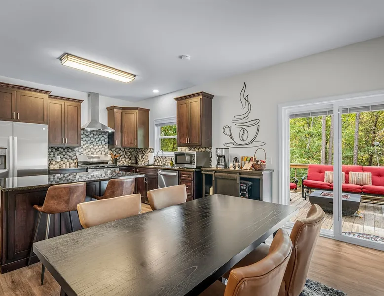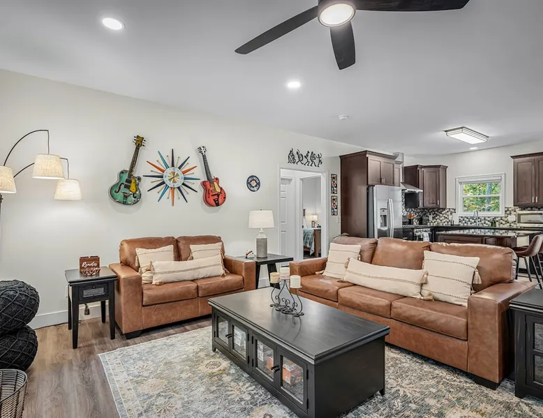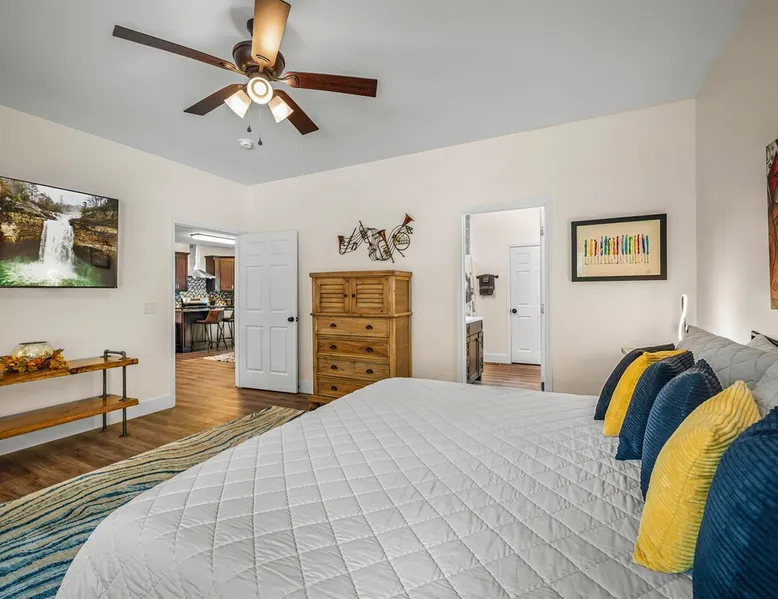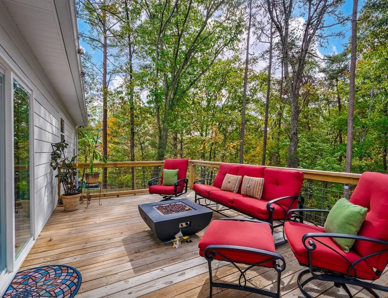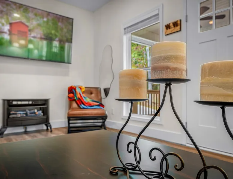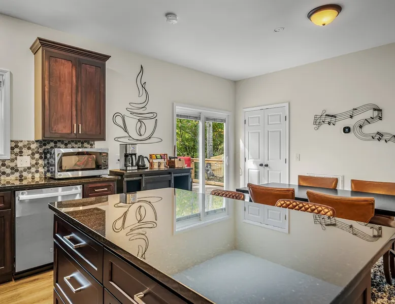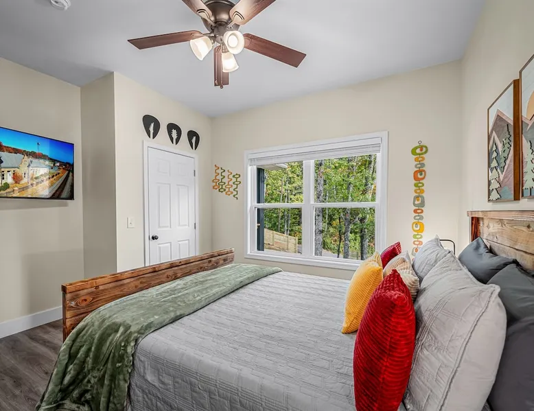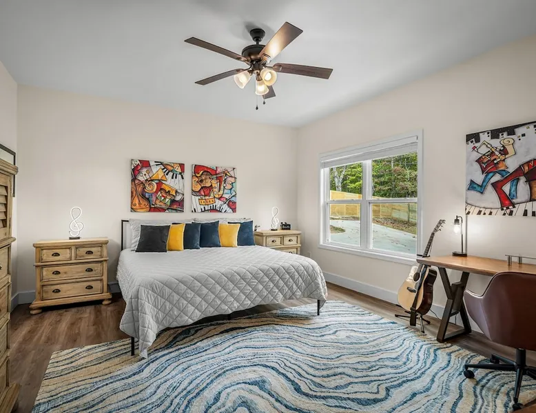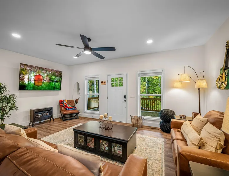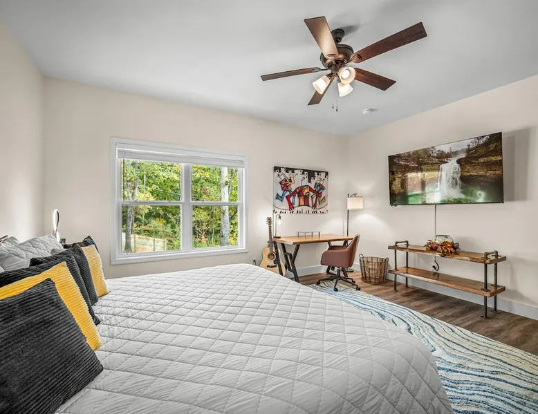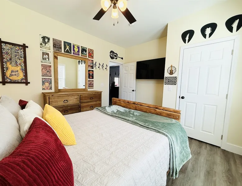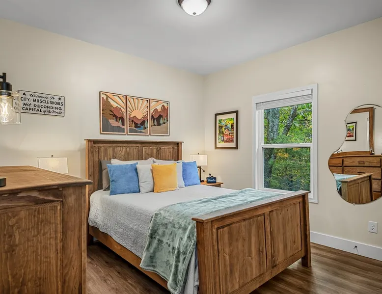 Melody Ridge in Downtown Fort Payne | Fast Wi-Fi | 4 Smart TVs | Office Area | Gas Log Fireplace | Laundry Area | 2 Full Bathrooms | King Suite | Walk-In Shower | Large Soaking Tub | Dog Friendly | Vacation, Corporate and Extended Stays | Hosts up to 6 Guests Escape to the newly-built Melody Ridge in Downtown Fort Payne! Landscaping and an optional no-stairs entrance are coming soon! The space Melody Ridge in Downtown Fort Payne | Fast Wi-Fi | 4 Smart TVs | Office Area | Gas Log Fireplace | Laundry Area | 2 Full Bathrooms | King Suite | Walk-In Shower | Large Soaking Tub | Dog Friendly | Vacation, Corporate and Extended Stays | Hosts up to 6 Guests Escape to the newly-built Melody Ridge in Downtown Fort Payne! Melody Ridge, the retreat property owners’ personal family vacation home, offers a centrally-located peaceful retreat experience with lots of amenities! Explore nearby waterfalls, parks, shops, and restaurants, or just enjoy the peace that this destination retreat property offers guests. Renew, refresh, and be restored! **THE RETREAT PROPERTY** This home is located in Downtown Fort Payne with distant views of nearby Lookout Mountain. There is a private concrete driveway and parking area for 2 vehicles, as well as a space for turning your vehicle around. A privacy fence lines the retreat property on both sides between neighbors, with an open entrance and open, natural views into the back yard and surrounding woods! There are 6 stairs leading to the spacious front porch. This covered porch invites you to relax and take in the fresh mountain air, rain or shine. Step through the front door to the main living area that welcomes you with comfortable lounge seating for 6 guests. Entertainment enthusiasts will appreciate the Fast Wi-Fi and 75" HD Smart TV for streaming your favorite subscribed channels. With corporate guests and remote workspaces in mind, each of the 4 large televisions in this home provide screen-sharing and live-conferencing capabilities. And in this area, it’s very common for opposing football team fans to watch “the big game” in separate locations, so this home is here for it! Also in the living area is a gas log stove fireplace for cool mornings at the mountain :) Directly next to the living area is the dining area and kitchen. The well-equipped kitchen has granite countertops, stainless appliances, dishes, drinking glasses, utensils, pots, pans, and spices for your home-away-from home cooking needs. The homeowners love to travel, and this home has so many extras that they also love to find when they are choosing a vacation rental home. A large kitchen island offers a fantastic preparation and serving area for family meals, and there is indoor dining space for up to 6 with a table and 4 chairs, as well as 2 stools. There is also a coffee station with a 12-cup coffee maker and an electric water kettle for hot teas. Next to the Dining Area, there is a laundry room with a washer and dryer, ironing board available for your convenience, as well as an electric steamer. A significant highlight of this home is the spacious primary bedroom suite. It has a very comfortable king-sized bed with a MLiLY Fusion Luxe/ Hybrid mattress, with a cooling cover and medium/plush feel to help every guest rest well. There is also a large 65" HD Smart TV for movie nights in and even a private remote workspace in the corner with an office desk and chair. Adjoining the primary bedroom is the en-suite primary bathroom, complete with a 2-sink vanity. The customized walk-in shower, large soaking tub and towel warmer offer a spa-like experience for those seeking relaxation after a day of adventures atop Lookout Mountain. Whether you seek a quick revitalizing shower or a long, indulgent soak, this space caters to your every preference. In addition to the primary bedroom suite, there are two additional bedrooms. Each has a comfortable queen bed with a 10” Dreamer, memory foam mattress, closet and dresser storage - as well as a 50" HD Smart TV. Both bedrooms also have bedside tables and lamps with USB charging stations. The third bedroom has views into the backyard area and a remote-controlled adjustable bed frame that even has a massage setting for tired muscles after a day of chasing waterfalls :) *FYI: All of the beds, mattresses and sleeping pillows at Melody Ridge were purchased locally at Beds, Floors and More in Fort Payne. We get asked often by guests because they’re so comfy :) Between the second and third bedroom, there is a second full bathroom with a tub/shower combination, sink, toilet, and towel warmer. Through the sliding glass doors beside the dining area, a spacious back deck awaits you and provides the ideal setting for outdoor gathering and al fresco dining. A gas fire pit is ready for cool nights and gathering with family. WHY GUESTS LOVE THIS PEACEFUL RETREAT PROPERTY: 1) This home has a king bedroom and en-suite bathroom with walk-in shower & soaking tub! 2) It is conveniently located in Downtown Fort Payne! 3) It is very spacious with each bedroom having a large Smart TV for streaming! 4) It has a large front porch and back deck with privacy! 5) Its musical themed decor is in honor of local artists with a nod to the rich musical history of Fort Payne, Muscle Shoals and Mentone! **EXPLORE THE AREA** 1.3 miles - The Spot Coffee Shop 1.3 miles - DeKalb County Courthouse 1.1 miles - Fort Payne’s City Park 1.1 miles - Alabama Walking Trail Park .8 miles - VFW Fairgrounds 2.2 miles - Alabama Fan Club & Museum 8.7 miles - Little River Canyon National Preserve 11 miles - Mentone 8 miles - DeSoto State Park 31 miles - Unclaimed Baggage in Scottsboro, AL 40 miles - Cloudland Canyon State Park, GA 47 miles - Rock City & Ruby Falls 70 miles - Huntsville, AL FREE PARKING: There is free parking in the parking area beside this home for up to 2 vehicles (contact host for more info if additional parking needed) Be sure to check out all of our favorite attractions and dining spots i
