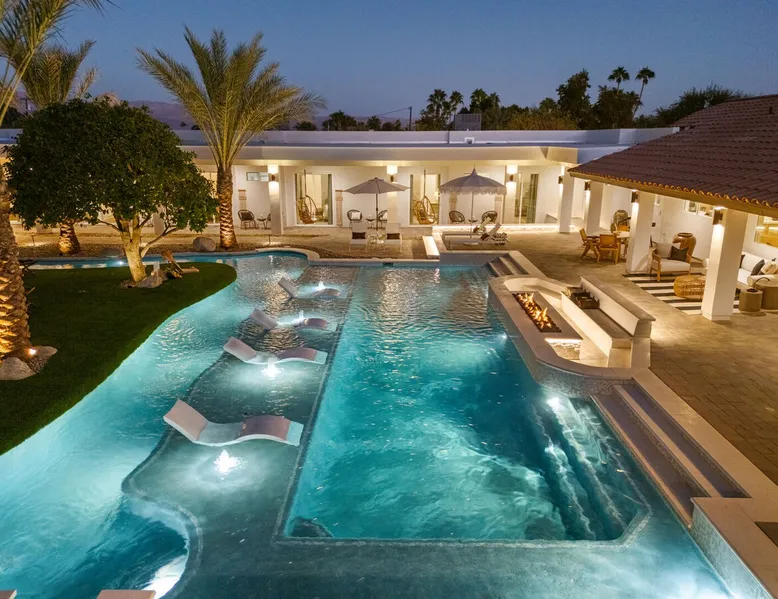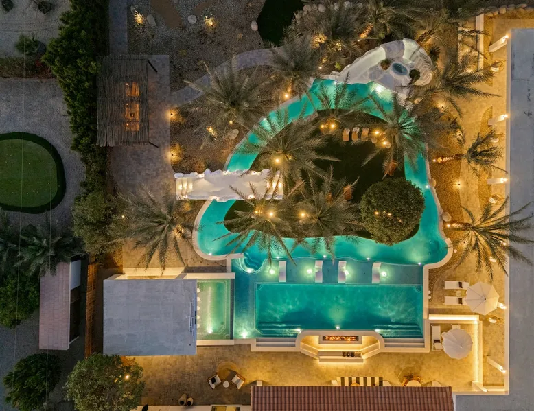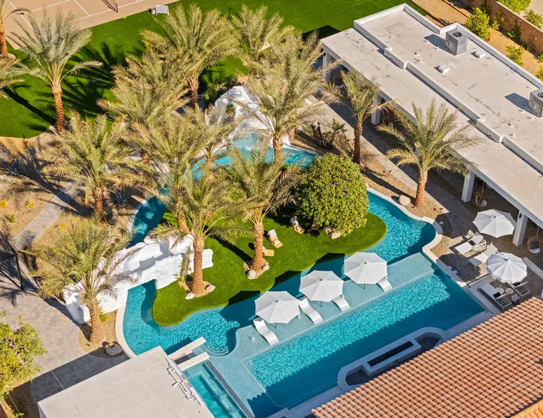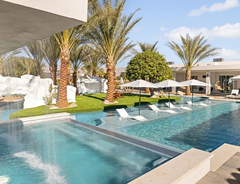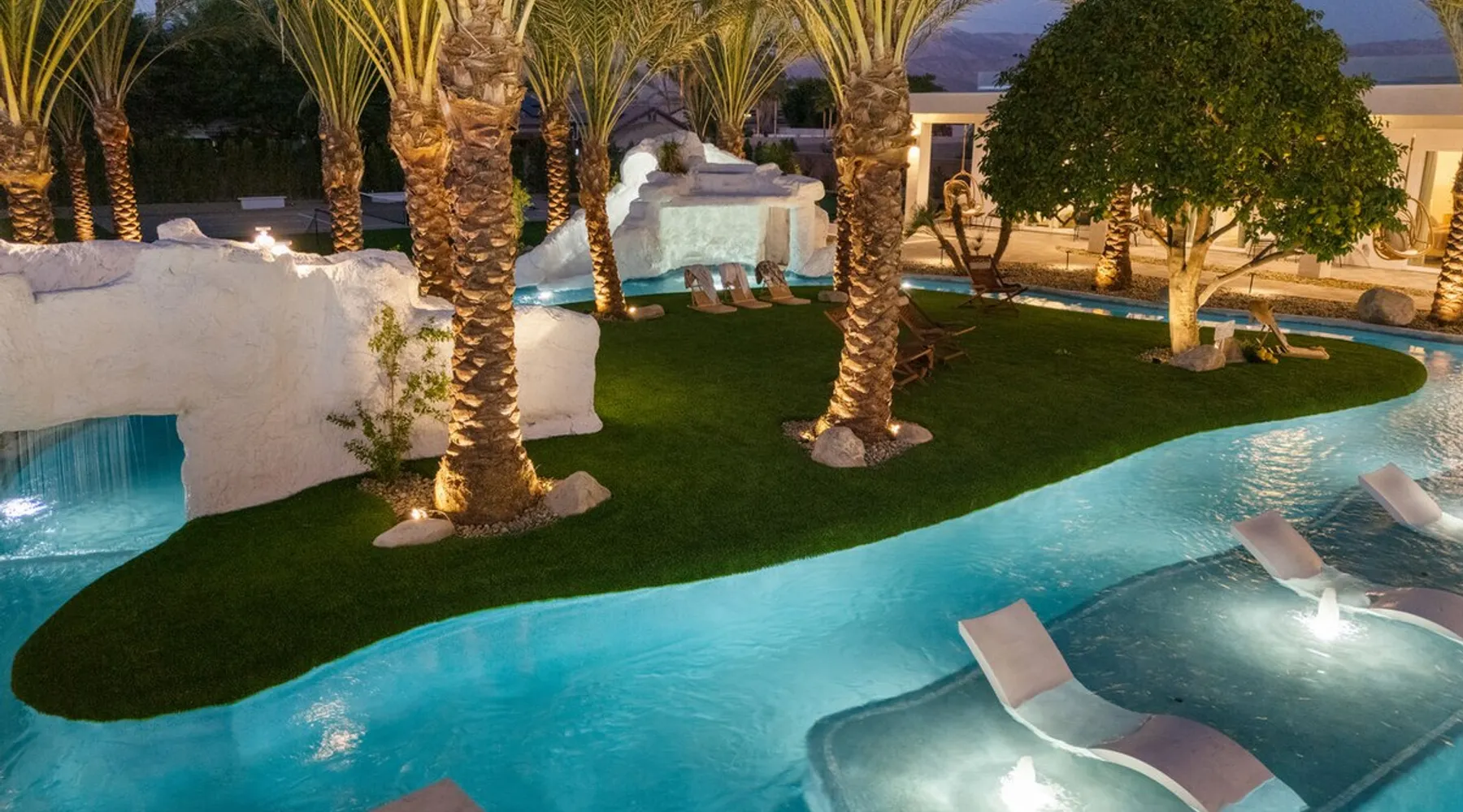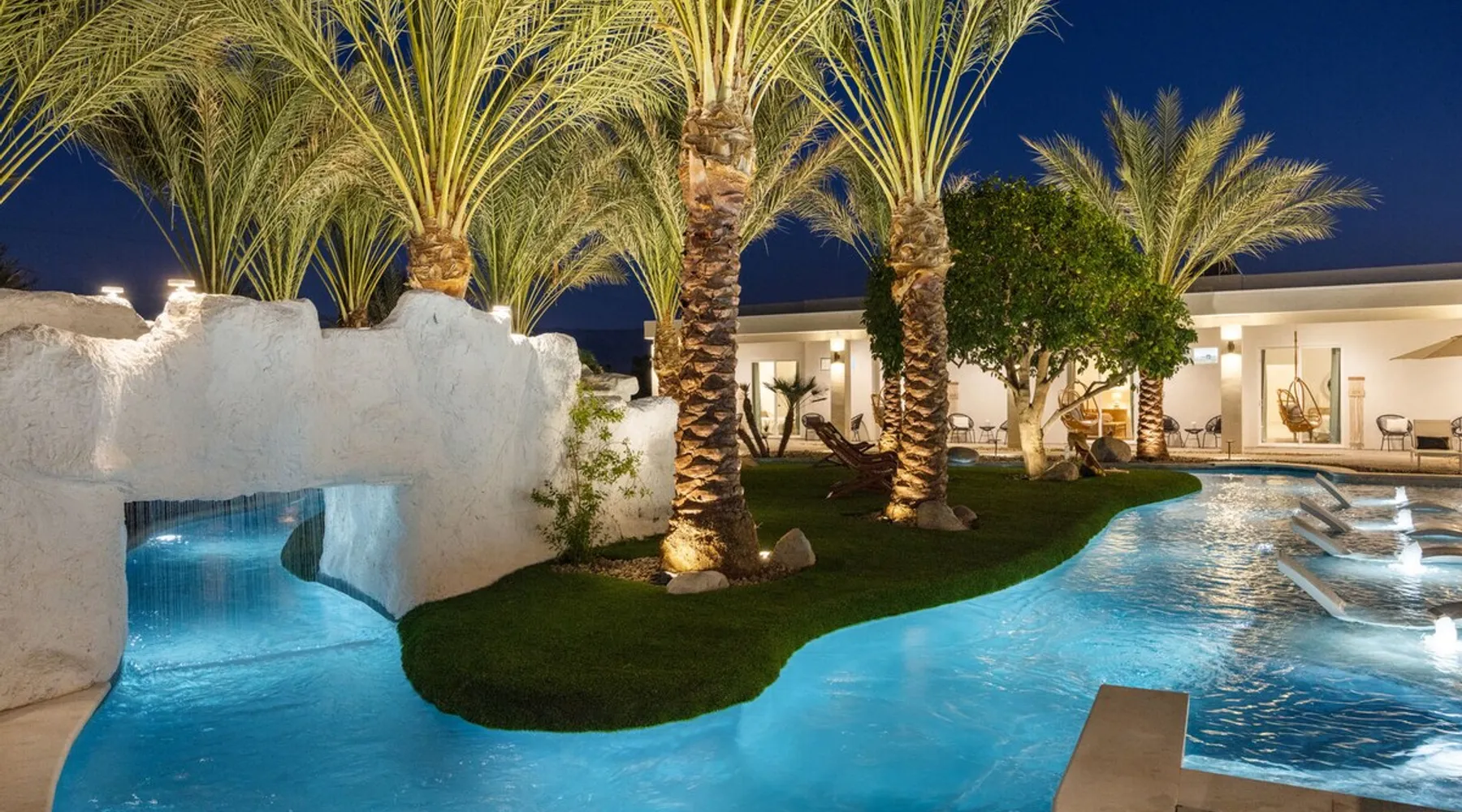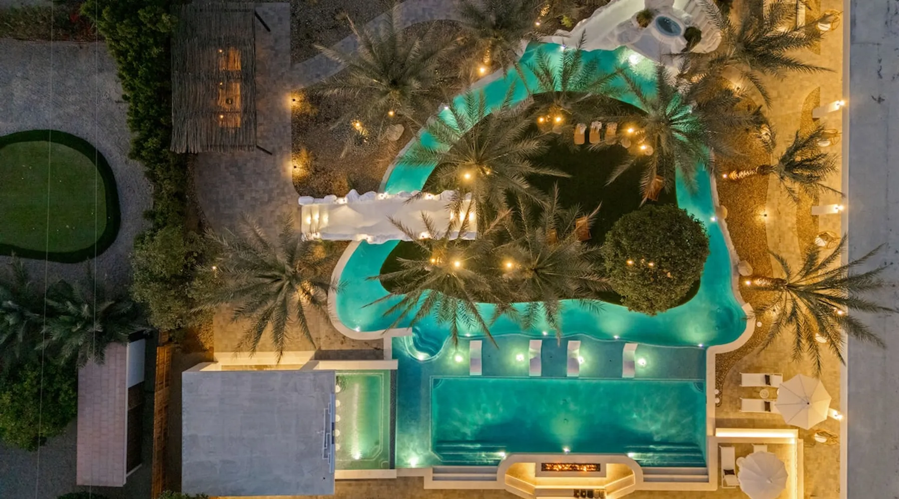 Welcome to Isla, an exclusive TRAVLR Vacation Home! We invite you to discover Isla, a breathtaking luxury vacation home that redefines the art of relaxation and entertainment. Nestled on a sprawling acre of desert land transformed into a pure oasis, this architectural masterpiece spans over 5,400 square feet and is designed to cater to large groups, corporate retreats, and unforgettable events. The space Experience the grounds of Isla and discover the grand central island that gives the property its name. Surrounded by a sparkling lazy river pool that beckons you to jump in and let the moving river take you around. Immerse yourself in the tranquility of cascading waterfalls and enjoy swimming beneath the enchanting grotto. With a thrilling pool slide and expansive lounging areas, every moment spent here is a celebration of leisure. Isla features 10 professionally curated bedrooms with a total of 16 beds and 9 luxurious bathrooms, ensuring comfort and privacy for everyone. The open concept communal spaces are perfect for entertaining, whether you’re hosting a dinner party or a casual gathering. Enjoy the seamless integration of smart home automation, designed for effortless guest use throughout your stay. For the active traveler, Isla boasts a range of amenities that elevate your vacation experience. Inside, there is a dedicated game room with TV, billiards table, ping pong and small gym. Challenge friends to a match on the sport court made for pickleball and basketball or play around on the expansive putting green with chipping area and sand traps. Enjoy a leisurely afternoon in the hammock garden or engage in friendly competition on the bocce ball court. The expansive green lawn is perfect for soccer, football, or a fun game of cornhole, while the fire pit invites cozy evenings under the stars. The outdoor kitchen is a culinary dream, perfect for preparing gourmet meals or enjoying a barbecue with loved ones. And as the sun sets, the magical ambiance of Isla comes alive, providing the ultimate backdrop for memorable evenings. Isla isn’t just a vacation rental; it’s a destination where luxury meets adventure, and every detail is curated for your enjoyment. Come experience the unparalleled beauty and sophistication of Isla, where your dream getaway awaits. Uno is the primary suite furnished with a king-sized bed and en suite bathroom with walk-in shower and separate tub and private access to the expansive backyard Dos: King bed, reach in closet and shared hall bathroom Tres: King bed & en suite bathroom Cuatro: King bed & en suite bathroom Cinco: Two sets of full size bunks (4 beds), direct patio access & en suite bathroom Seis: Two sets of full size bunks (4 beds), direct patio access & en suite bathroom Siete: King bed, direct patio access & Jack n Jill bathroom shared with Ocho Ocho: King bed, direct patio access & Jack n Jill bathroom shared with Siete Nueve: King bed, direct patio access & Jack n Jill bathroom shared with Diez Diez: King bed, direct patio access & Jack n Jill bathroom shared with Nueve Bed Summary: 8 King, 8 Full (4 sets of bunk beds). Queen Size Air Mattress upon request. Sleeps up to 20. There is space available for up to 8 cars total. Street parking is not permitted. Oversized vehicles are not permitted. Permit #: STR2024-0331 Guest access TRAVLR Vacation Home properties are accessible using a keyless system that allows entry into the home for your entire stay. Arrival information, including access codes will be emailed 5-days prior to your arrival. Other things to note - FREQUENTLY ASKED QUESTIONS - WHAT TIME IS CHECK-IN AND CHECK OUT? Check in is after 3PM local time, and check out is no later than 11AM. Early check in and late check out may be available for your reservation upon request. Please reach out for the cost and availability. WILL I NEED TO MEET THE PROPERTY MANAGER TO GET A KEY? TRAVLR Vacation Home properties are accessible using a keyless system that allows entry into the home for your entire stay. DO YOU PROVIDE DAILY CLEANING SERVICE? TRAVLR Vacation Homes provides a departure clean on all stays. A mid-week or mid-stay clean can be provided for an additional fee. CAN WE HAVE THE POOL HEATED? During the winter, the temperature of pools can range between 50-70 degrees. If you would like the pool to be heated to 80-82 degrees, we do charge a fee of $300/night. Please let your property manager know at least 48-hours in advance of your arrival if you would like pool heat added to your reservation. WHAT IS PROVIDED WITH MY ACCOMMODATIONS? All of our vacation rentals are furnished and have a kitchen with amenities including a microwave, coffee maker, toaster and blender. Each property is stocked with cooking and serving items including plates, bowls and utensils, as well as a can opener, corkscrew measuring spoons and more. The coffee maker takes ground coffee and we also offer a spice rack, salt and pepper. There are bath towels, pool towels and bed linens. We also provide an initial supply of trash liners, toilet paper, hand soap and dishwasher soap. Bathrooms are stocked with shampoo, conditioner and liquid body wash. Laundry facilities are also equipped with laundry soap and dryer sheets. CAN I SHIP A PACKAGE TO MY VACATION HOME? We do not recommend shipping directly to the home, we do not have mailbox keys, and there are many different people with access to the home: vendors, housekeeping, Guest Services staff, etc... so we cannot be responsible for packages once delivered. DO YOUR HOMES HAVE OUTDOOR MUSIC SYSTEMS? Yes! The entire property both inside and out is filled with speakers that are setup in different zones so you can enjoy it wherever you are and even have different music playing in different areas. To use, simply download the Sonos app and connect to our Wi-Fi system. You can then control your music from Spotify, Apple Music and more. Due to city regulations though, the outdoor music speakers will not work between the hours of 9PM a