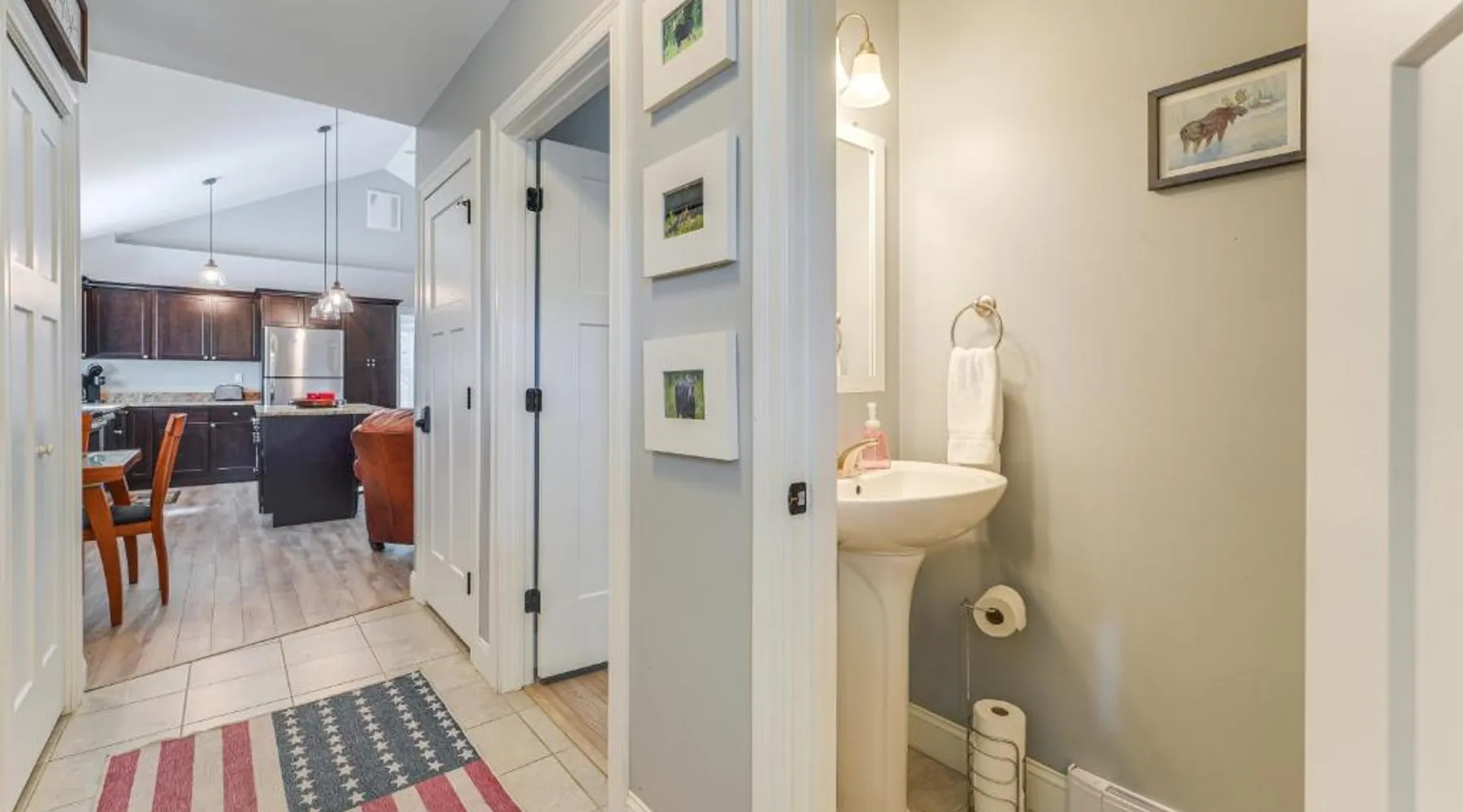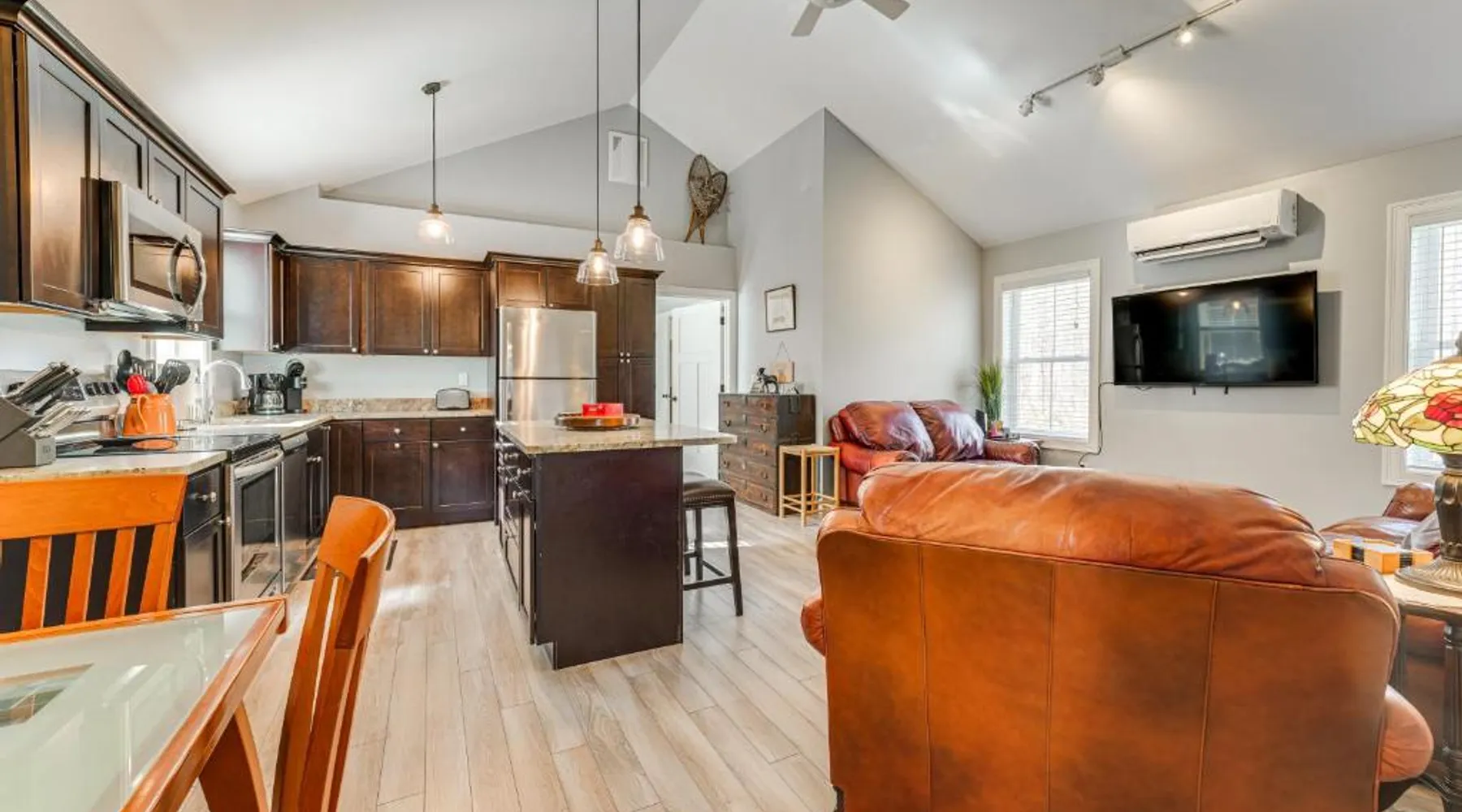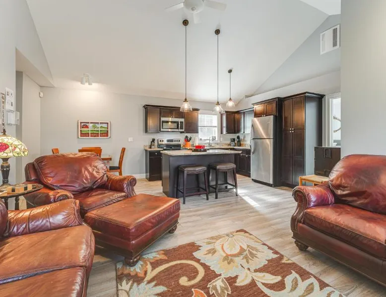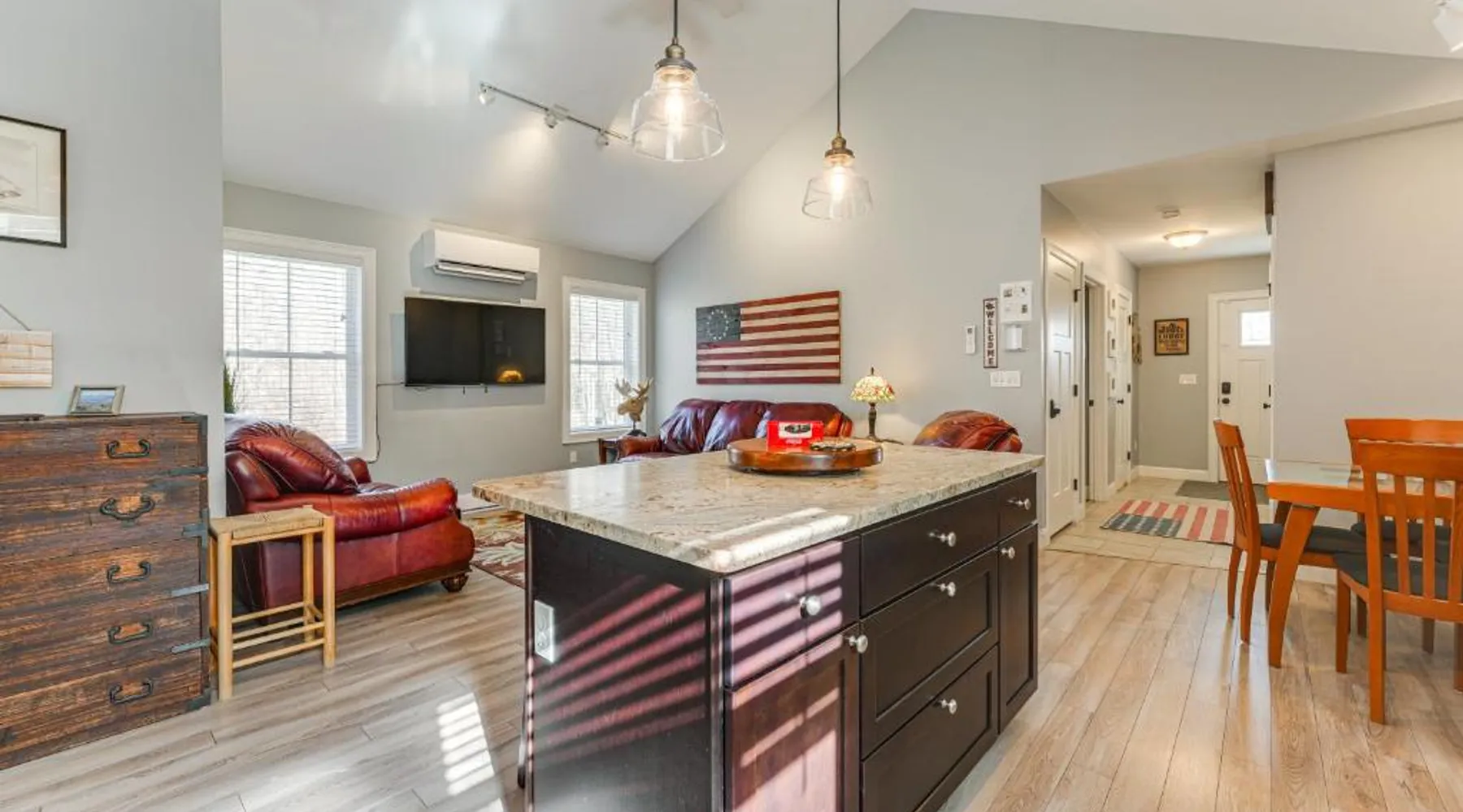 Comfortable Living: Ski, Hike and Boat Modern Bridgton Retreat in Bridgton offers two bedrooms and two bathrooms. The living room includes a dining table and a work desk. Modern Amenities: Guests enjoy free WiFi, air-conditioning, a washing machine, and a fully equipped kitchen with a coffee machine, microwave, dishwasher, and oven. Additional amenities include a hairdryer, free toiletries, and a TV. Convenient Location: Located 43 mi from Portland International Jetport, the property is 19 mi from White Mountain National Forest and 30 mi from Mount Washington Observatory Weather Discovery Center. Featuring a private entrance, this air-conditioned holiday home consists of 1 living room, 2 separate bedrooms and 2 bathrooms with a shower and a hairdryer. Meals can be prepared in the kitchen, which is equipped with a stovetop, a refrigerator, a dishwasher and kitchenware. The holiday home provides a washing machine, a coffee machine, a wardrobe, tumble dryer, as well as a flat-screen TV with cable channels. The unit offers 3 beds.