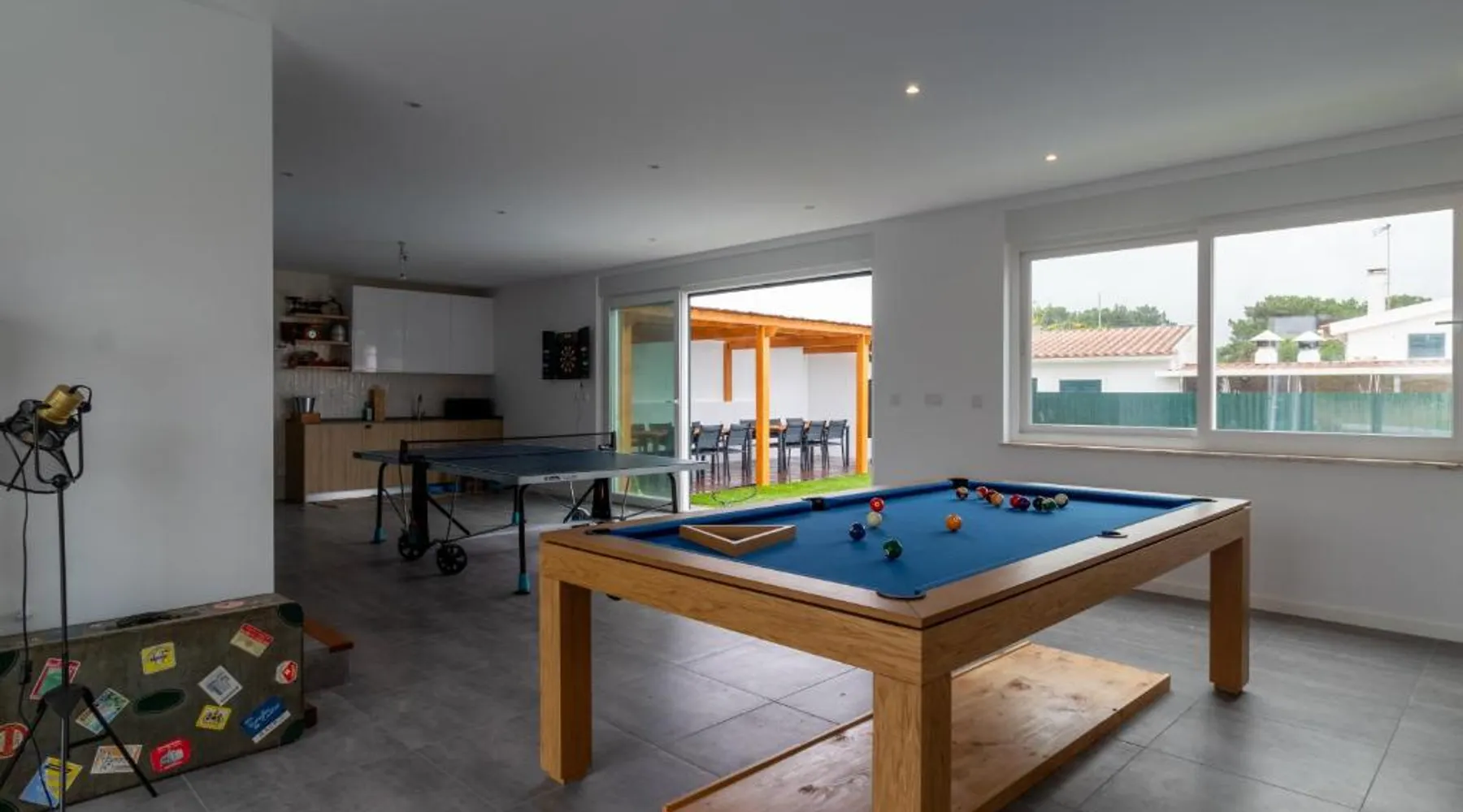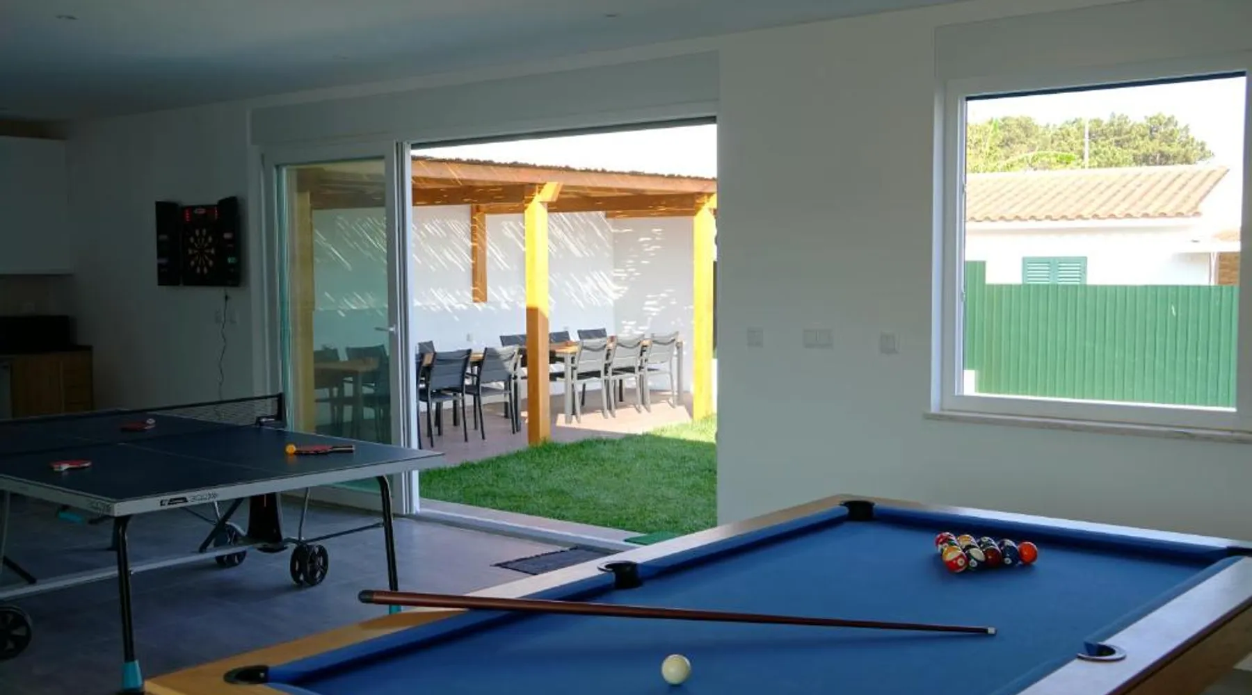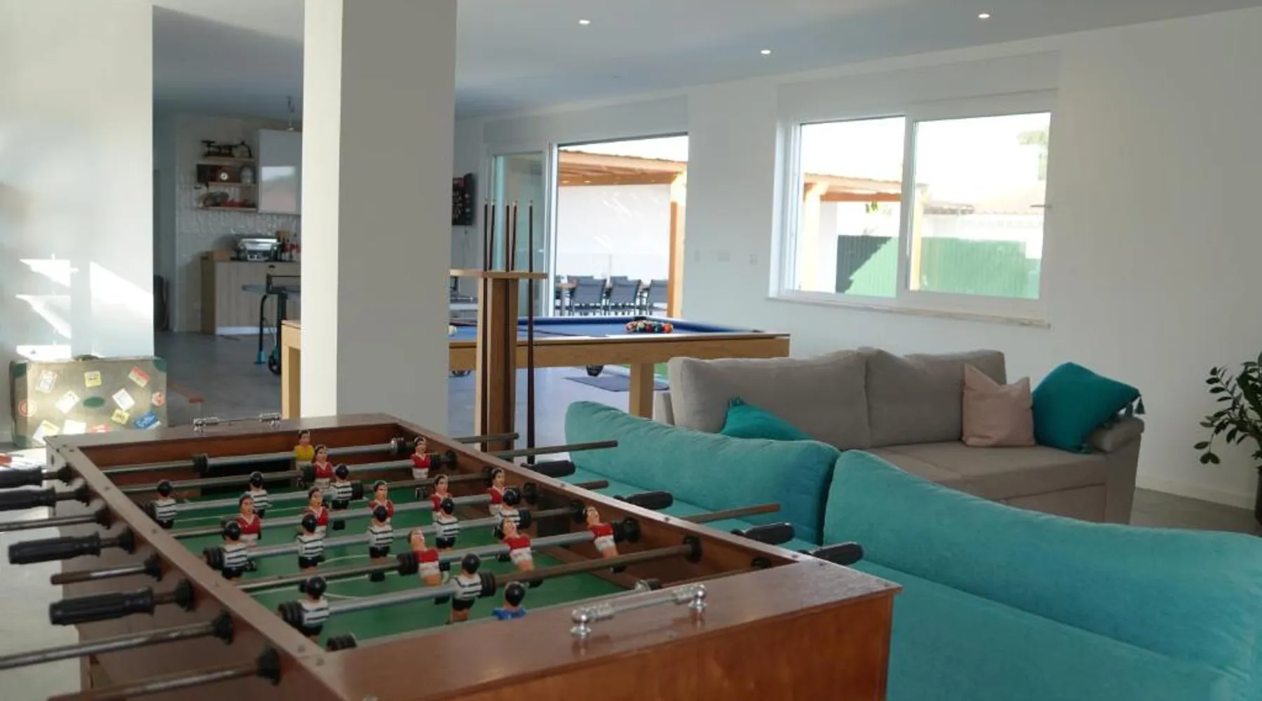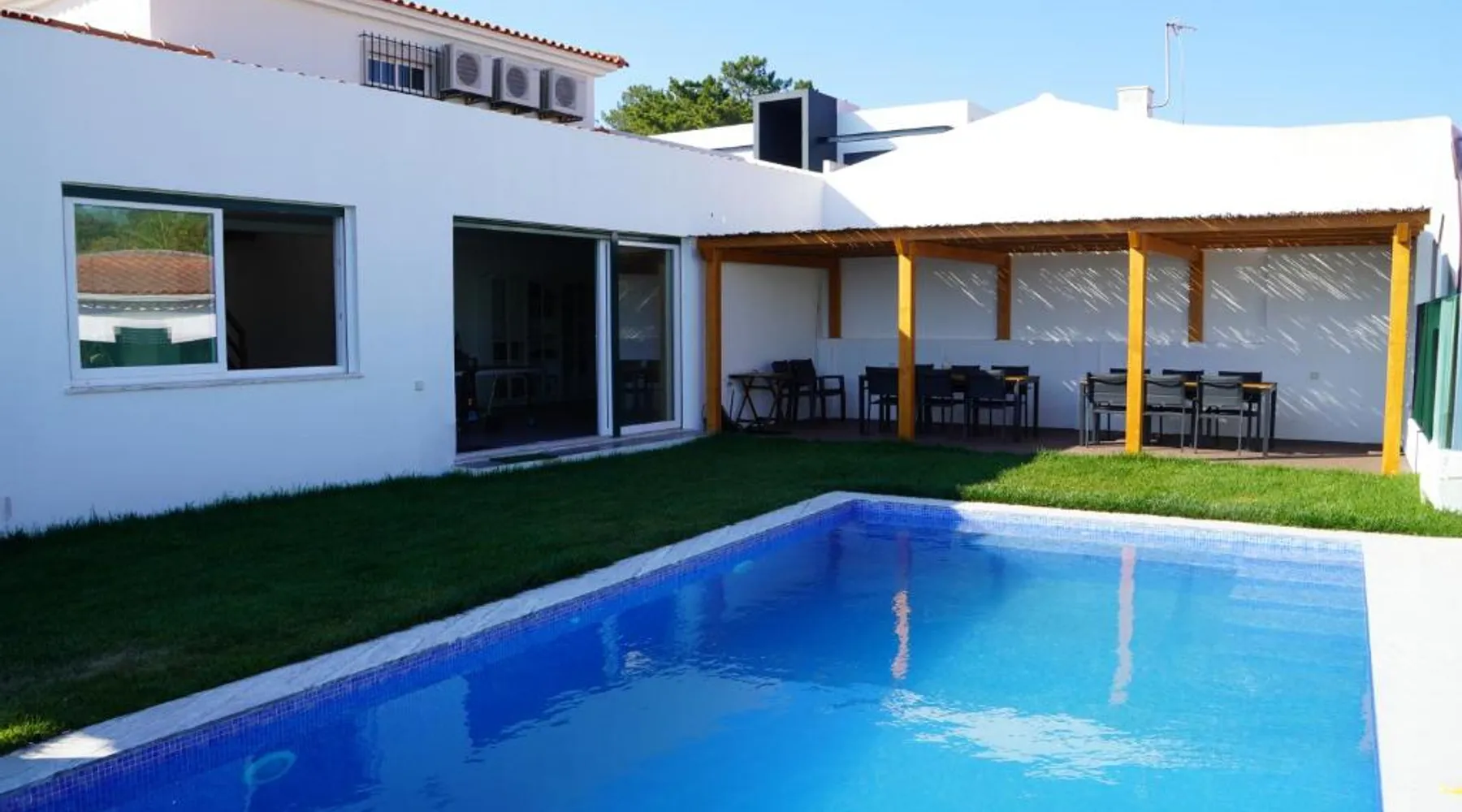 Spacious Accommodations: Casa do Mural in Sesimbra offers a spacious villa with five bedrooms and four bathrooms. The property features a saltwater swimming pool, lush garden, terrace, and free WiFi. Modern Amenities: Guests enjoy air-conditioning, a fully equipped kitchen, washing machine, and private pool. Additional facilities include an indoor play area, electric vehicle charging station, outdoor seating, family rooms, games room, and barbecue facilities. Prime Location: Located 27 mi from Humberto Delgado Airport, the villa is an 18-minute walk from Lagoa de Albufeira Beach. Nearby attractions include Jeronimos Monastery (23 mi) and St. George's Castle (24 mi). Highly rated by guests. The private pool is the special feature of this villa. Featuring a private entrance, this spacious villa also consists of 5 separate bedrooms and 4 bathrooms with a walk-in shower and a bath. Guests will find a stovetop, a refrigerator, a dishwasher and kitchenware in the kitchen. The villa also provides guests with a barbecue. The air-conditioned villa provides a flat-screen TV with cable channels, a washing machine, a tea and coffee maker, a dining area as well as garden views. The unit offers 8 beds.