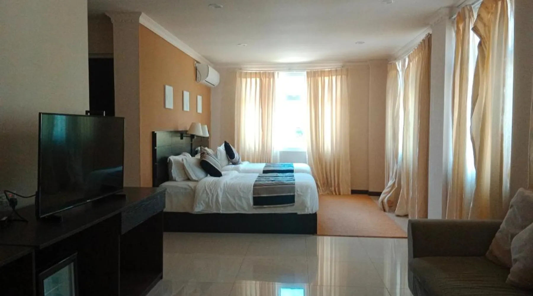 Comfortable Accommodations: Lagoon Lodge in Addu City offers comfortable rooms with air-conditioning, private bathrooms, and balconies. Each room includes a work desk, TV, and free WiFi. Essential Facilities: Guests can relax on the terrace or balcony and enjoy free WiFi throughout the property. Free parking is available, and a buffet breakfast with Asian options is served daily. Convenient Location: Located 7.5 mi from Gan International Airport, the hotel provides easy access to local attractions. Reception staff speak English, ensuring a pleasant stay. This air-conditioned twin room includes a flat-screen TV with cable channels, a private bathroom as well as a terrace. The unit offers 2 beds.