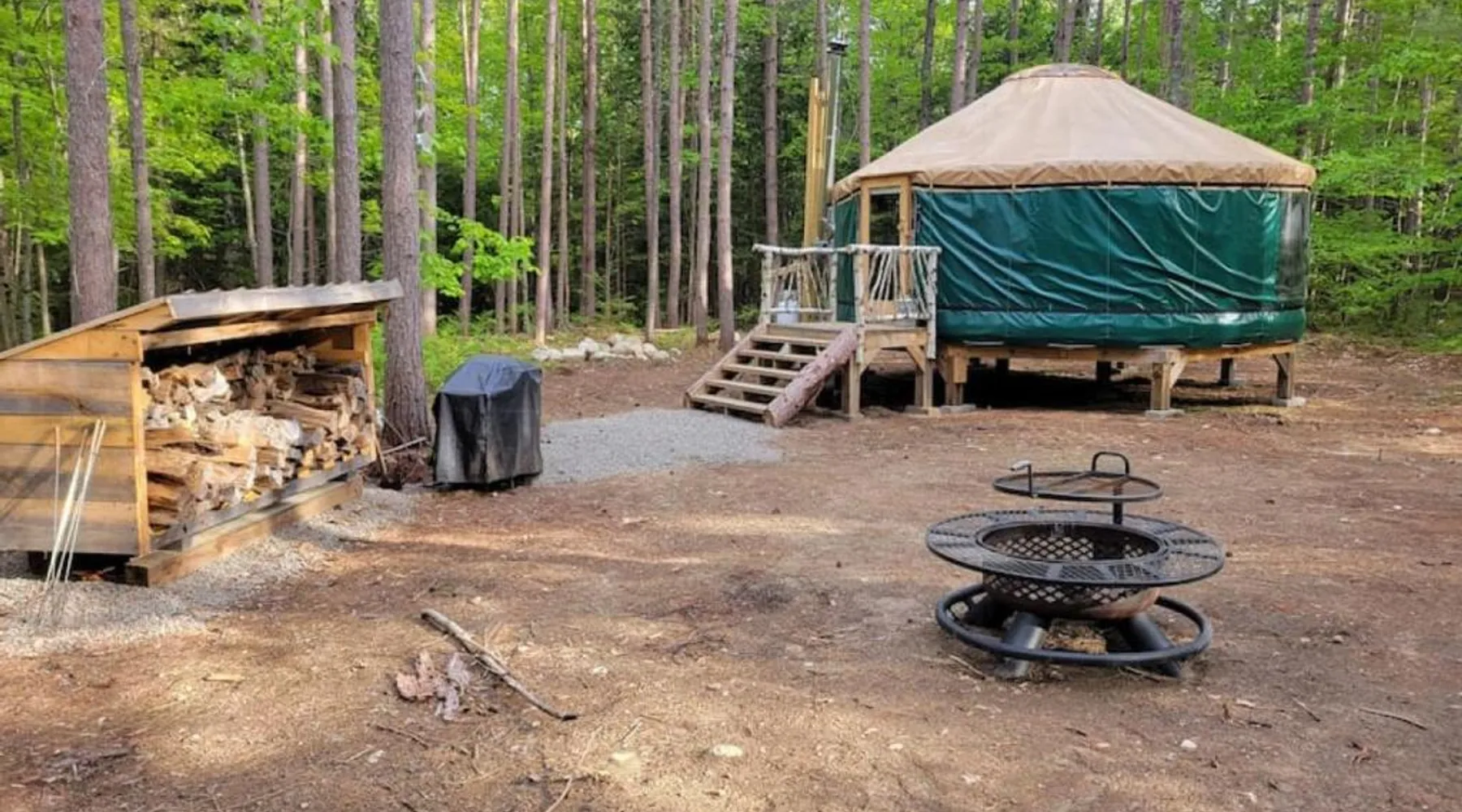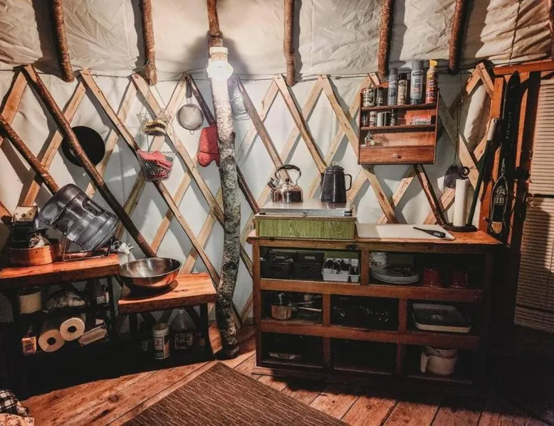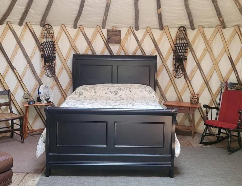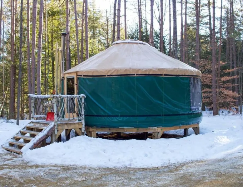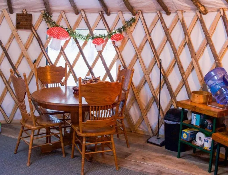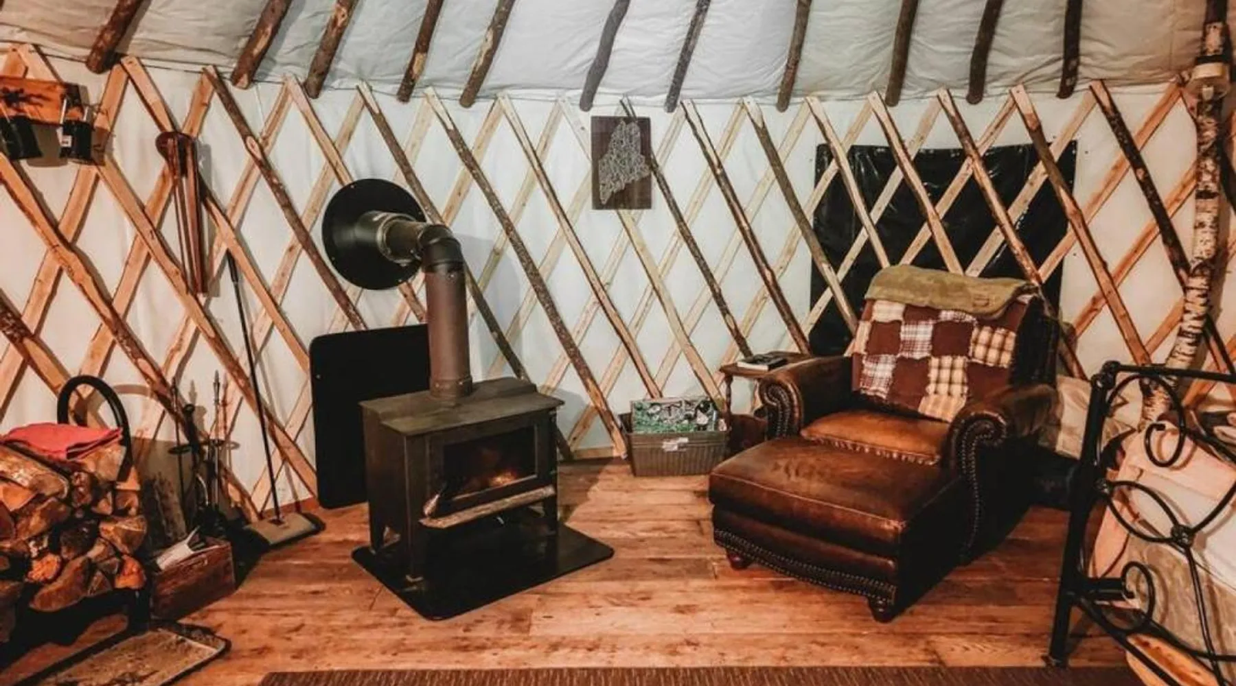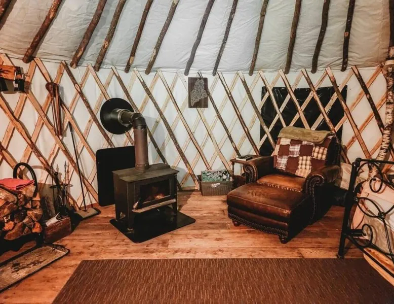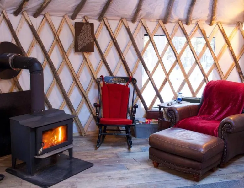 Elegant Accommodations: Rufus III Yurt on the river in Brownfield offers a luxury tent experience with a private garden. The property features a private entrance and a fully equipped kitchen with a stovetop, toaster, and electric kettle. Comfortable Amenities: Guests enjoy a private bathroom with free toiletries, a cozy fireplace, and a barbecue area. Additional amenities include a laundry service, tea and coffee maker, and a fully equipped kitchen with kitchenware. Convenient Location: Located 42 mi from Portland International Jetport, the property is near attractions such as White Mountain National Forest (14 mi), Kahuna Laguna (14 mi), and Mount Washington Observatory Weather Discovery Center (13 mi). The fireplace is a top feature of this tent. Guests will find a stovetop, kitchenware, a tea and coffee maker and a toaster in the well-fitted kitchen. The tent also includes a barbecue. This tent has a private bathroom, a private entrance and heating.