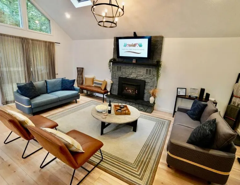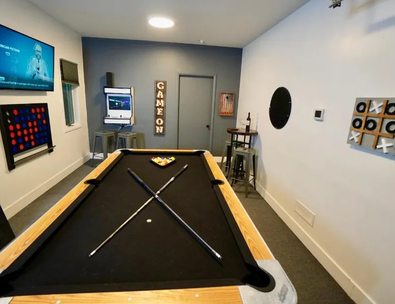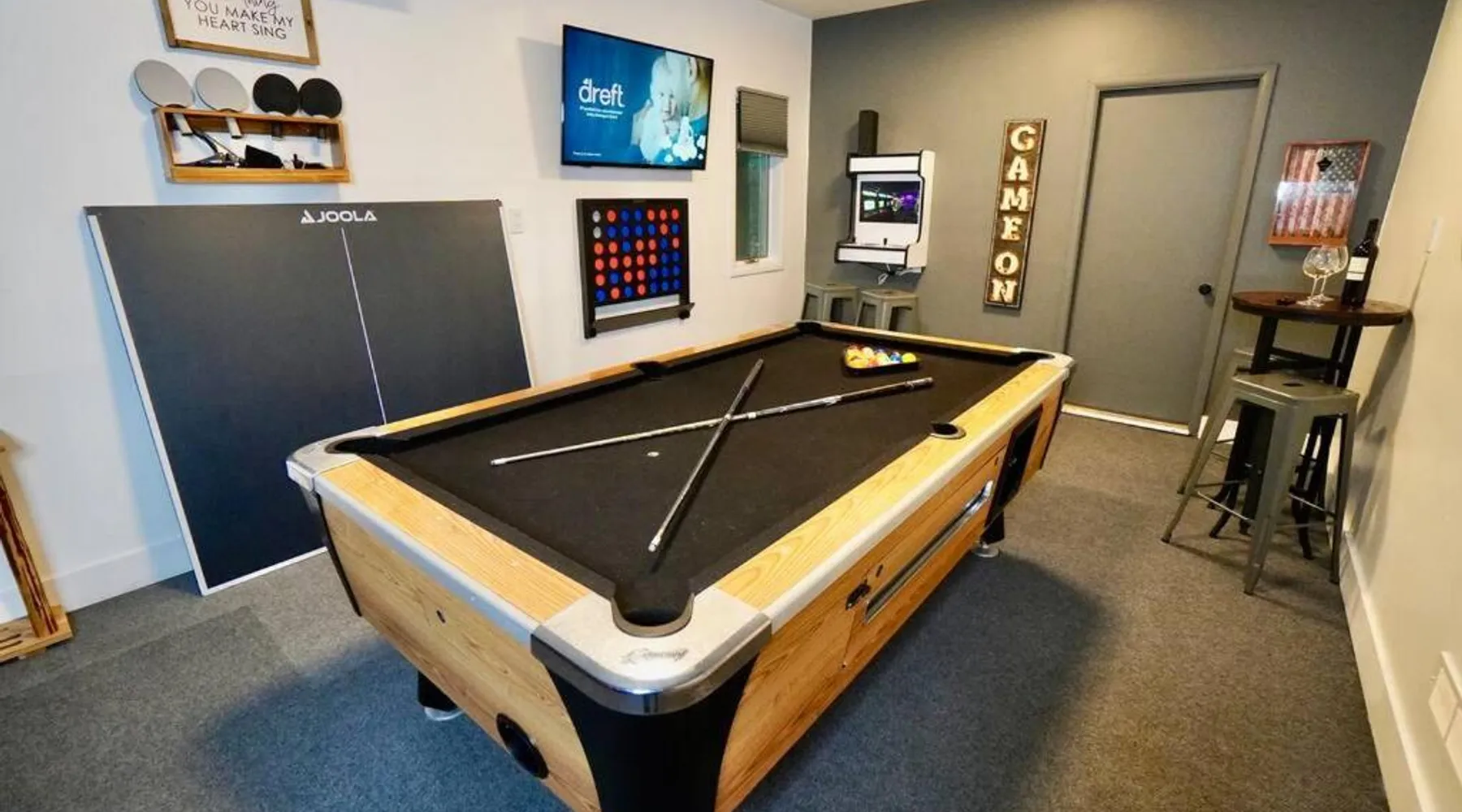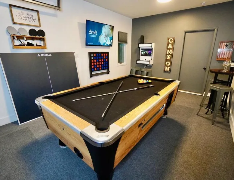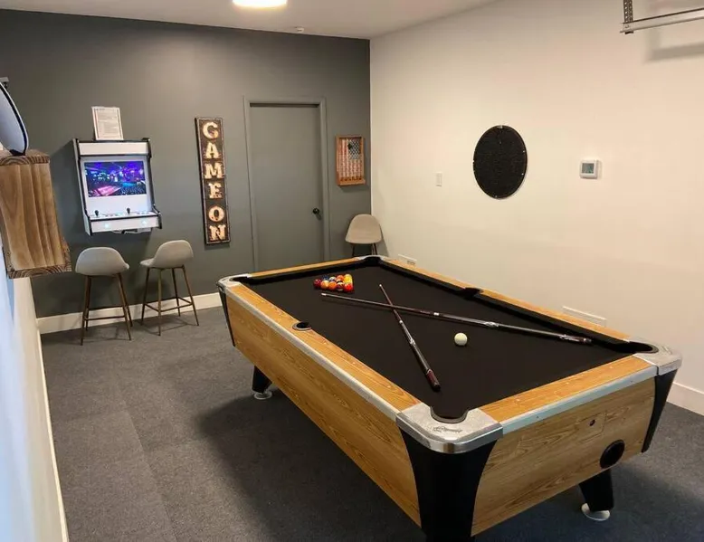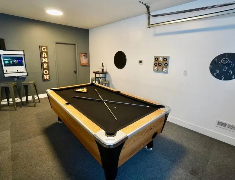 Spacious Holiday Home: Poconos Oasis with Game Room in Pocono Summit offers a spacious setting with three bedrooms and two bathrooms. The living room features a sofa bed and a fireplace, providing comfort for all guests. Modern Amenities: Guests enjoy free WiFi, air-conditioning, streaming services, and a fully equipped kitchen with a dishwasher, microwave, and oven. Additional amenities include a washing machine, spa bath, and outdoor dining area. Convenient Location: Located 40 mi from Wilkes-Barre/Scranton International Airport, the property is near attractions such as Kalahari Waterpark (2.5 mi), Great Wolf Lodge Pocono Mountains (8.1 mi), and Delaware Water Gap National Recreation Area (23 mi). The spa bath and fireplace are the special features of this holiday home. Guests will find a stovetop, a refrigerator, a dishwasher and an oven in the fully equipped kitchen. The holiday home also comes with a barbecue. The spacious air-conditioned holiday home features a flat-screen TV with streaming services, a washing machine, a private entrance, a tea and coffee maker as well as a quiet street view. The unit has 5 beds.