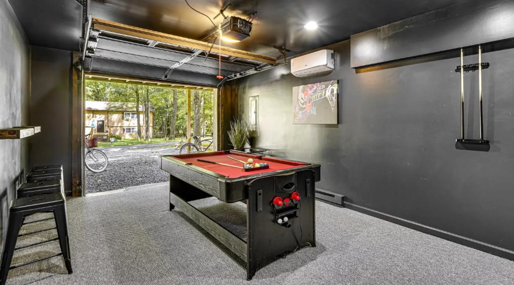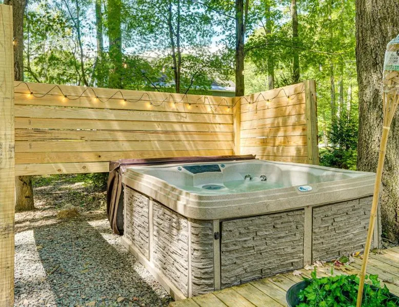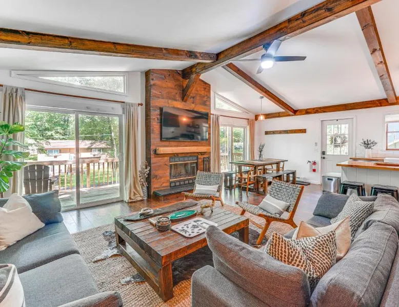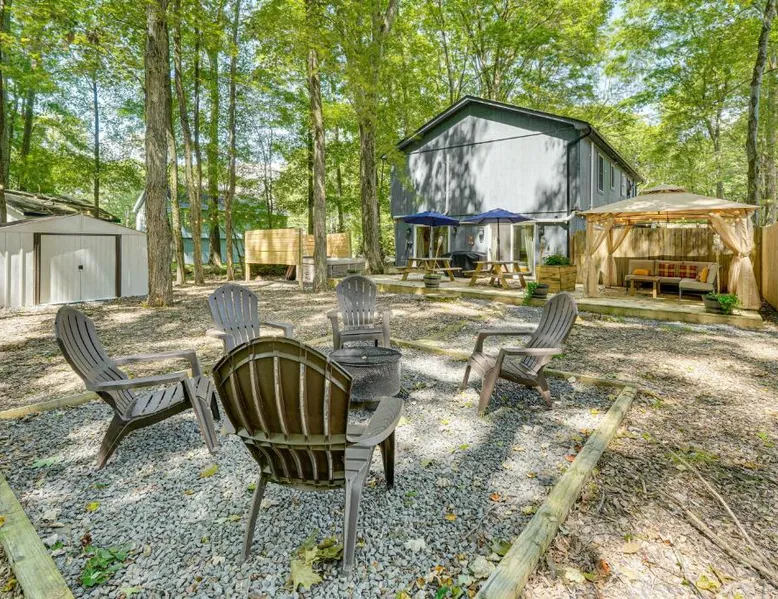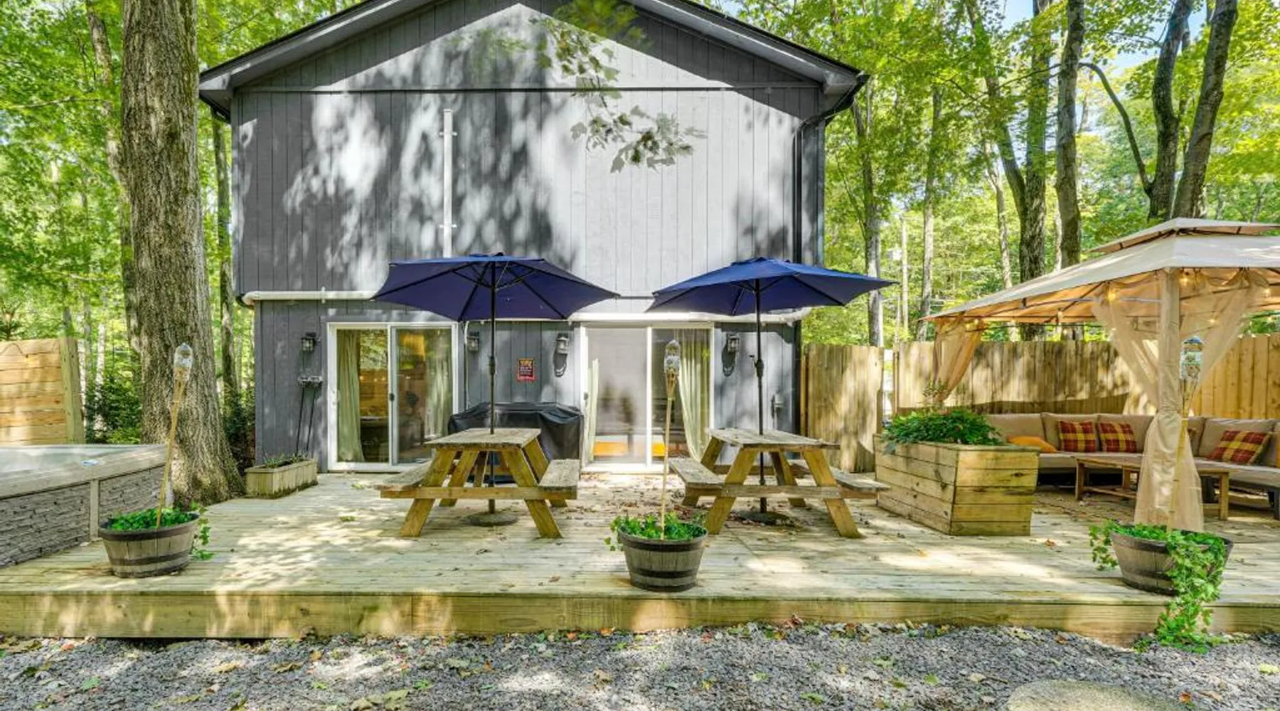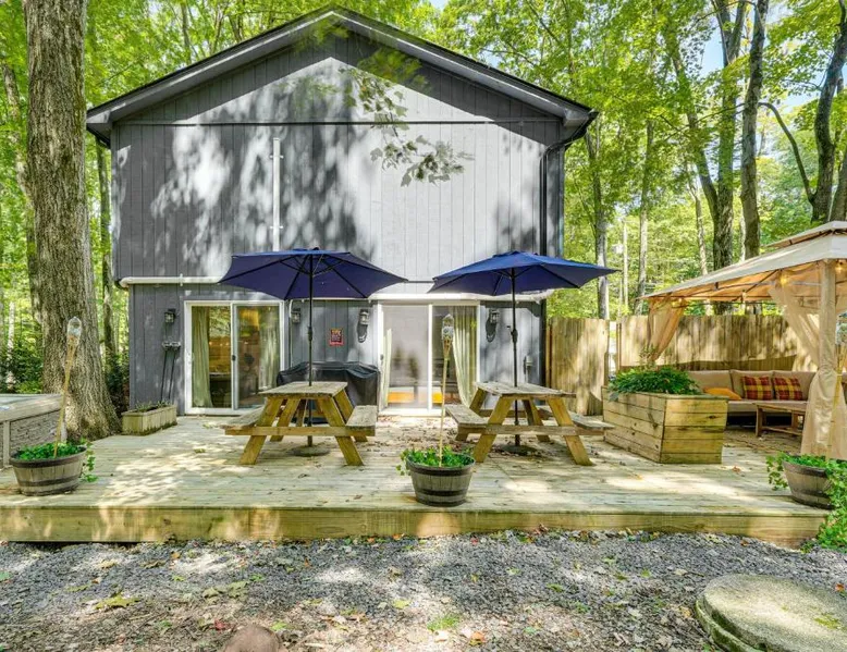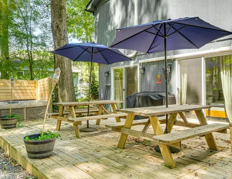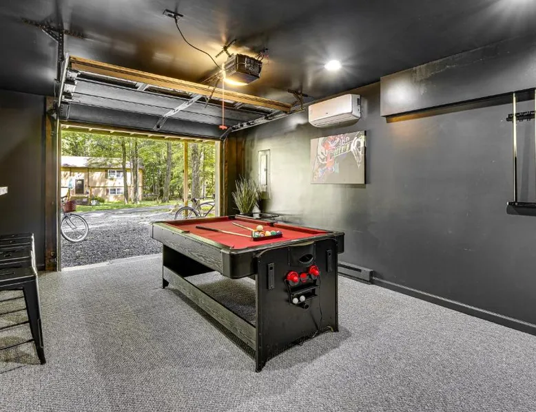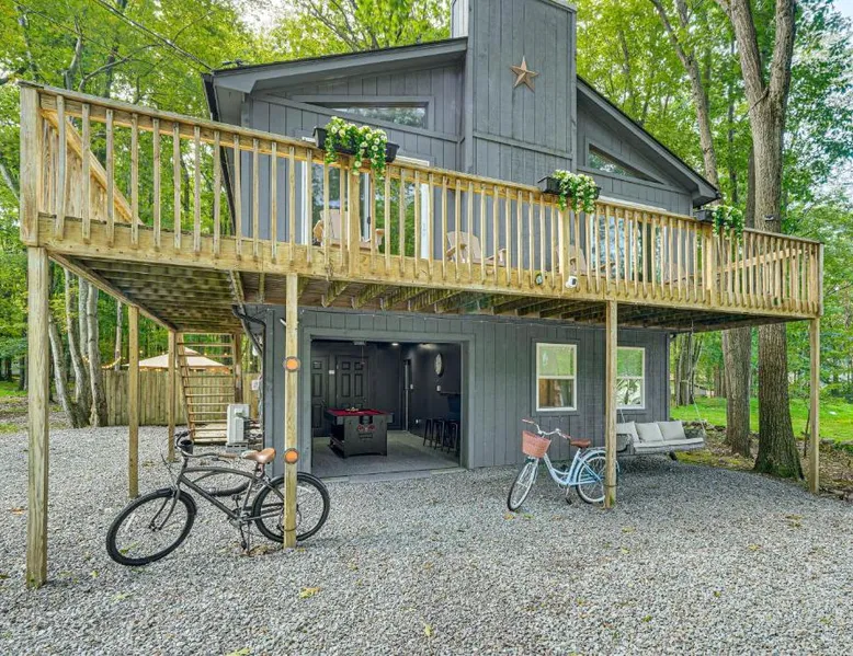 Spacious Accommodations: The Private Hot Tub Tree-Lined Poconos Home! in Pocono Summit offers three bedrooms and two bathrooms. The living room features a fireplace and a balcony with a view. Modern Amenities: Guests enjoy free WiFi, air-conditioning, and a fully equipped kitchen with a dishwasher and microwave. Additional amenities include a washing machine, hot tub, games room, and private entrance. Local Attractions: Located 40 mi from Wilkes-Barre/Scranton International Airport, the property is near Delaware Water Gap National Recreation Area (23 mi) and Kalahari Waterpark (2.2 mi). Other attractions include Great Wolf Lodge Pocono Mountains (7.5 mi) and Pocono Raceway (12 mi). Guests will have a special experience as this holiday home offers a hot tub and a fireplace. Featuring a private entrance, this air-conditioned holiday home consists of 4 living rooms, 3 separate bedrooms and 2 bathrooms with a bath and a shower. In the kitchen, guests will find a stovetop, a refrigerator, a dishwasher and kitchenware. The spacious holiday home provides a washing machine, a coffee machine, tumble dryer, a barbecue and a flat-screen TV. The unit offers 6 beds.