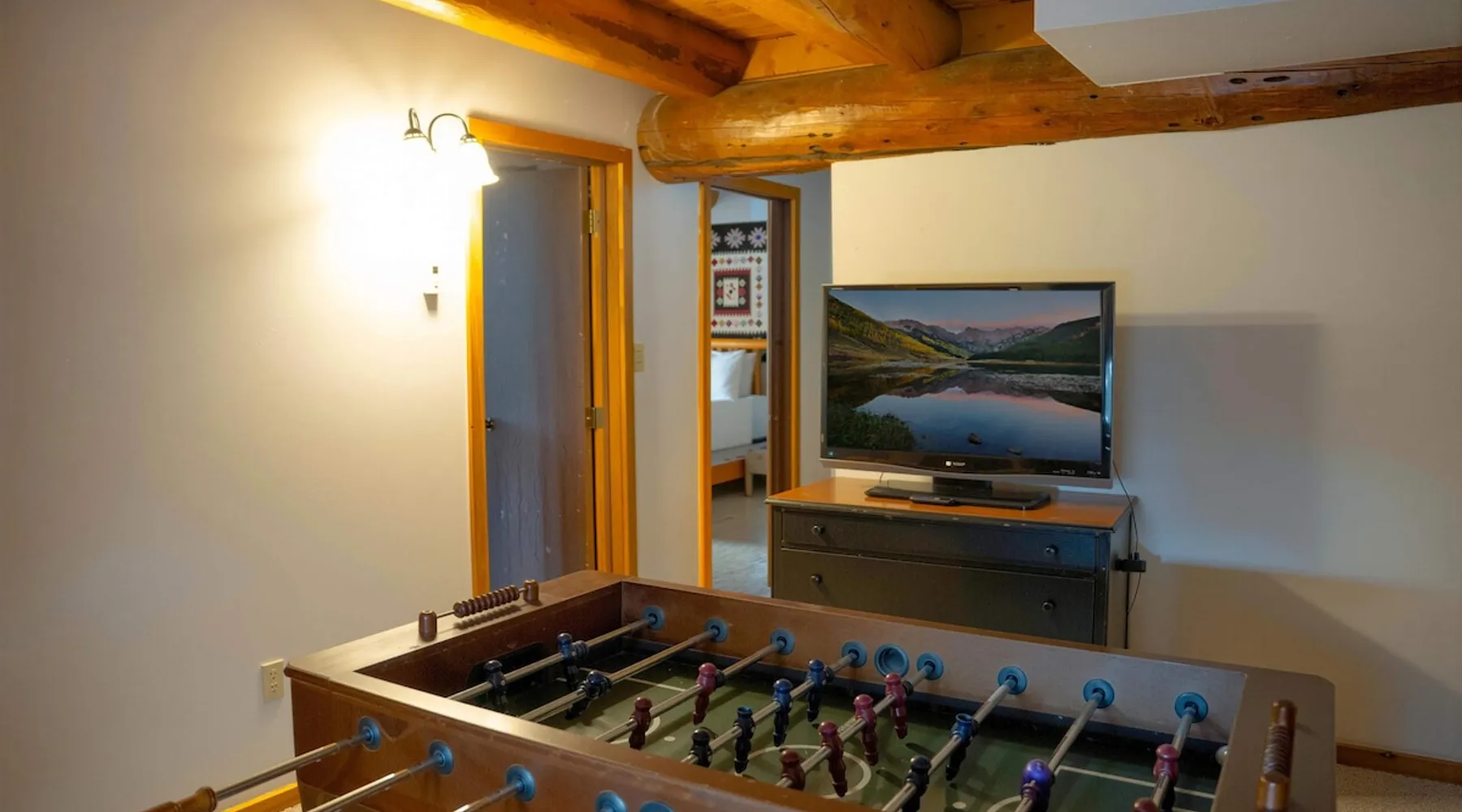 Escape to this spacious 6-bedroom vacation rental in Summit County, nestled against serene White River National Forest land. Perfect for family reunions or group getaways, this 3-level log cabin features a hot tub, multiple living areas, and a full kitchen. Relax by the fireplace, grill on the back porch, or explore nearby trails and world-class ski resorts. Book this Silverthorne retreat for your next mountain adventure. The space Location perks: Dillon Reservoir (4.1 miles), Keystone Ski Resort (9.6 miles), Copper Mountain (13.3 miles), Arapahoe Basin (14.5 miles), Breckenridge Ski Resort (14.8 miles) Interior: — Kitchen (drip coffee maker, blender, cooking utensils, tableware) — Smart TVs (living room, bedroom 5, rec room) — Gas fireplace — Rec area with foosball table — Free WiFi (400 Mbps) — Ceiling fan, portable fans, boiler-fueled baseboard heating, no A/C — Washer and dryer — 3,352 sq. ft. Exterior: — 6-person hot tub — Gas grill — Multiple decks and balconies with mountain and forest views — Backyard with direct trail access — On-site parking for 4 vehicles in the gravel driveway Upper floor: Loft area, 3 bedrooms (king bed, queen bed, 2 twin beds), jacuzzi tub & balcony w/ seating Main floor: 2 spacious living rooms, dining area, kitchen, 1 bedroom (queen bed), half bathroom Lower floor: Rec area, 2 bedrooms (queen bed, 3 twin beds), 1 en-suite bathroom, 1 full bathroom, washer/dryer Permit #: STR21-02100 Guest access Guests will have access to the entire property. Driveway parking for 4 vehicles is available. Other things to note We are offsite but available when needed. Please message us through the app or booking platform for the quickest response. Registration details STR21-02100