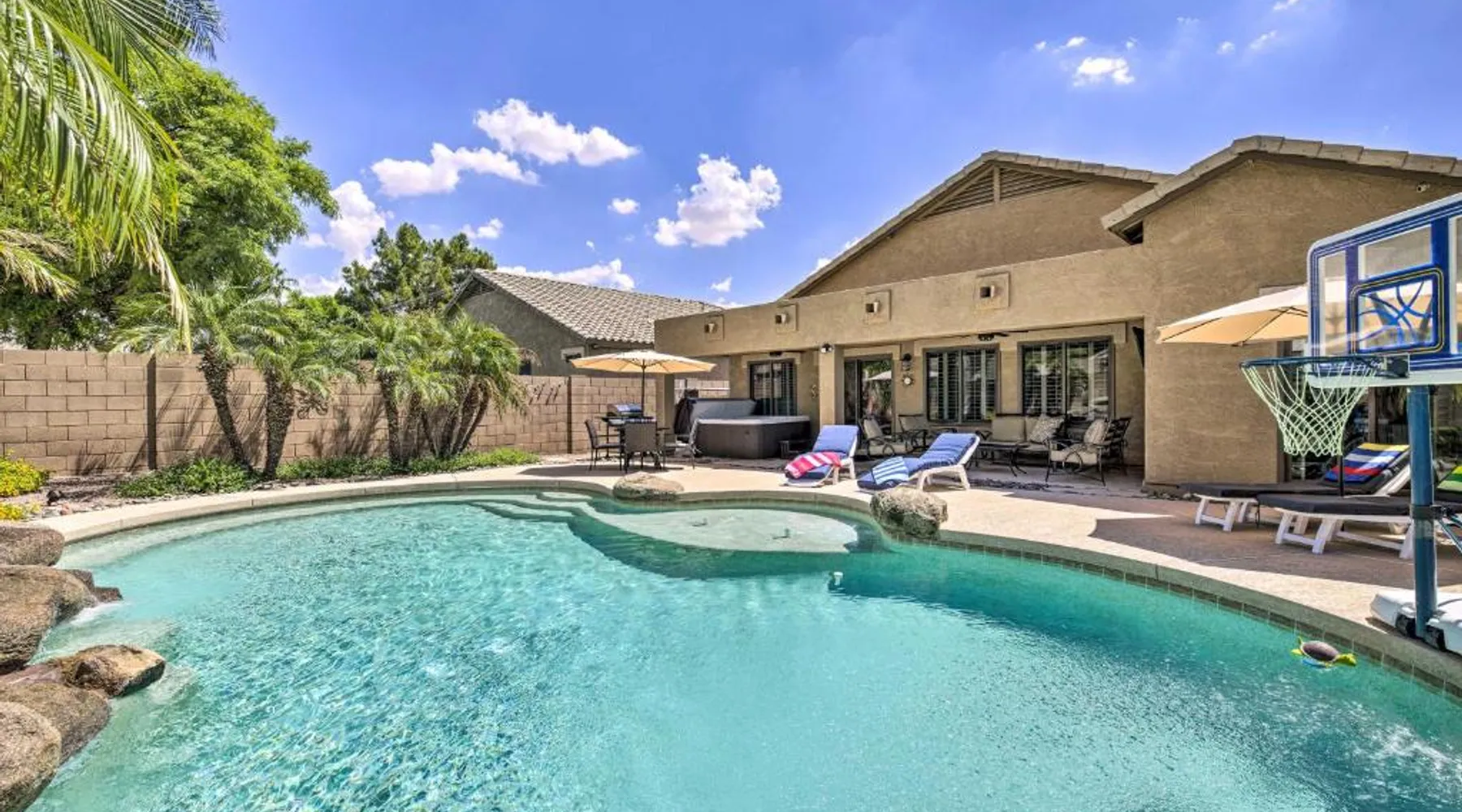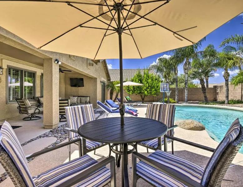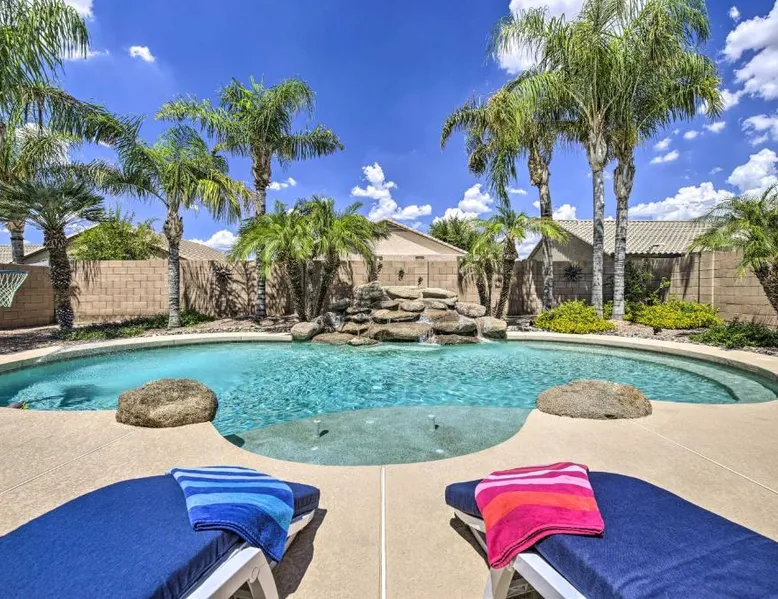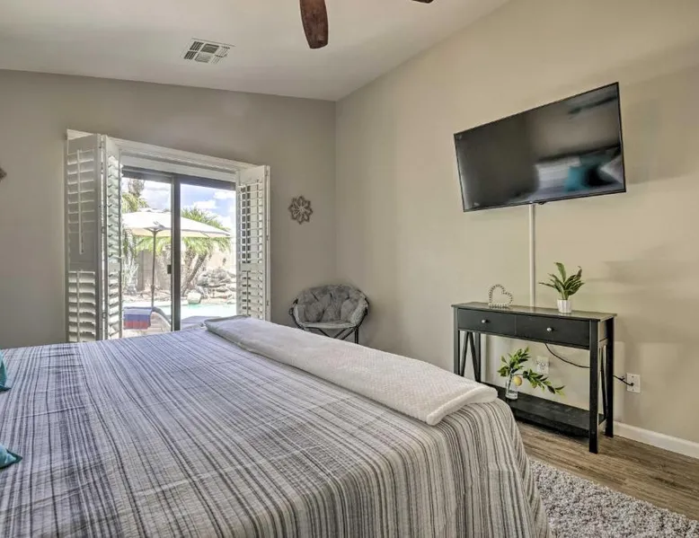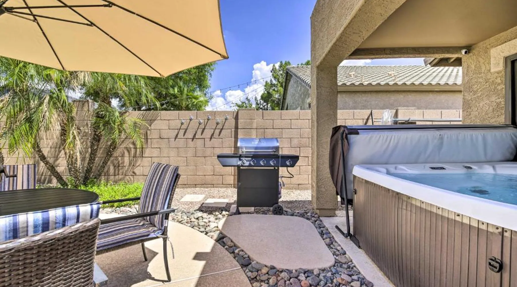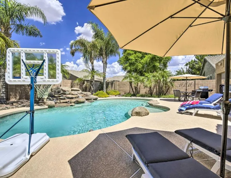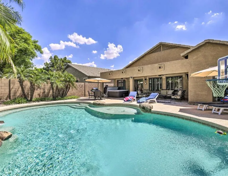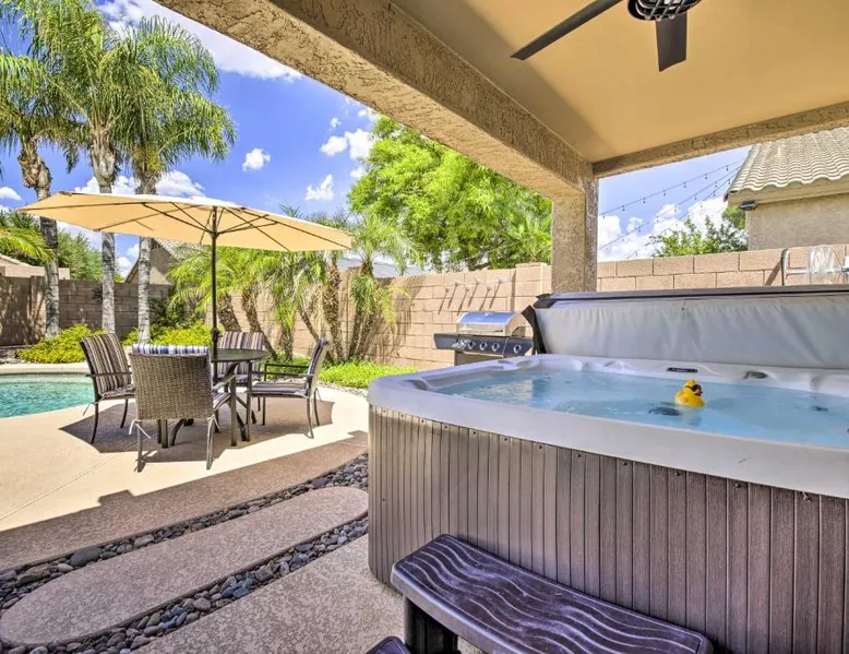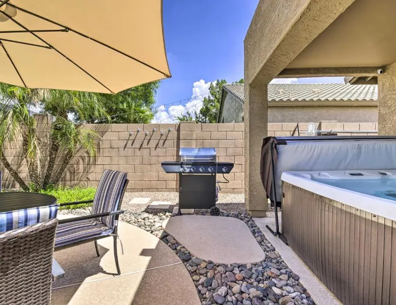 Spacious Accommodations: Pool, Hot Tub and Patio Mesa Oasis Desert Getaway in Mesa offers a spacious holiday home with three bedrooms and two bathrooms. The ground-floor unit features a living room and a fully equipped kitchen. Outdoor Amenities: Guests can enjoy an outdoor swimming pool, hot tub, and patio. The property includes a washing machine, barbecue, and outdoor dining area. Free WiFi is available throughout the stay. Convenient Location: Located 6.2 mi from Phenix-Mesa Gateway Airport, the holiday home is near attractions such as Sea Life Arizona (22 mi) and Phenix Zoo (25 mi). Paid on-site parking is provided. This holiday home's special features are the private pool and the hot tub. Boasting a private entrance, this air-conditioned holiday home includes 1 living room, 3 separate bedrooms and 2 bathrooms with a bath and a shower. Guests will find a stovetop, a refrigerator, a dishwasher and kitchenware in the kitchen. The holiday home also features a barbecue. The spacious holiday home offers a washing machine, a coffee machine, a wardrobe, tumble dryer, as well as a flat-screen TV with cable channels. The unit has 4 beds.