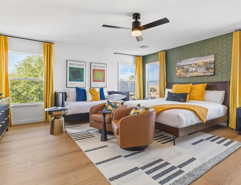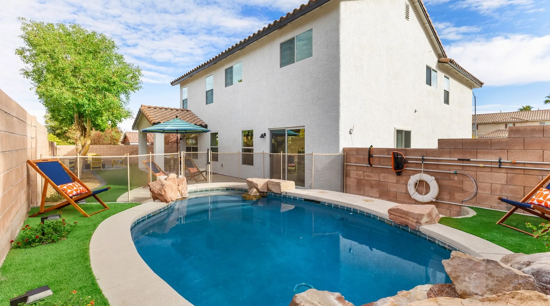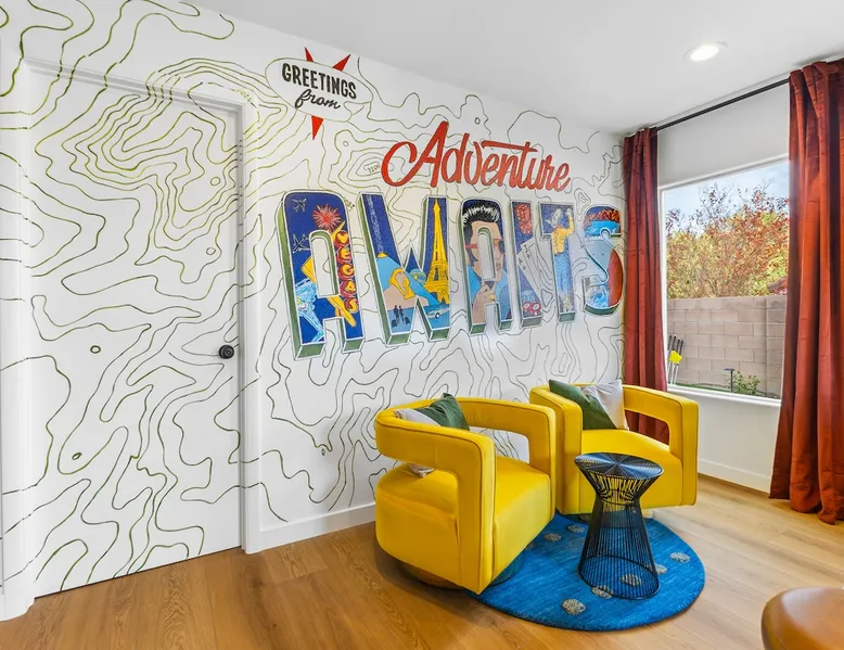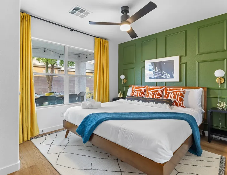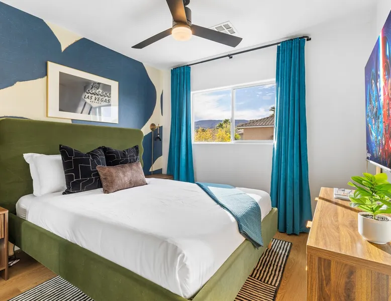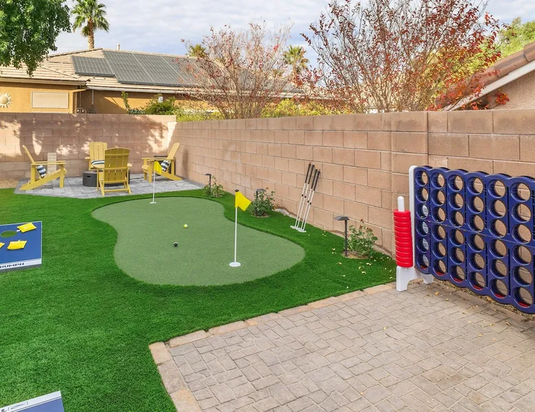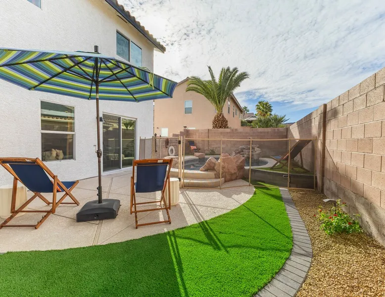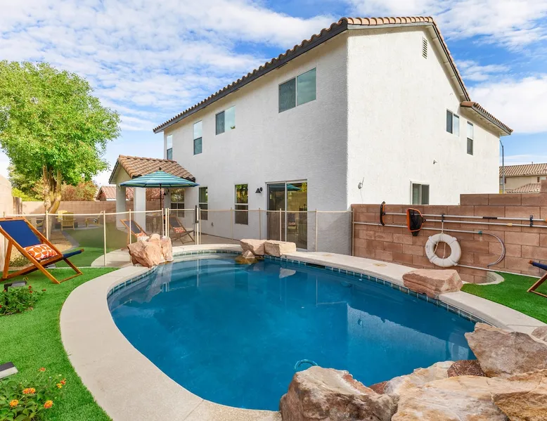 THE COOLEST short-term rental in Las Vegas!! Centrally located in the great MacDonald Highlands area of Henderson, 15 min from the world-famous Las Vegas Strip. Our LICENSED, fun, and fashionable 6BD/3 full BA home in this upscale neighborhood is the perfect spot for your family and friends. Relax around your private heat-able plunge pool or play in our incredible game room with custom hand-painted black light art by a local artist! The space Our home named "Adventure Awaits" is perfect for your family, friends, business professionals, conventioneers, or traveling groups who prefer to setup base together in a centrally located home with a kitchen in a quiet neighborhood. Important note: We require our guests to follow the City of Henderson Good Neighbor Policy, which includes (among other things) controlling noise at the home. Please see below for further details. Your group will have the best of both worlds at our home...part of your group can enjoy the Las Vegas Strip and another part of your group can stay and have a blast at home. At a glance: ★ Sleeps up to 14 adults in beds ★ 15 minutes to the airport (Harry Reid International) ★ 15 minutes to the Las Vegas Strip ★ 2-Car garage parking ★ 1 Bedroom downstairs, 5 bedrooms upstairs (3 King and 7 Queen beds) ★ 1 Full bathroom downstairs, 2 full bathrooms upstairs. ★ Views of the Las Vegas Strip from a few upstairs bedrooms!! Here’s what your group will enjoy!: ★ Amazing custom heat-able plunge pool with a childproof safety fence ★ Beautiful and relaxing backyard with a 2-hole putting green, firepit, dining area, and yard games. ★ 6 bedrooms, each with their own brand new 4K SmartTVs. ★ Massive 400 square foot game room (Bedroom #6) with custom black light artwork by a local artist, stand-up arcade games, pool table, air hockey table, shuffle board table, and an 85" 4K Smart TV. Street Fighter, Golden Tee, and Ultimate Legend arcade games with hundreds of games onboard included for free. ★ Adult-sized Queen-over-Queen bunk bed in the Game Room. ★ Professionally decorated interior ★ Brand new 75” 4K smartTV in living room ★ Outdoor gas grill ★ High speed internet inside and outside the property, up to 500 Mbps internet speed ★ 2-car garage parking and 2-car driveway private parking ★ Close to many attractions. See the list we've prepared for you below. ★ Less than 0.5 mile to supermarkets, local restaurants, and Starbucks ★ Covered patio ★ Board games ★ Very well equipped kitchen with Quartz countertops ★ Large 10-person group dining table and a 6-person outdoor patio dining table ★ Double sinks in majority of bathrooms ★ Ceiling fans in all bedrooms and living room ★ Easy entry/exit from home (unlike casino hotels) ★ Bring your own log-in for TV programming or cast right from your handheld device directly to smartTVs. We have the latest SmartTVs. Nearby attractions - What's there to do around Henderson?: ★ 3 Miles from Green Valley Ranch Resort and Casino ★ Hiking trails (see the list below) ★ 7 Golf courses within city limits. We are very close to Dragonridge Country Club ★ All the recreation available at Lake Mead and Lake Las Vegas ★ Hoover Dam ★ Locomotives at Clark County Heritage Museum ★ Petroglyph designs and rock carvings from previous civilizations at Sloan Canyon National Conservation Area ★ Cowabunga Bay Water Park ★ View desert birds at Henderson Bird Viewing Preserve ★ Breweries and whiskey houses ★ And, let's not forget the Vegas Strip (Sin City)! Nearby hiking trails: -Amargosa Trail -McCullough Hills Trail -Caesar, Big Mother and Old Vegas Loop -Mountain Loop Trail (hike or bike) -Railroad Pass Trail -Lizard Rocks Loop Trail -Mount Scorpion and Black Mountain Trails -Loki Loop Trail MORE DETAILED INFO BELOW. FEEL FREE TO SEND US A MESSAGE WITH ANY QUESTIONS YOU MAY STILL HAVE. WE RESPOND VERY QUICKLY. WE WOULD LOVE TO HOST YOU AT OUR LOVELY HOME! Guest access The entire home is accessible to our guests with a personalized door code shared with you before your check-in (minus 1 owner's closets in the master bedroom). Other things to note PRIVATE PARKING: 2 Car garage parking, plus, 2 car capacity driveway parking. Our driveway is relatively flat. Do not leave our garage door open for an extended period of time. Utilize all on-site parking before parking on the street. OCCUPANCY: Per city rules, MAXIMUM OCCUPANCY OF THE PROPERTY IS 14 persons of any age at any given time. Only the number of guests listed in your reservation (up to 14 persons) are permitted on the property at any given time. If you plan to have daytime visitors, please include them in your guest count. There is a $500 charge and your reservation will be cancelled without a refund for violating this maximum occupancy rule. ENTRY: The front door is equipped with an electronic keypad, we will send a personalized door code before check-in. Check-in any time after 4pm Pacific Time Zone. Check out is at 10am Pacific Time Zone. No late check-out or early check-in. If you arrive early or depart late, additional charges will incur. INTERNET/CABLE: High Speed Wireless Internet throughout the home. Do not modify or turn off the internet system of the home. Smart TVs in each of the 6 bedrooms and 1 common area. No cable programming provided due to the multitude of streaming/screen-casting options guests typically have nowadays on our SmartTVs. If you are unfamiliar with this concept, just ask us about how this works. Most people already have this ability, but are not aware. BEDROOMS: The 6 bedrooms can accommodate up to 14 adults as follows: Downstairs- Bedroom with King bed (2 adults) Upstairs- Master Bedroom with King bed (2 adults), dedicated bathroom Bedroom with King bed (2 adults) Bedroom with Queen bed (2 adults) Bedroom with Queen bed (2 adults) Game room with Queen over Queen bunk bed (4 adults) BONUS BED: The Master bedroom also has a day bed with a twin sized mattress that can a
