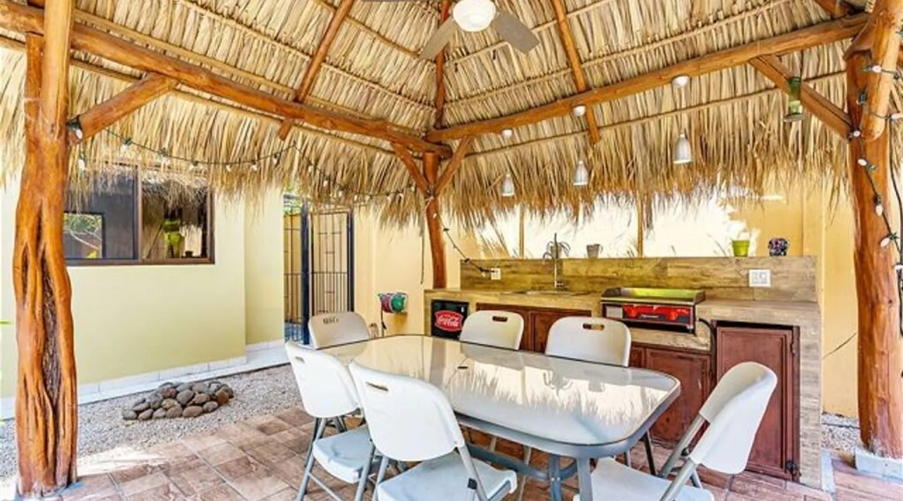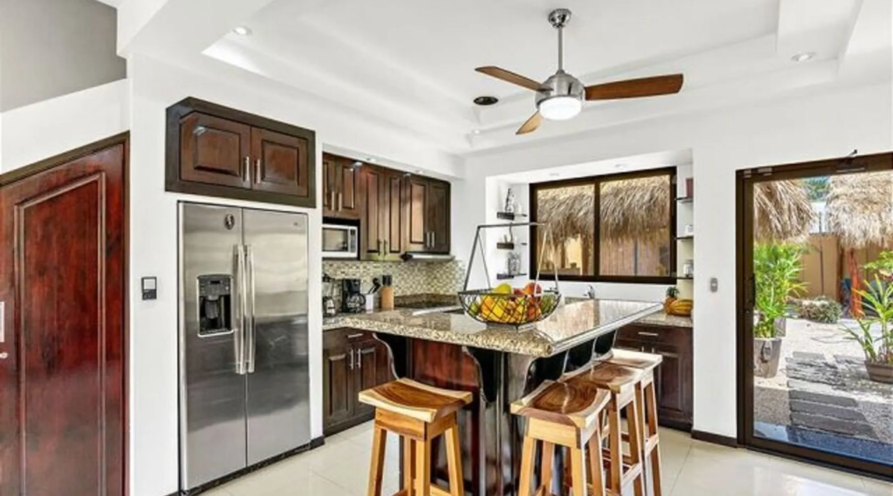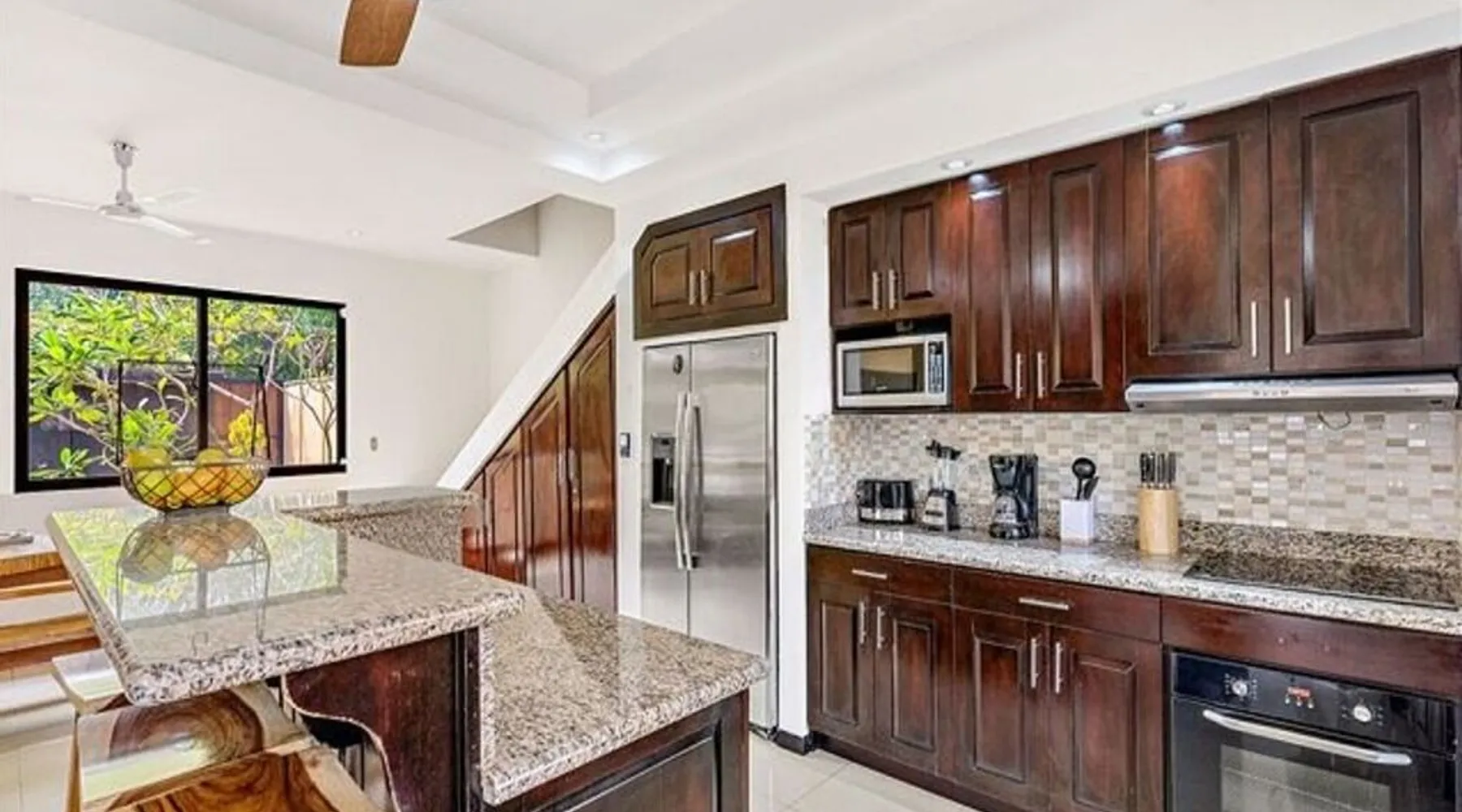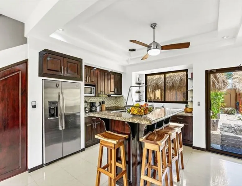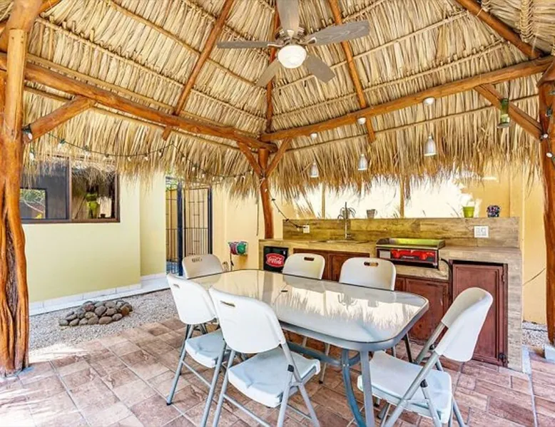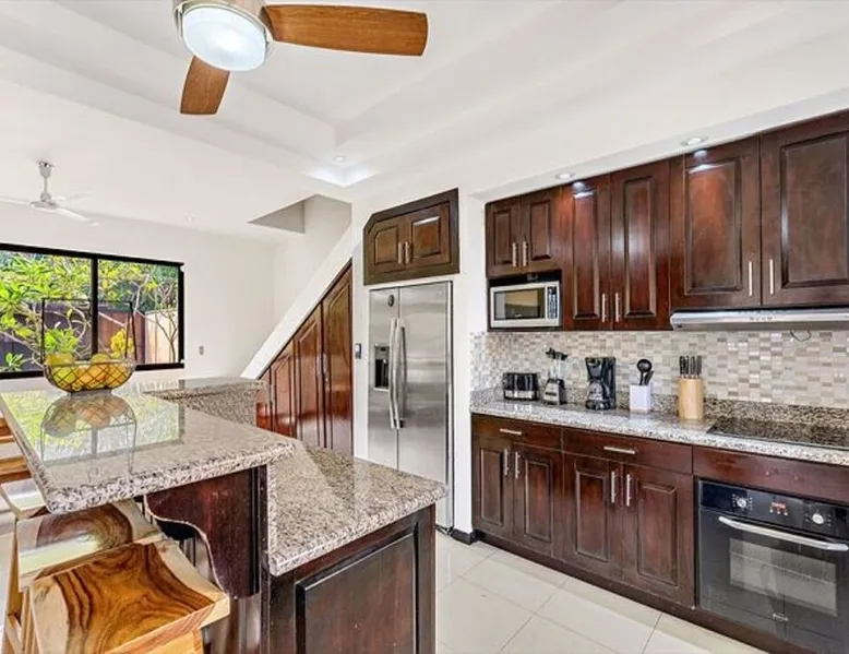Fully equipped kitchen with modern cookware and appliances. The master suite is located on the second floor, separate from the other three bedrooms. Private parking within the complex. The backyard includes a storage room with a washer/dryer and additional storage space, along with a terrace featuring a gas BBQ grill.