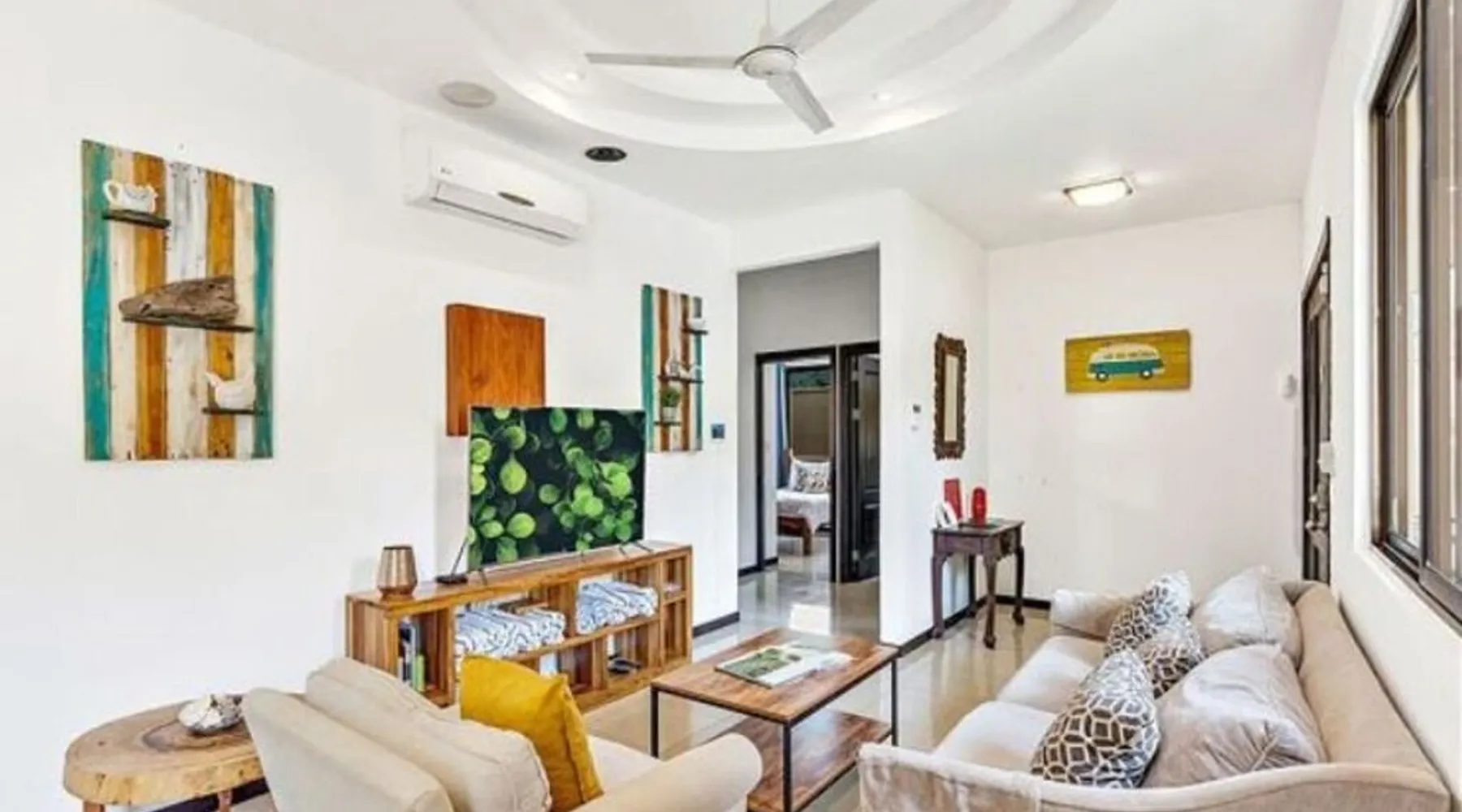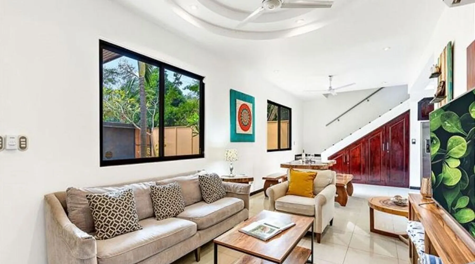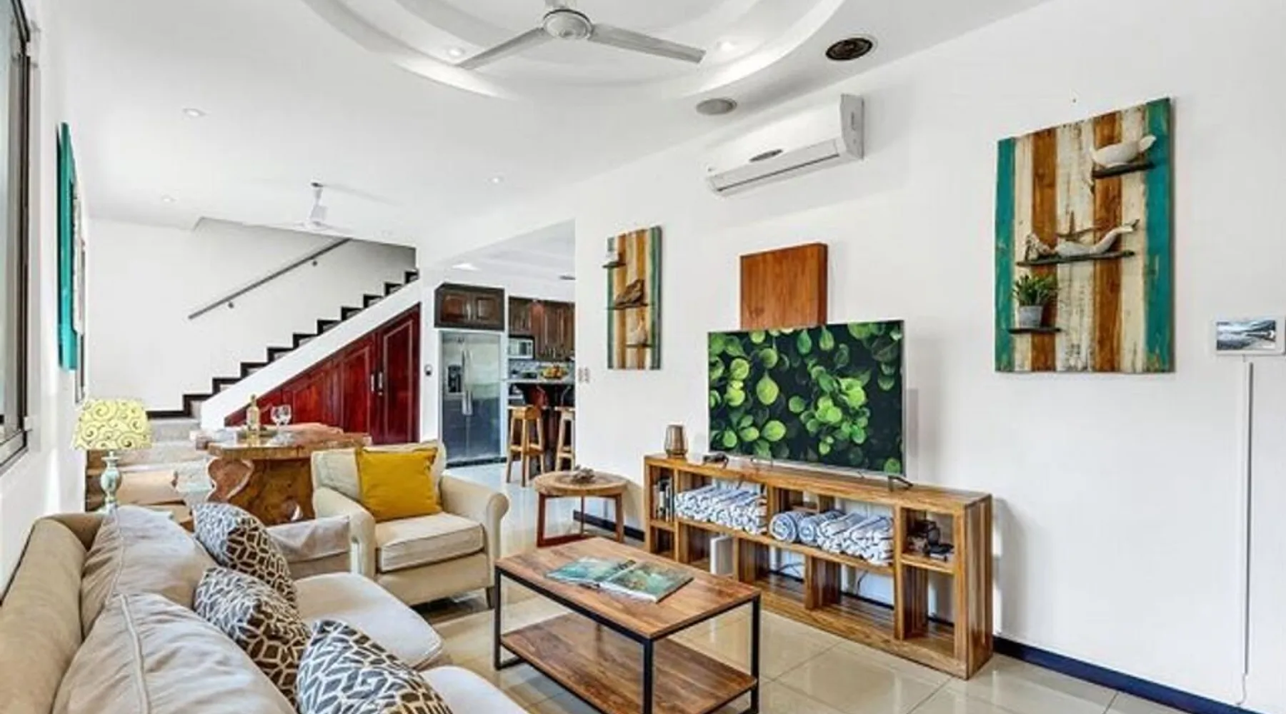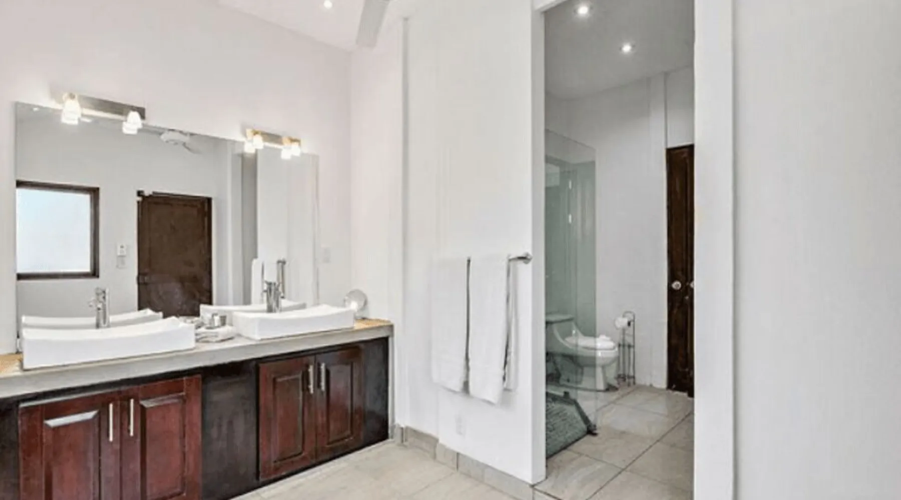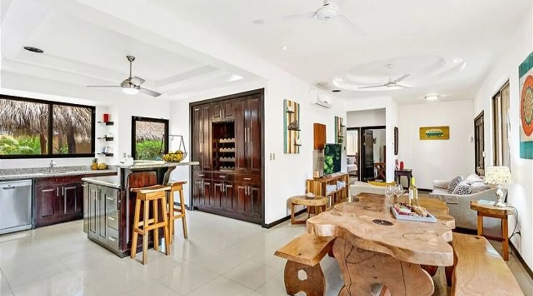 Fully equipped kitchen with modern cookware and appliances. The master suite is located on the second floor, separate from the other three bedrooms. Private parking within the complex. The backyard includes a storage room with a washer/dryer and additional storage space, along with a terrace featuring a gas BBQ grill.