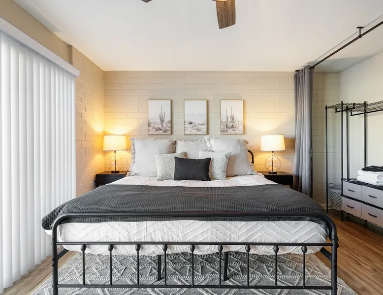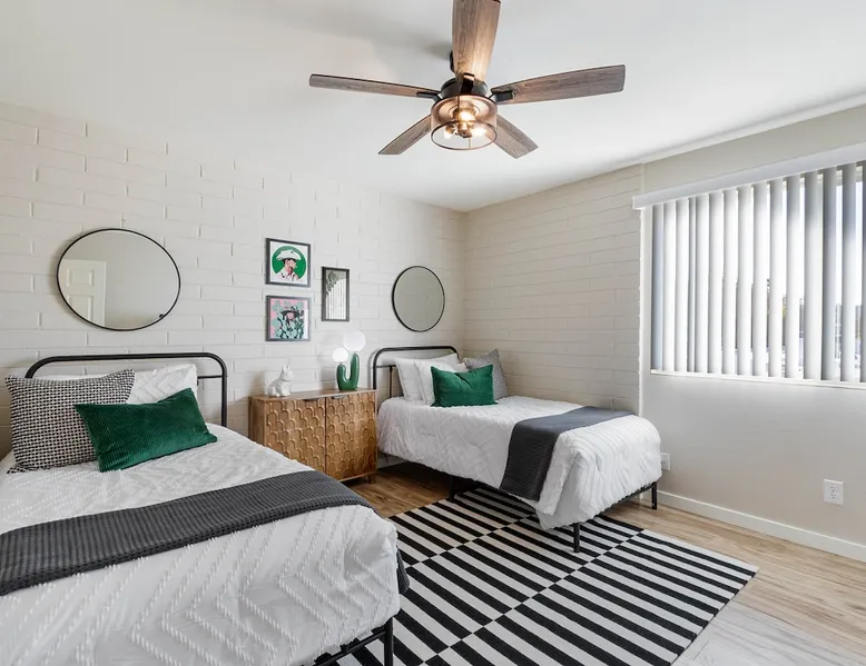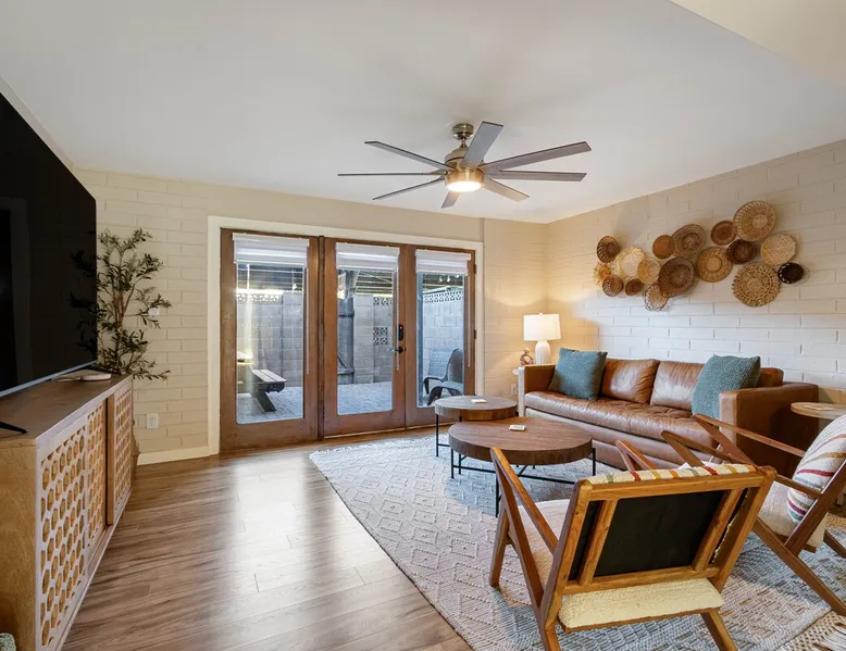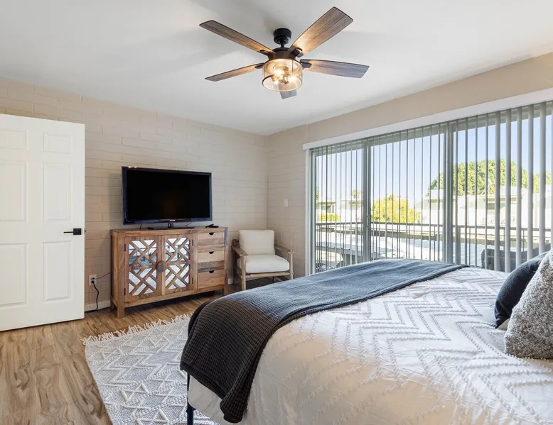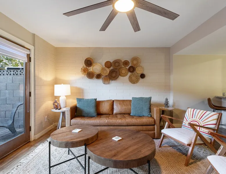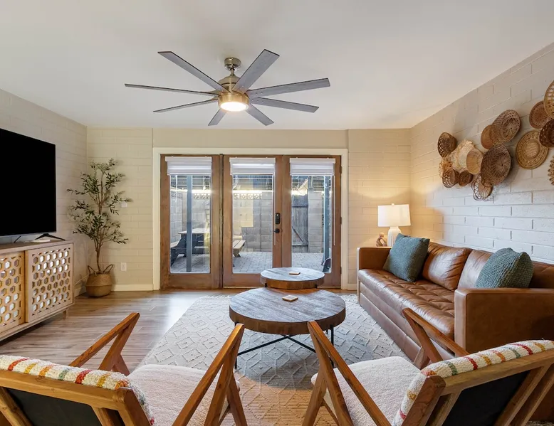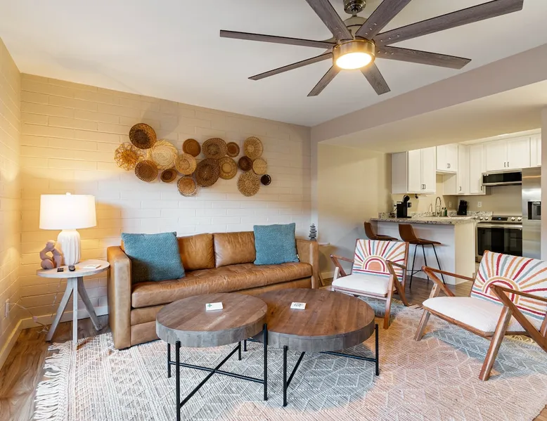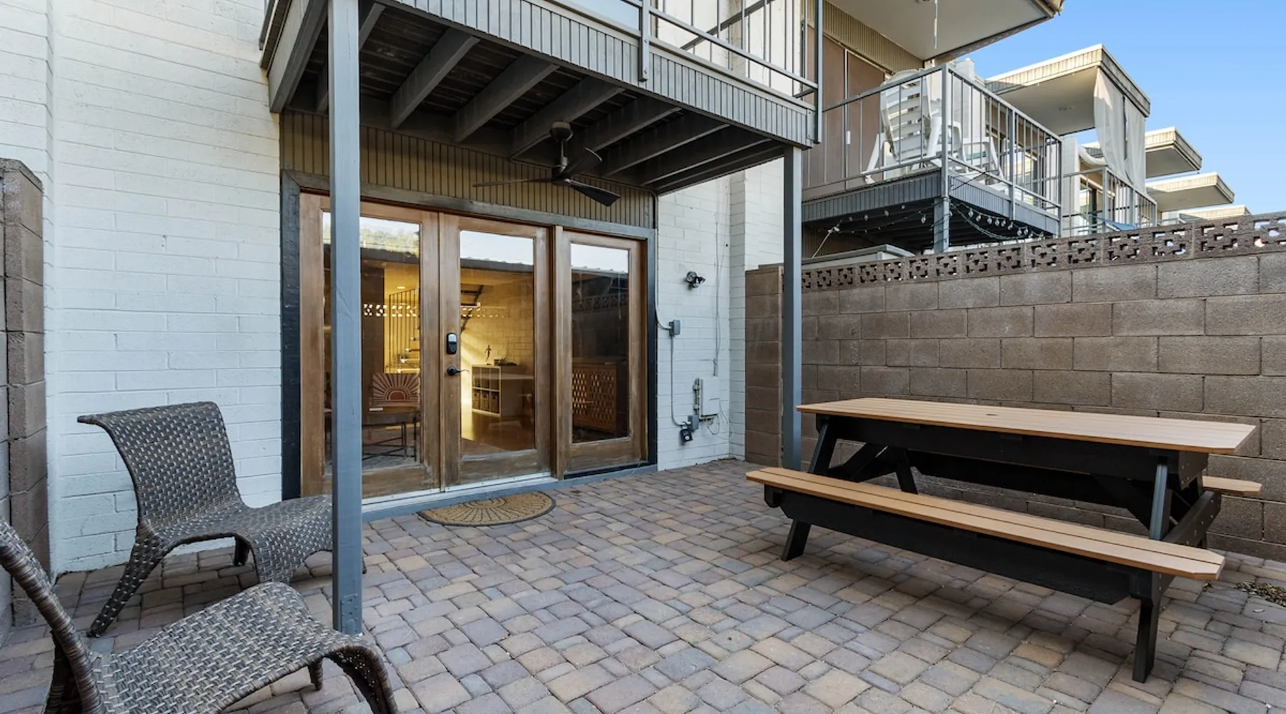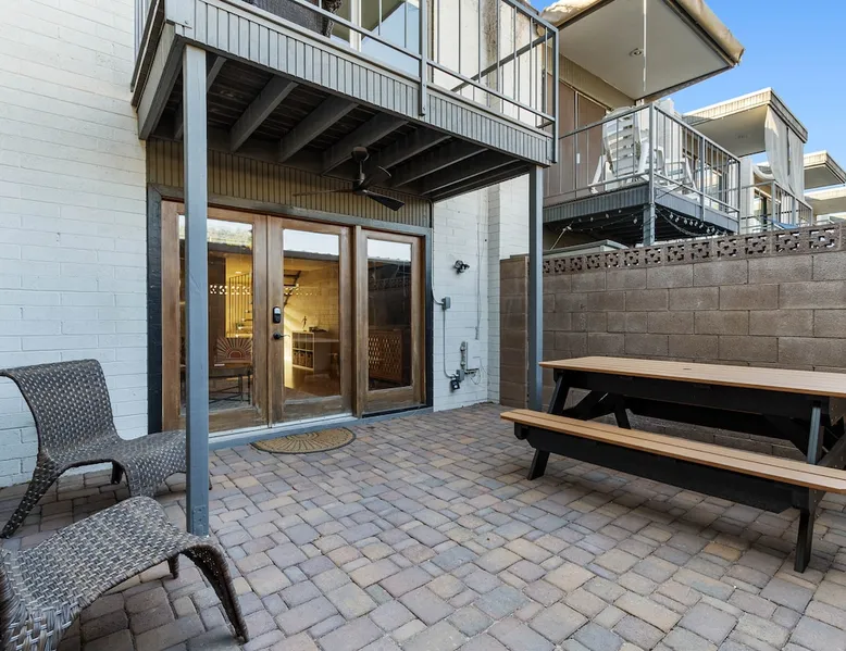 Old Town Charm- Walk to Old Town, Pool + Pet Friendly! Arizona TPT #21601354 The space Scottsdale Old Town Charm is a wonderful fully- remodeled townhome with lots of features and amenities making it the perfect choice for your Scottsdale getaway. You’ll be situated in the popular Old Town Scottsdale area, putting you within walking distance to many popular attractions and exciting activities. This two-story townhome features 1,200 square feet with two bedrooms and one and a half bathrooms to sleep up to six guests. You’ll enter through the front door and down the hallway, stepping into the living room and kitchen spaces. Living Room: This room offers a comfortable queen sleeper sofa, a Smart TV and access to the spacious back patio. Kitchen: Fully equipped, the kitchen features stainless steel appliances including a glass top stove and a spacious breakfast bar with seating for two. Bedrooms/Bathrooms: Bedroom 1 (upper level) — King-size bed, 50” Smart TV and a private patio. Bedroom 2 (upper level) — Two twin beds Bathroom 1 (upper level) — Full shared bathroom with tub/shower combo Half bath on the main level Outdoor spaces: Enjoy spending time outside on the patio featuring plenty of seating and a picnic table to enjoy meals outdoors. Community amenities: Take advantage of the community pool. Internet Access: High-speed Wi-Fi Internet Laundry: Stackable washer and dryer Parking: One assigned covered parking spot with additional street parking. Air conditioning: Yes, central Pets: Yes, one pet allowed with a $100 non-refundable pet fee Security cameras: No Distances: Old Town Scottsdale –1.1 miles OdySea Aquarium — 6.2 miles Scottsdale Waterfront & Fashion Square Mall – 1.6 miles Scottsdale Museum of Contemporary Art — 1.2 miles Talking Stick Golf Club – 35.8 miles Scottsdale Airport — 13.5 miles Please note: Pursuant to ARS § 32-2121 Property Manager does not solicit, arrange or accept reservations or monies, for occupancies of greater than 31 days. Arizona TPT #21601354 City of Scottsdale Permit #2037757 Guest access Guest has full access to the property and its amenities including one covered parking space and street parking, laundry room with washer/dryer, outdoor patio seating area, and central air conditioning. There is also a community pool for guest use.