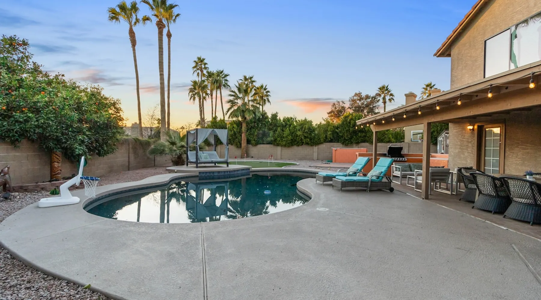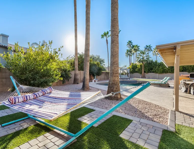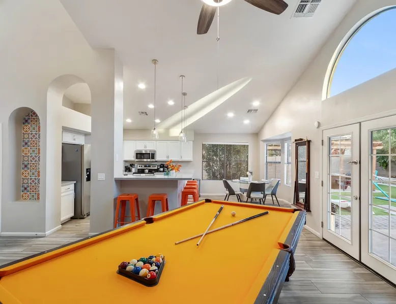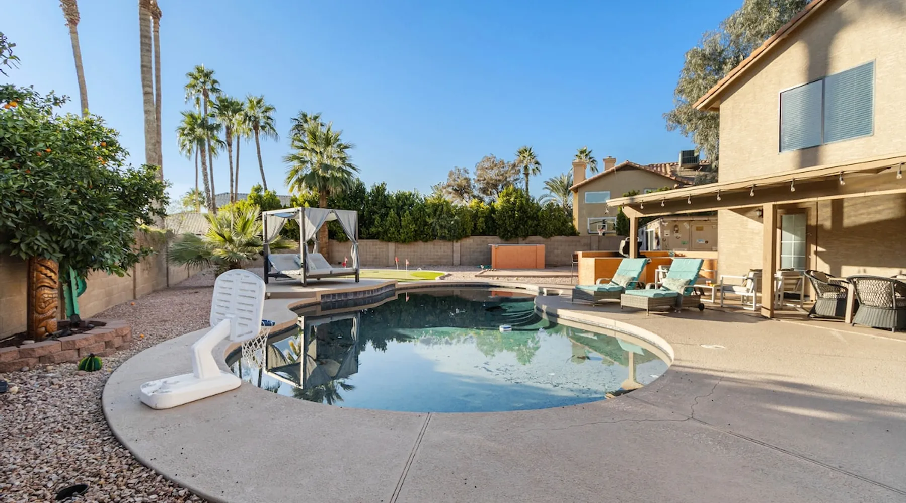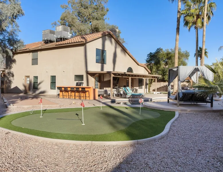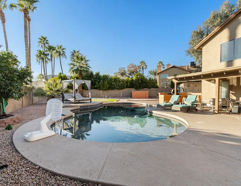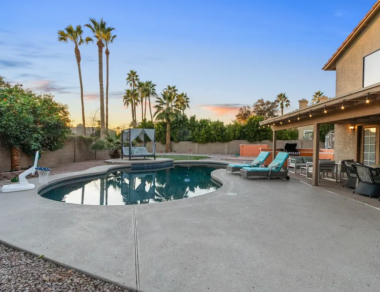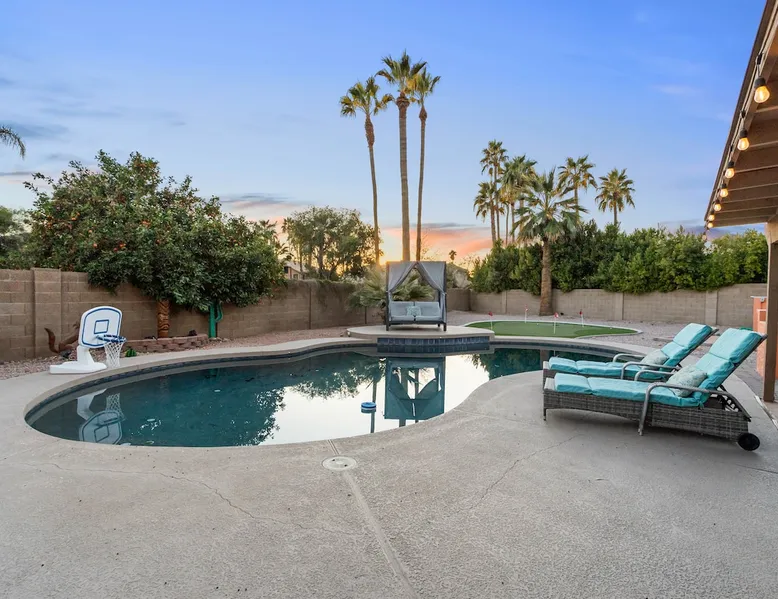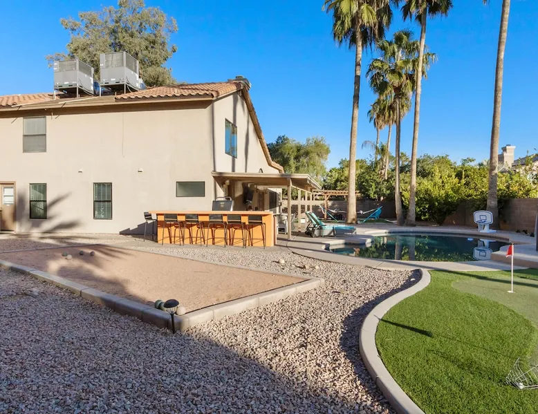 Luxury Paradise Palms Home | Pool, Hot Tub, Putting Green & More! The space This stunning and vibrant Paradise Palms property in Scottsdale is the ideal choice for your next visit! Located in a peaceful neighborhood at the heart of North Scottsdale, you'll be conveniently close to popular attractions and activities such as Kierland Commons and Scottsdale Quarter. This two-story home offers a spacious 2,639 square feet of living space, with five bedrooms and two and a half bathrooms to easily accommodate up to 16 guests — a terrific property for those with larger groups. After stepping through the front door, you will find yourself in the spacious front living room and dining room. After a few more steps you will then be in the main great room, which offers the pool table room and kitchen area. Living Room: This room offers contemporary furnishings including a spacious sectional and colorful accent chairs and a Smart TV. Dining Room: Next to the living room, the dining area offers seating for eight guests. Kitchen: Around the corner you will find the kitchen. The kitchen is fully equipped with stainless steel appliances and stocked with everything needed to prepare delicious meals for your group! The spacious bar top offers bar stools for six, making it a perfect place to gather! Game Room: Enjoy some entertainment on the Smart TV while playing a game on the pool table- making this spot an ideal hang out! Bedrooms/Bathrooms: Master Suite (main level)— King bed, Smart TV, desk area and private access to the backyard. The en suite bathroom offers two sinks and a spacious shower Bedroom 2/Bunk Room (upper level) — Two Twin over Full bunk beds and One Twin over Twin bunk bed. Bedroom 3 (upper level) – King size bed and access to shared bathroom Bedroom 4 (upper level) – King size bed and access to shared bathroom Bedroom 5 (upper level) – King size bed, Smart TV and access to shared bathroom Bathroom 2 (upper level) – Full shared bathroom with dual sink and tub/shoer combo Half bathroom on main level Outdoor spaces: The backyard space is spacious and offers endless fun! Plenty of outdoor seating under the covered patio where you can enjoy an outside meal or enjoy some entertainment on the Smart TV. Take a dip in the pool (not heated) or relax in the above ground hot tub. Enjoy a book on the hammock or sit next to the firepot with friends. Plenty of outdoor games are available including a putting green, bocce ball court and corn hole. There’s also a propane BBQ grill for grilling up your favorites. Internet Access: High-speed Wi-Fi Internet Entertainment: Smart TVs with cable provided by owner Laundry: Full size washer and dryer in the laundry room Pool: Yes, not heated. 8 feet diving pool. Hot Tub: Yes, private above ground Parking: Two car garage, with additional driveway parking for up to two vehicles. Air conditioning: Yes, central Pets: Yes, Two dogs allowed with a $100 non-refundable fee per dog Security cameras: No Cameras Neighborhood quiet hours are from 10 p.m. to 7 a.m. and are enforced by Scottsdale city ordinances. Thank you for respecting the neighbors. Pursuant to ARS § 32-2121 Property Manager does not solicit, arrange or accept reservations or monies, for occupancies of greater than thirty-one days. Distances: Old Town Scottsdale – 12 miles OdySea Aquarium — 11 miles Scottsdale Waterfront & Fashion Square Mall – 11.8 miles McCormick-Stillman Railroad Park – 9.3miles Kireland Commons- 3.1 miles Scottsdale Airport — 3.8 miles CDC cleanings are performed using checklists following all CDC cleaning guidelines. Arizona TPT License # 21343217 City of Phoenix Permit #STR-2025-002298 Guest access Guest has full access to the property and its amenities including 2 car garage and driveway parking, laundry room with washer/dryer, a private yard with an in-ground pool, hot tub, putting green, BBQ grill, outdoor patio seating area and central air conditioning.