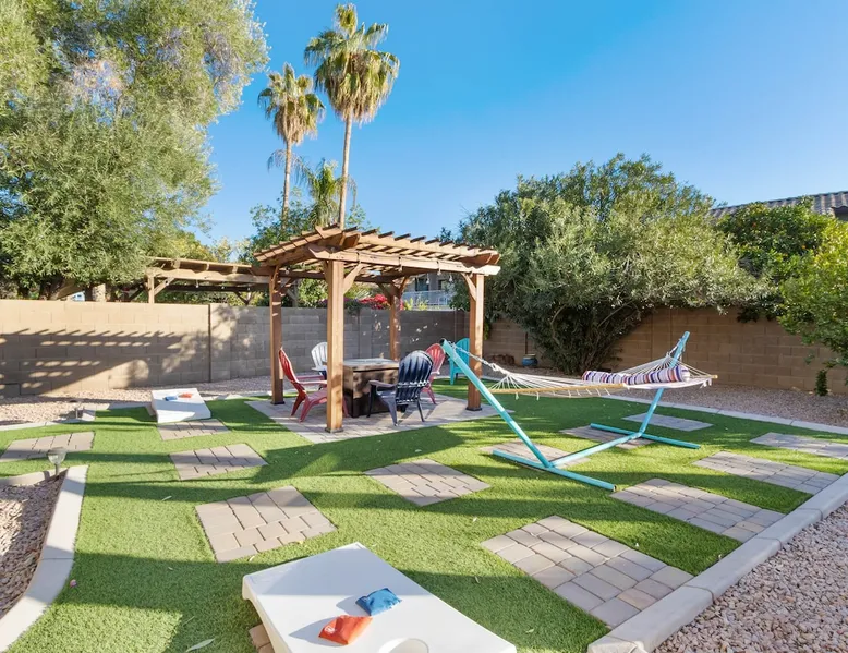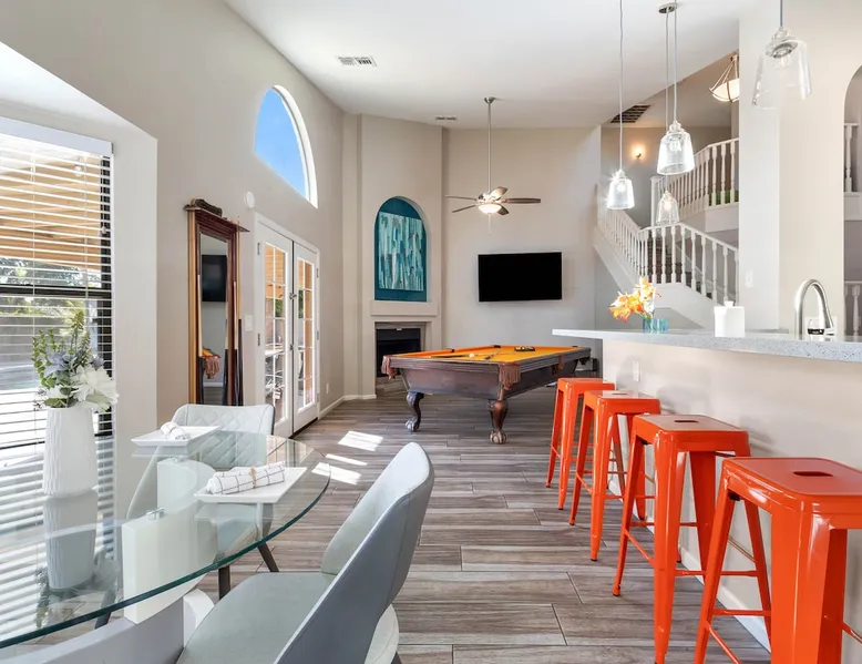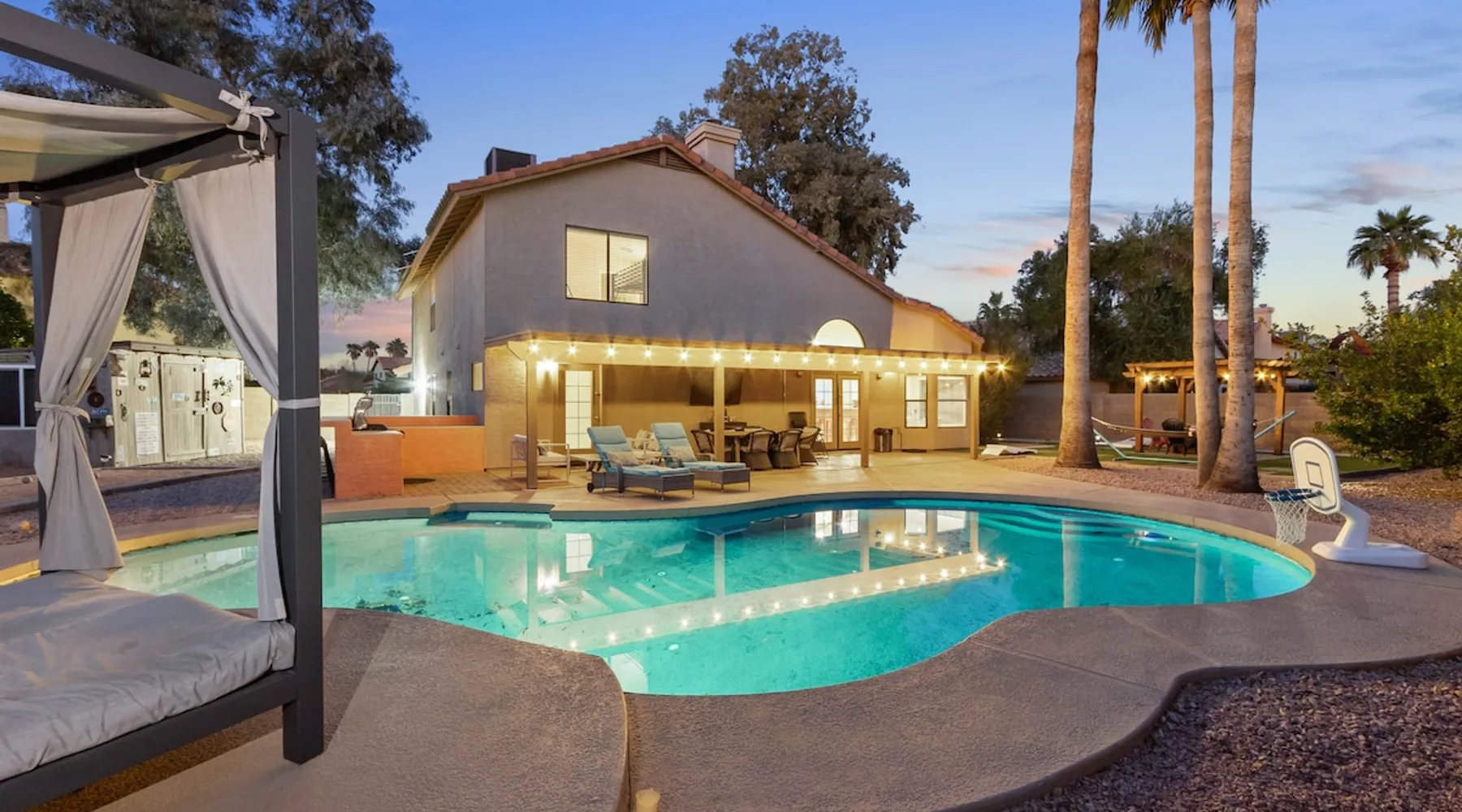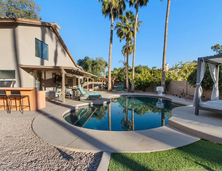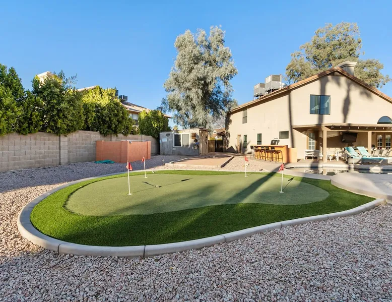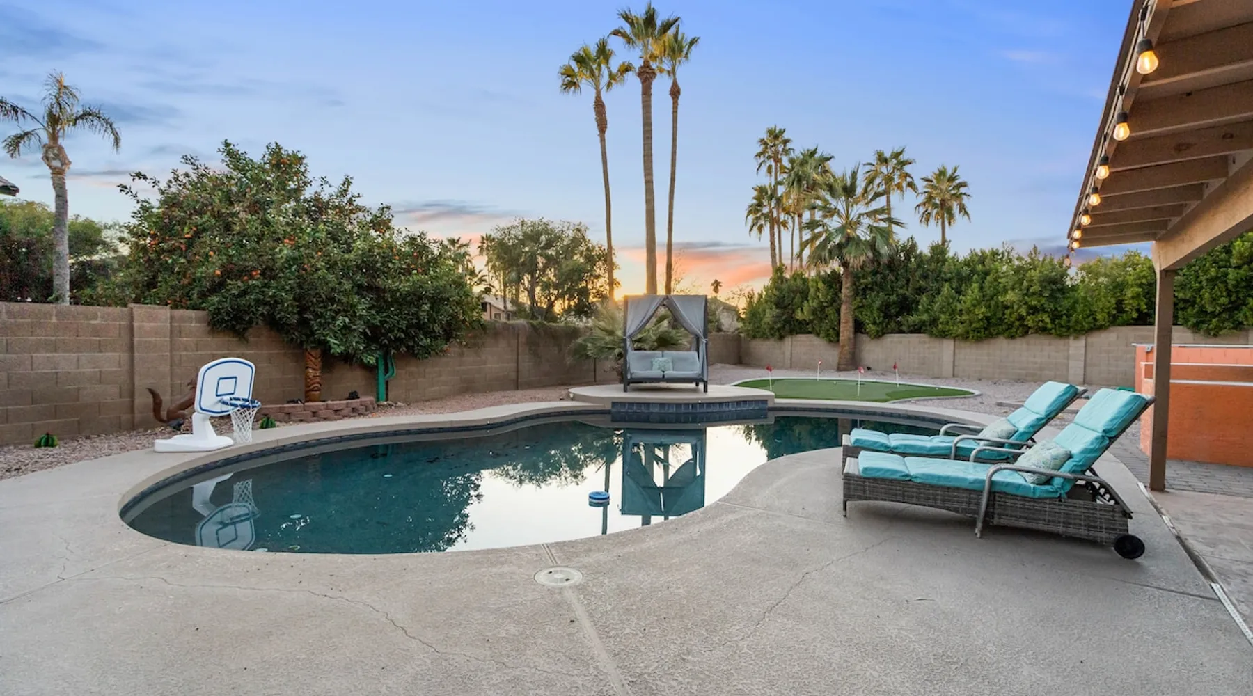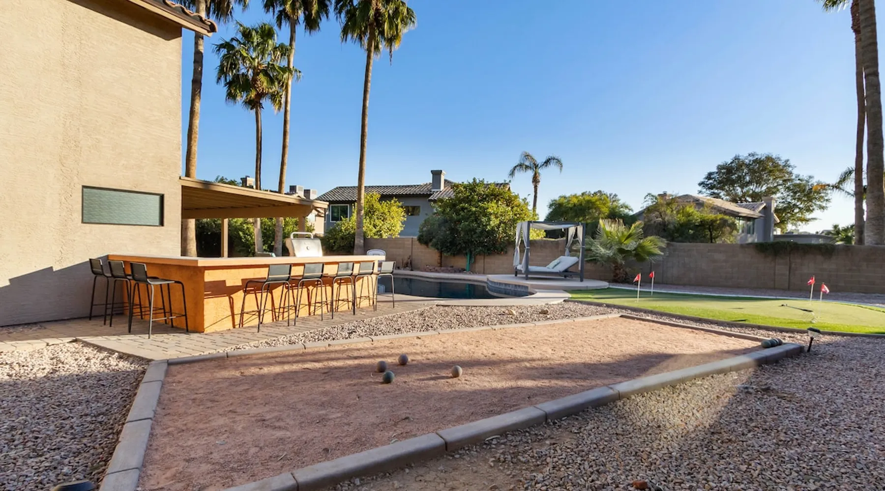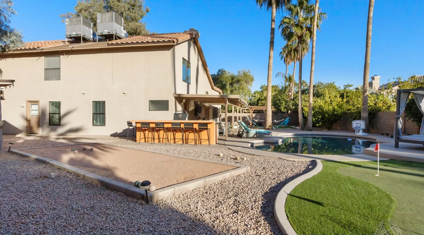 Luxury Paradise Palms Home | Pool, Hot Tub, Putting Green & More! The space This stunning and vibrant Paradise Palms property in Scottsdale is the ideal choice for your next visit! Located in a peaceful neighborhood at the heart of North Scottsdale, you'll be conveniently close to popular attractions and activities such as Kierland Commons and Scottsdale Quarter. This two-story home offers a spacious 2,639 square feet of living space, with five bedrooms and two and a half bathrooms to easily accommodate up to 16 guests — a terrific property for those with larger groups. After stepping through the front door, you will find yourself in the spacious front living room and dining room. After a few more steps you will then be in the main great room, which offers the pool table room and kitchen area. Living Room: This room offers contemporary furnishings including a spacious sectional and colorful accent chairs and a Smart TV. Dining Room: Next to the living room, the dining area offers seating for eight guests. Kitchen: Around the corner you will find the kitchen. The kitchen is fully equipped with stainless steel appliances and stocked with everything needed to prepare delicious meals for your group! The spacious bar top offers bar stools for six, making it a perfect place to gather! Game Room: Enjoy some entertainment on the Smart TV while playing a game on the pool table- making this spot an ideal hang out! Bedrooms/Bathrooms: Master Suite (main level)— King bed, Smart TV, desk area and private access to the backyard. The en suite bathroom offers two sinks and a spacious shower Bedroom 2/Bunk Room (upper level) — Two Twin over Full bunk beds and One Twin over Twin bunk bed. Bedroom 3 (upper level) – King size bed and access to shared bathroom Bedroom 4 (upper level) – King size bed and access to shared bathroom Bedroom 5 (upper level) – King size bed, Smart TV and access to shared bathroom Bathroom 2 (upper level) – Full shared bathroom with dual sink and tub/shoer combo Half bathroom on main level Outdoor spaces: The backyard space is spacious and offers endless fun! Plenty of outdoor seating under the covered patio where you can enjoy an outside meal or enjoy some entertainment on the Smart TV. Take a dip in the pool (not heated) or relax in the above ground hot tub. Enjoy a book on the hammock or sit next to the firepot with friends. Plenty of outdoor games are available including a putting green, bocce ball court and corn hole. There’s also a propane BBQ grill for grilling up your favorites. Internet Access: High-speed Wi-Fi Internet Entertainment: Smart TVs with cable provided by owner Laundry: Full size washer and dryer in the laundry room Pool: Yes, not heated. 8 feet diving pool. Hot Tub: Yes, private above ground Parking: Two car garage, with additional driveway parking for up to two vehicles. Air conditioning: Yes, central Pets: Yes, Two dogs allowed with a $100 non-refundable fee per dog Security cameras: No Cameras Neighborhood quiet hours are from 10 p.m. to 7 a.m. and are enforced by Scottsdale city ordinances. Thank you for respecting the neighbors. Pursuant to ARS § 32-2121 Property Manager does not solicit, arrange or accept reservations or monies, for occupancies of greater than thirty-one days. Distances: Old Town Scottsdale – 12 miles OdySea Aquarium — 11 miles Scottsdale Waterfront & Fashion Square Mall – 11.8 miles McCormick-Stillman Railroad Park – 9.3miles Kireland Commons- 3.1 miles Scottsdale Airport — 3.8 miles CDC cleanings are performed using checklists following all CDC cleaning guidelines. Arizona TPT License # 21343217 City of Phoenix Permit #STR-2025-002298 Guest access Guest has full access to the property and its amenities including 2 car garage and driveway parking, laundry room with washer/dryer, a private yard with an in-ground pool, hot tub, putting green, BBQ grill, outdoor patio seating area and central air conditioning.