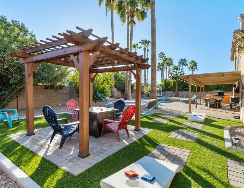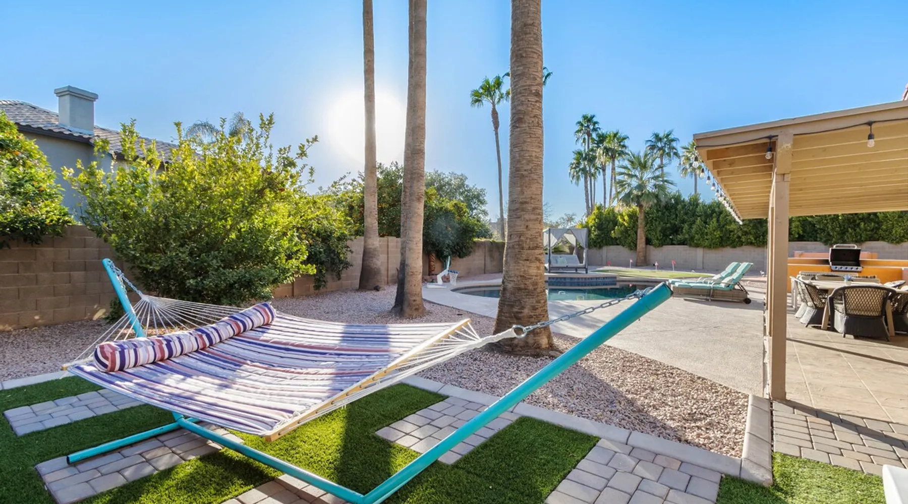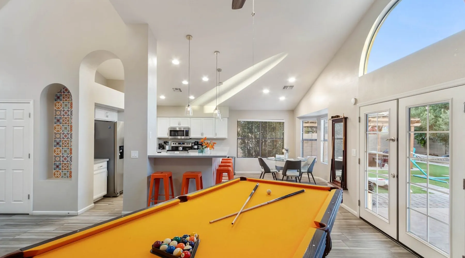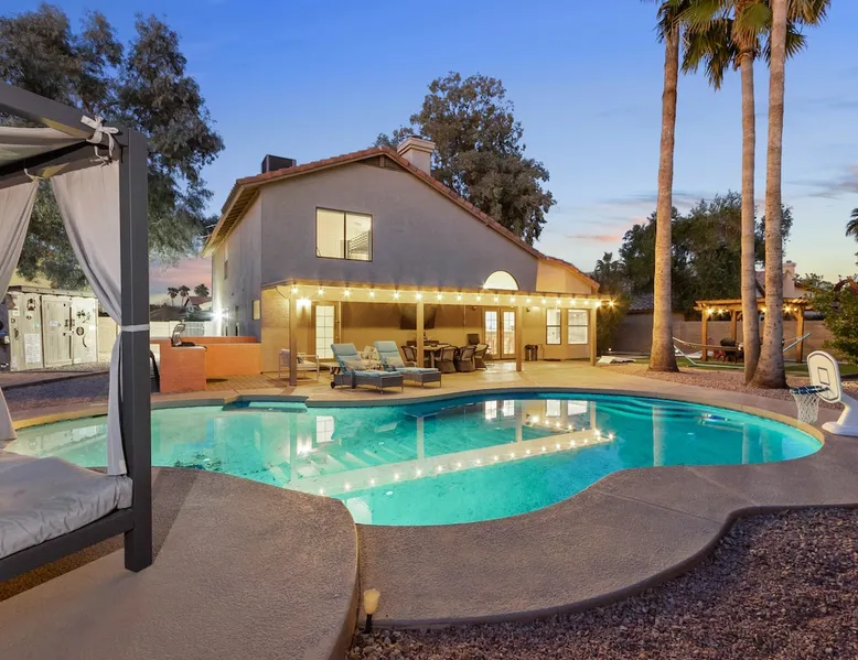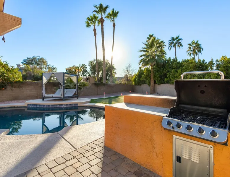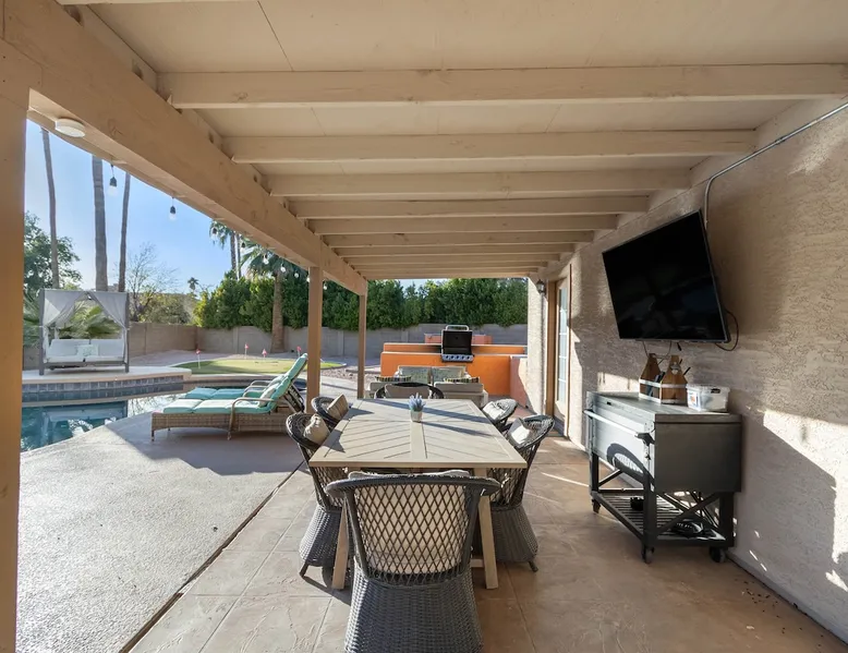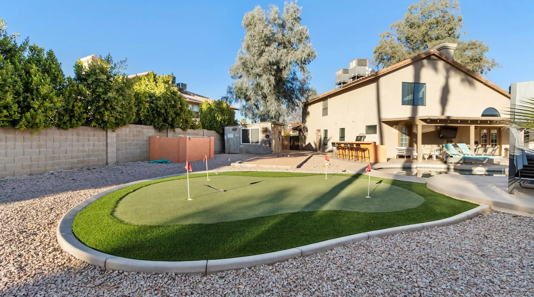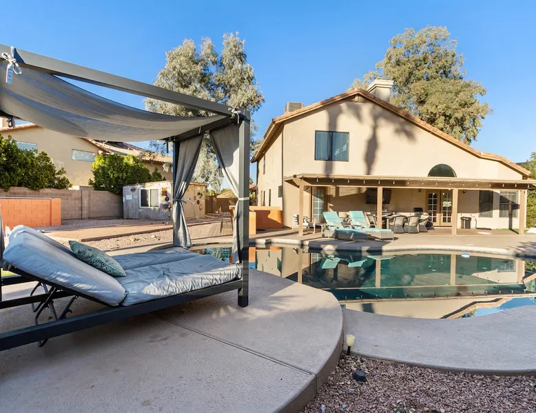 Luxury Paradise Palms Home | Pool, Hot Tub, Putting Green & More! The space This stunning and vibrant Paradise Palms property in Scottsdale is the ideal choice for your next visit! Located in a peaceful neighborhood at the heart of North Scottsdale, you'll be conveniently close to popular attractions and activities such as Kierland Commons and Scottsdale Quarter. This two-story home offers a spacious 2,639 square feet of living space, with five bedrooms and two and a half bathrooms to easily accommodate up to 16 guests — a terrific property for those with larger groups. After stepping through the front door, you will find yourself in the spacious front living room and dining room. After a few more steps you will then be in the main great room, which offers the pool table room and kitchen area. Living Room: This room offers contemporary furnishings including a spacious sectional and colorful accent chairs and a Smart TV. Dining Room: Next to the living room, the dining area offers seating for eight guests. Kitchen: Around the corner you will find the kitchen. The kitchen is fully equipped with stainless steel appliances and stocked with everything needed to prepare delicious meals for your group! The spacious bar top offers bar stools for six, making it a perfect place to gather! Game Room: Enjoy some entertainment on the Smart TV while playing a game on the pool table- making this spot an ideal hang out! Bedrooms/Bathrooms: Master Suite (main level)— King bed, Smart TV, desk area and private access to the backyard. The en suite bathroom offers two sinks and a spacious shower Bedroom 2/Bunk Room (upper level) — Two Twin over Full bunk beds and One Twin over Twin bunk bed. Bedroom 3 (upper level) – King size bed and access to shared bathroom Bedroom 4 (upper level) – King size bed and access to shared bathroom Bedroom 5 (upper level) – King size bed, Smart TV and access to shared bathroom Bathroom 2 (upper level) – Full shared bathroom with dual sink and tub/shoer combo Half bathroom on main level Outdoor spaces: The backyard space is spacious and offers endless fun! Plenty of outdoor seating under the covered patio where you can enjoy an outside meal or enjoy some entertainment on the Smart TV. Take a dip in the pool (not heated) or relax in the above ground hot tub. Enjoy a book on the hammock or sit next to the firepot with friends. Plenty of outdoor games are available including a putting green, bocce ball court and corn hole. There’s also a propane BBQ grill for grilling up your favorites. Internet Access: High-speed Wi-Fi Internet Entertainment: Smart TVs with cable provided by owner Laundry: Full size washer and dryer in the laundry room Pool: Yes, not heated. 8 feet diving pool. Hot Tub: Yes, private above ground Parking: Two car garage, with additional driveway parking for up to two vehicles. Air conditioning: Yes, central Pets: Yes, Two dogs allowed with a $100 non-refundable fee per dog Security cameras: No Cameras Neighborhood quiet hours are from 10 p.m. to 7 a.m. and are enforced by Scottsdale city ordinances. Thank you for respecting the neighbors. Pursuant to ARS § 32-2121 Property Manager does not solicit, arrange or accept reservations or monies, for occupancies of greater than thirty-one days. Distances: Old Town Scottsdale – 12 miles OdySea Aquarium — 11 miles Scottsdale Waterfront & Fashion Square Mall – 11.8 miles McCormick-Stillman Railroad Park – 9.3miles Kireland Commons- 3.1 miles Scottsdale Airport — 3.8 miles CDC cleanings are performed using checklists following all CDC cleaning guidelines. Arizona TPT License # 21343217 City of Phoenix Permit #STR-2025-002298 Guest access Guest has full access to the property and its amenities including 2 car garage and driveway parking, laundry room with washer/dryer, a private yard with an in-ground pool, hot tub, putting green, BBQ grill, outdoor patio seating area and central air conditioning.