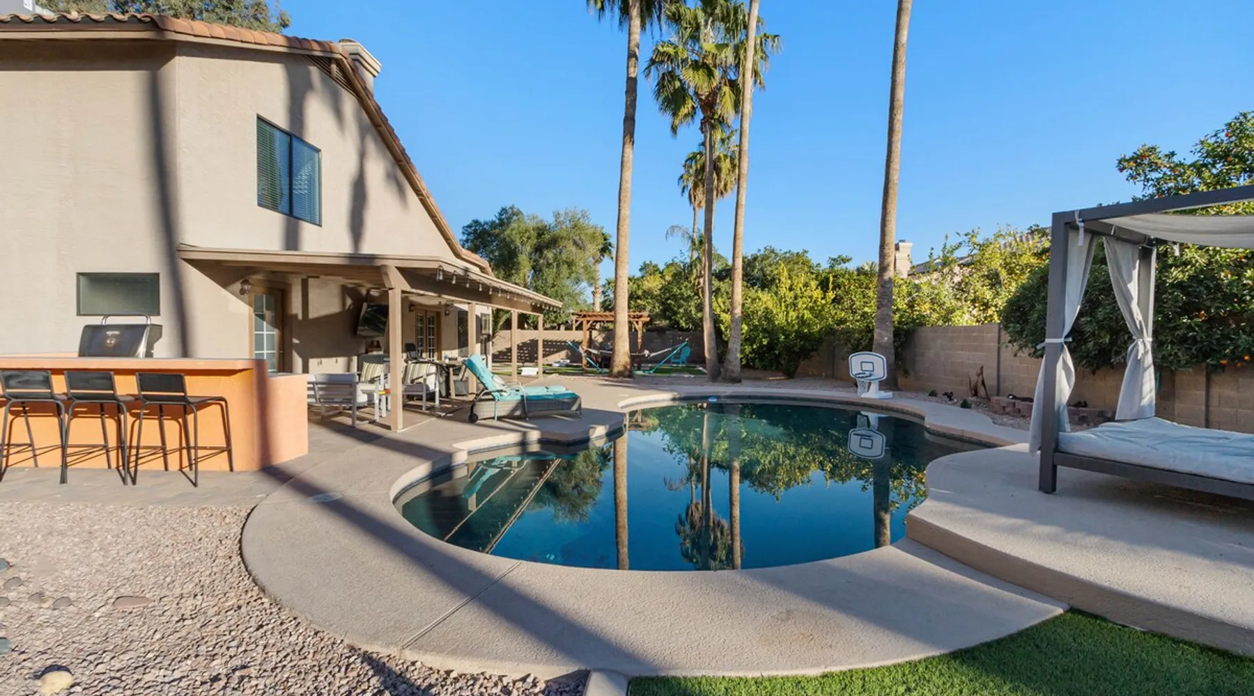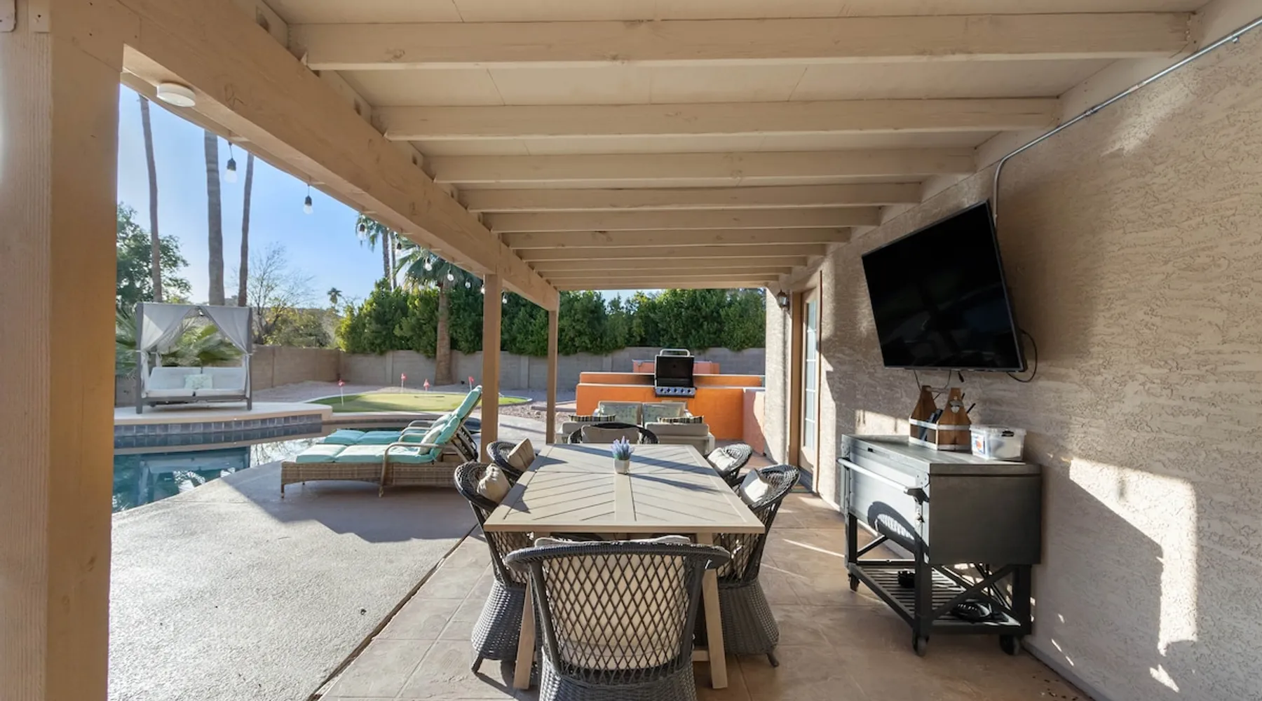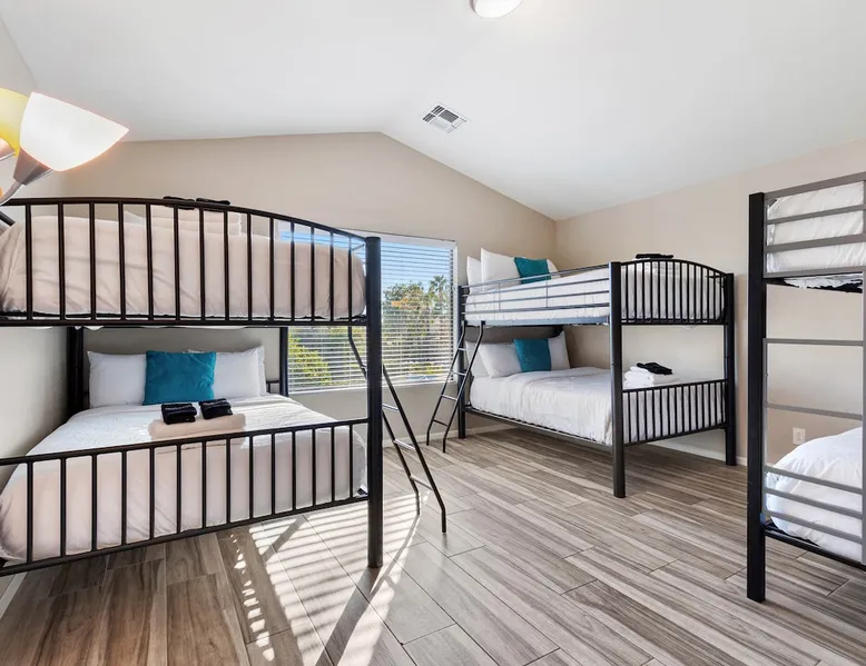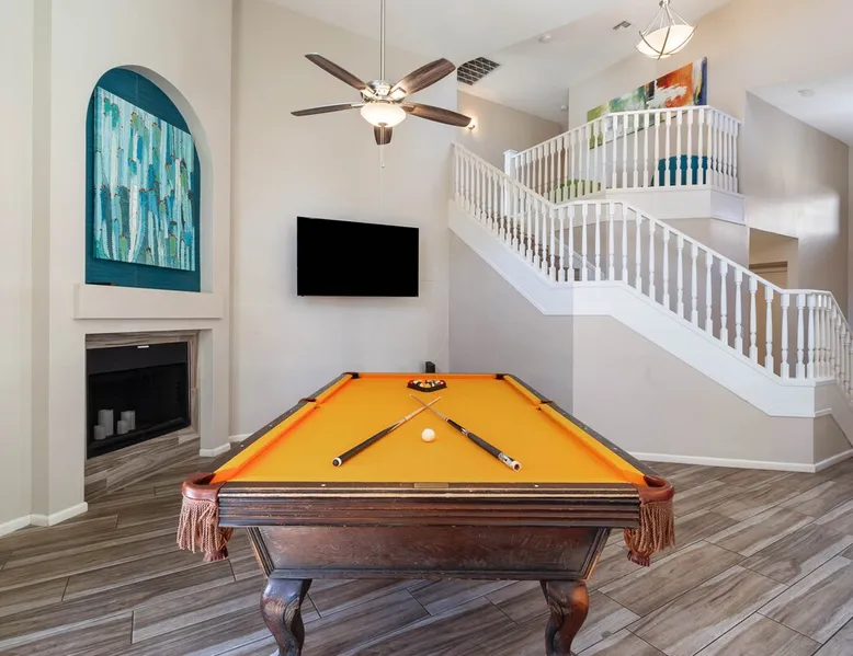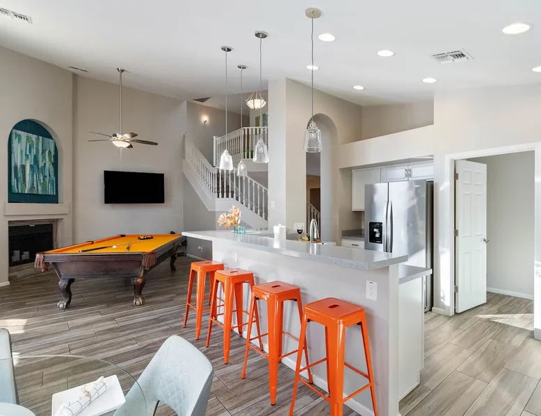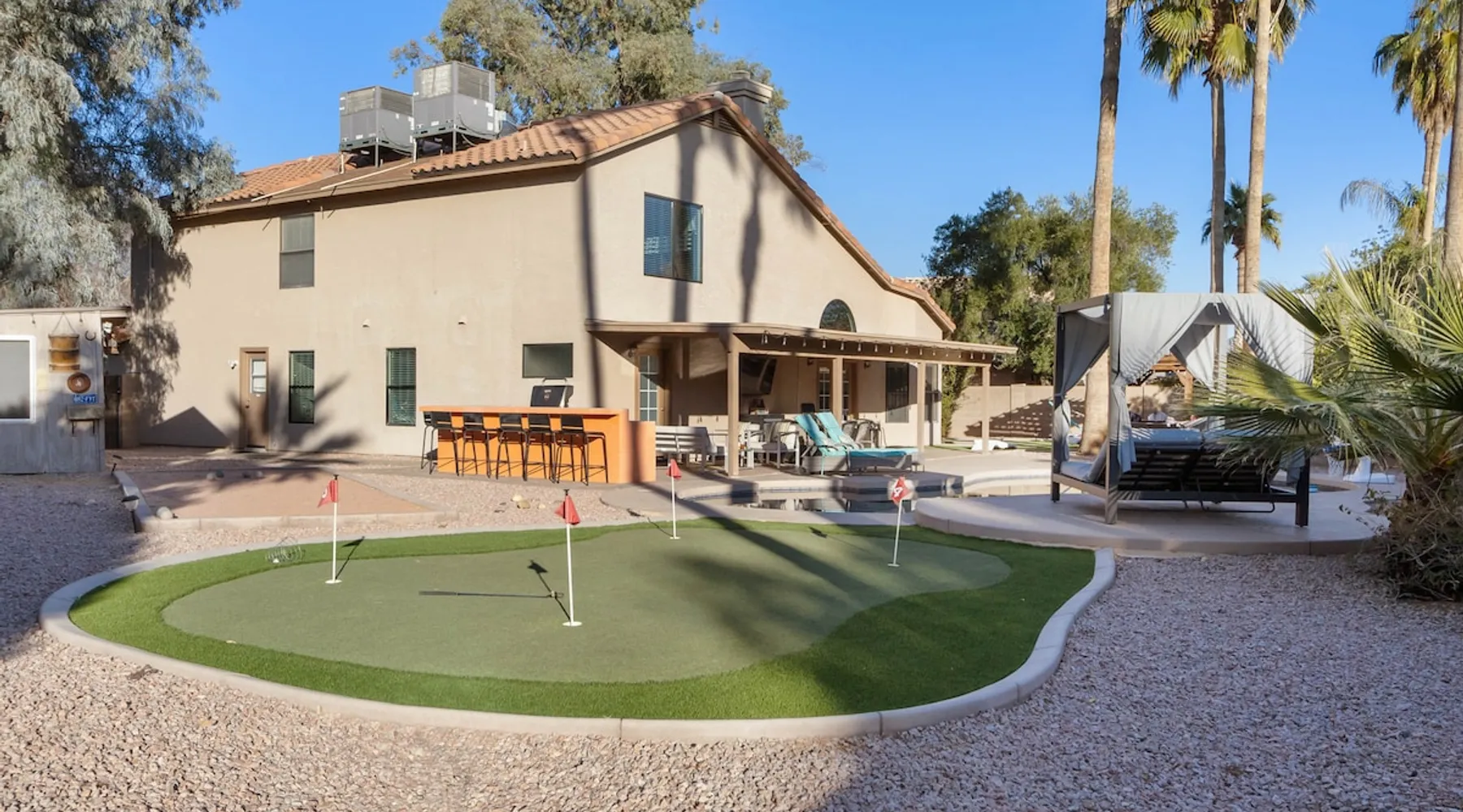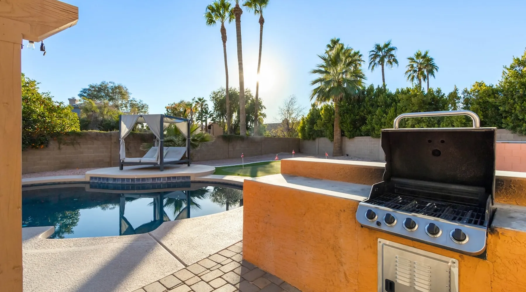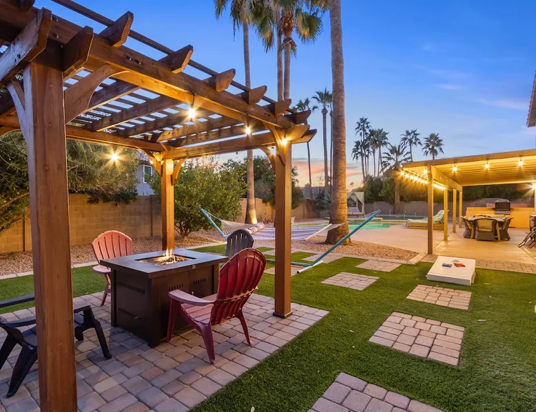 Luxury Paradise Palms Home | Pool, Hot Tub, Putting Green & More! The space This stunning and vibrant Paradise Palms property in Scottsdale is the ideal choice for your next visit! Located in a peaceful neighborhood at the heart of North Scottsdale, you'll be conveniently close to popular attractions and activities such as Kierland Commons and Scottsdale Quarter. This two-story home offers a spacious 2,639 square feet of living space, with five bedrooms and two and a half bathrooms to easily accommodate up to 16 guests — a terrific property for those with larger groups. After stepping through the front door, you will find yourself in the spacious front living room and dining room. After a few more steps you will then be in the main great room, which offers the pool table room and kitchen area. Living Room: This room offers contemporary furnishings including a spacious sectional and colorful accent chairs and a Smart TV. Dining Room: Next to the living room, the dining area offers seating for eight guests. Kitchen: Around the corner you will find the kitchen. The kitchen is fully equipped with stainless steel appliances and stocked with everything needed to prepare delicious meals for your group! The spacious bar top offers bar stools for six, making it a perfect place to gather! Game Room: Enjoy some entertainment on the Smart TV while playing a game on the pool table- making this spot an ideal hang out! Bedrooms/Bathrooms: Master Suite (main level)— King bed, Smart TV, desk area and private access to the backyard. The en suite bathroom offers two sinks and a spacious shower Bedroom 2/Bunk Room (upper level) — Two Twin over Full bunk beds and One Twin over Twin bunk bed. Bedroom 3 (upper level) – King size bed and access to shared bathroom Bedroom 4 (upper level) – King size bed and access to shared bathroom Bedroom 5 (upper level) – King size bed, Smart TV and access to shared bathroom Bathroom 2 (upper level) – Full shared bathroom with dual sink and tub/shoer combo Half bathroom on main level Outdoor spaces: The backyard space is spacious and offers endless fun! Plenty of outdoor seating under the covered patio where you can enjoy an outside meal or enjoy some entertainment on the Smart TV. Take a dip in the pool (not heated) or relax in the above ground hot tub. Enjoy a book on the hammock or sit next to the firepot with friends. Plenty of outdoor games are available including a putting green, bocce ball court and corn hole. There’s also a propane BBQ grill for grilling up your favorites. Internet Access: High-speed Wi-Fi Internet Entertainment: Smart TVs with cable provided by owner Laundry: Full size washer and dryer in the laundry room Pool: Yes, not heated. 8 feet diving pool. Hot Tub: Yes, private above ground Parking: Two car garage, with additional driveway parking for up to two vehicles. Air conditioning: Yes, central Pets: Yes, Two dogs allowed with a $100 non-refundable fee per dog Security cameras: No Cameras Neighborhood quiet hours are from 10 p.m. to 7 a.m. and are enforced by Scottsdale city ordinances. Thank you for respecting the neighbors. Pursuant to ARS § 32-2121 Property Manager does not solicit, arrange or accept reservations or monies, for occupancies of greater than thirty-one days. Distances: Old Town Scottsdale – 12 miles OdySea Aquarium — 11 miles Scottsdale Waterfront & Fashion Square Mall – 11.8 miles McCormick-Stillman Railroad Park – 9.3miles Kireland Commons- 3.1 miles Scottsdale Airport — 3.8 miles CDC cleanings are performed using checklists following all CDC cleaning guidelines. Arizona TPT License # 21343217 City of Phoenix Permit #STR-2025-002298 Guest access Guest has full access to the property and its amenities including 2 car garage and driveway parking, laundry room with washer/dryer, a private yard with an in-ground pool, hot tub, putting green, BBQ grill, outdoor patio seating area and central air conditioning.