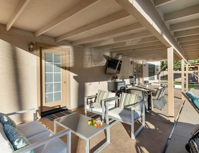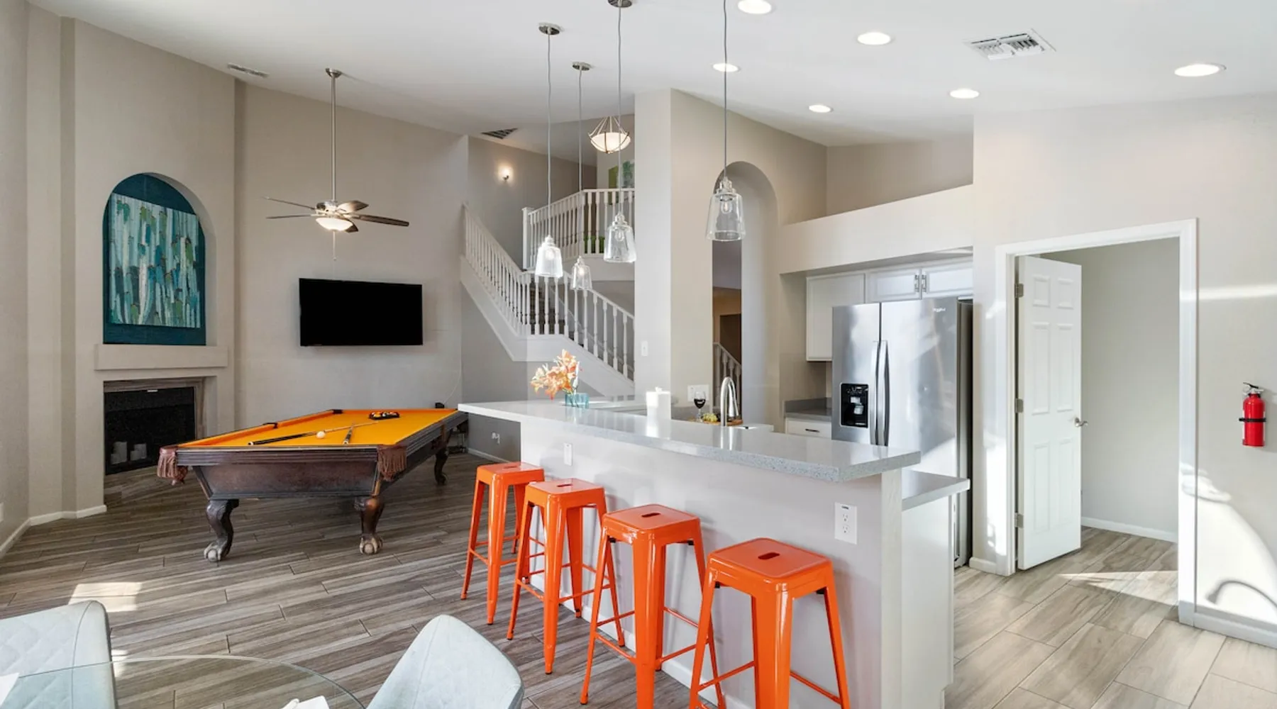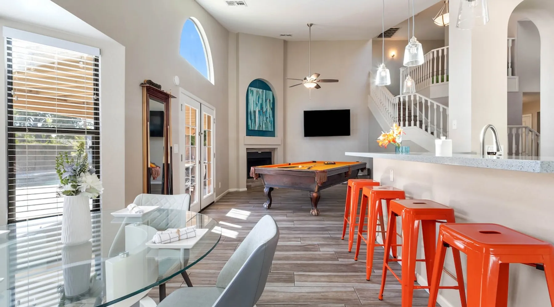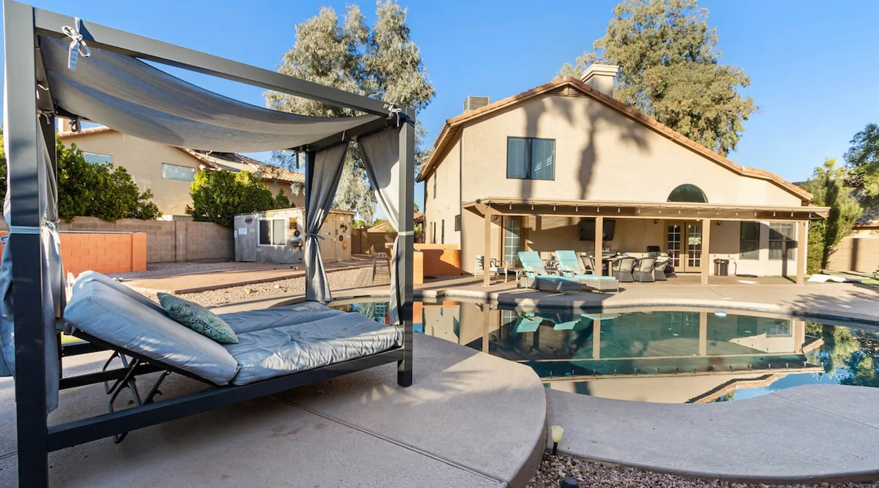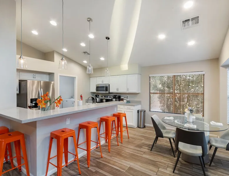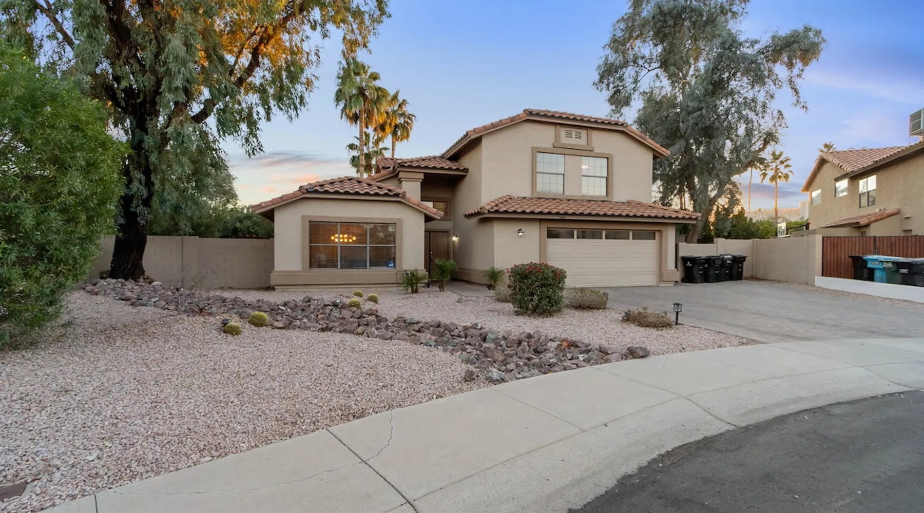 Luxury Paradise Palms Home | Pool, Hot Tub, Putting Green & More! The space This stunning and vibrant Paradise Palms property in Scottsdale is the ideal choice for your next visit! Located in a peaceful neighborhood at the heart of North Scottsdale, you'll be conveniently close to popular attractions and activities such as Kierland Commons and Scottsdale Quarter. This two-story home offers a spacious 2,639 square feet of living space, with five bedrooms and two and a half bathrooms to easily accommodate up to 16 guests — a terrific property for those with larger groups. After stepping through the front door, you will find yourself in the spacious front living room and dining room. After a few more steps you will then be in the main great room, which offers the pool table room and kitchen area. Living Room: This room offers contemporary furnishings including a spacious sectional and colorful accent chairs and a Smart TV. Dining Room: Next to the living room, the dining area offers seating for eight guests. Kitchen: Around the corner you will find the kitchen. The kitchen is fully equipped with stainless steel appliances and stocked with everything needed to prepare delicious meals for your group! The spacious bar top offers bar stools for six, making it a perfect place to gather! Game Room: Enjoy some entertainment on the Smart TV while playing a game on the pool table- making this spot an ideal hang out! Bedrooms/Bathrooms: Master Suite (main level)— King bed, Smart TV, desk area and private access to the backyard. The en suite bathroom offers two sinks and a spacious shower Bedroom 2/Bunk Room (upper level) — Two Twin over Full bunk beds and One Twin over Twin bunk bed. Bedroom 3 (upper level) – King size bed and access to shared bathroom Bedroom 4 (upper level) – King size bed and access to shared bathroom Bedroom 5 (upper level) – King size bed, Smart TV and access to shared bathroom Bathroom 2 (upper level) – Full shared bathroom with dual sink and tub/shoer combo Half bathroom on main level Outdoor spaces: The backyard space is spacious and offers endless fun! Plenty of outdoor seating under the covered patio where you can enjoy an outside meal or enjoy some entertainment on the Smart TV. Take a dip in the pool (not heated) or relax in the above ground hot tub. Enjoy a book on the hammock or sit next to the firepot with friends. Plenty of outdoor games are available including a putting green, bocce ball court and corn hole. There’s also a propane BBQ grill for grilling up your favorites. Internet Access: High-speed Wi-Fi Internet Entertainment: Smart TVs with cable provided by owner Laundry: Full size washer and dryer in the laundry room Pool: Yes, not heated. 8 feet diving pool. Hot Tub: Yes, private above ground Parking: Two car garage, with additional driveway parking for up to two vehicles. Air conditioning: Yes, central Pets: Yes, Two dogs allowed with a $100 non-refundable fee per dog Security cameras: No Cameras Neighborhood quiet hours are from 10 p.m. to 7 a.m. and are enforced by Scottsdale city ordinances. Thank you for respecting the neighbors. Pursuant to ARS § 32-2121 Property Manager does not solicit, arrange or accept reservations or monies, for occupancies of greater than thirty-one days. Distances: Old Town Scottsdale – 12 miles OdySea Aquarium — 11 miles Scottsdale Waterfront & Fashion Square Mall – 11.8 miles McCormick-Stillman Railroad Park – 9.3miles Kireland Commons- 3.1 miles Scottsdale Airport — 3.8 miles CDC cleanings are performed using checklists following all CDC cleaning guidelines. Arizona TPT License # 21343217 City of Phoenix Permit #STR-2025-002298 Guest access Guest has full access to the property and its amenities including 2 car garage and driveway parking, laundry room with washer/dryer, a private yard with an in-ground pool, hot tub, putting green, BBQ grill, outdoor patio seating area and central air conditioning.