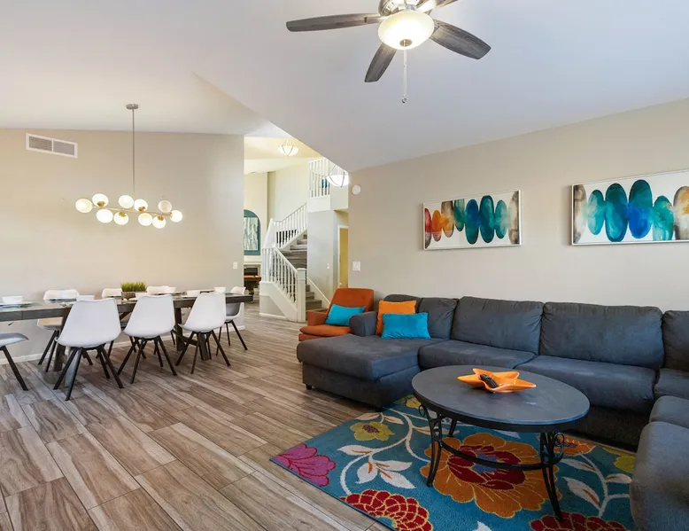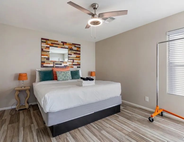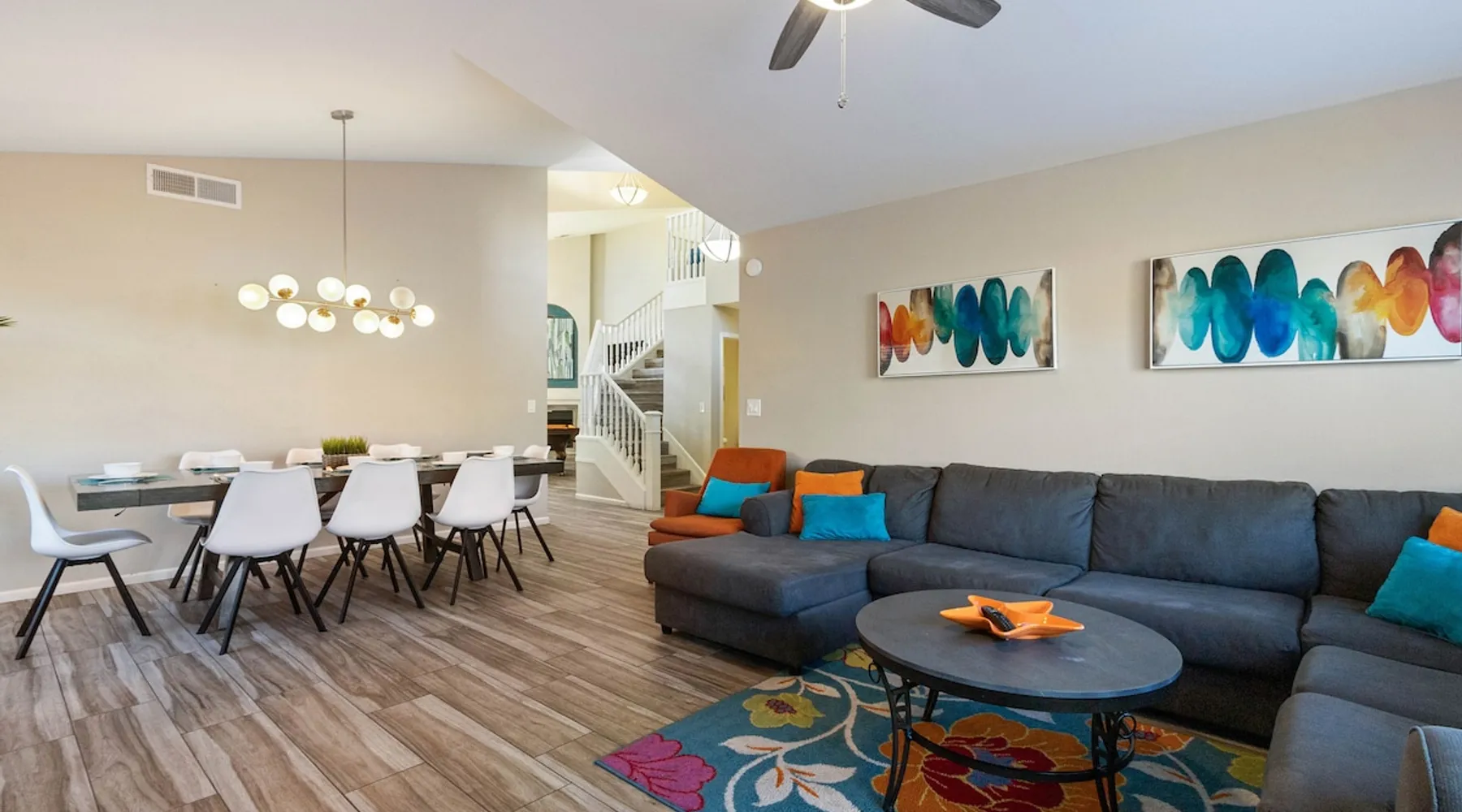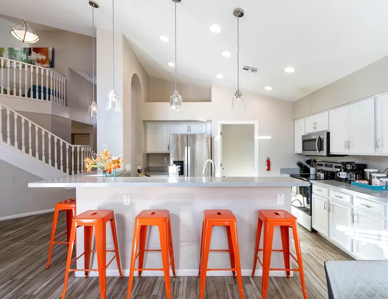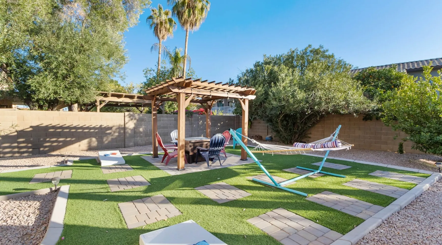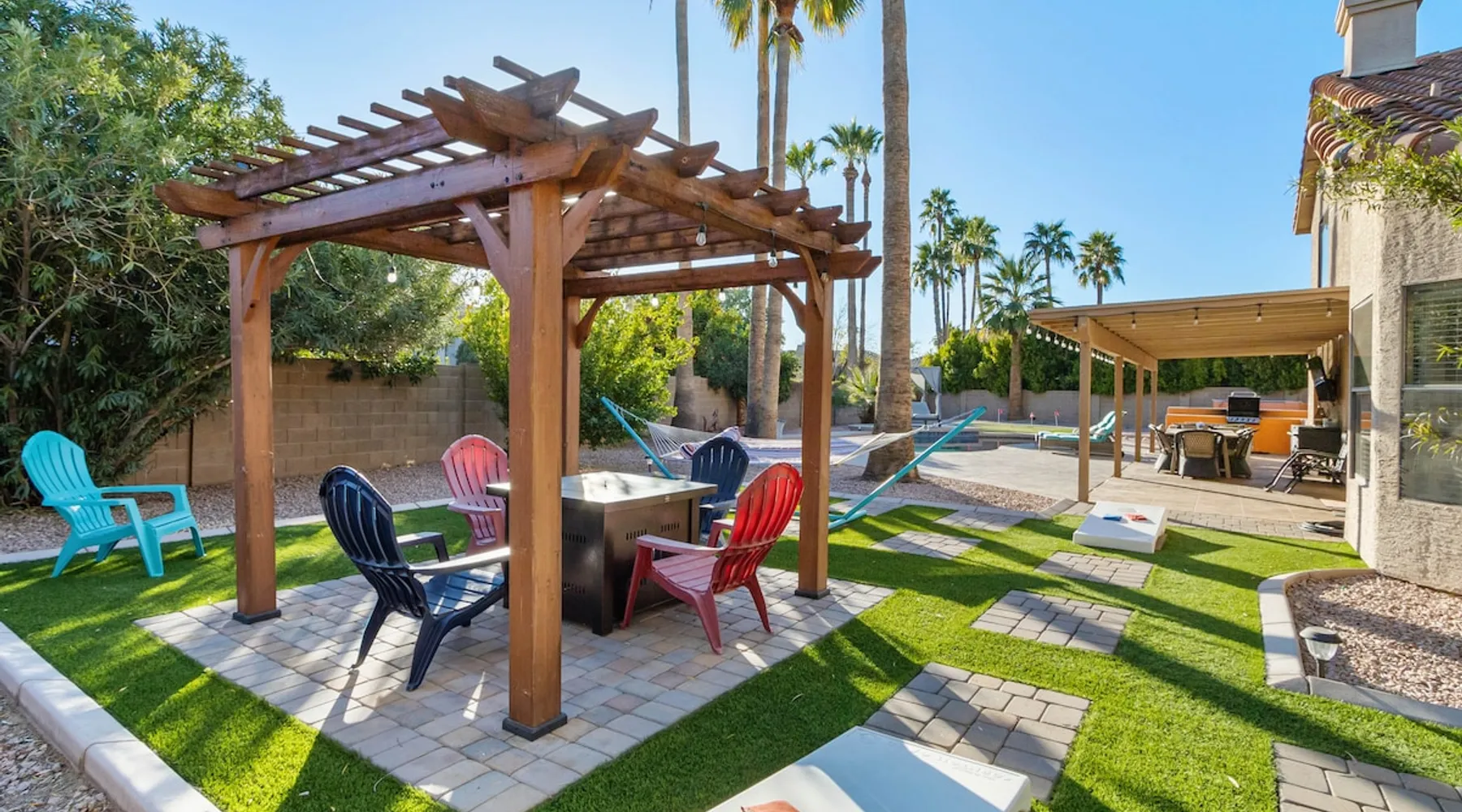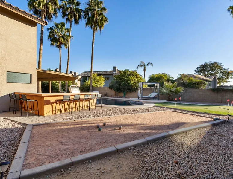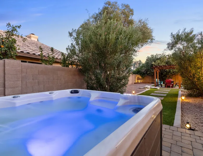 Luxury Paradise Palms Home | Pool, Hot Tub, Putting Green & More! The space This stunning and vibrant Paradise Palms property in Scottsdale is the ideal choice for your next visit! Located in a peaceful neighborhood at the heart of North Scottsdale, you'll be conveniently close to popular attractions and activities such as Kierland Commons and Scottsdale Quarter. This two-story home offers a spacious 2,639 square feet of living space, with five bedrooms and two and a half bathrooms to easily accommodate up to 16 guests — a terrific property for those with larger groups. After stepping through the front door, you will find yourself in the spacious front living room and dining room. After a few more steps you will then be in the main great room, which offers the pool table room and kitchen area. Living Room: This room offers contemporary furnishings including a spacious sectional and colorful accent chairs and a Smart TV. Dining Room: Next to the living room, the dining area offers seating for eight guests. Kitchen: Around the corner you will find the kitchen. The kitchen is fully equipped with stainless steel appliances and stocked with everything needed to prepare delicious meals for your group! The spacious bar top offers bar stools for six, making it a perfect place to gather! Game Room: Enjoy some entertainment on the Smart TV while playing a game on the pool table- making this spot an ideal hang out! Bedrooms/Bathrooms: Master Suite (main level)— King bed, Smart TV, desk area and private access to the backyard. The en suite bathroom offers two sinks and a spacious shower Bedroom 2/Bunk Room (upper level) — Two Twin over Full bunk beds and One Twin over Twin bunk bed. Bedroom 3 (upper level) – King size bed and access to shared bathroom Bedroom 4 (upper level) – King size bed and access to shared bathroom Bedroom 5 (upper level) – King size bed, Smart TV and access to shared bathroom Bathroom 2 (upper level) – Full shared bathroom with dual sink and tub/shoer combo Half bathroom on main level Outdoor spaces: The backyard space is spacious and offers endless fun! Plenty of outdoor seating under the covered patio where you can enjoy an outside meal or enjoy some entertainment on the Smart TV. Take a dip in the pool (not heated) or relax in the above ground hot tub. Enjoy a book on the hammock or sit next to the firepot with friends. Plenty of outdoor games are available including a putting green, bocce ball court and corn hole. There’s also a propane BBQ grill for grilling up your favorites. Internet Access: High-speed Wi-Fi Internet Entertainment: Smart TVs with cable provided by owner Laundry: Full size washer and dryer in the laundry room Pool: Yes, not heated. 8 feet diving pool. Hot Tub: Yes, private above ground Parking: Two car garage, with additional driveway parking for up to two vehicles. Air conditioning: Yes, central Pets: Yes, Two dogs allowed with a $100 non-refundable fee per dog Security cameras: No Cameras Neighborhood quiet hours are from 10 p.m. to 7 a.m. and are enforced by Scottsdale city ordinances. Thank you for respecting the neighbors. Pursuant to ARS § 32-2121 Property Manager does not solicit, arrange or accept reservations or monies, for occupancies of greater than thirty-one days. Distances: Old Town Scottsdale – 12 miles OdySea Aquarium — 11 miles Scottsdale Waterfront & Fashion Square Mall – 11.8 miles McCormick-Stillman Railroad Park – 9.3miles Kireland Commons- 3.1 miles Scottsdale Airport — 3.8 miles CDC cleanings are performed using checklists following all CDC cleaning guidelines. Arizona TPT License # 21343217 City of Phoenix Permit #STR-2025-002298 Guest access Guest has full access to the property and its amenities including 2 car garage and driveway parking, laundry room with washer/dryer, a private yard with an in-ground pool, hot tub, putting green, BBQ grill, outdoor patio seating area and central air conditioning.