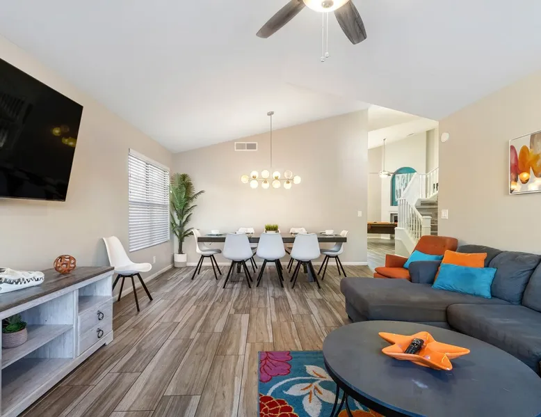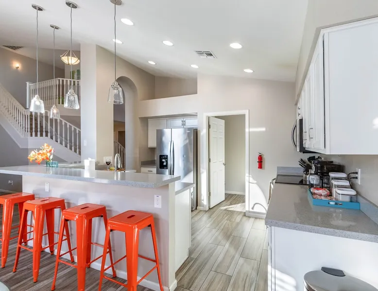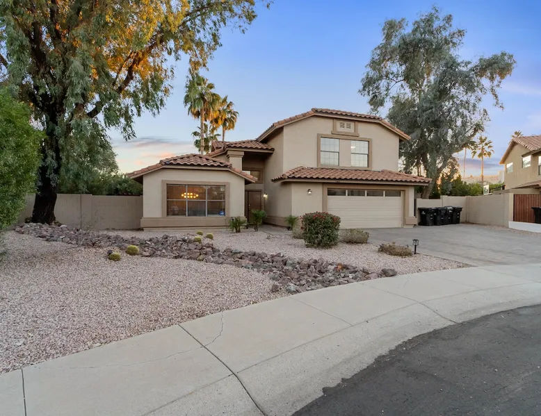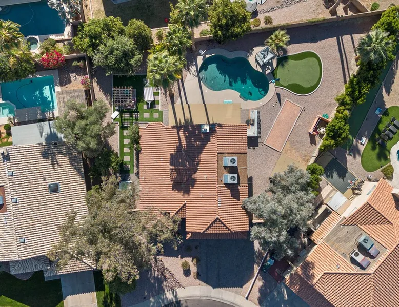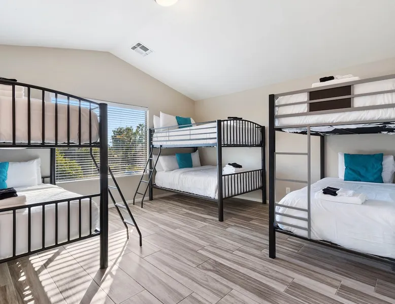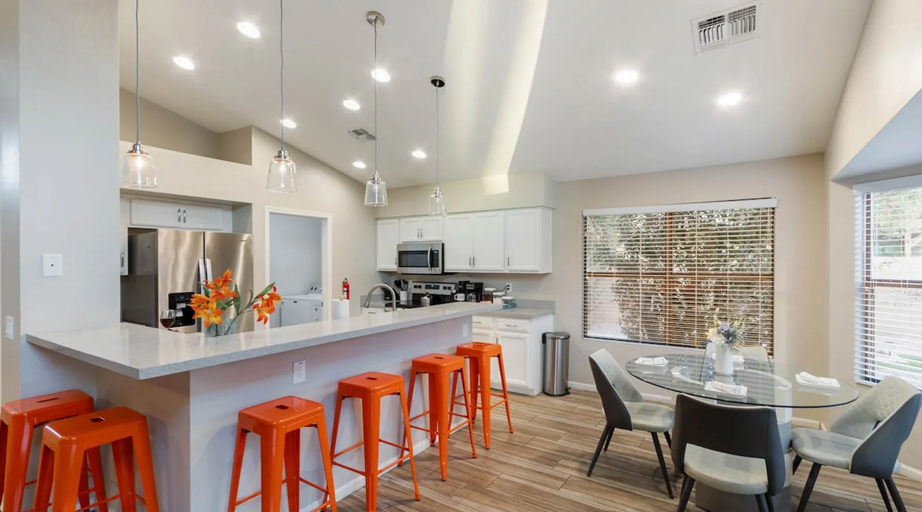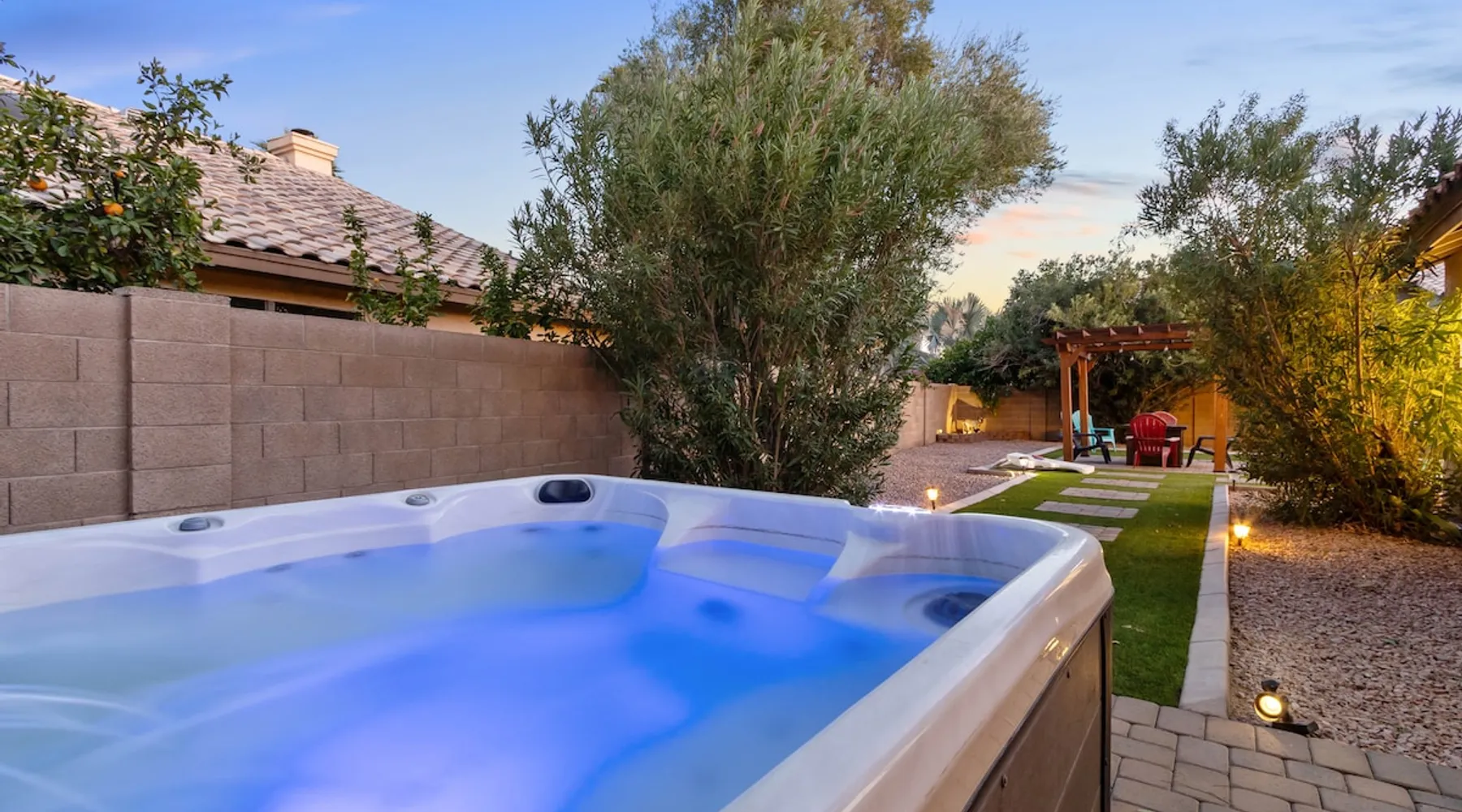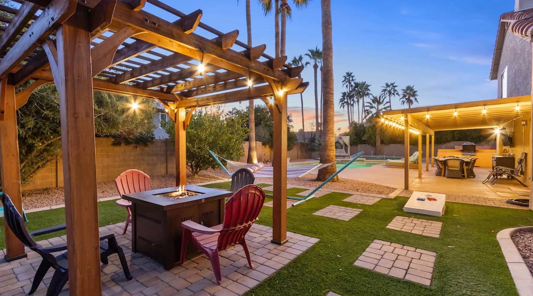 Luxury Paradise Palms Home | Pool, Hot Tub, Putting Green & More! The space This stunning and vibrant Paradise Palms property in Scottsdale is the ideal choice for your next visit! Located in a peaceful neighborhood at the heart of North Scottsdale, you'll be conveniently close to popular attractions and activities such as Kierland Commons and Scottsdale Quarter. This two-story home offers a spacious 2,639 square feet of living space, with five bedrooms and two and a half bathrooms to easily accommodate up to 16 guests — a terrific property for those with larger groups. After stepping through the front door, you will find yourself in the spacious front living room and dining room. After a few more steps you will then be in the main great room, which offers the pool table room and kitchen area. Living Room: This room offers contemporary furnishings including a spacious sectional and colorful accent chairs and a Smart TV. Dining Room: Next to the living room, the dining area offers seating for eight guests. Kitchen: Around the corner you will find the kitchen. The kitchen is fully equipped with stainless steel appliances and stocked with everything needed to prepare delicious meals for your group! The spacious bar top offers bar stools for six, making it a perfect place to gather! Game Room: Enjoy some entertainment on the Smart TV while playing a game on the pool table- making this spot an ideal hang out! Bedrooms/Bathrooms: Master Suite (main level)— King bed, Smart TV, desk area and private access to the backyard. The en suite bathroom offers two sinks and a spacious shower Bedroom 2/Bunk Room (upper level) — Two Twin over Full bunk beds and One Twin over Twin bunk bed. Bedroom 3 (upper level) – King size bed and access to shared bathroom Bedroom 4 (upper level) – King size bed and access to shared bathroom Bedroom 5 (upper level) – King size bed, Smart TV and access to shared bathroom Bathroom 2 (upper level) – Full shared bathroom with dual sink and tub/shoer combo Half bathroom on main level Outdoor spaces: The backyard space is spacious and offers endless fun! Plenty of outdoor seating under the covered patio where you can enjoy an outside meal or enjoy some entertainment on the Smart TV. Take a dip in the pool (not heated) or relax in the above ground hot tub. Enjoy a book on the hammock or sit next to the firepot with friends. Plenty of outdoor games are available including a putting green, bocce ball court and corn hole. There’s also a propane BBQ grill for grilling up your favorites. Internet Access: High-speed Wi-Fi Internet Entertainment: Smart TVs with cable provided by owner Laundry: Full size washer and dryer in the laundry room Pool: Yes, not heated. 8 feet diving pool. Hot Tub: Yes, private above ground Parking: Two car garage, with additional driveway parking for up to two vehicles. Air conditioning: Yes, central Pets: Yes, Two dogs allowed with a $100 non-refundable fee per dog Security cameras: No Cameras Neighborhood quiet hours are from 10 p.m. to 7 a.m. and are enforced by Scottsdale city ordinances. Thank you for respecting the neighbors. Pursuant to ARS § 32-2121 Property Manager does not solicit, arrange or accept reservations or monies, for occupancies of greater than thirty-one days. Distances: Old Town Scottsdale – 12 miles OdySea Aquarium — 11 miles Scottsdale Waterfront & Fashion Square Mall – 11.8 miles McCormick-Stillman Railroad Park – 9.3miles Kireland Commons- 3.1 miles Scottsdale Airport — 3.8 miles CDC cleanings are performed using checklists following all CDC cleaning guidelines. Arizona TPT License # 21343217 City of Phoenix Permit #STR-2025-002298 Guest access Guest has full access to the property and its amenities including 2 car garage and driveway parking, laundry room with washer/dryer, a private yard with an in-ground pool, hot tub, putting green, BBQ grill, outdoor patio seating area and central air conditioning.
