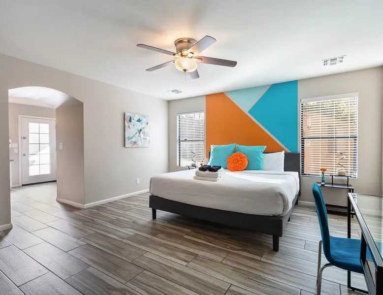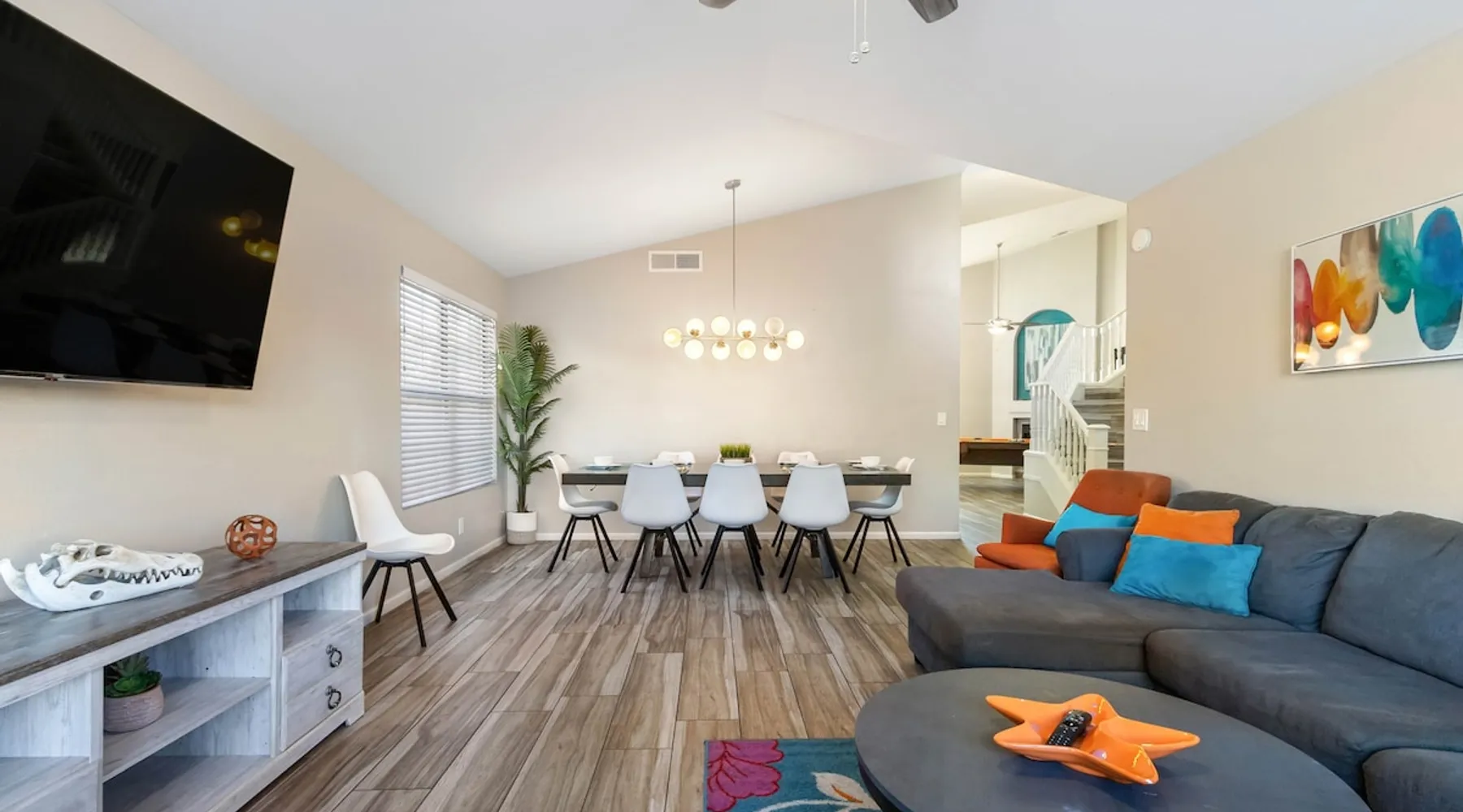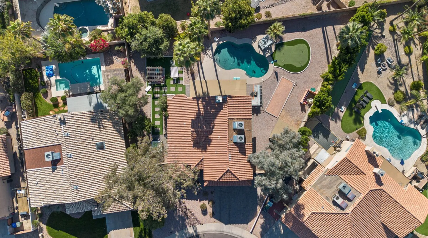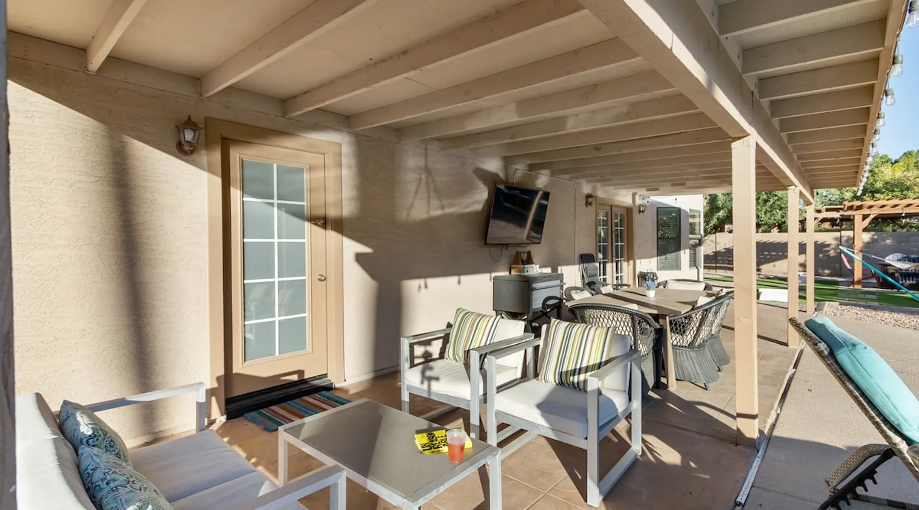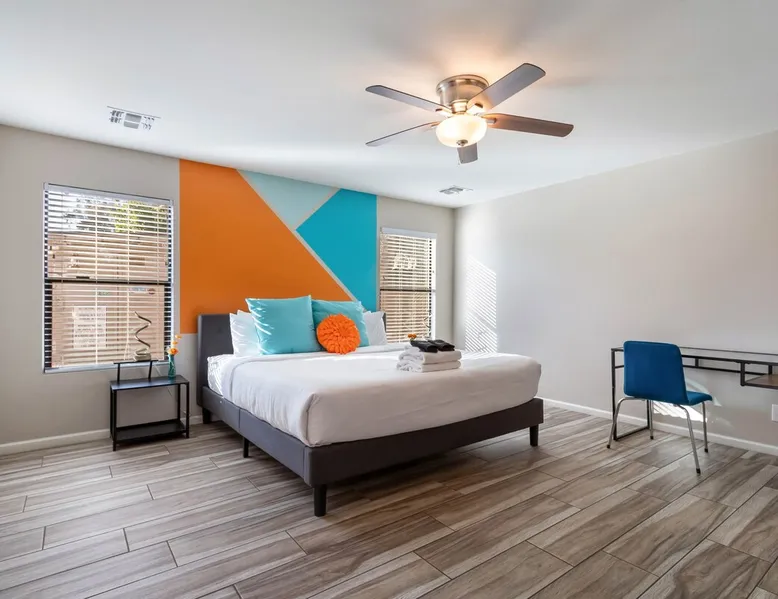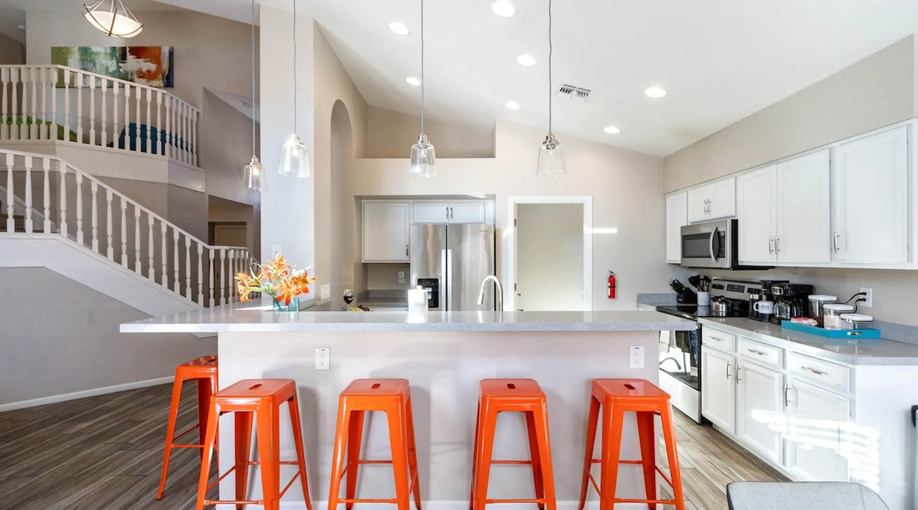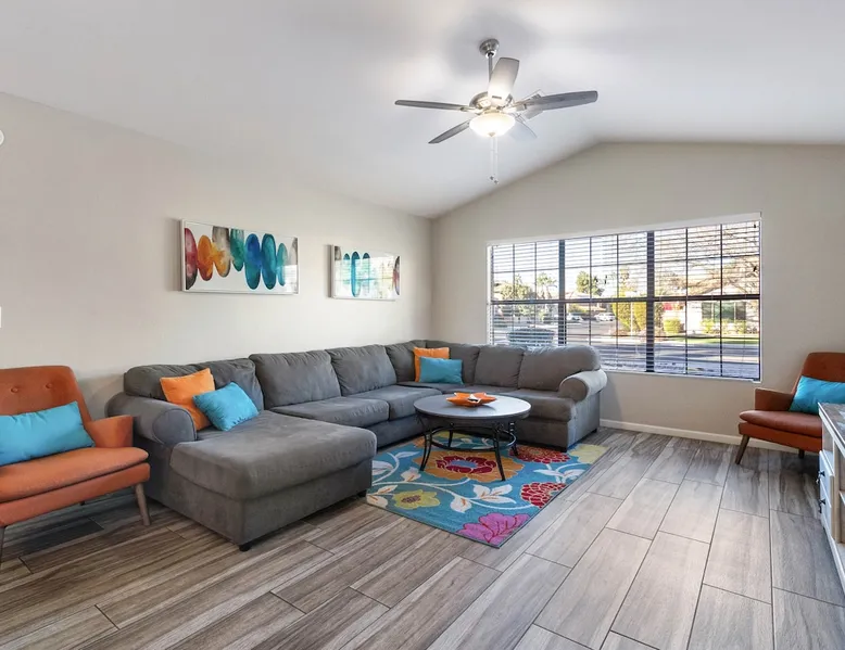 Luxury Paradise Palms Home | Pool, Hot Tub, Putting Green & More! The space This stunning and vibrant Paradise Palms property in Scottsdale is the ideal choice for your next visit! Located in a peaceful neighborhood at the heart of North Scottsdale, you'll be conveniently close to popular attractions and activities such as Kierland Commons and Scottsdale Quarter. This two-story home offers a spacious 2,639 square feet of living space, with five bedrooms and two and a half bathrooms to easily accommodate up to 16 guests — a terrific property for those with larger groups. After stepping through the front door, you will find yourself in the spacious front living room and dining room. After a few more steps you will then be in the main great room, which offers the pool table room and kitchen area. Living Room: This room offers contemporary furnishings including a spacious sectional and colorful accent chairs and a Smart TV. Dining Room: Next to the living room, the dining area offers seating for eight guests. Kitchen: Around the corner you will find the kitchen. The kitchen is fully equipped with stainless steel appliances and stocked with everything needed to prepare delicious meals for your group! The spacious bar top offers bar stools for six, making it a perfect place to gather! Game Room: Enjoy some entertainment on the Smart TV while playing a game on the pool table- making this spot an ideal hang out! Bedrooms/Bathrooms: Master Suite (main level)— King bed, Smart TV, desk area and private access to the backyard. The en suite bathroom offers two sinks and a spacious shower Bedroom 2/Bunk Room (upper level) — Two Twin over Full bunk beds and One Twin over Twin bunk bed. Bedroom 3 (upper level) – King size bed and access to shared bathroom Bedroom 4 (upper level) – King size bed and access to shared bathroom Bedroom 5 (upper level) – King size bed, Smart TV and access to shared bathroom Bathroom 2 (upper level) – Full shared bathroom with dual sink and tub/shoer combo Half bathroom on main level Outdoor spaces: The backyard space is spacious and offers endless fun! Plenty of outdoor seating under the covered patio where you can enjoy an outside meal or enjoy some entertainment on the Smart TV. Take a dip in the pool (not heated) or relax in the above ground hot tub. Enjoy a book on the hammock or sit next to the firepot with friends. Plenty of outdoor games are available including a putting green, bocce ball court and corn hole. There’s also a propane BBQ grill for grilling up your favorites. Internet Access: High-speed Wi-Fi Internet Entertainment: Smart TVs with cable provided by owner Laundry: Full size washer and dryer in the laundry room Pool: Yes, not heated. 8 feet diving pool. Hot Tub: Yes, private above ground Parking: Two car garage, with additional driveway parking for up to two vehicles. Air conditioning: Yes, central Pets: Yes, Two dogs allowed with a $100 non-refundable fee per dog Security cameras: No Cameras Neighborhood quiet hours are from 10 p.m. to 7 a.m. and are enforced by Scottsdale city ordinances. Thank you for respecting the neighbors. Pursuant to ARS § 32-2121 Property Manager does not solicit, arrange or accept reservations or monies, for occupancies of greater than thirty-one days. Distances: Old Town Scottsdale – 12 miles OdySea Aquarium — 11 miles Scottsdale Waterfront & Fashion Square Mall – 11.8 miles McCormick-Stillman Railroad Park – 9.3miles Kireland Commons- 3.1 miles Scottsdale Airport — 3.8 miles CDC cleanings are performed using checklists following all CDC cleaning guidelines. Arizona TPT License # 21343217 City of Phoenix Permit #STR-2025-002298 Guest access Guest has full access to the property and its amenities including 2 car garage and driveway parking, laundry room with washer/dryer, a private yard with an in-ground pool, hot tub, putting green, BBQ grill, outdoor patio seating area and central air conditioning.