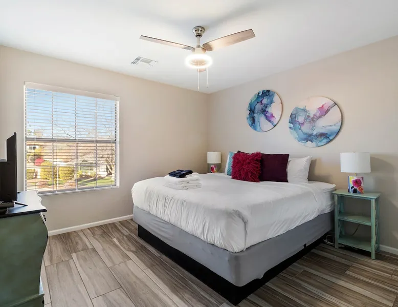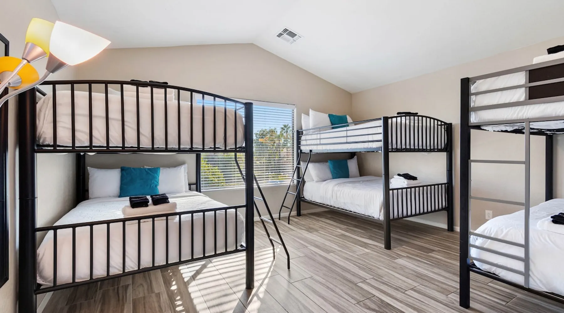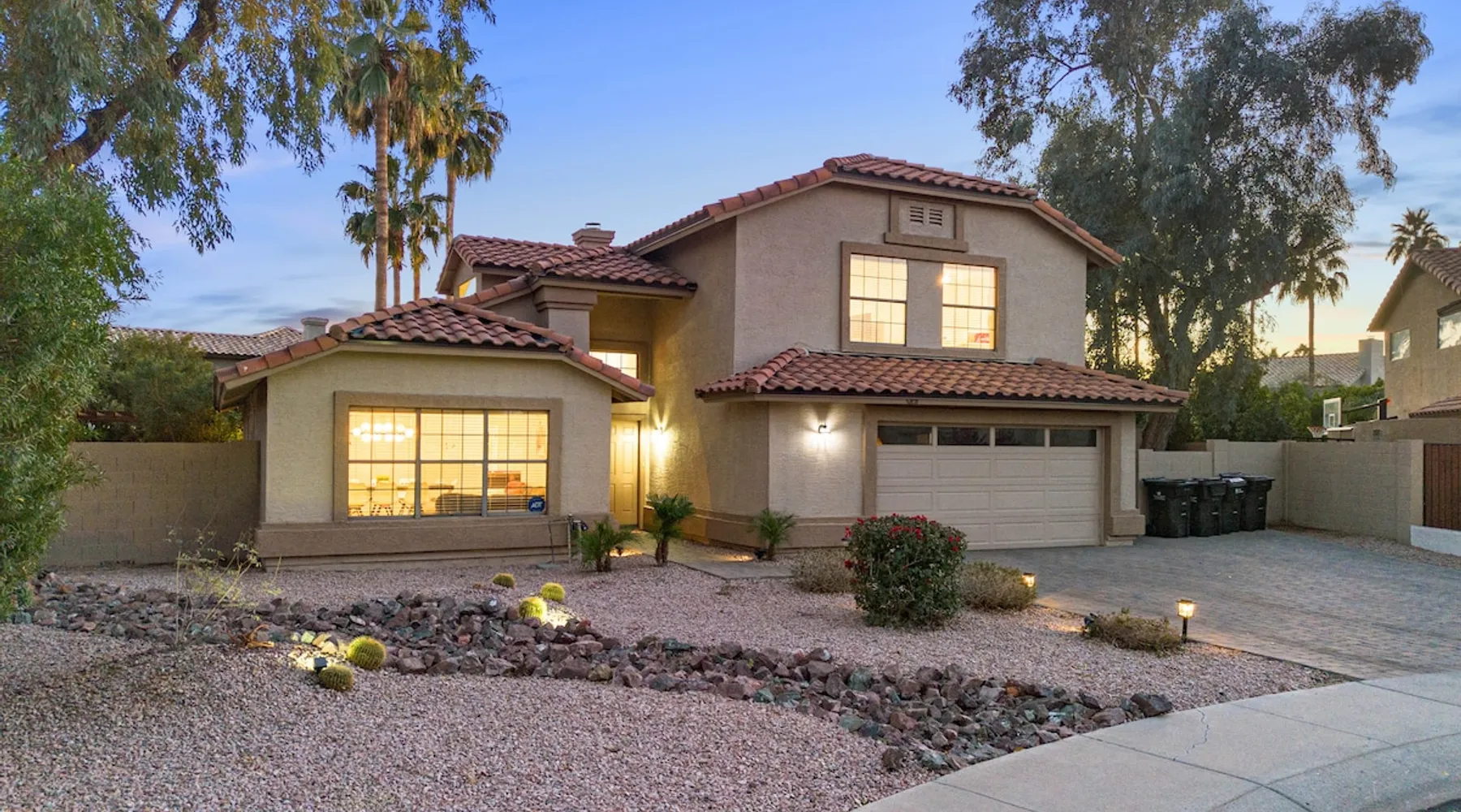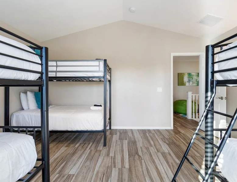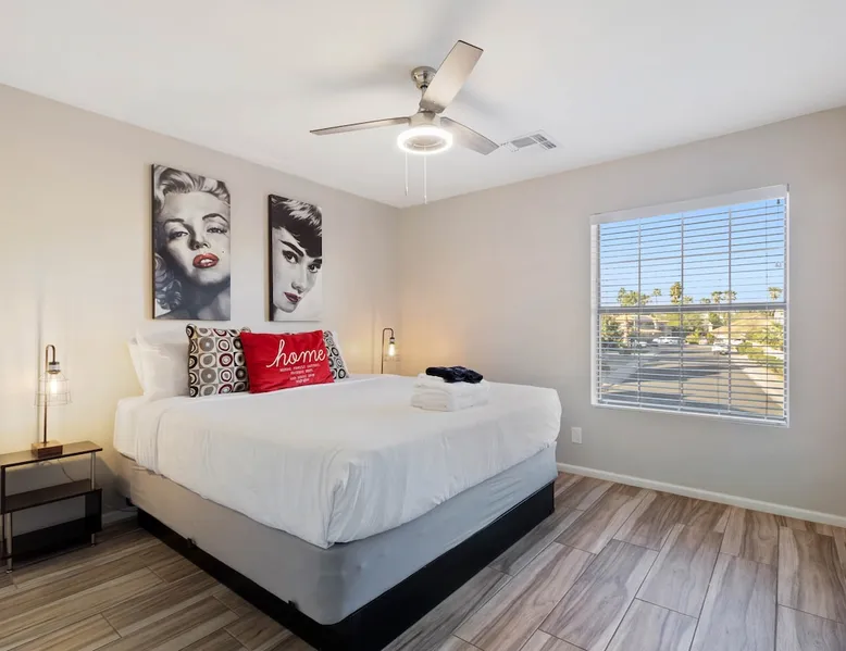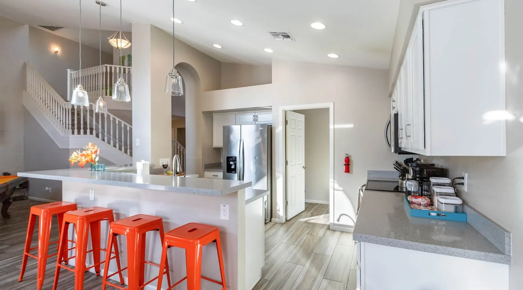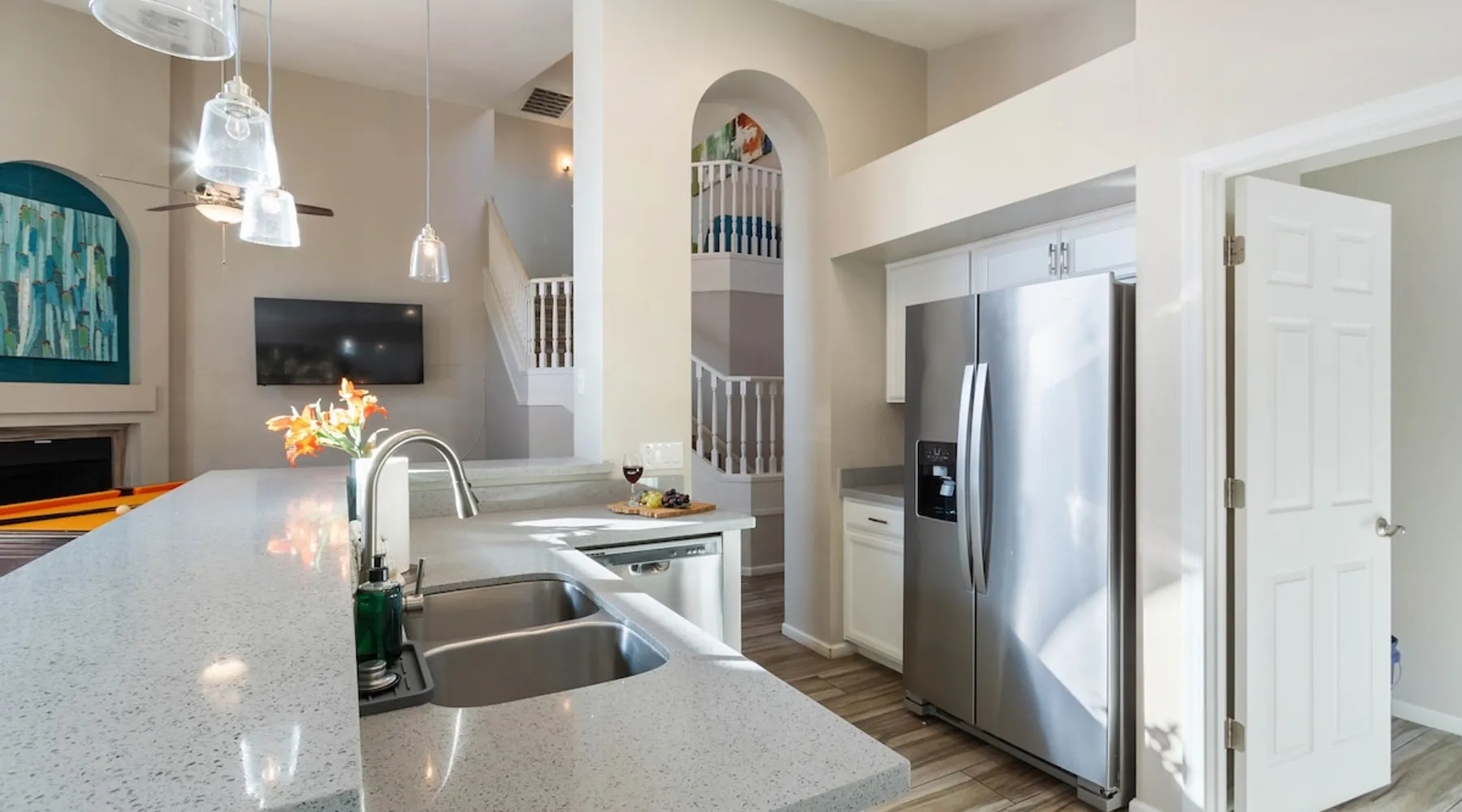 Luxury Paradise Palms Home | Pool, Hot Tub, Putting Green & More! The space This stunning and vibrant Paradise Palms property in Scottsdale is the ideal choice for your next visit! Located in a peaceful neighborhood at the heart of North Scottsdale, you'll be conveniently close to popular attractions and activities such as Kierland Commons and Scottsdale Quarter. This two-story home offers a spacious 2,639 square feet of living space, with five bedrooms and two and a half bathrooms to easily accommodate up to 16 guests — a terrific property for those with larger groups. After stepping through the front door, you will find yourself in the spacious front living room and dining room. After a few more steps you will then be in the main great room, which offers the pool table room and kitchen area. Living Room: This room offers contemporary furnishings including a spacious sectional and colorful accent chairs and a Smart TV. Dining Room: Next to the living room, the dining area offers seating for eight guests. Kitchen: Around the corner you will find the kitchen. The kitchen is fully equipped with stainless steel appliances and stocked with everything needed to prepare delicious meals for your group! The spacious bar top offers bar stools for six, making it a perfect place to gather! Game Room: Enjoy some entertainment on the Smart TV while playing a game on the pool table- making this spot an ideal hang out! Bedrooms/Bathrooms: Master Suite (main level)— King bed, Smart TV, desk area and private access to the backyard. The en suite bathroom offers two sinks and a spacious shower Bedroom 2/Bunk Room (upper level) — Two Twin over Full bunk beds and One Twin over Twin bunk bed. Bedroom 3 (upper level) – King size bed and access to shared bathroom Bedroom 4 (upper level) – King size bed and access to shared bathroom Bedroom 5 (upper level) – King size bed, Smart TV and access to shared bathroom Bathroom 2 (upper level) – Full shared bathroom with dual sink and tub/shoer combo Half bathroom on main level Outdoor spaces: The backyard space is spacious and offers endless fun! Plenty of outdoor seating under the covered patio where you can enjoy an outside meal or enjoy some entertainment on the Smart TV. Take a dip in the pool (not heated) or relax in the above ground hot tub. Enjoy a book on the hammock or sit next to the firepot with friends. Plenty of outdoor games are available including a putting green, bocce ball court and corn hole. There’s also a propane BBQ grill for grilling up your favorites. Internet Access: High-speed Wi-Fi Internet Entertainment: Smart TVs with cable provided by owner Laundry: Full size washer and dryer in the laundry room Pool: Yes, not heated. 8 feet diving pool. Hot Tub: Yes, private above ground Parking: Two car garage, with additional driveway parking for up to two vehicles. Air conditioning: Yes, central Pets: Yes, Two dogs allowed with a $100 non-refundable fee per dog Security cameras: No Cameras Neighborhood quiet hours are from 10 p.m. to 7 a.m. and are enforced by Scottsdale city ordinances. Thank you for respecting the neighbors. Pursuant to ARS § 32-2121 Property Manager does not solicit, arrange or accept reservations or monies, for occupancies of greater than thirty-one days. Distances: Old Town Scottsdale – 12 miles OdySea Aquarium — 11 miles Scottsdale Waterfront & Fashion Square Mall – 11.8 miles McCormick-Stillman Railroad Park – 9.3miles Kireland Commons- 3.1 miles Scottsdale Airport — 3.8 miles CDC cleanings are performed using checklists following all CDC cleaning guidelines. Arizona TPT License # 21343217 City of Phoenix Permit #STR-2025-002298 Guest access Guest has full access to the property and its amenities including 2 car garage and driveway parking, laundry room with washer/dryer, a private yard with an in-ground pool, hot tub, putting green, BBQ grill, outdoor patio seating area and central air conditioning.