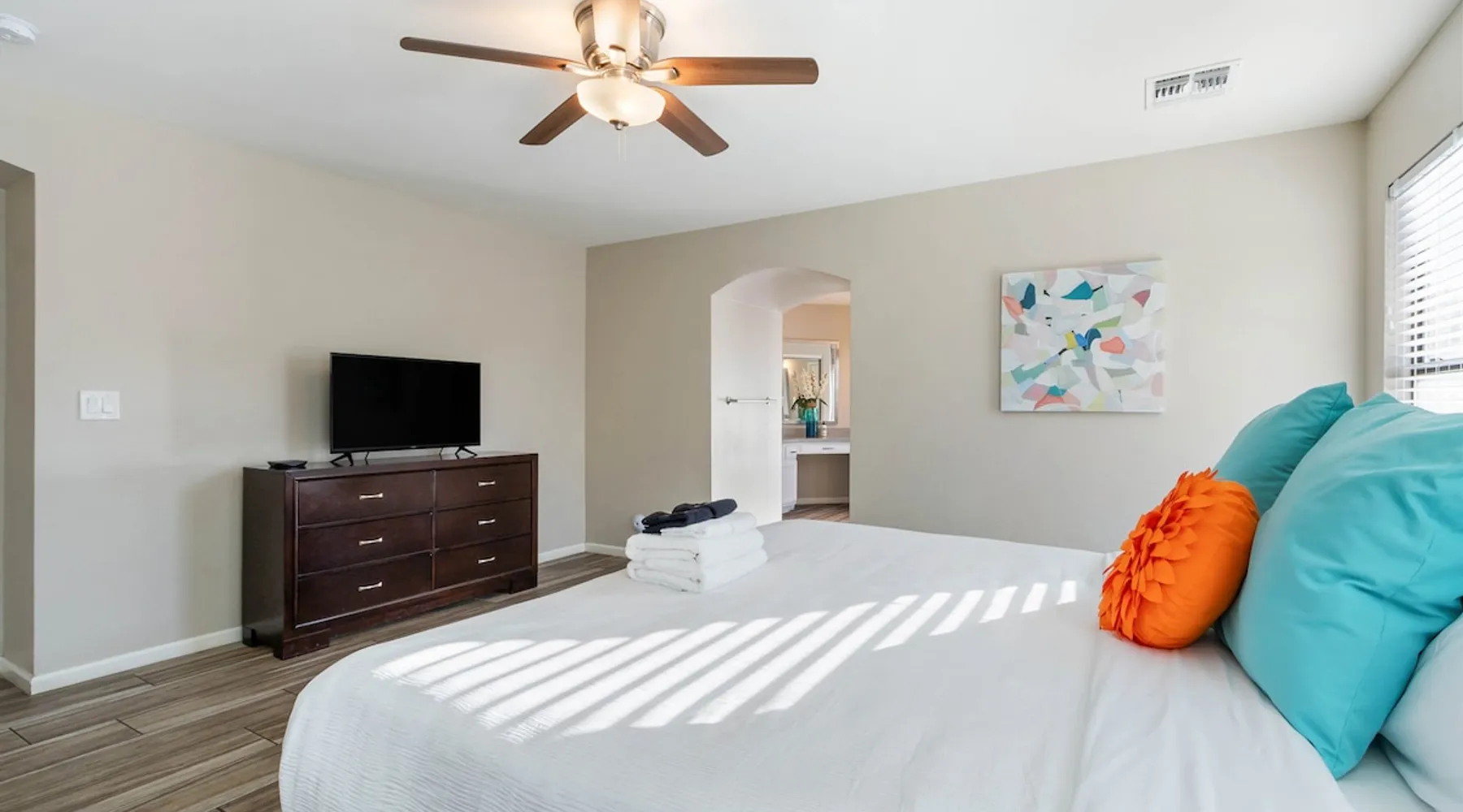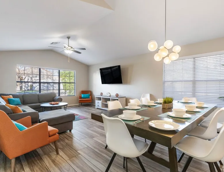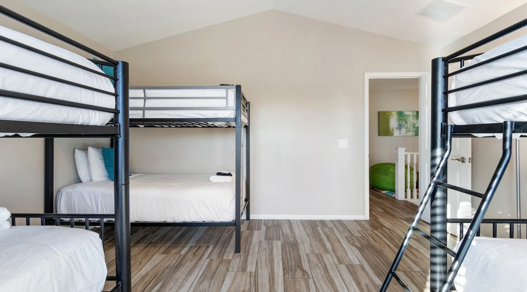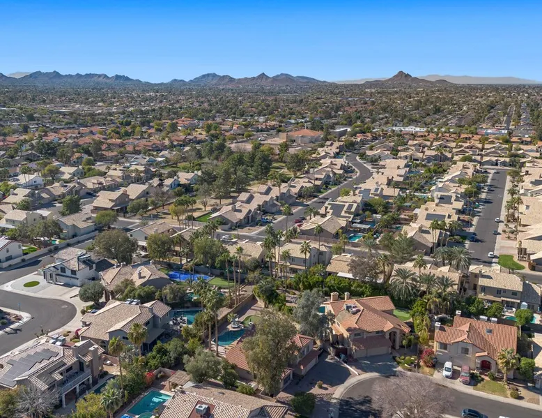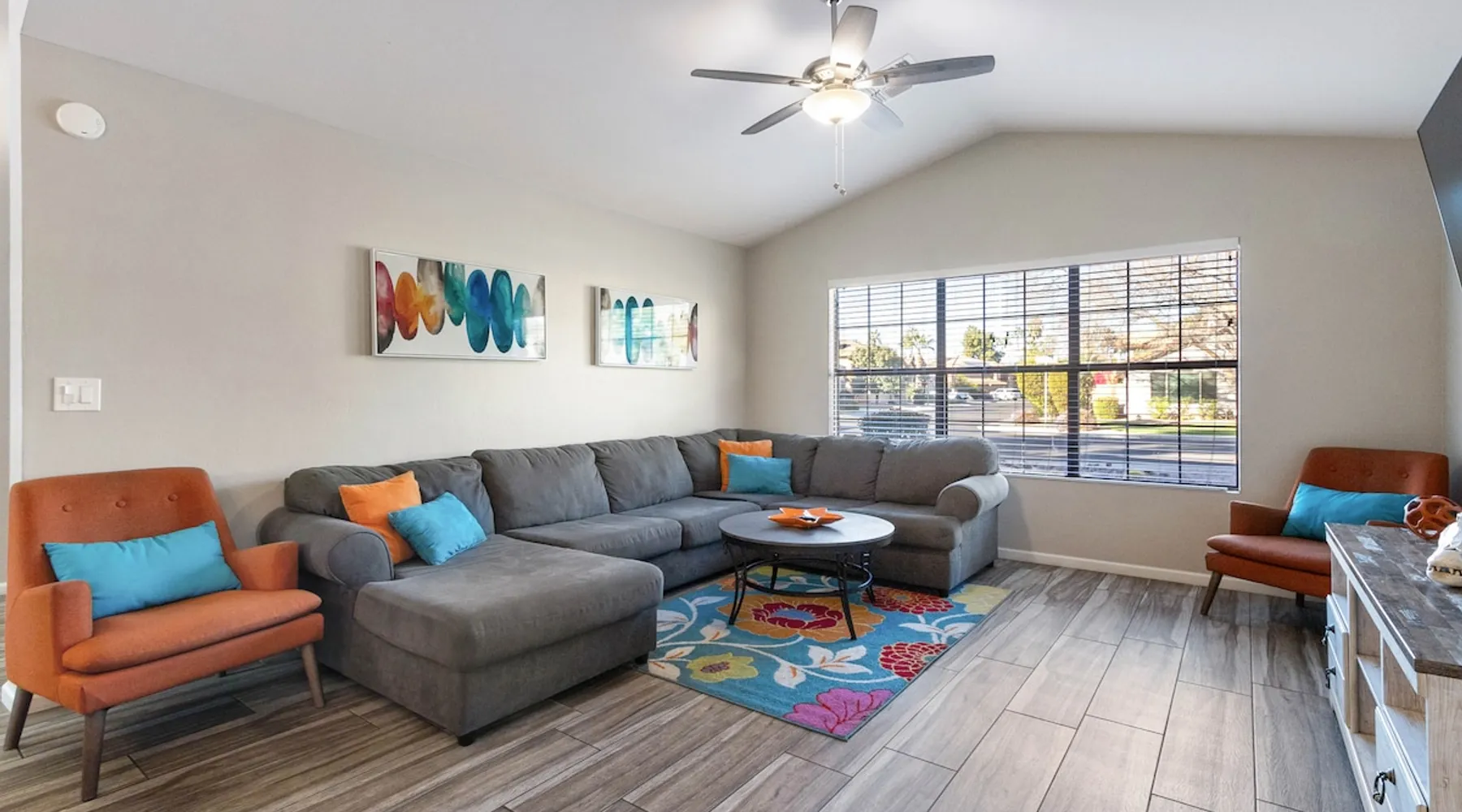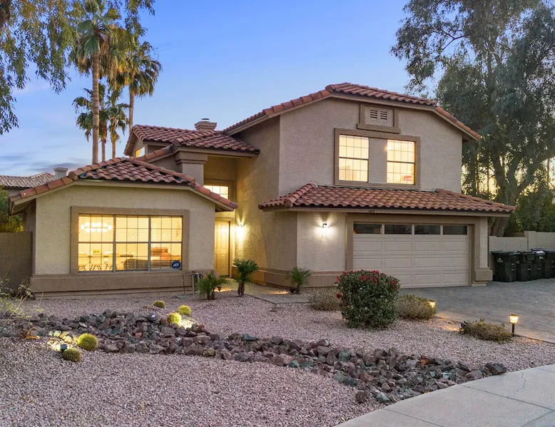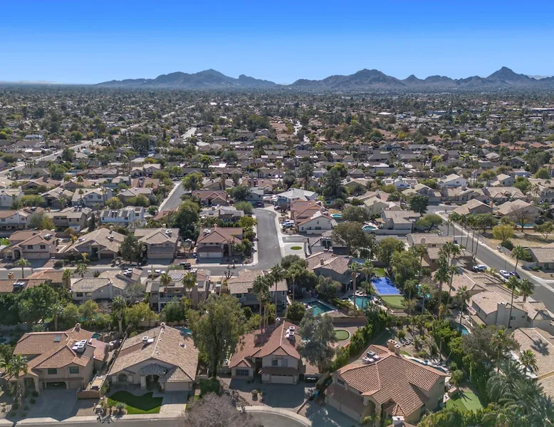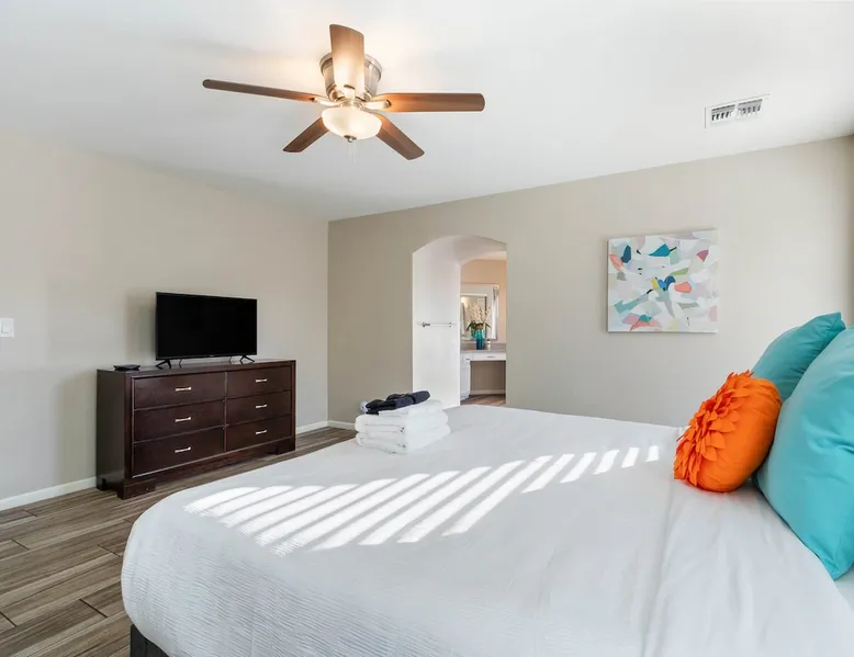 Luxury Paradise Palms Home | Pool, Hot Tub, Putting Green & More! The space This stunning and vibrant Paradise Palms property in Scottsdale is the ideal choice for your next visit! Located in a peaceful neighborhood at the heart of North Scottsdale, you'll be conveniently close to popular attractions and activities such as Kierland Commons and Scottsdale Quarter. This two-story home offers a spacious 2,639 square feet of living space, with five bedrooms and two and a half bathrooms to easily accommodate up to 16 guests — a terrific property for those with larger groups. After stepping through the front door, you will find yourself in the spacious front living room and dining room. After a few more steps you will then be in the main great room, which offers the pool table room and kitchen area. Living Room: This room offers contemporary furnishings including a spacious sectional and colorful accent chairs and a Smart TV. Dining Room: Next to the living room, the dining area offers seating for eight guests. Kitchen: Around the corner you will find the kitchen. The kitchen is fully equipped with stainless steel appliances and stocked with everything needed to prepare delicious meals for your group! The spacious bar top offers bar stools for six, making it a perfect place to gather! Game Room: Enjoy some entertainment on the Smart TV while playing a game on the pool table- making this spot an ideal hang out! Bedrooms/Bathrooms: Master Suite (main level)— King bed, Smart TV, desk area and private access to the backyard. The en suite bathroom offers two sinks and a spacious shower Bedroom 2/Bunk Room (upper level) — Two Twin over Full bunk beds and One Twin over Twin bunk bed. Bedroom 3 (upper level) – King size bed and access to shared bathroom Bedroom 4 (upper level) – King size bed and access to shared bathroom Bedroom 5 (upper level) – King size bed, Smart TV and access to shared bathroom Bathroom 2 (upper level) – Full shared bathroom with dual sink and tub/shoer combo Half bathroom on main level Outdoor spaces: The backyard space is spacious and offers endless fun! Plenty of outdoor seating under the covered patio where you can enjoy an outside meal or enjoy some entertainment on the Smart TV. Take a dip in the pool (not heated) or relax in the above ground hot tub. Enjoy a book on the hammock or sit next to the firepot with friends. Plenty of outdoor games are available including a putting green, bocce ball court and corn hole. There’s also a propane BBQ grill for grilling up your favorites. Internet Access: High-speed Wi-Fi Internet Entertainment: Smart TVs with cable provided by owner Laundry: Full size washer and dryer in the laundry room Pool: Yes, not heated. 8 feet diving pool. Hot Tub: Yes, private above ground Parking: Two car garage, with additional driveway parking for up to two vehicles. Air conditioning: Yes, central Pets: Yes, Two dogs allowed with a $100 non-refundable fee per dog Security cameras: No Cameras Neighborhood quiet hours are from 10 p.m. to 7 a.m. and are enforced by Scottsdale city ordinances. Thank you for respecting the neighbors. Pursuant to ARS § 32-2121 Property Manager does not solicit, arrange or accept reservations or monies, for occupancies of greater than thirty-one days. Distances: Old Town Scottsdale – 12 miles OdySea Aquarium — 11 miles Scottsdale Waterfront & Fashion Square Mall – 11.8 miles McCormick-Stillman Railroad Park – 9.3miles Kireland Commons- 3.1 miles Scottsdale Airport — 3.8 miles CDC cleanings are performed using checklists following all CDC cleaning guidelines. Arizona TPT License # 21343217 City of Phoenix Permit #STR-2025-002298 Guest access Guest has full access to the property and its amenities including 2 car garage and driveway parking, laundry room with washer/dryer, a private yard with an in-ground pool, hot tub, putting green, BBQ grill, outdoor patio seating area and central air conditioning.
