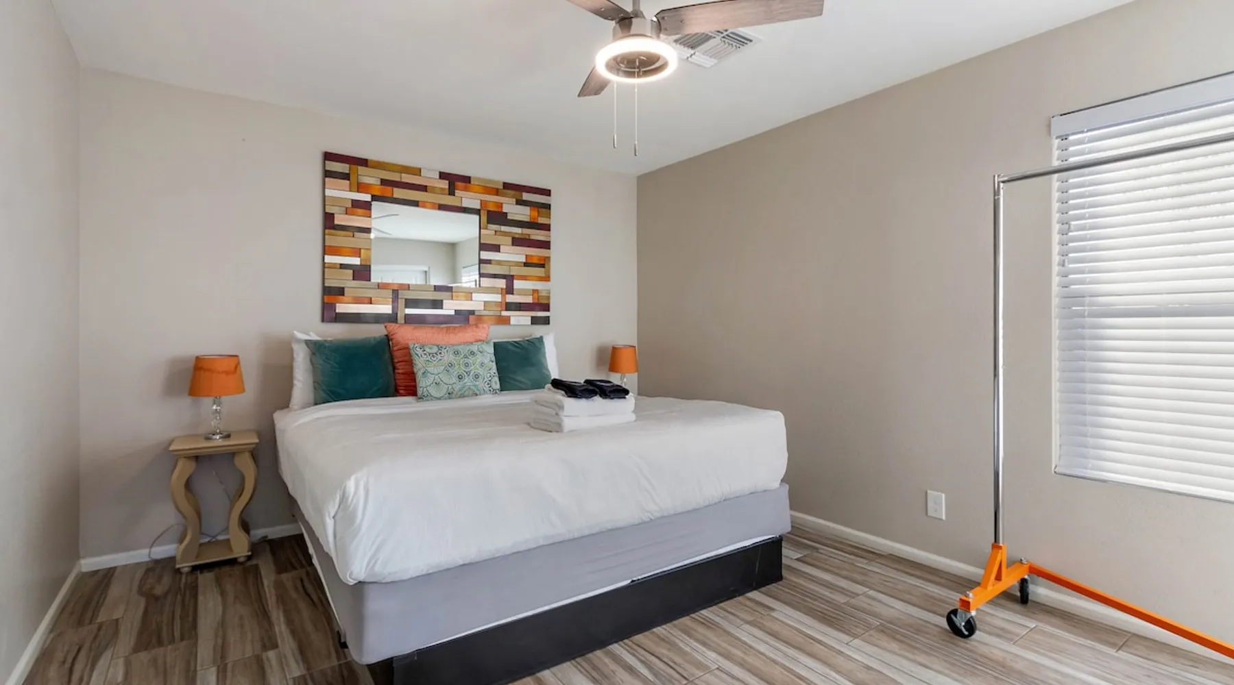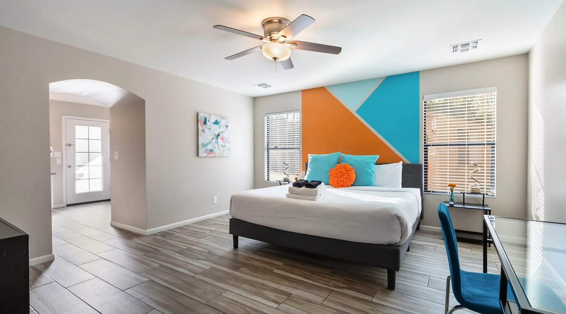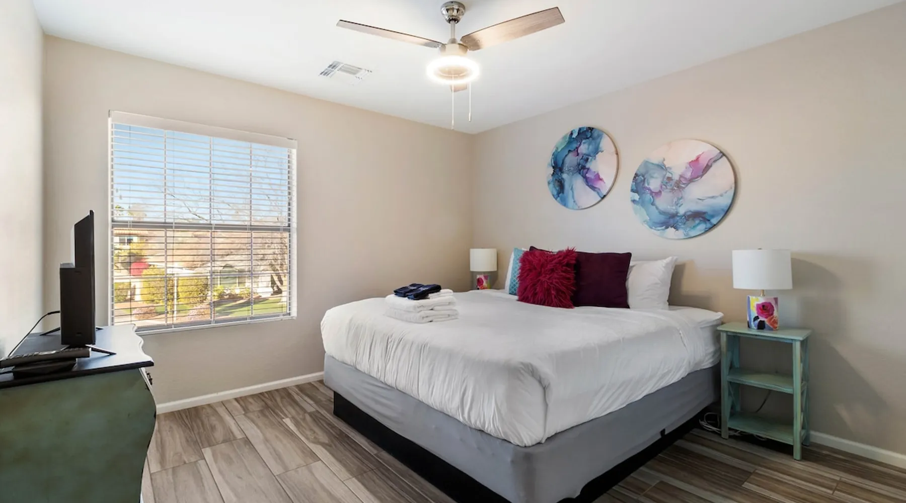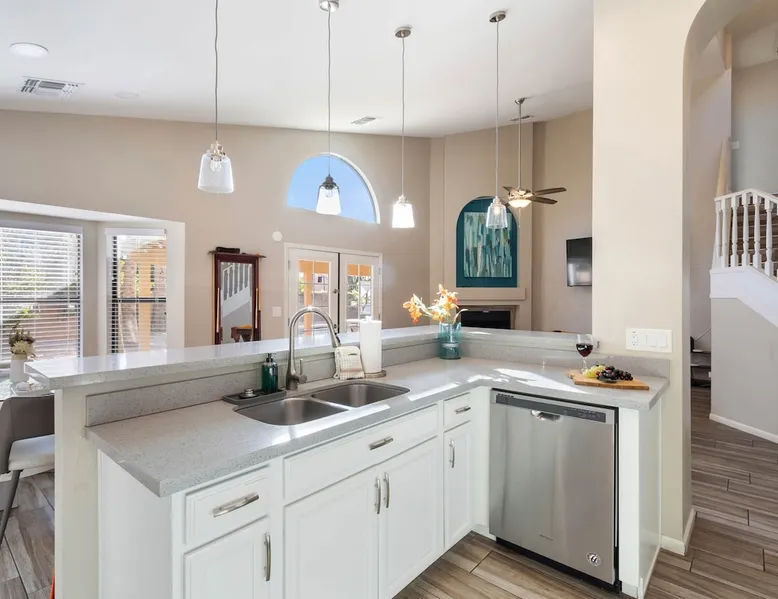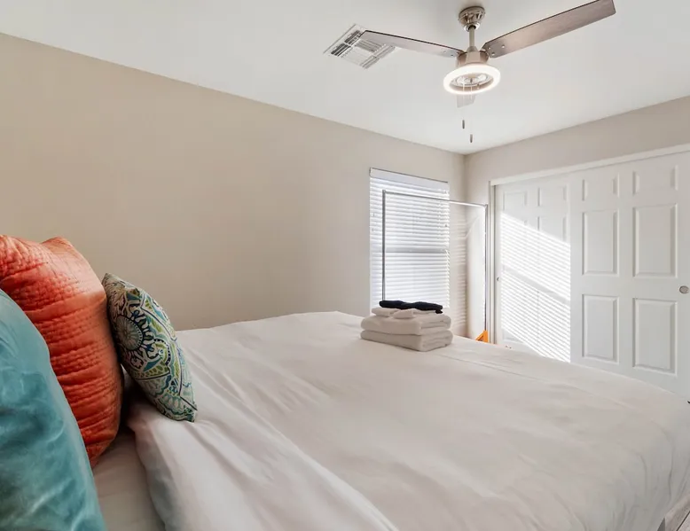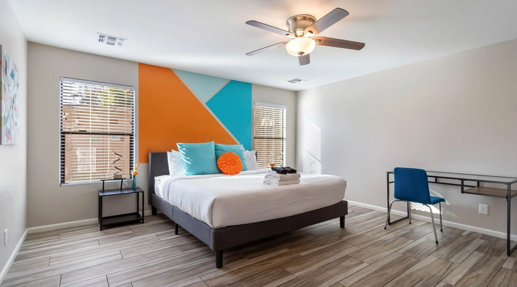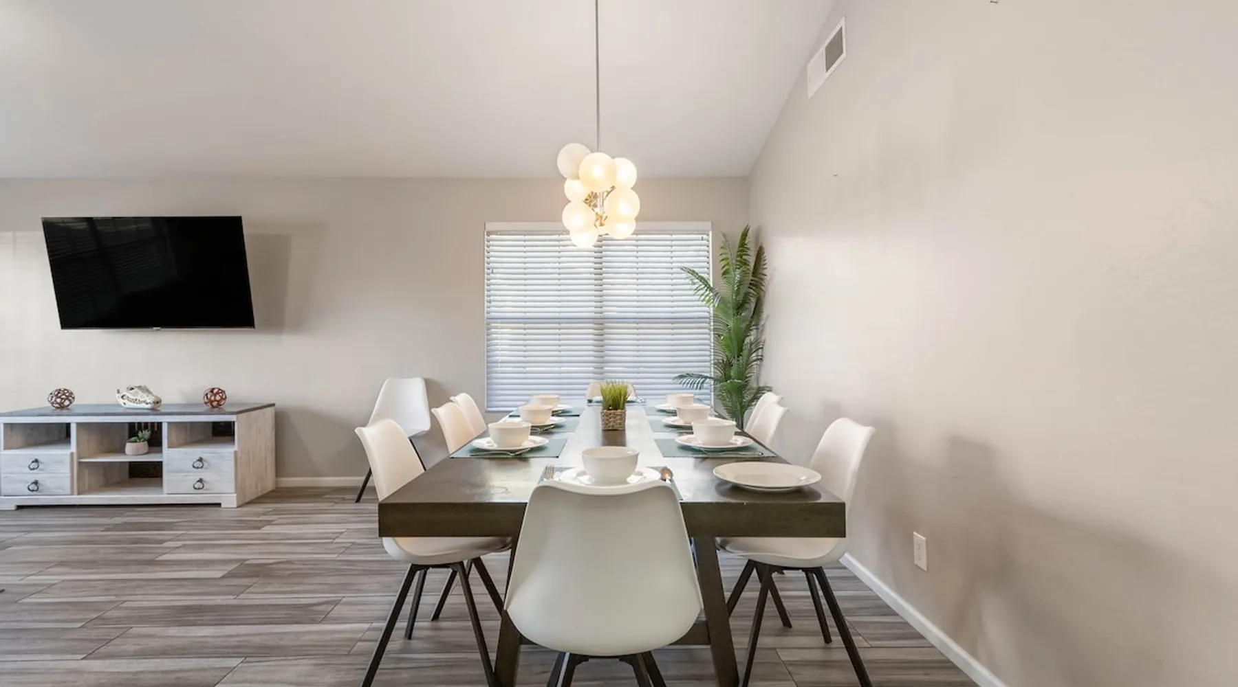 Luxury Paradise Palms Home | Pool, Hot Tub, Putting Green & More! The space This stunning and vibrant Paradise Palms property in Scottsdale is the ideal choice for your next visit! Located in a peaceful neighborhood at the heart of North Scottsdale, you'll be conveniently close to popular attractions and activities such as Kierland Commons and Scottsdale Quarter. This two-story home offers a spacious 2,639 square feet of living space, with five bedrooms and two and a half bathrooms to easily accommodate up to 16 guests — a terrific property for those with larger groups. After stepping through the front door, you will find yourself in the spacious front living room and dining room. After a few more steps you will then be in the main great room, which offers the pool table room and kitchen area. Living Room: This room offers contemporary furnishings including a spacious sectional and colorful accent chairs and a Smart TV. Dining Room: Next to the living room, the dining area offers seating for eight guests. Kitchen: Around the corner you will find the kitchen. The kitchen is fully equipped with stainless steel appliances and stocked with everything needed to prepare delicious meals for your group! The spacious bar top offers bar stools for six, making it a perfect place to gather! Game Room: Enjoy some entertainment on the Smart TV while playing a game on the pool table- making this spot an ideal hang out! Bedrooms/Bathrooms: Master Suite (main level)— King bed, Smart TV, desk area and private access to the backyard. The en suite bathroom offers two sinks and a spacious shower Bedroom 2/Bunk Room (upper level) — Two Twin over Full bunk beds and One Twin over Twin bunk bed. Bedroom 3 (upper level) – King size bed and access to shared bathroom Bedroom 4 (upper level) – King size bed and access to shared bathroom Bedroom 5 (upper level) – King size bed, Smart TV and access to shared bathroom Bathroom 2 (upper level) – Full shared bathroom with dual sink and tub/shoer combo Half bathroom on main level Outdoor spaces: The backyard space is spacious and offers endless fun! Plenty of outdoor seating under the covered patio where you can enjoy an outside meal or enjoy some entertainment on the Smart TV. Take a dip in the pool (not heated) or relax in the above ground hot tub. Enjoy a book on the hammock or sit next to the firepot with friends. Plenty of outdoor games are available including a putting green, bocce ball court and corn hole. There’s also a propane BBQ grill for grilling up your favorites. Internet Access: High-speed Wi-Fi Internet Entertainment: Smart TVs with cable provided by owner Laundry: Full size washer and dryer in the laundry room Pool: Yes, not heated. 8 feet diving pool. Hot Tub: Yes, private above ground Parking: Two car garage, with additional driveway parking for up to two vehicles. Air conditioning: Yes, central Pets: Yes, Two dogs allowed with a $100 non-refundable fee per dog Security cameras: No Cameras Neighborhood quiet hours are from 10 p.m. to 7 a.m. and are enforced by Scottsdale city ordinances. Thank you for respecting the neighbors. Pursuant to ARS § 32-2121 Property Manager does not solicit, arrange or accept reservations or monies, for occupancies of greater than thirty-one days. Distances: Old Town Scottsdale – 12 miles OdySea Aquarium — 11 miles Scottsdale Waterfront & Fashion Square Mall – 11.8 miles McCormick-Stillman Railroad Park – 9.3miles Kireland Commons- 3.1 miles Scottsdale Airport — 3.8 miles CDC cleanings are performed using checklists following all CDC cleaning guidelines. Arizona TPT License # 21343217 City of Phoenix Permit #STR-2025-002298 Guest access Guest has full access to the property and its amenities including 2 car garage and driveway parking, laundry room with washer/dryer, a private yard with an in-ground pool, hot tub, putting green, BBQ grill, outdoor patio seating area and central air conditioning.