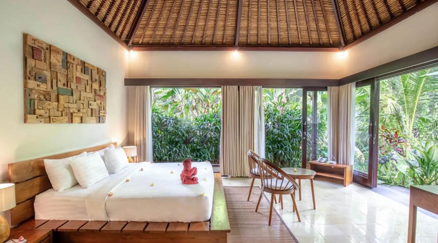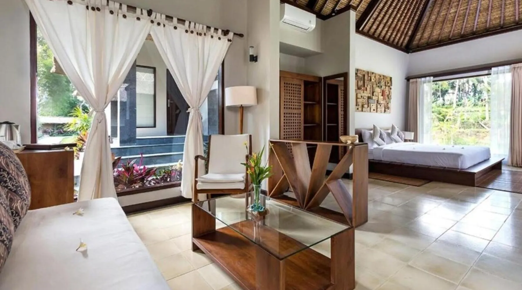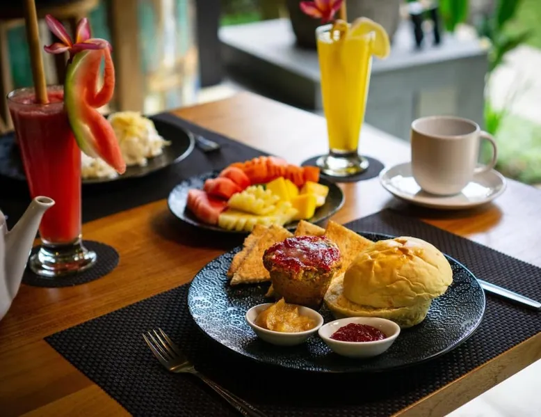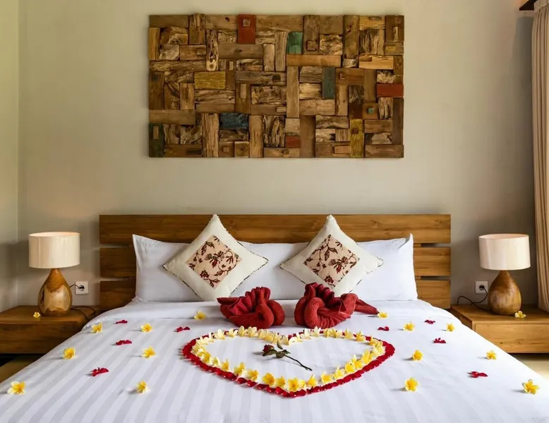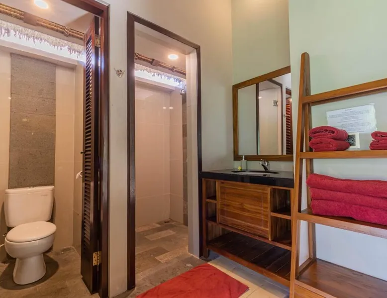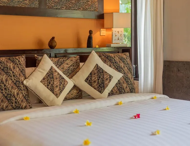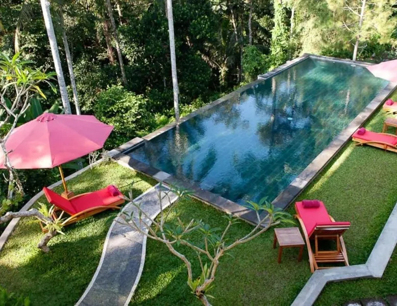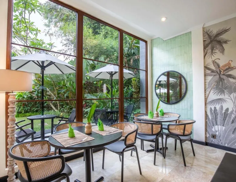 Suara Air Luxury Villa Ubud offers a serene jungle retreat with breathtaking garden views. This private villa features a spacious bedroom with a double bed, a private terrace, and modern amenities for a comfortable stay. Guests can enjoy a sun terrace, outdoor pool, and lush gardens, along with on-site dining, a bar, and spa services. Conveniently located 5.5 km from Ubud Palace, the villa also provides airport shuttle services and guided tours for an immersive Bali experience. The space - 1-bedroom villa with a double bed and jungle view - Private terrace with seating area - Modern amenities: air conditioning, free WiFi, minibar, and satellite TV - Private bathroom with a shower, bidet, hairdryer, and free toiletries - Hardwood and tile flooring for a stylish touch - Wake-up service available upon request Guest access - Free access to the outdoor swimming pool, garden, and sun terrace - On-site restaurant, bar, and room service - Complimentary private parking (no reservation needed) - Full access to spa services, excursions, and cultural activities (additional charges may apply) During your stay - 24-hour front desk and concierge service to assist with any requests - Tour desk available for booking excursions and activities - Multilingual staff speaking English, Spanish, Indonesian, and Malay Other things to note - Airport shuttle available at an additional cost - Daily housekeeping and laundry services provided - Cooking classes, bike tours, and snorkeling trips can be arranged - Located in a peaceful area, but only a short drive from Ubud’s main attractions