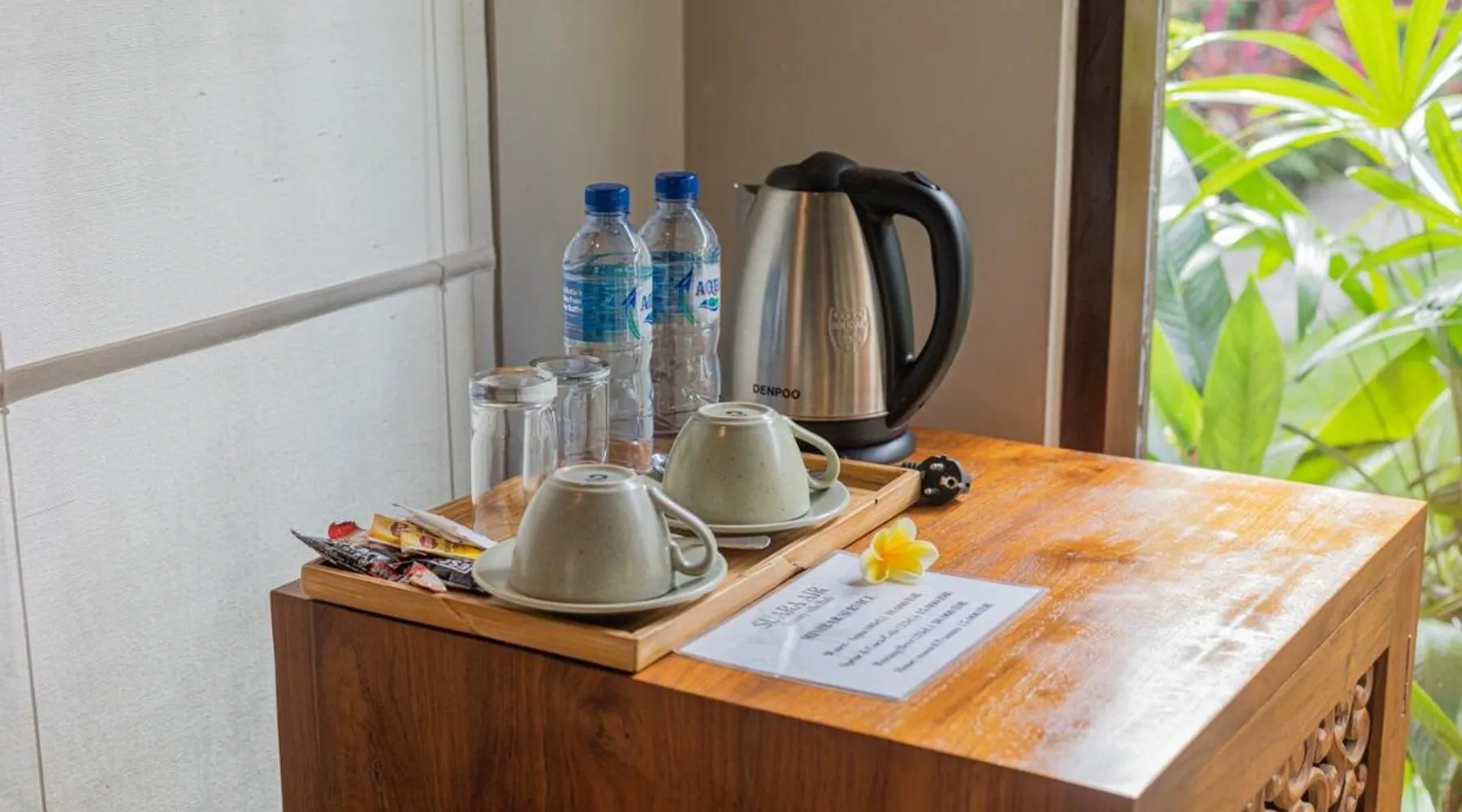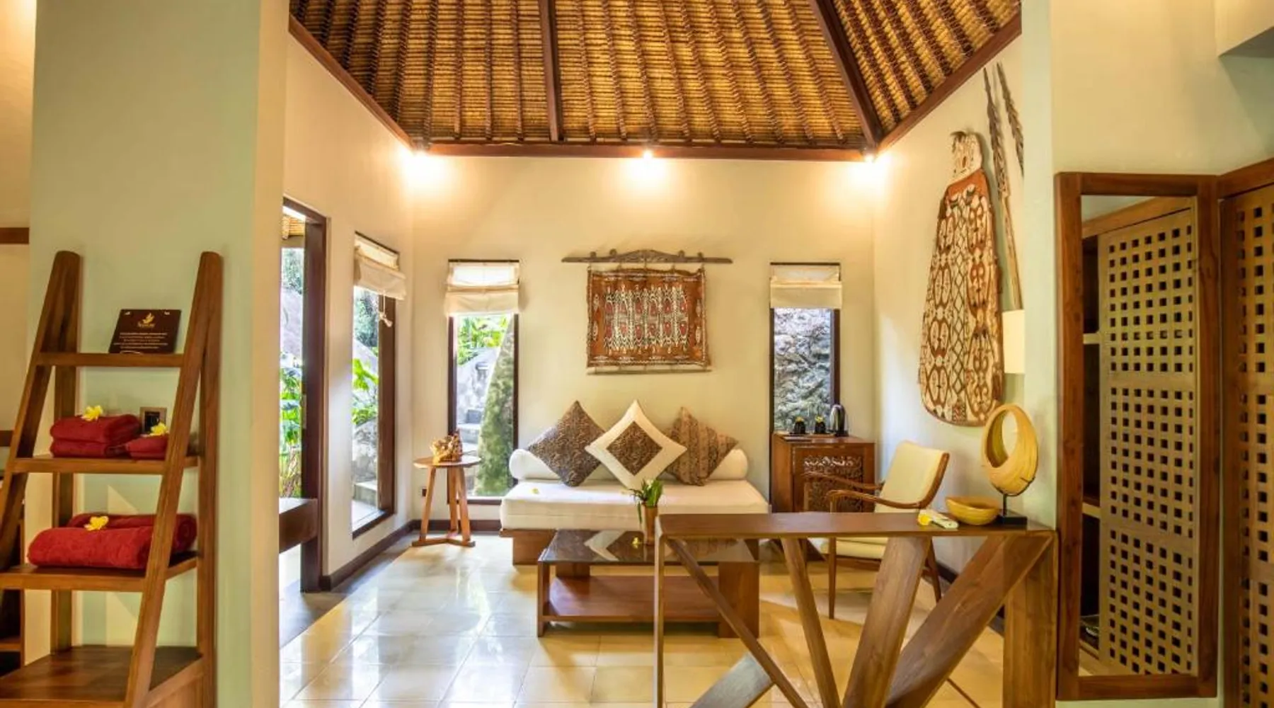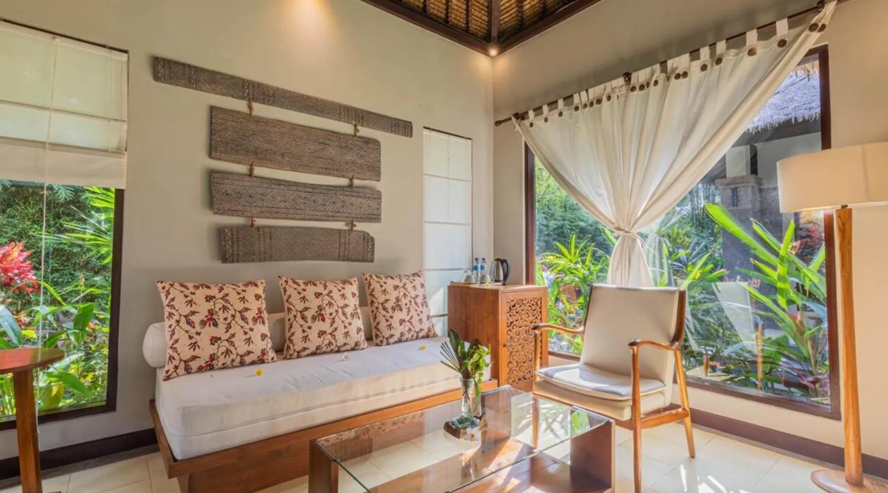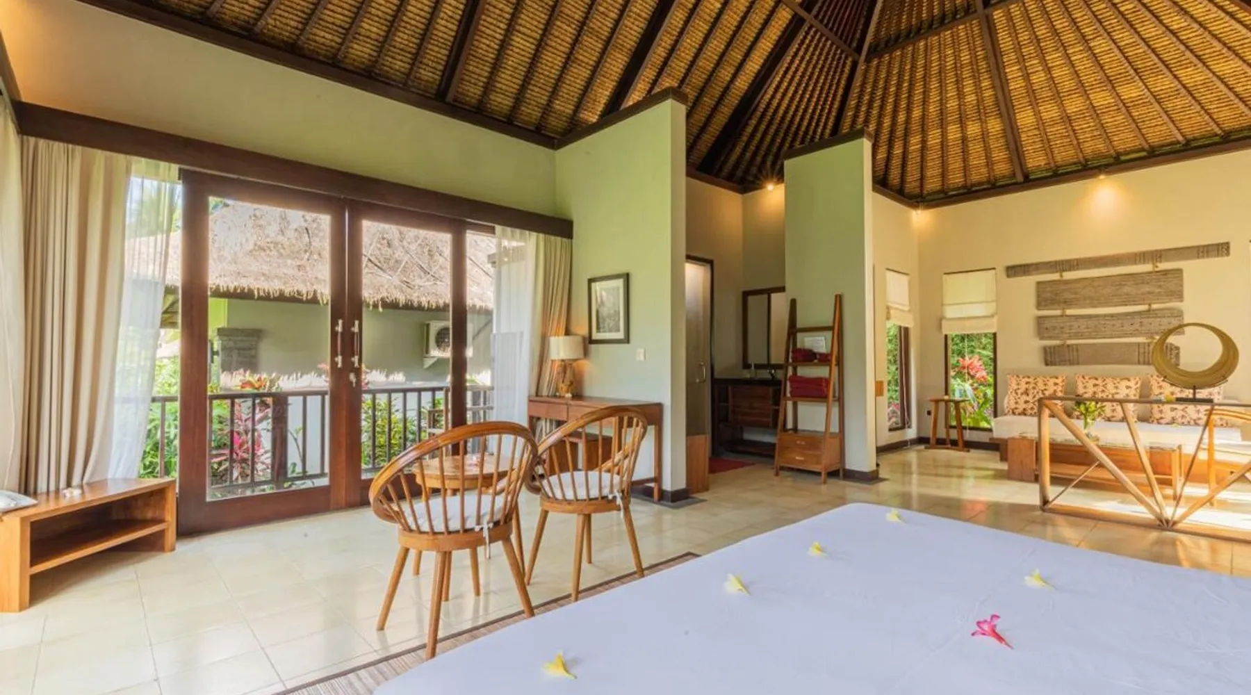 Suara Air Luxury Villa Ubud offers a serene jungle retreat with breathtaking garden views. This private villa features a spacious bedroom with a double bed, a private terrace, and modern amenities for a comfortable stay. Guests can enjoy a sun terrace, outdoor pool, and lush gardens, along with on-site dining, a bar, and spa services. Conveniently located 5.5 km from Ubud Palace, the villa also provides airport shuttle services and guided tours for an immersive Bali experience. The space - 1-bedroom villa with a double bed and jungle view - Private terrace with seating area - Modern amenities: air conditioning, free WiFi, minibar, and satellite TV - Private bathroom with a shower, bidet, hairdryer, and free toiletries - Hardwood and tile flooring for a stylish touch - Wake-up service available upon request Guest access - Free access to the outdoor swimming pool, garden, and sun terrace - On-site restaurant, bar, and room service - Complimentary private parking (no reservation needed) - Full access to spa services, excursions, and cultural activities (additional charges may apply) During your stay - 24-hour front desk and concierge service to assist with any requests - Tour desk available for booking excursions and activities - Multilingual staff speaking English, Spanish, Indonesian, and Malay Other things to note - Airport shuttle available at an additional cost - Daily housekeeping and laundry services provided - Cooking classes, bike tours, and snorkeling trips can be arranged - Located in a peaceful area, but only a short drive from Ubud’s main attractions