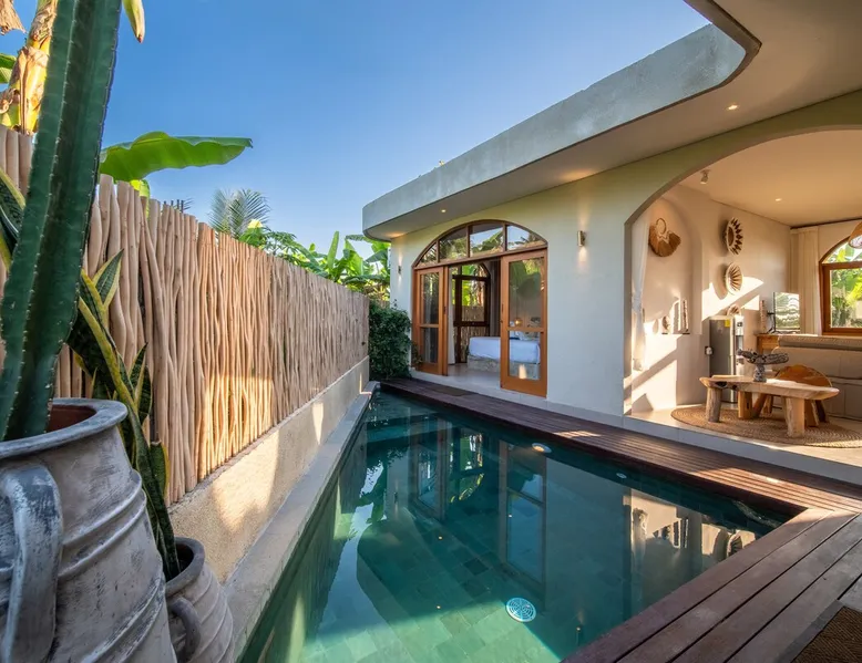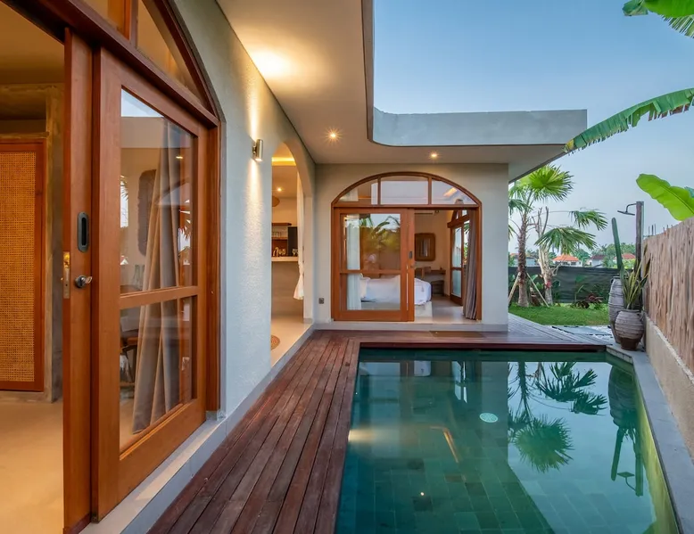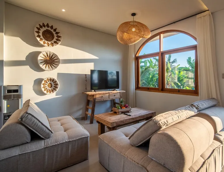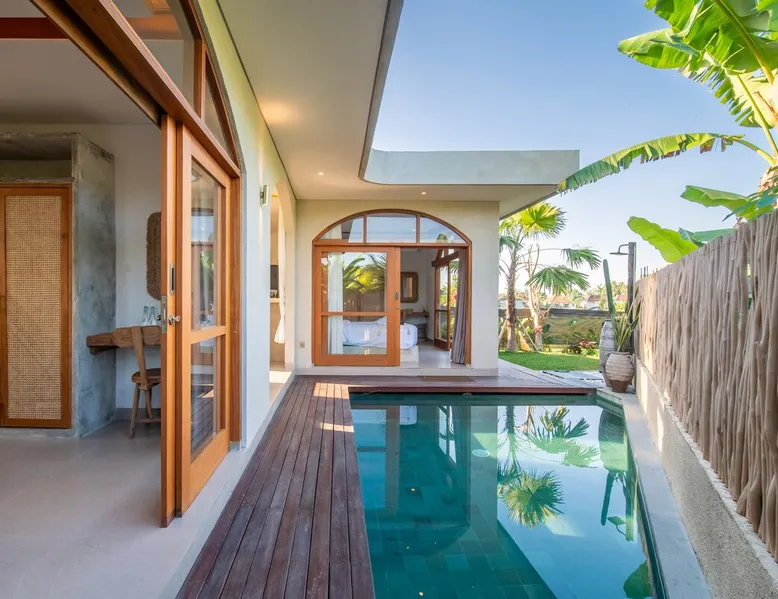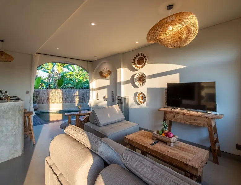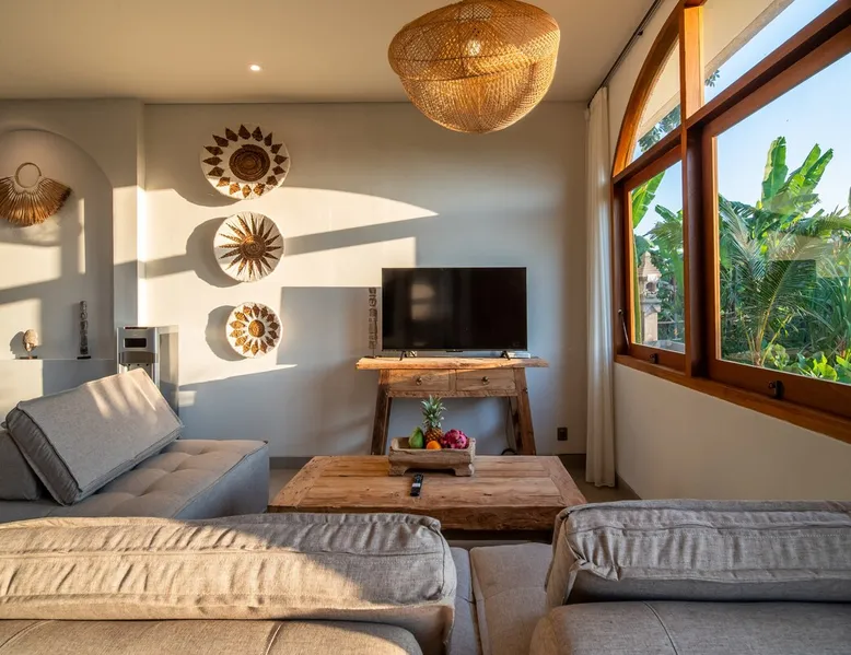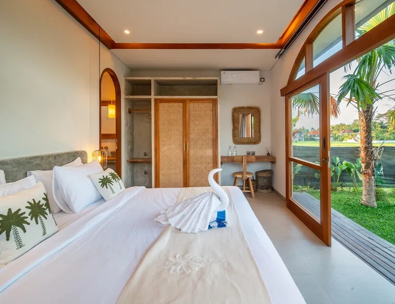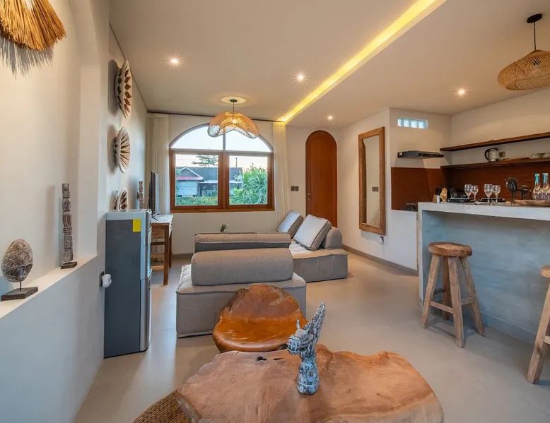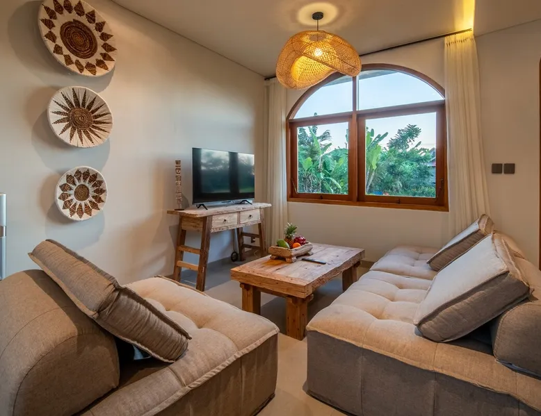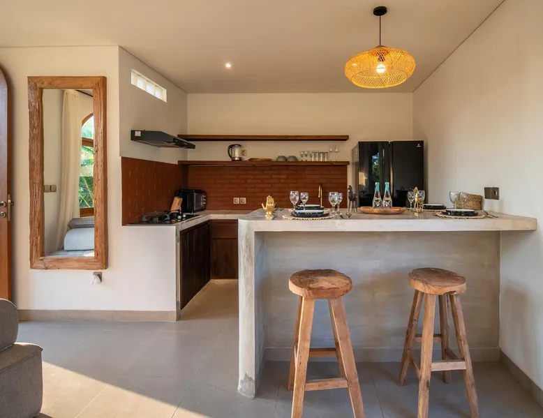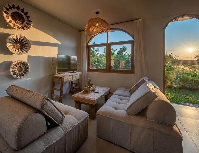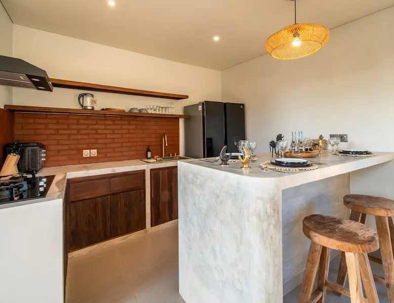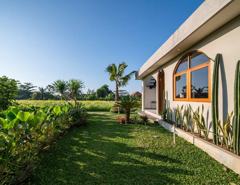Relax in this quiet and stylish space. This unique place, recently completed in November 2024, is nestled near a local ceramics workshop, offering an authentic and rare experience. This enchanting place offers elegant and bright Mediterranean architecture, perfectly integrated with Balinese nature. Imagine yourself admiring spectacular sunsets on emerald rice fields, surrounded by peaceful nature. The space - Bedrooms: Two spacious bedrooms, each equipped with a king size bed and en-suite bathroom including one with a luxurious bathtub. - Living room & Common spaces: Relax in the beautiful living room, a room bathed in light, perfect for moments of conviviality or relaxation on your own. The decor combines Mediterranean style and Balinese touches for an unforgettable atmosphere. - Private Pool: The villa has a private swimming pool that invites you to relax. - Daily Cleaning Service: Don't worry about anything, our staff takes care of everything so you can fully enjoy your stay. Guest access You benefit from exclusive use of the entire villa. From the private pool to stylish living spaces, every nook and cranny of this hidden gem is entirely yours. Each room has its own keys to ensure your privacy and security. Free parking and easy access to the main road make getting around simple, whether by taxi or renting a motorbike. Other things to note We make your stay easier with personalized services *: - Airport transfer roundtrip. - Private chef. - Authentic Balinese cooking class. - Motorcycle rental. - English speaking tourist guide. - Pool decor. - Flower bouquets. *These services are not included in the booking price
