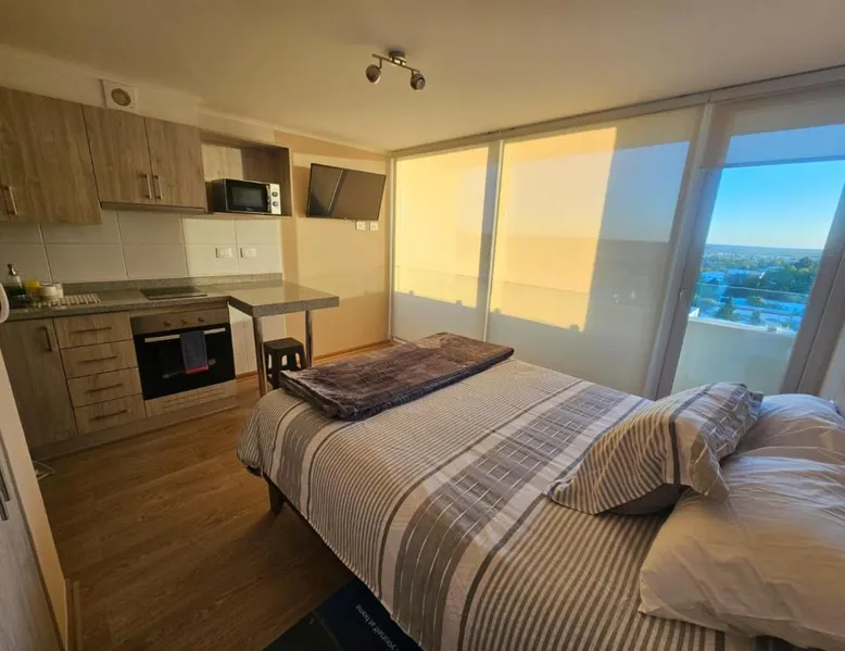 Comfortable Living Space: Depto Full Equipado en Centro de Chillán con Estacionamiento 10 offers a one-bedroom apartment in Chillán. Guests enjoy a terrace, balcony, and garden views. The kitchenette includes a refrigerator, microwave, oven, and toaster. Modern Amenities: The apartment features free WiFi, streaming services, and a washing machine. Additional amenities include a dining table, outdoor furniture, and a wardrobe. Convenient Location: Located 59 mi from Carriel Sur International Airport, the property is a 16-minute walk from Chillán Train Station. Nearby attractions include a landmark and city views. Guest Satisfaction: Highly rated for its convenient location, room comfort, and cleanliness. Reception staff speak Spanish and Portuguese. The apartment features 1 bedroom, 1 bathroom and a kitchen. The well-fitted kitchen has a refrigerator, kitchenware, an oven and a microwave. Featuring a terrace with garden views, this apartment also provides a washing machine and a flat-screen TV with streaming services. The unit offers 1 bed.