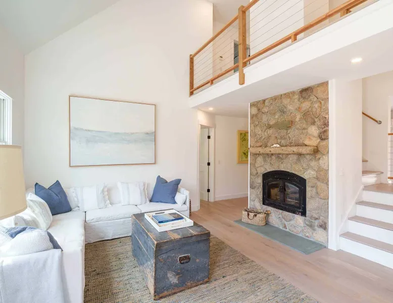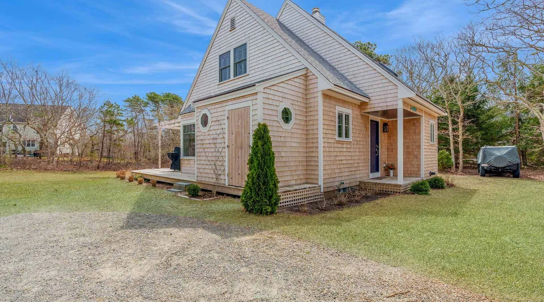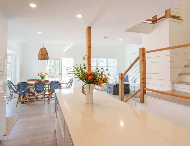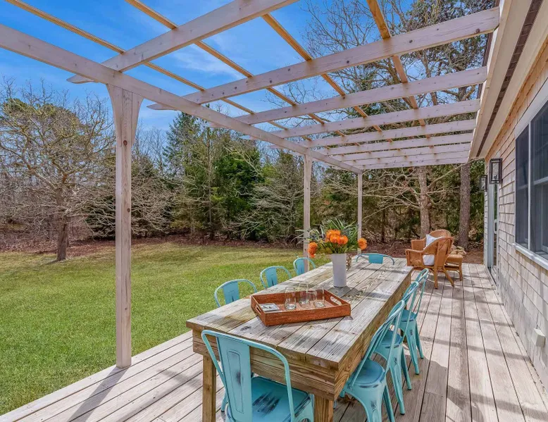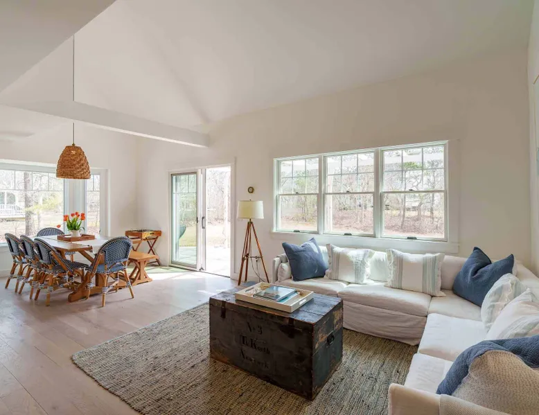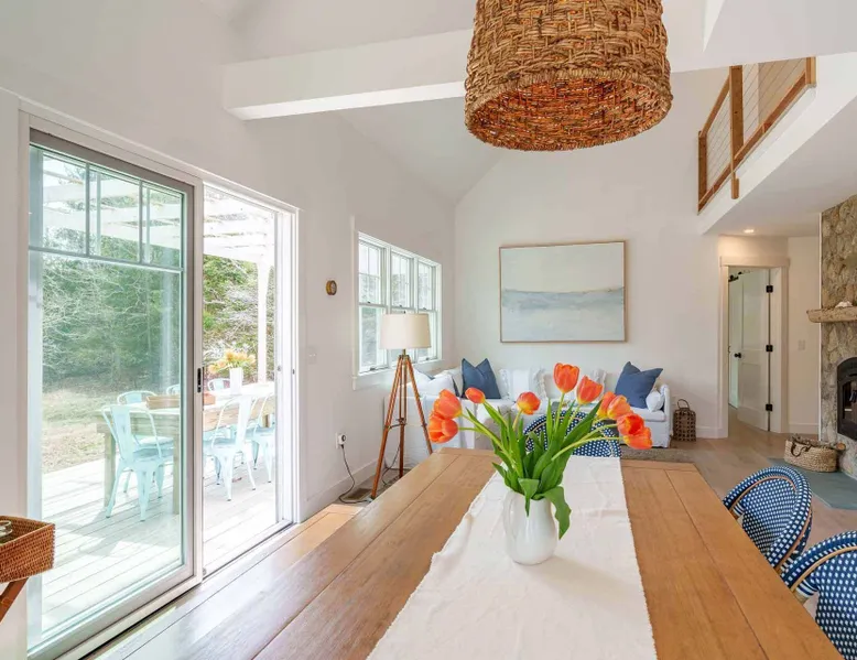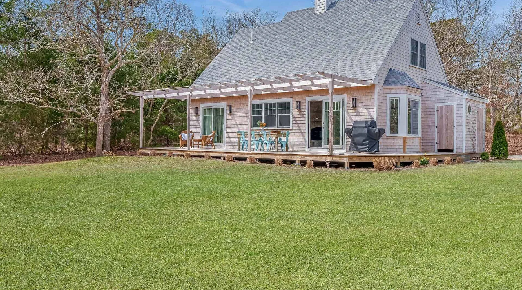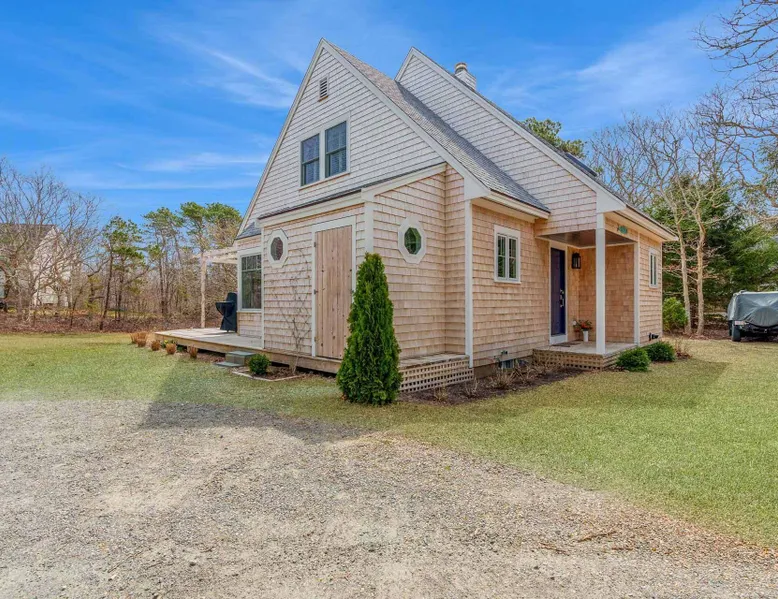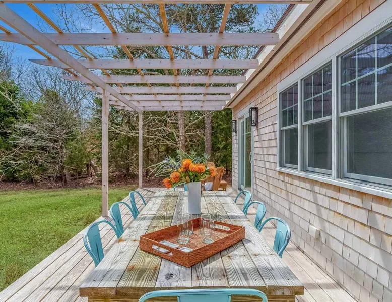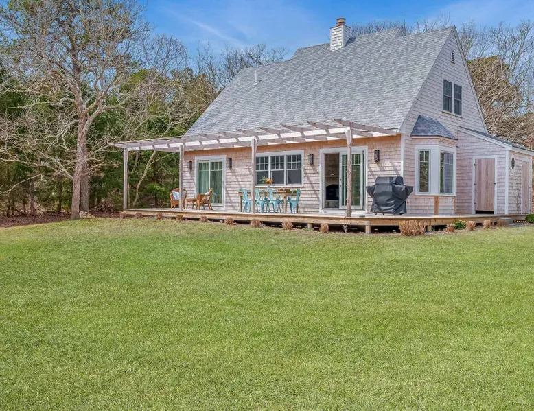 POINT B EXCLUSIVE - This Contemporary Beach House has just been stylishly renovated throughout with nice coastal touches. It also enjoys a convenient, central location in a quiet Edgartown neighborhood. The first floor features a light-filled open Living, Dining, and Kitchen Area. The room has vaulted ceiling and is framed by two walls of glass windows and a sliding door that opens out to a large deck with pergola. The Living Area anchors one end of the room with sectional seating, stone fireplace, and second-floor balcony overlook. Dining Area is at the other end of the room, where it sits in a sunny corner with the two walls of windows. It opens to new Gourmet Kitchen. It has stone counters, center prep island/breakfast bar, and stainless Bosch appliances, including an induction range. The Primary Bedroom is also on the first floor. It has a deluxe en suite bath plus a sliding door to the back deck. An open stairway and landing with cable railings lead up to the second-floor where the other two Bedrooms share a full bath. There is also a Media Room with large screen TV and sectional seating on the lower level. Outdoor entertaining centers around the large back deck with pergola. There is an outdoor dining table, grilling area, and sitting area outside the Primary Bedroom. The deck overlooks a large grassy backyard. The house is located in the quiet, central Edgartown neighborhood of Westminster Acres. From its central location, downtown Edgartown, Oak Bluffs, and Vineyard Haven are all 10-minute drives away. The bike path is at the end of the road.