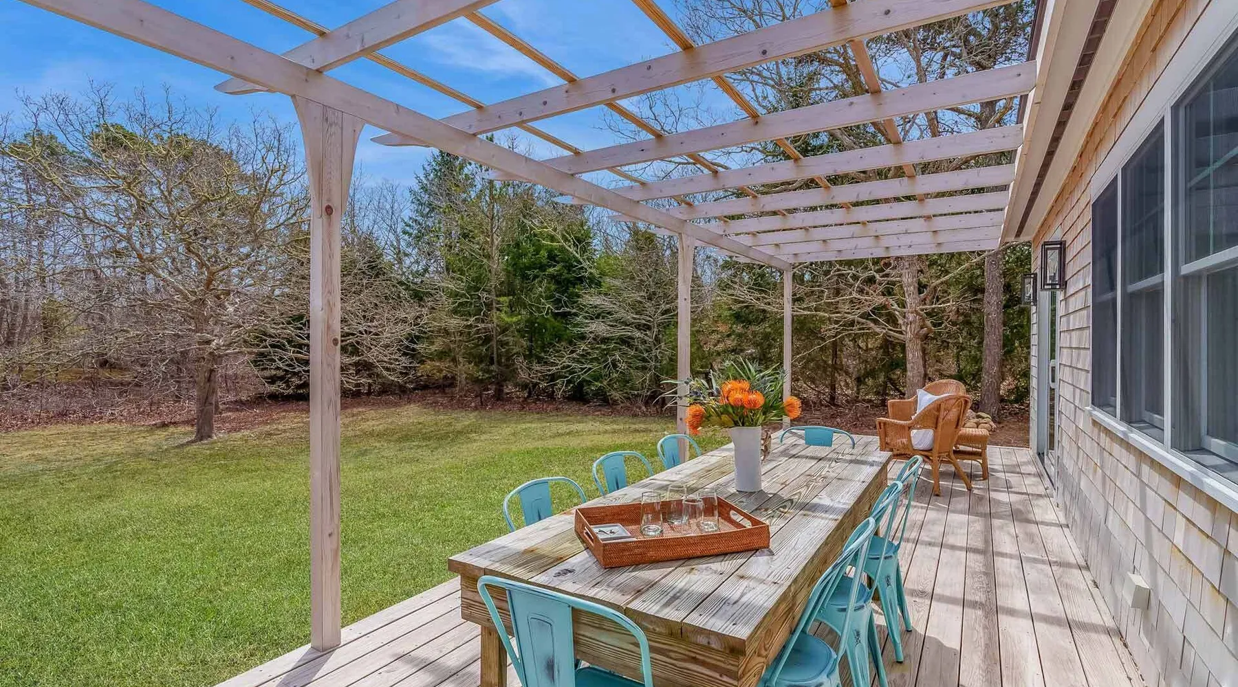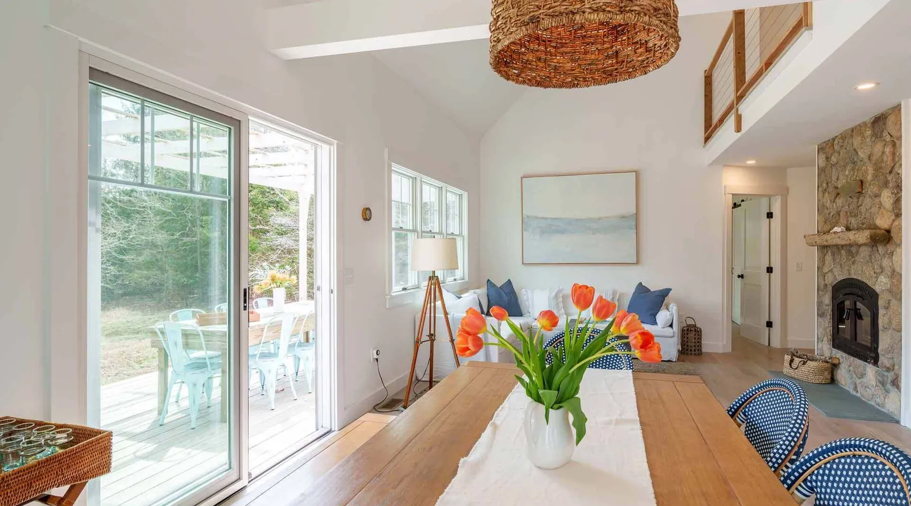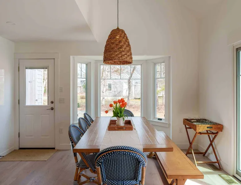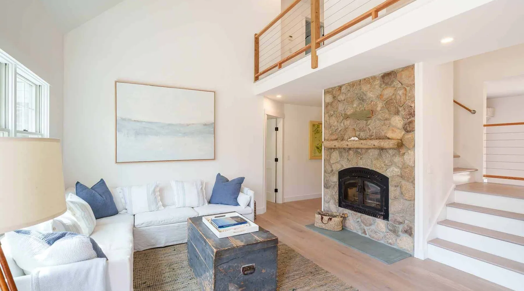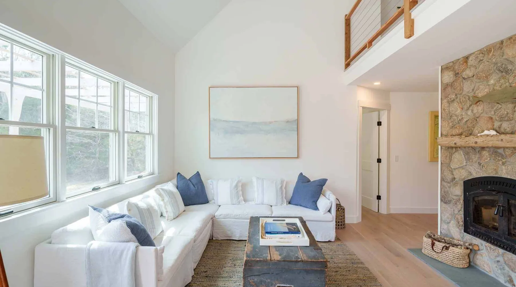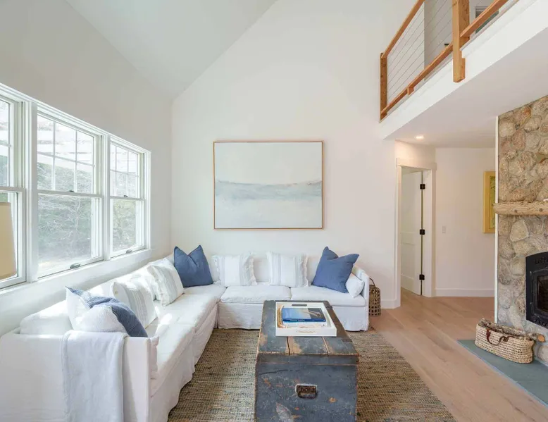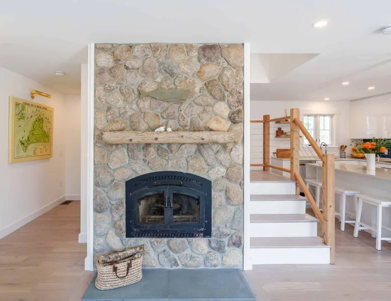 POINT B EXCLUSIVE - This Contemporary Beach House has just been stylishly renovated throughout with nice coastal touches. It also enjoys a convenient, central location in a quiet Edgartown neighborhood. The first floor features a light-filled open Living, Dining, and Kitchen Area. The room has vaulted ceiling and is framed by two walls of glass windows and a sliding door that opens out to a large deck with pergola. The Living Area anchors one end of the room with sectional seating, stone fireplace, and second-floor balcony overlook. Dining Area is at the other end of the room, where it sits in a sunny corner with the two walls of windows. It opens to new Gourmet Kitchen. It has stone counters, center prep island/breakfast bar, and stainless Bosch appliances, including an induction range. The Primary Bedroom is also on the first floor. It has a deluxe en suite bath plus a sliding door to the back deck. An open stairway and landing with cable railings lead up to the second-floor where the other two Bedrooms share a full bath. There is also a Media Room with large screen TV and sectional seating on the lower level. Outdoor entertaining centers around the large back deck with pergola. There is an outdoor dining table, grilling area, and sitting area outside the Primary Bedroom. The deck overlooks a large grassy backyard. The house is located in the quiet, central Edgartown neighborhood of Westminster Acres. From its central location, downtown Edgartown, Oak Bluffs, and Vineyard Haven are all 10-minute drives away. The bike path is at the end of the road.