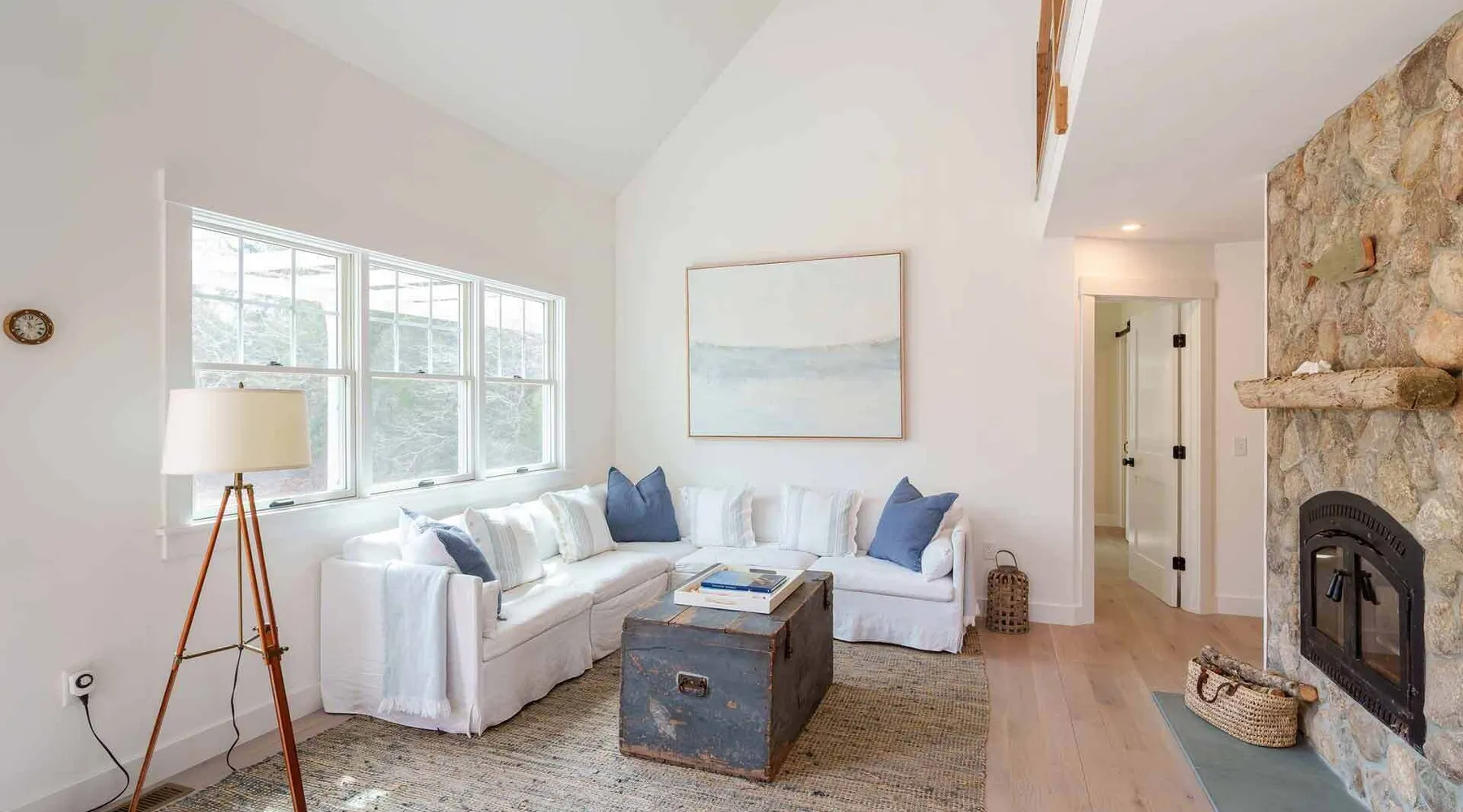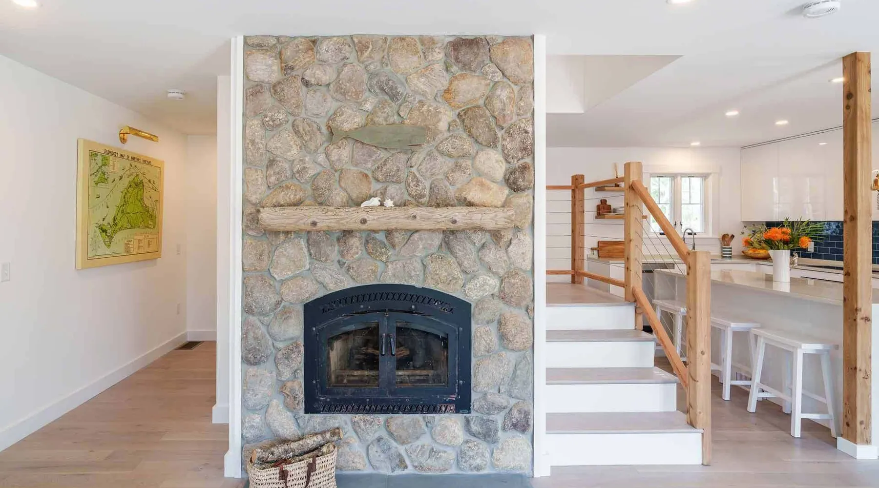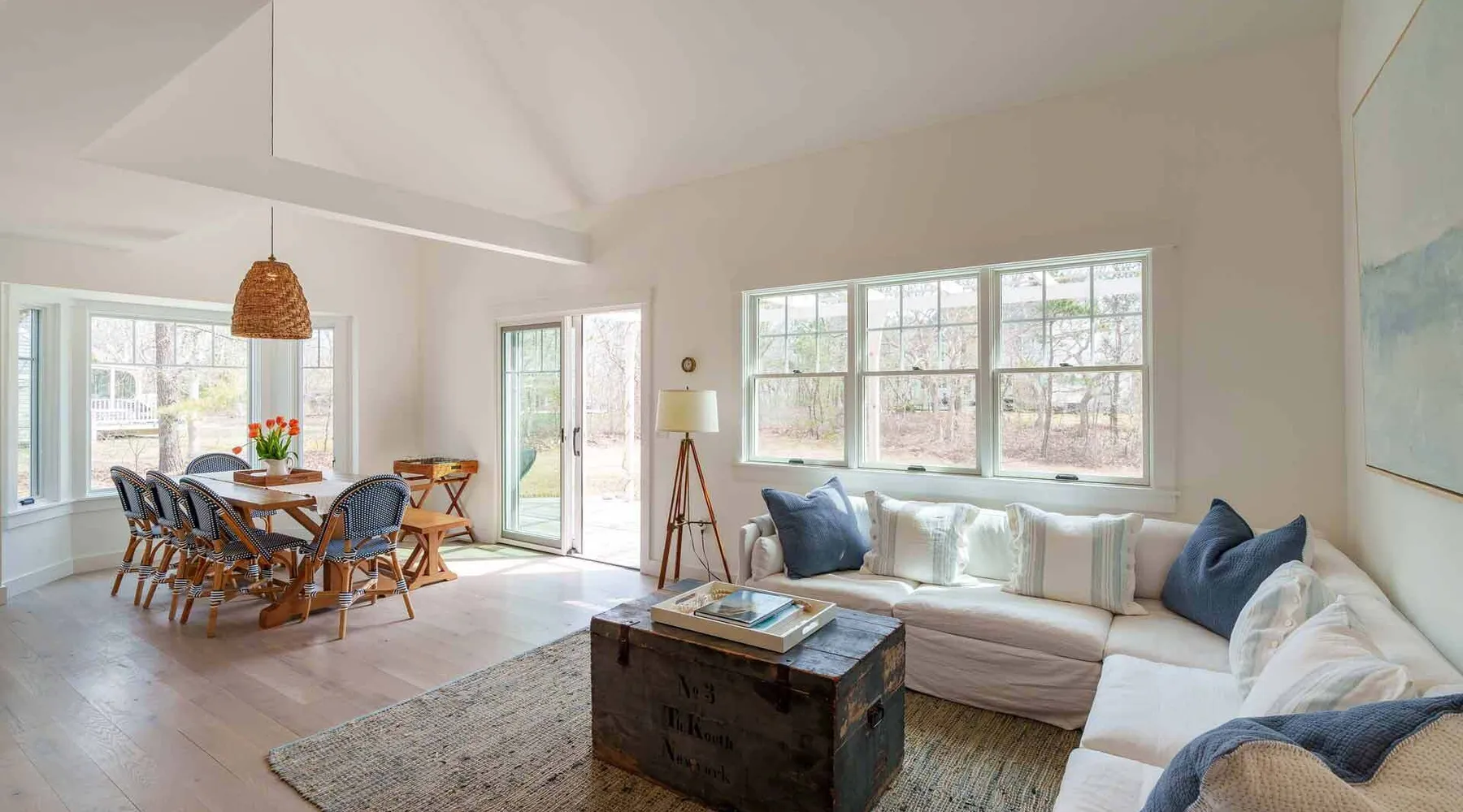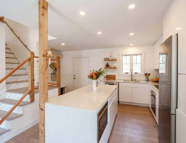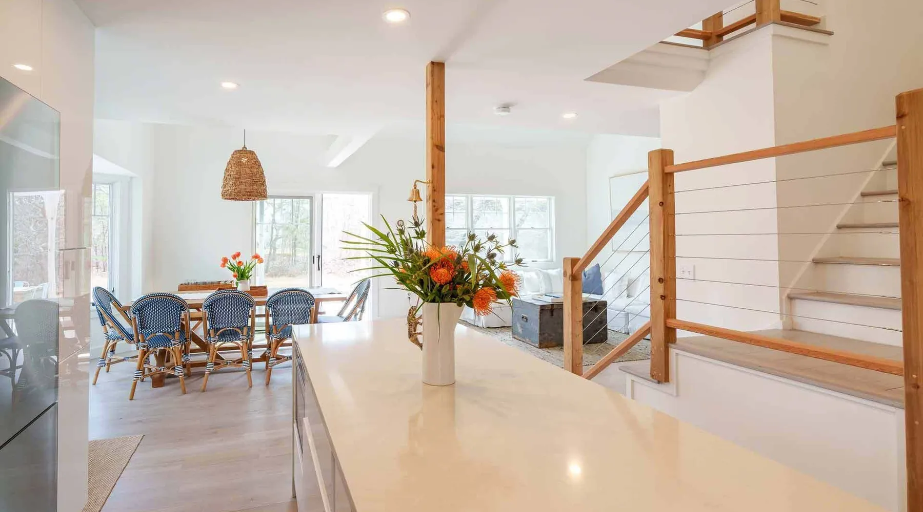 POINT B EXCLUSIVE - This Contemporary Beach House has just been stylishly renovated throughout with nice coastal touches. It also enjoys a convenient, central location in a quiet Edgartown neighborhood. The first floor features a light-filled open Living, Dining, and Kitchen Area. The room has vaulted ceiling and is framed by two walls of glass windows and a sliding door that opens out to a large deck with pergola. The Living Area anchors one end of the room with sectional seating, stone fireplace, and second-floor balcony overlook. Dining Area is at the other end of the room, where it sits in a sunny corner with the two walls of windows. It opens to new Gourmet Kitchen. It has stone counters, center prep island/breakfast bar, and stainless Bosch appliances, including an induction range. The Primary Bedroom is also on the first floor. It has a deluxe en suite bath plus a sliding door to the back deck. An open stairway and landing with cable railings lead up to the second-floor where the other two Bedrooms share a full bath. There is also a Media Room with large screen TV and sectional seating on the lower level. Outdoor entertaining centers around the large back deck with pergola. There is an outdoor dining table, grilling area, and sitting area outside the Primary Bedroom. The deck overlooks a large grassy backyard. The house is located in the quiet, central Edgartown neighborhood of Westminster Acres. From its central location, downtown Edgartown, Oak Bluffs, and Vineyard Haven are all 10-minute drives away. The bike path is at the end of the road.