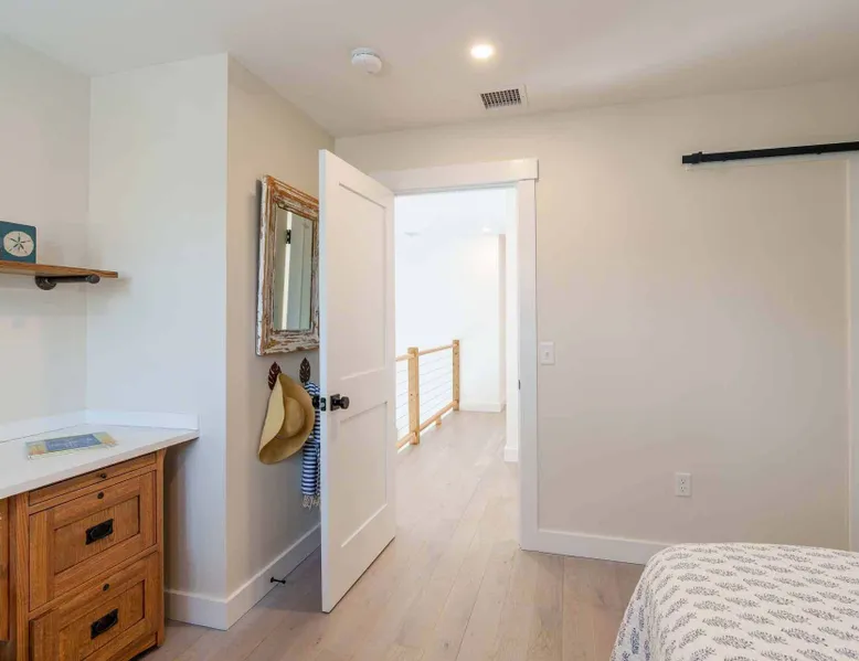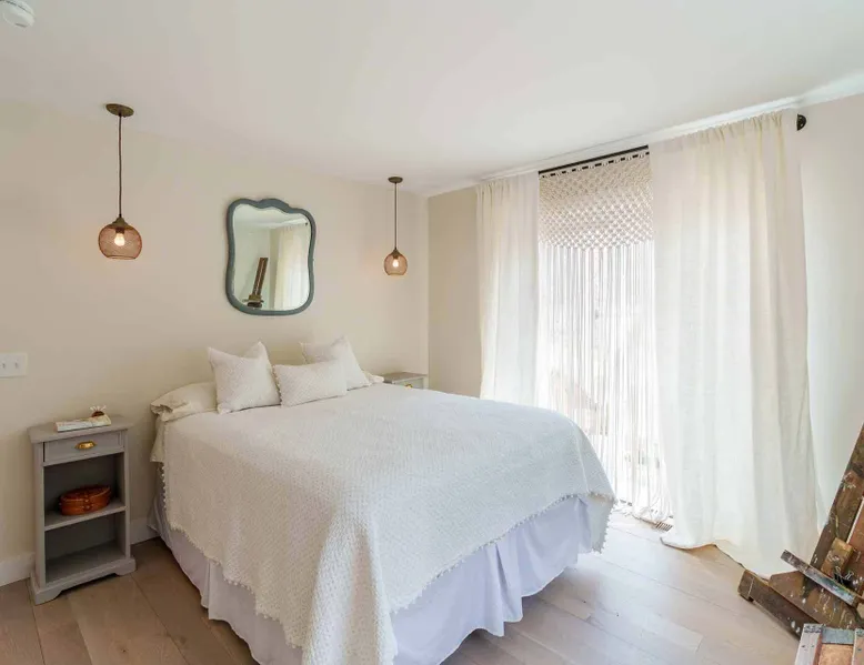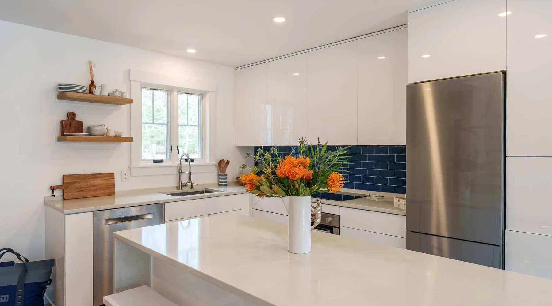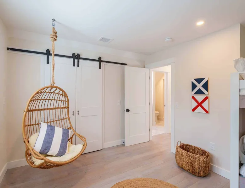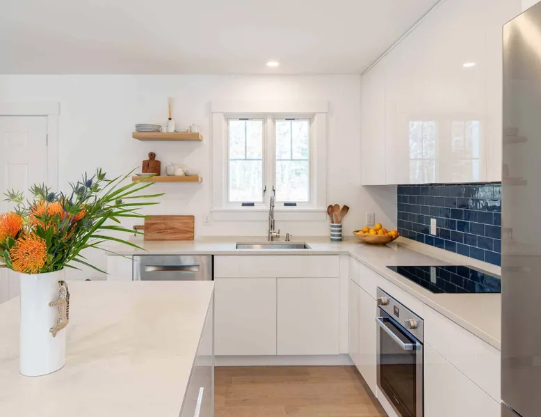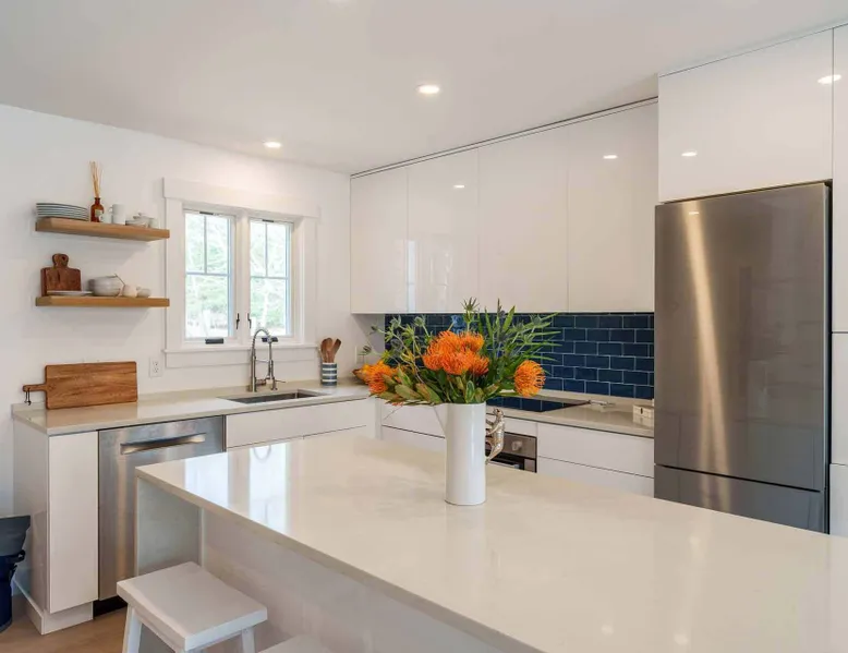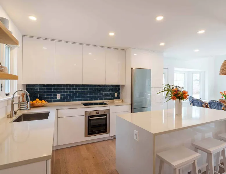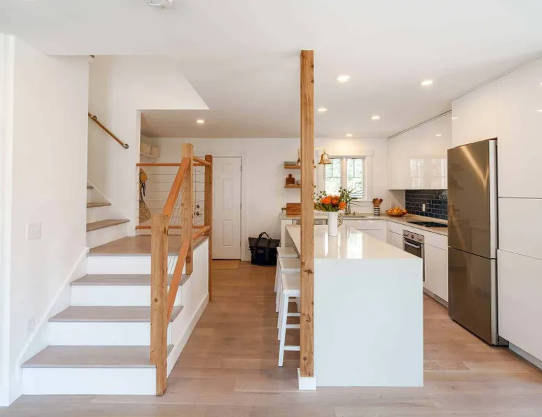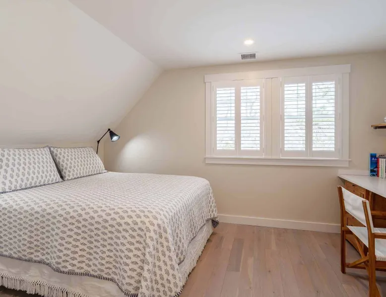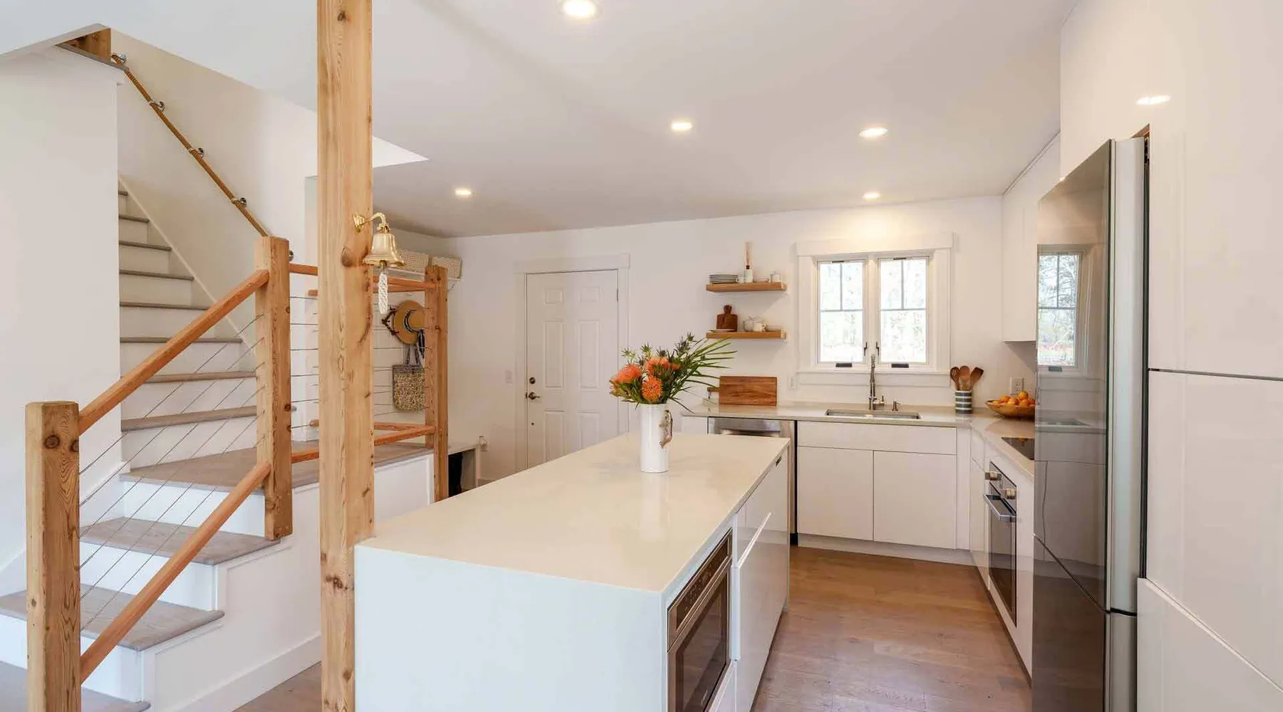 POINT B EXCLUSIVE - This Contemporary Beach House has just been stylishly renovated throughout with nice coastal touches. It also enjoys a convenient, central location in a quiet Edgartown neighborhood. The first floor features a light-filled open Living, Dining, and Kitchen Area. The room has vaulted ceiling and is framed by two walls of glass windows and a sliding door that opens out to a large deck with pergola. The Living Area anchors one end of the room with sectional seating, stone fireplace, and second-floor balcony overlook. Dining Area is at the other end of the room, where it sits in a sunny corner with the two walls of windows. It opens to new Gourmet Kitchen. It has stone counters, center prep island/breakfast bar, and stainless Bosch appliances, including an induction range. The Primary Bedroom is also on the first floor. It has a deluxe en suite bath plus a sliding door to the back deck. An open stairway and landing with cable railings lead up to the second-floor where the other two Bedrooms share a full bath. There is also a Media Room with large screen TV and sectional seating on the lower level. Outdoor entertaining centers around the large back deck with pergola. There is an outdoor dining table, grilling area, and sitting area outside the Primary Bedroom. The deck overlooks a large grassy backyard. The house is located in the quiet, central Edgartown neighborhood of Westminster Acres. From its central location, downtown Edgartown, Oak Bluffs, and Vineyard Haven are all 10-minute drives away. The bike path is at the end of the road.