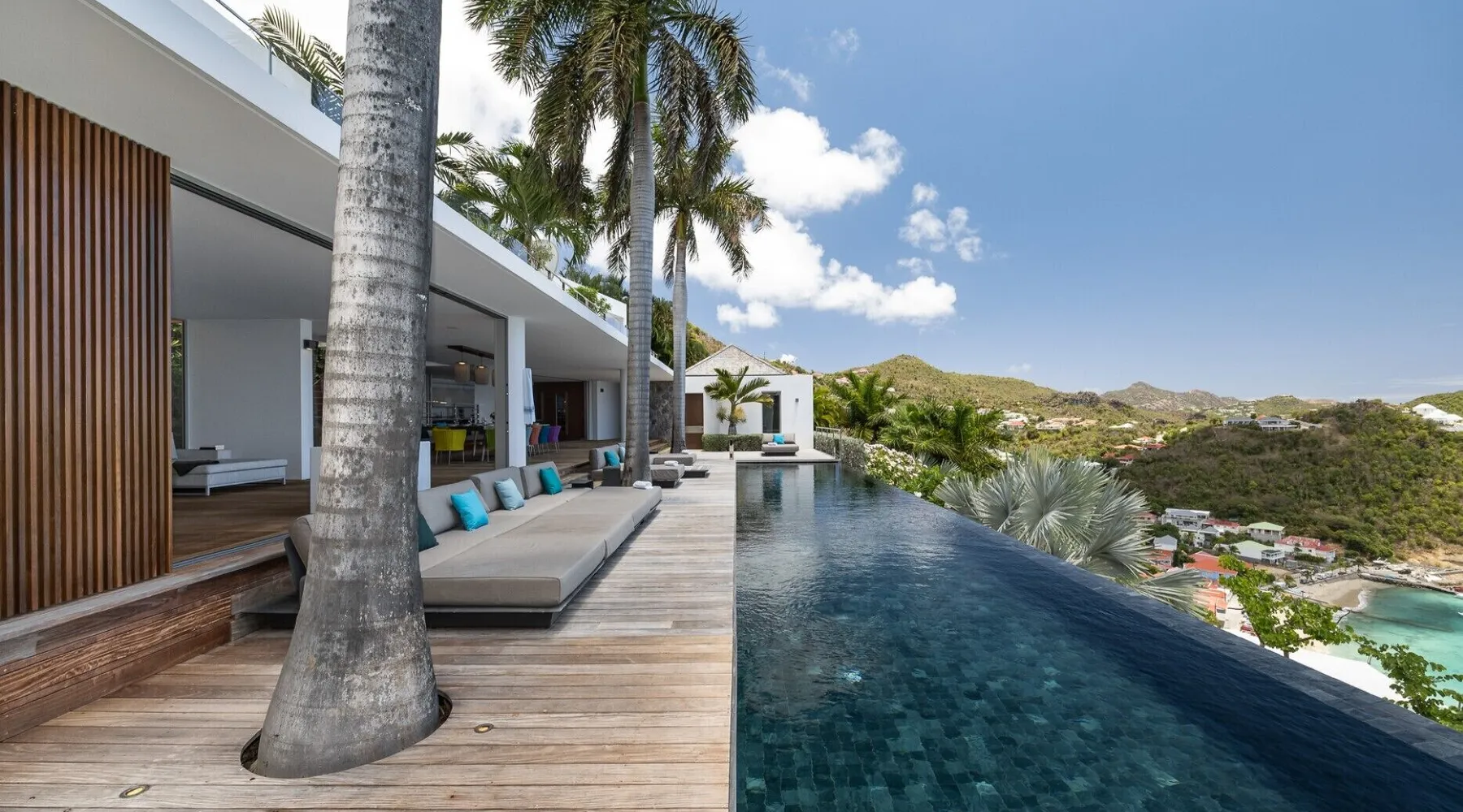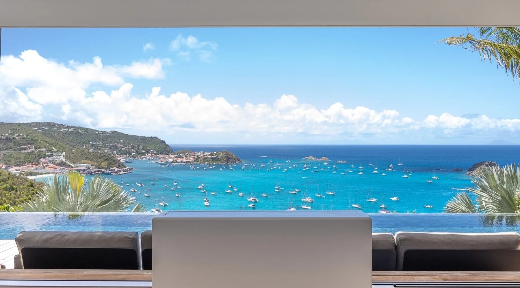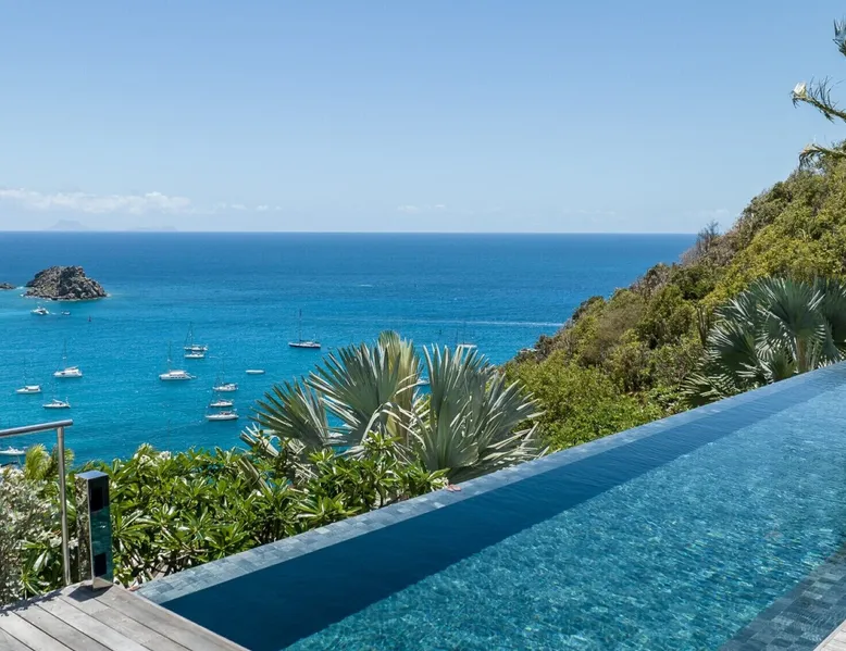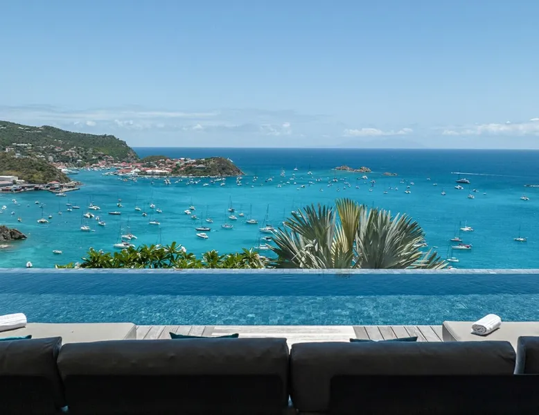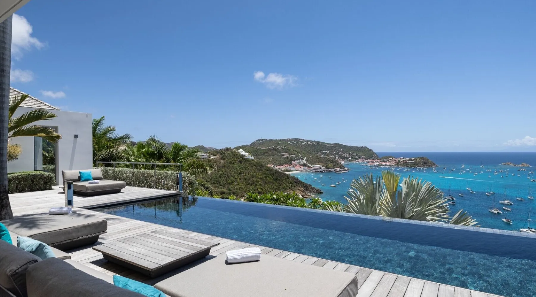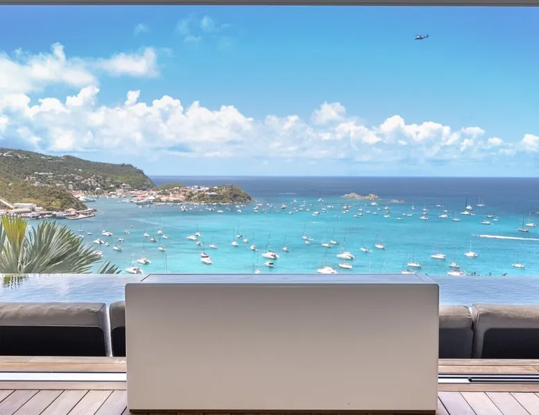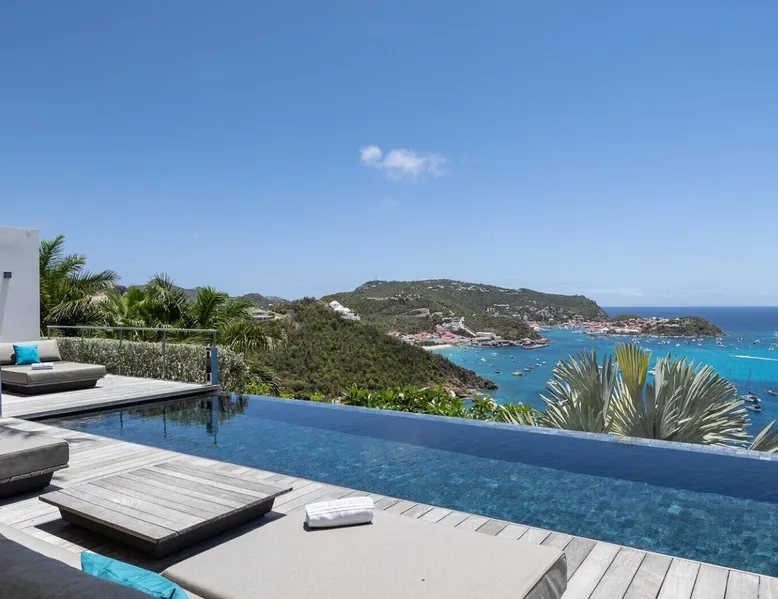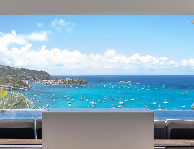 The villa UTOPIC is available for rent in 4 or 5 bedrooms. Perched high above Corossol, Villa UTOPIC is a stunning architectural masterpiece offering one of the most breathtaking panoramic views in St. Barts. Overlooking the turquoise Caribbean Sea and the bustling harbor of Gustavia, this luxury retreat is designed to blend seamlessly with its natural surroundings, providing an unparalleled indoor-outdoor living experience in a setting of absolute tranquility and sophistication. Nestled within lush tropical vegetation, the villa’s expansive terraces capture the essence of island living, where guests can witness the elegant dance of yachts and fishing boats, framed by the vibrant hues of the Caribbean sunset. With its sleek contemporary design, open spaces, and sun-drenched decks, Villa UTOPIC embodies the perfect harmony between modern comfort and natural beauty. At the heart of the villa, the 15-meter infinity pool seems to melt into the horizon, creating an illusion of floating above the sea. Surrounding the pool, a spacious teak deck features plush sunbeds and oversized cushions, inviting guests to lounge in total relaxation. An elegant outdoor dining area, complete with a massive granite table, sets the perfect scene for al fresco dining under the stars, while a shaded pergola offers a cool retreat during the day. Inside, the sophisticated living space exudes effortless luxury, with neutral tones and carefully curated pops of color enhancing the serene ambiance. Floor-to-ceiling glass doors frame the breathtaking ocean views, creating a seamless connection between interior elegance and natural splendor. A private office space allows guests to stay connected when needed, while the state-of-the-art gourmet kitchen is fully equipped for preparing exquisite meals, whether cooked personally or by a private chef for a fine dining experience. The villa’s three elegantly designed bedrooms, located upstairs and accessible via a sleek steel staircase or a private elevator, are sanctuaries of tranquility. Each suite features a king-size bed, an en-suite bathroom, a spacious dressing area, and a private terrace overlooking the infinite blue of the ocean. The rooms are individually decorated, with distinct color themes that add a personal and sophisticated touch. The third bedroom, located on the ground floor, offers a secluded space for guests seeking additional privacy. Designed with families in mind, Villa UTOPIC ensures a safe and luxurious environment for children, making it an ideal retreat for families, couples, or groups of friends. Every element of the villa has been thoughtfully curated to deliver a one-of-a-kind experience, where refined elegance meets the untouched beauty of St. Barts. Just minutes from Gustavia’s vibrant town center, Villa UTOPIC offers the perfect blend of seclusion and accessibility, allowing guests to enjoy world-class dining, designer shopping, and pristine beaches without compromising privacy. Whether seeking a romantic getaway, a family vacation, or an unforgettable escape with friends, Villa UTOPIC promises a truly immersive luxury experience, set against the backdrop of one of the most beautiful panoramic views in St. Barts. Book Villa UTOPIC with Bucket List Villa today and experience the height of luxury, elegance, and breathtaking beauty in St. Barts.