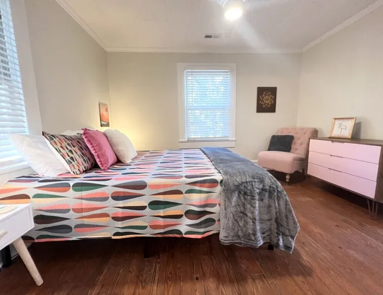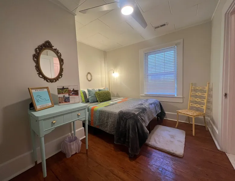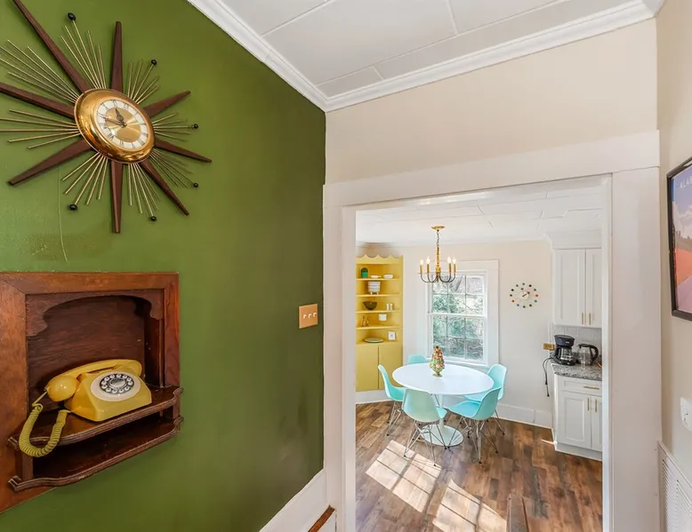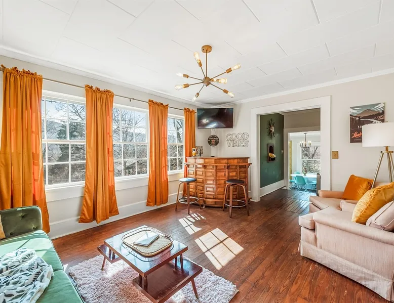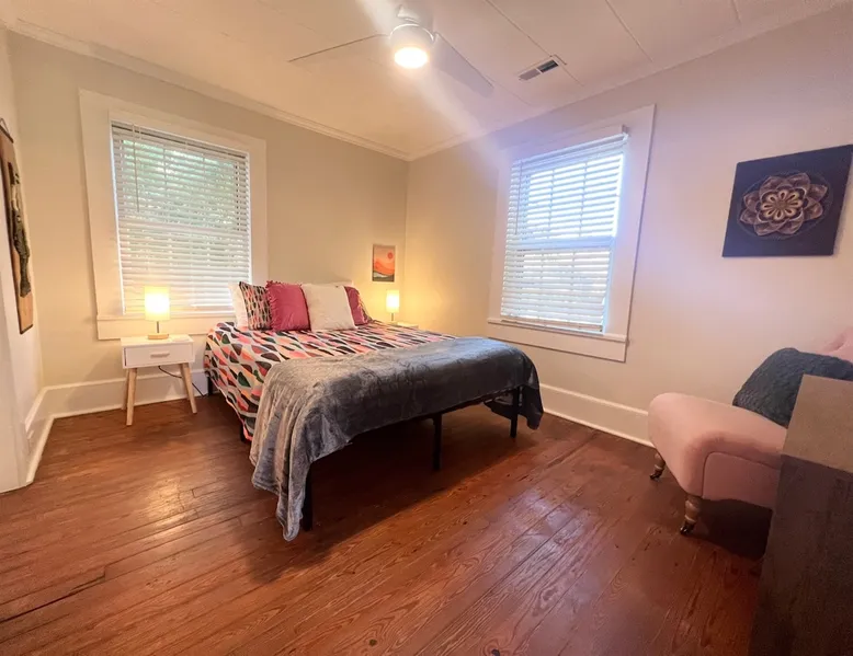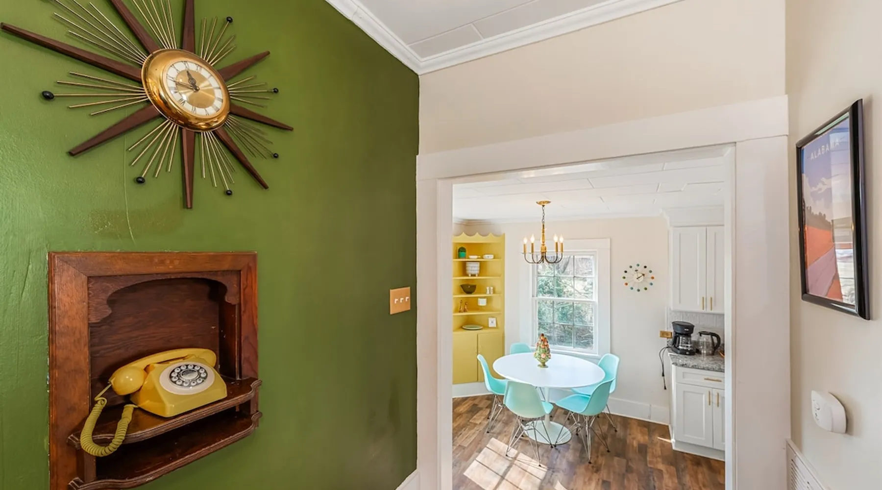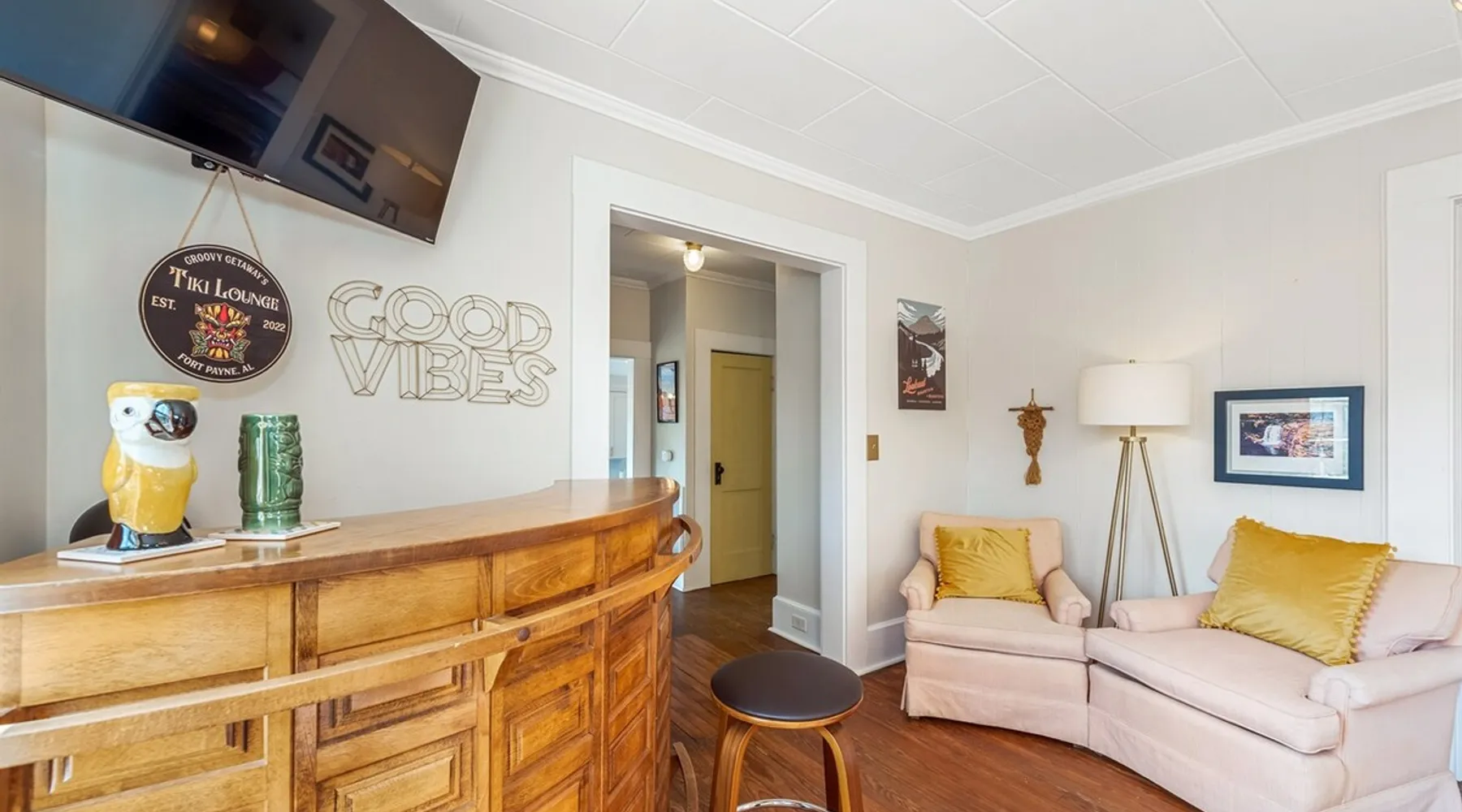 Mid Century Modern Loft | Downtown Fort Payne | Gig Internet Speed & Wi-Fi | 2 Queen Bedrooms | Entertainment and Living Area with “Treehouse” Views | Elegant Kitchen | Laundry Area | Dog Friendly | Sleeps Up to 6 Groovy Getaway Loft is anything but ordinary! A memorable place that’s truly a mid century modern night’s dream in Downtown Fort Payne, Alabama! Built in the 1950s, this loft offers a peaceful retreat in a neighborhood setting of Historic Downtown Fort Payne - centrally located! The space Groovy Getaway Loft | Mid Century Modern Loft | Downtown | Gig Internet Speed & Wi-Fi | Vacation, Corporate and Extended Stays | Entertainment and Living Area with “Treehouse” Views | Elegant Kitchen Laundry Area | Dog Friendly | Hosts up to 6 Guests Groovy Getaway Loft is anything but ordinary! A memorable place that’s truly a mid century modern night’s dream in Downtown Fort Payne, Alabama! Built in the 1950s, this loft offers a peaceful retreat in a neighborhood setting of Historic Downtown Fort Payne - centrally located in the heart of town and walking distance to unique shopping and dining as well as museums, parks and antique malls. Located 8 miles from Little River Canyon National Preserve, you can explore all of the beautiful waterfalls, forests, wildlife, and native plants offered by Lookout Mountain in Alabama! Step back in time - to the 1950s, 60s and 70s as Groovy Getaway Loft is an active part of the retreat property owner’s restoration project of love – be sure to sign their guest book and leave them a note :) The atmosphere is retro and peaceful - full of vibes to go along with concerts and special events or a day of vintage shopping or festivals! There are only GOOD VIBES in Groovy Getaway Loft :) Once you arrive on the property, you will love the groovy murals painted on the garage doors – inspired by sunsets at Lookout Mountain, of course :) This is an excellent location for selfies and group photos! As you enter the bright yellow door in the covered walkway, notice the staircase and railing, beautifully painted with the mid century mod theme the owners love :) Overlooking the staircase is a vintage picture reflecting on Little River Canyon’s mid-century days gone by :) Once you open the blue door, you’ll be standing in the beautiful kitchen and dining area. Granite countertops and brand new stainless appliances reveal the care the owners took to make this an amazing place for their Guests to relax and be refreshed. You will find the kitchen well-equipped with dishes, utensils, pans, dishwasher, microwave, drip coffee maker, electric water kettle, blender, toaster, and cooking spices. Adjoining the kitchen, there is a small laundry area with a washer and dryer available for Guests to use at their convenience. Right off of the kitchen, step up into a foyer area, and you’ll see the living and entertainment area. From the nostalgic lighting to the modern velvet sofa to the authentic chairs designed by Frederick Edward, the mid century mod décor has many of our Guests reflecting on childhood memories. The vintage mid-century bar and stools make for excellent photo prop opportunities. Play a record or two on the record player, play some board games, read a book, or watch TV. There is a 40” Roku HD TV and SUPER FAST Wi-Fi (Gig Internet Speed) for gaming and streaming as you relax after a day of exploring Lookout Mountain. Make sure you checkout the “treehouse” views through the windows :) There are 2 private bedrooms. Each bedroom has a queen size bed with a 10” Dreamer, memory foam mattress and comfy bedding to help every Guest rest well. Antimicrobial encasements are on all mattresses and pillows. In one of the bedrooms, there is a small desk and chair if a designated, private workspace is required. Though Groovy Getaway is ideal for 4 Guests, there is bedding available for up to 2 extra Guests, if needed. The futon sofa in the living area folds out to become a full-size bed. Between the two bedrooms, there is a full bathroom with a shower/tub combo, toilet and pedestal sink. Throughout Groovy Getaway Loft, you’ll enjoy looking at the owners’ vintage finds…and the collection is still growing for this brand new listing :) Groovy Getaway Loft would be perfect for a… - Romantic retreat: Offering unique dining and shopping opportunities! - Remote work retreat: Gig Internet Speed Wi-Fi and central downtown location! - Best friends retreat: Shop-til-you-drop opportunities within walking distance! - Adventure retreat: Explore beautiful waterfalls, forests, wildlife, and native plants offered by Lookout Mountain in Alabama! WHY GUESTS LOVE THIS PEACEFUL RETREAT PROPERTY: 1) It is tastefully decorated with authentic and modern mid-century pieces! 2) It is walking distance to shops, restaurants, parks, and museums! 3) It has “treehouse” views from the entertainment/living area! 4) It has super fast Wi-Fi (Gig Internet Speed)! 5) It is a downtown restoration project for the owners...and that's just groovy! Nearby: .8 miles - The Spot Coffee Shop .8 miles - DeKalb County Courthouse .5 mile - Fort Payne’s City Park .5 mile - Alabama Walking Trail Park 1.5 miles - VFW Fairgrounds .9 miles - Alabama Fan Club & Museum 8.2 miles - Little River Canyon National Preserve 12 miles - Northeast Alabama Agri-Business Center 13 miles - Mentone 8 miles - DeSoto State Park 30 miles - Unclaimed Baggage in Scottsboro, AL 40 miles - Cloudland Canyon State Park, GA 48 miles - Rock City & Ruby Falls 69 miles - Huntsville, AL You will want a car to see the sites and experience why Lookout Mountain in Alabama has so much to offer guests for a perfect vacation experience! You will be given access to a list of favorite attractions and restaurants! Waterfalls, national preserve, state parks, zip lining, hiking, picnicking, rappelling, horseback trail rides, canoeing, kayaking, rock climbing, wild animal preserve, golfing, swimming, museums, glass blowing, making pot