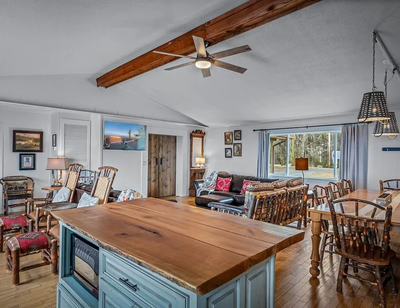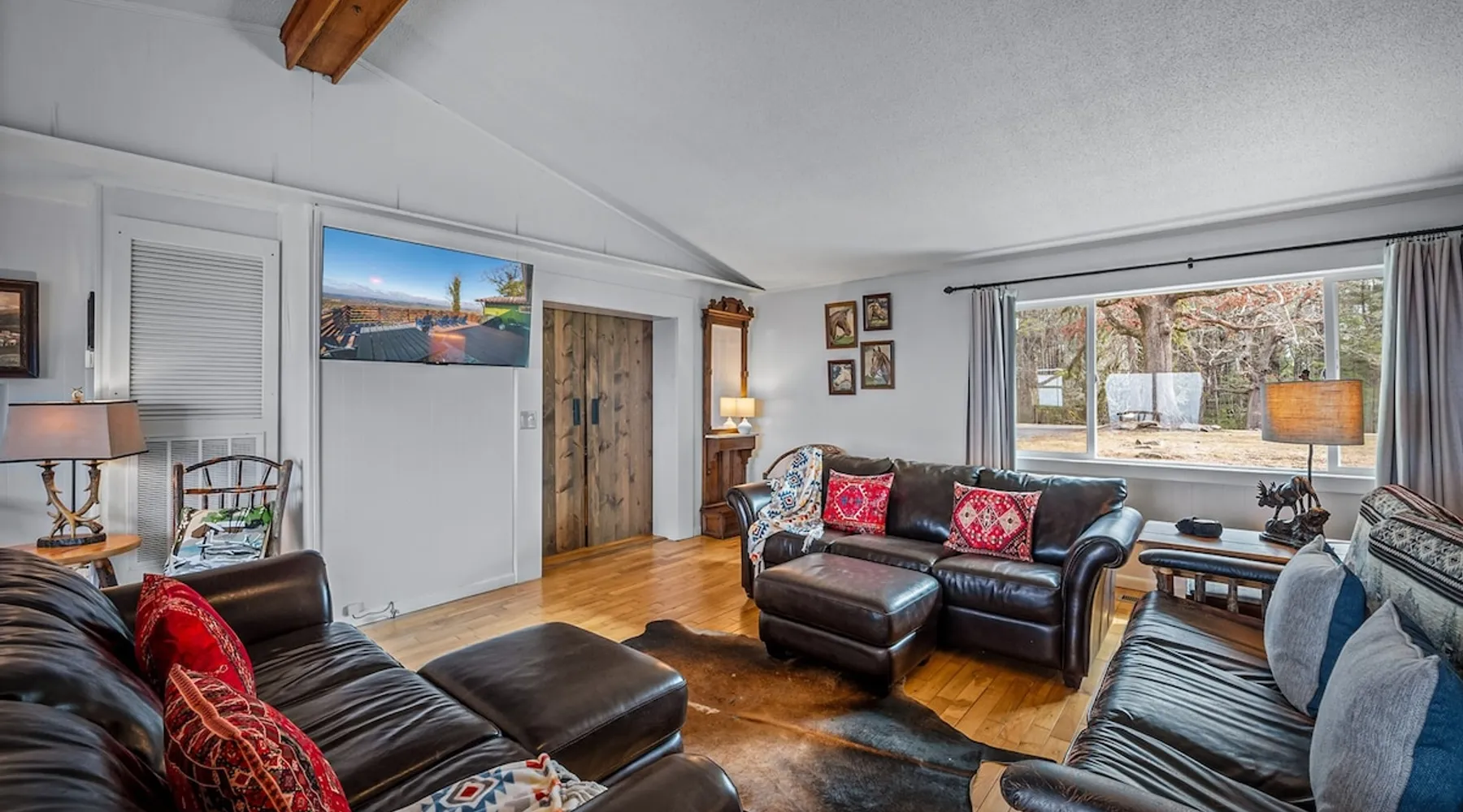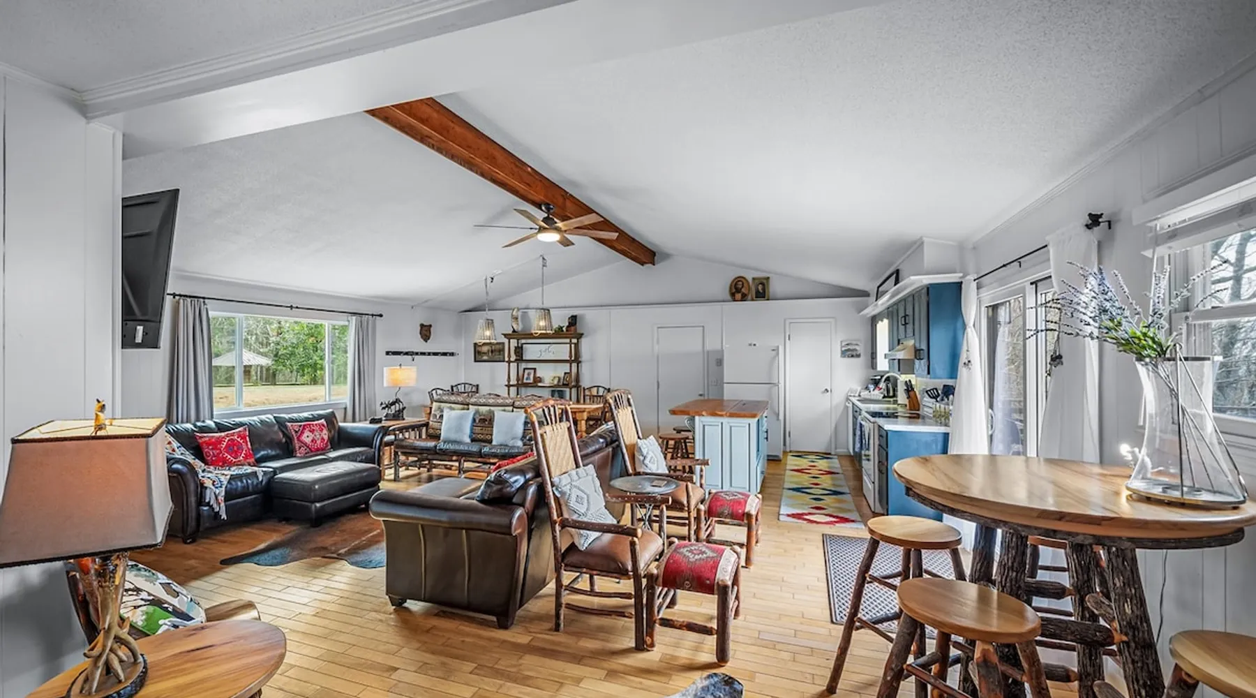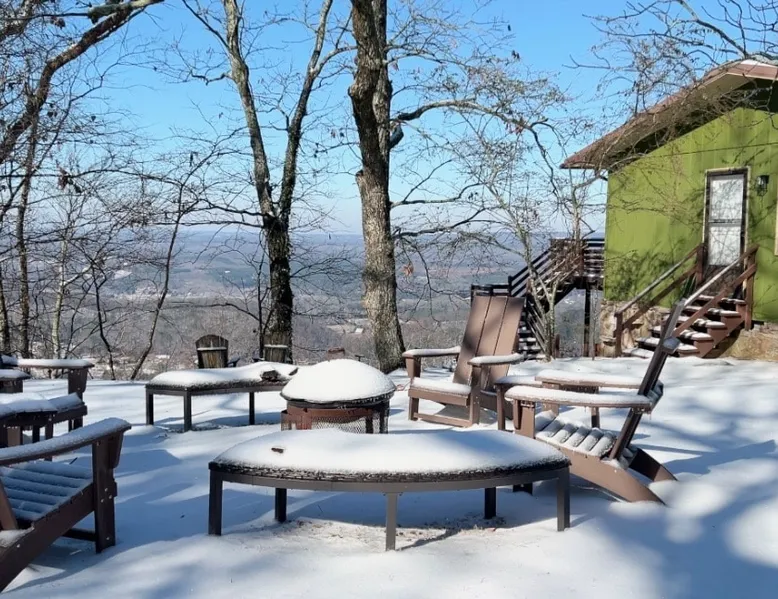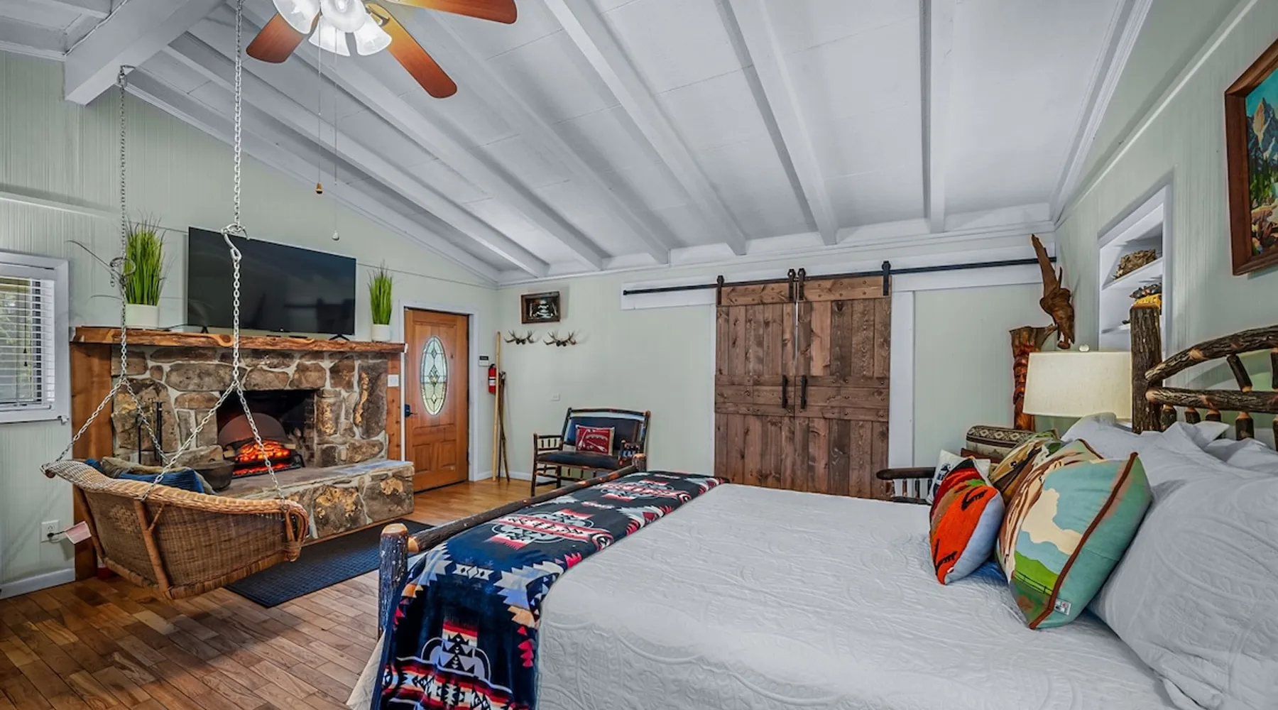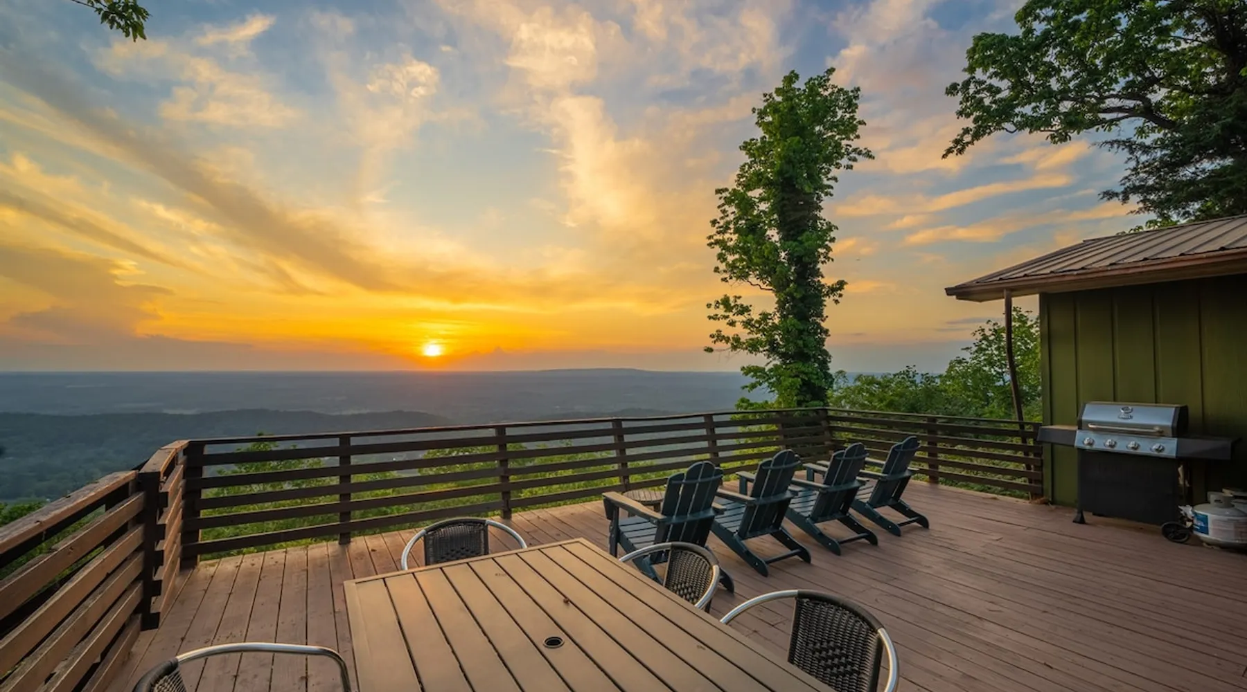 Talking Leaves Cottage is a uniquely-designed, one-level home with a no-stairs entrance that provides a peaceful retreat perched on the brow of Lookout Mountain. With breathtaking sunset views and effortless access, the home's spacious living, dining and deck areas offer the perfect family gathering spaces. Three family rooms, with multiple beds in each room, invite rest and relaxation at the end of each day. Explore waterfalls, parks, shops, and restaurants. Renew, refresh, and be restored! The space Mentone, AL | Talking Leaves Cottage | Scenic Highway | Spacious Deck Overlooking Brow | No-Stairs Entrance | Fire Pit | Fast Wi-Fi | 4 Roku TVs | BBQ Grill | 3 Family Rooms | 2 Bathrooms | Electric Log Fireplace | Front Porch with Rocking Chairs | Dog Friendly | Hosts up to 9 Guests Talking Leaves Cottage, perched on the brow of Lookout Mountain in Alabama and situated on Scenic Highway in Mentone, was built in 1955 and is a uniquely-designed, spacious one-level home. There is a no-stairs front entrance into one of the family bedrooms, so this home offers effortless access to breathtaking brow views. The spacious living, dining and deck areas offer the perfect family gathering spaces, and the three large family rooms, with multiple beds and a large Roku TV in each room, invite rest and relaxation at the end of each day. Talking Leaves Cottage is decorated with a collection of vintage art and antiques. The homeowners' love for history and art is evident throughout the home. Even the story of the "talking leaves" is in honor of Sequoyah, a Cherokee man who invented a written language for his people in the early 1800s. Sequoyah called his words on paper, "talking leaves." Explore waterfalls, parks, shops, and restaurants nearby. Enjoy al fresco dining on the spacious deck as you take in the beautiful sunsets. Relax by the fire pit or on the front covered patio with your morning cup of coffee or hot tea. Wildlife is spotted frequently on the property. Renew, refresh, and be restored! **THE RETREAT PROPERTY** When you turn into the shared graveled driveway, you will see Talking Leaves Cottage on the right, along with your own private parking area near the home (3 cars max). There is a patio area and covered front porch with rocking chairs. This outdoor seating area is an excellent place to unwind at the end of a day full of adventures or enjoy a cup of coffee or hot tea in the morning. Stepping inside the front door, you will love the no-stairs entrance, welcoming you to all that this peaceful retreat offers. The front entrance leads you directly into the Fireside Lodge Family Bedroom. In this room, you're greeted by a large stone fireplace with electric logs, and there is a swing-for-two next to the fireplace that makes this room even more unique and a favorite among guests :) There is a queen bed, and nearby there is a twin bed/reading nook. A 55" Roku TV is above the fireplace mantle for movie nights and streaming your own favorite channel subscriptions. Large sliding barn doors separate this front bedroom from the main living area, and there is also an entrance into the laundry room from this bedroom. In the main living area, there is plenty of lounge seating for up to 9 guests with 3 sofas. There is a 55" Roku TV on the wall for family movie nights, and a large farmhouse-style dining table for gathering. The best feature in this area is the mountain brow view through the sliding glass doors. Nearby, there is the well-equipped kitchen area with an island for meal preparations and a pantry. In the kitchen, there is a refrigerator, stove, microwave, dishwasher, coffee maker, electric water kettle, toaster, blender, cooking pots, can opener, pans and utensils, dishes, drinking glasses, wine glasses, eating utensils, cooking spices, coffee mugs, and more. Between the kitchen and the dining area, there is a door leading to The Patriot Family Bedroom. In this room, there is a queen bed, twin bed and a 43" smart TV in the corner for movie nights and streaming your own favorite channel subscriptions. There is an en suite bathroom with a tub/shower combo and toilet, and next to the bathroom is a larger vanity with sink as seen in photos. Back through the living area, there is an entrance into The Aristopup Family Bedroom. Named for the art in the room, this family room has a large king bed and twin bed. There is a 43" Roku TV on the wall for movie nights and streaming your own favorite channel subscriptions. There is also an en suite bathroom with a walk-in shower, toilet and double sink vanity. Through the sliding glass doors in the living area, there are no stairs required to step out on the back deck that overlooks the brow. The sunset views here are captivating, and there are lounging chairs to take in the views. There is also an outdoor dining table and chairs for al fresco dining, as well as a high-top table and 2 chairs. A propane BBQ grill is located nearby, and grilling utensils are located in a kitchen drawer. Back outside, there is a fire pit with comfortable seating area as seen in photos. You are welcomed to use any small pieces of fallen wood on the property that can safely fit inside the fire pit, and the homeowner has a stack of firewood near the front porch, and you are welcome to use some for your stay also. Please only burn firewood, as the homeowners and guests roast food over this fire pit. Extendable roasters are located in the kitchen for your convenience, so be sure to bring ingredients for s'more memories :) WHY GUESTS LOVE THIS PEACEFUL RETREAT PROPERTY: 1) It is situated on the brow with fantastic views! 2) It has a no-stairs front entrance, providing effortless access to the amazing views! 3) It has three spacious family rooms with multiple beds and a large TV in each room! 4) It has a fire pit area with brow views and comfortable seating! 5) It has spacious dining and living areas for gathering! **EXPLORE THE AREA** 2.1 miles - DeSoto Falls 3.0 miles - The Hatter Cafe in