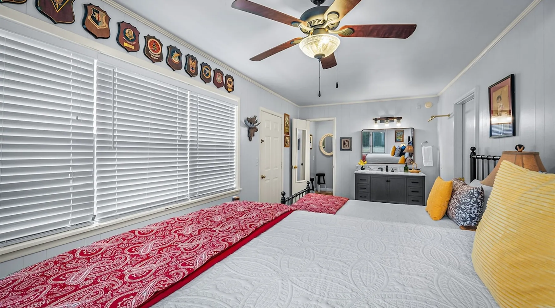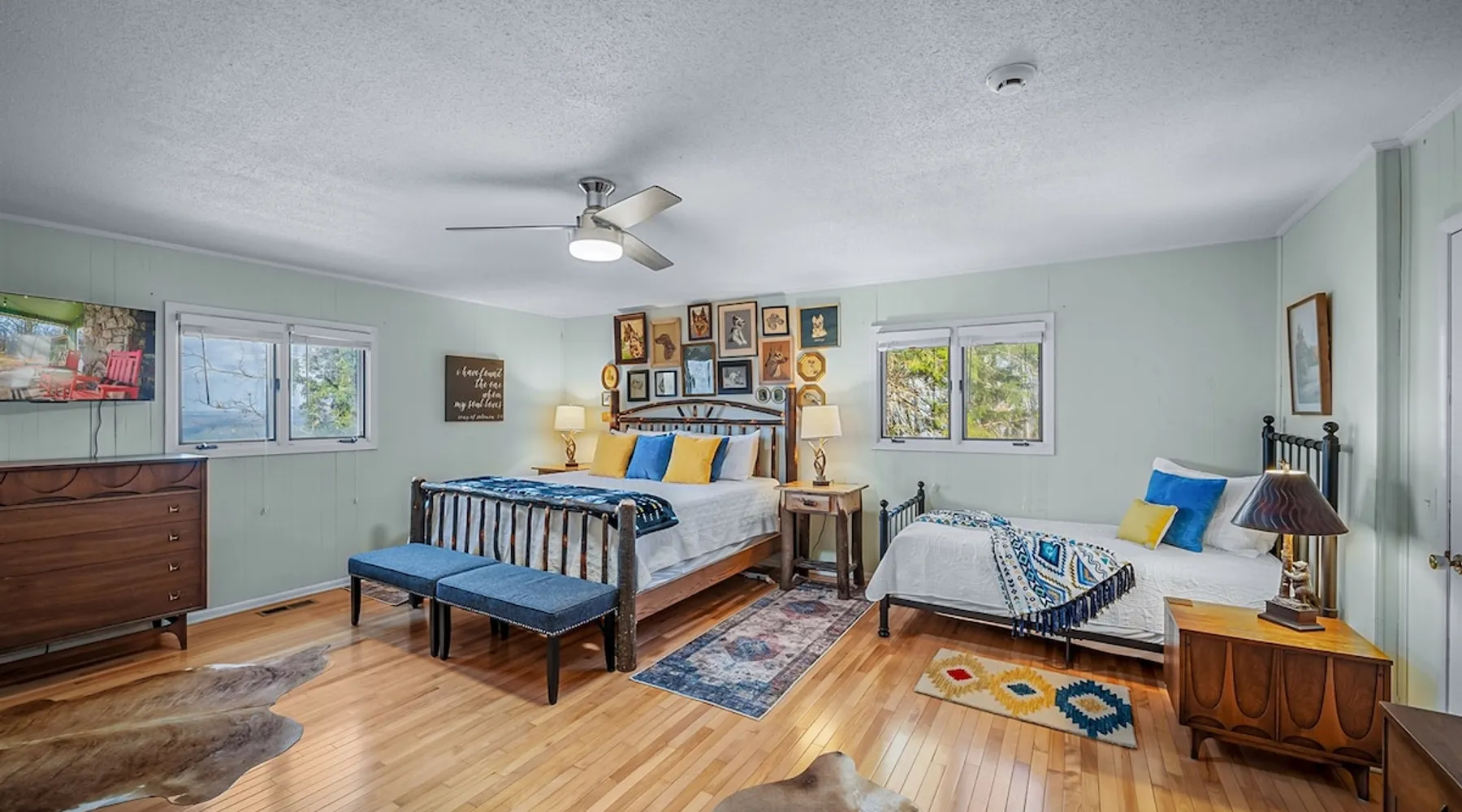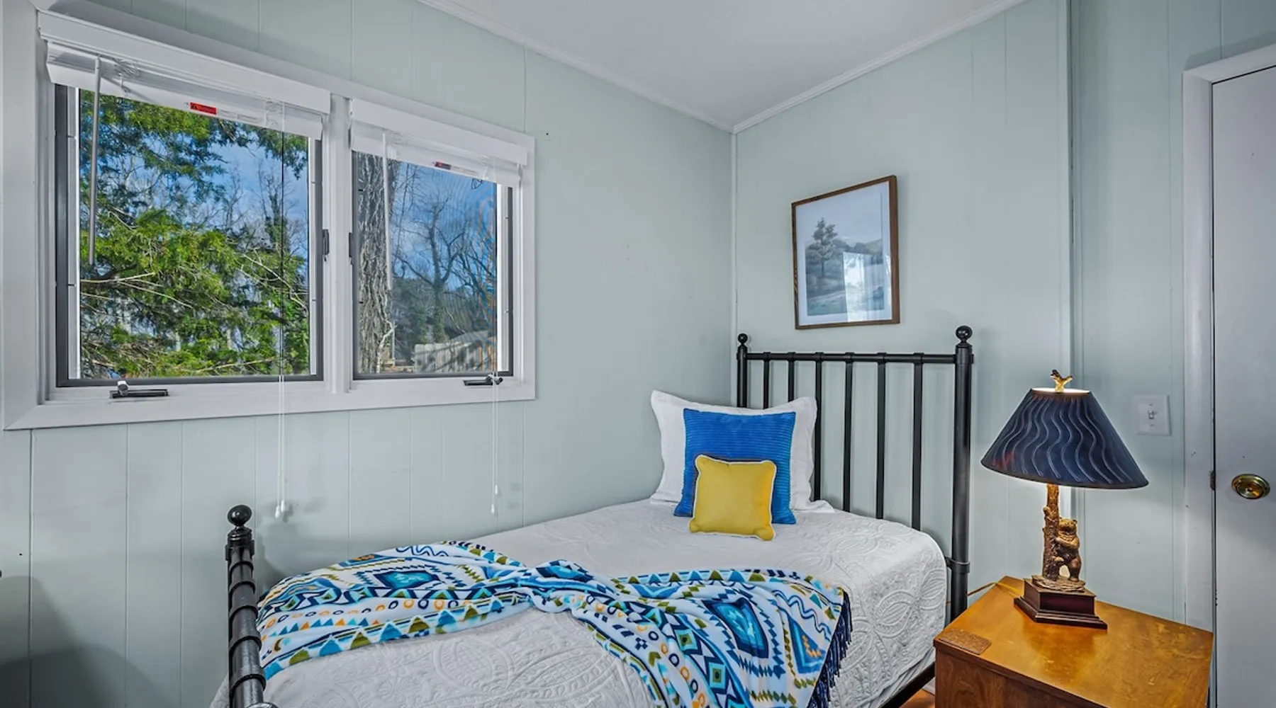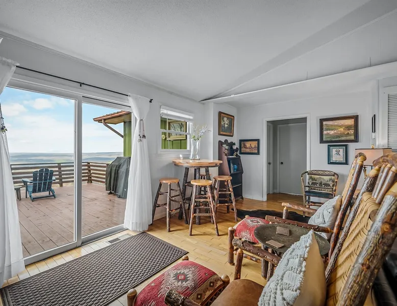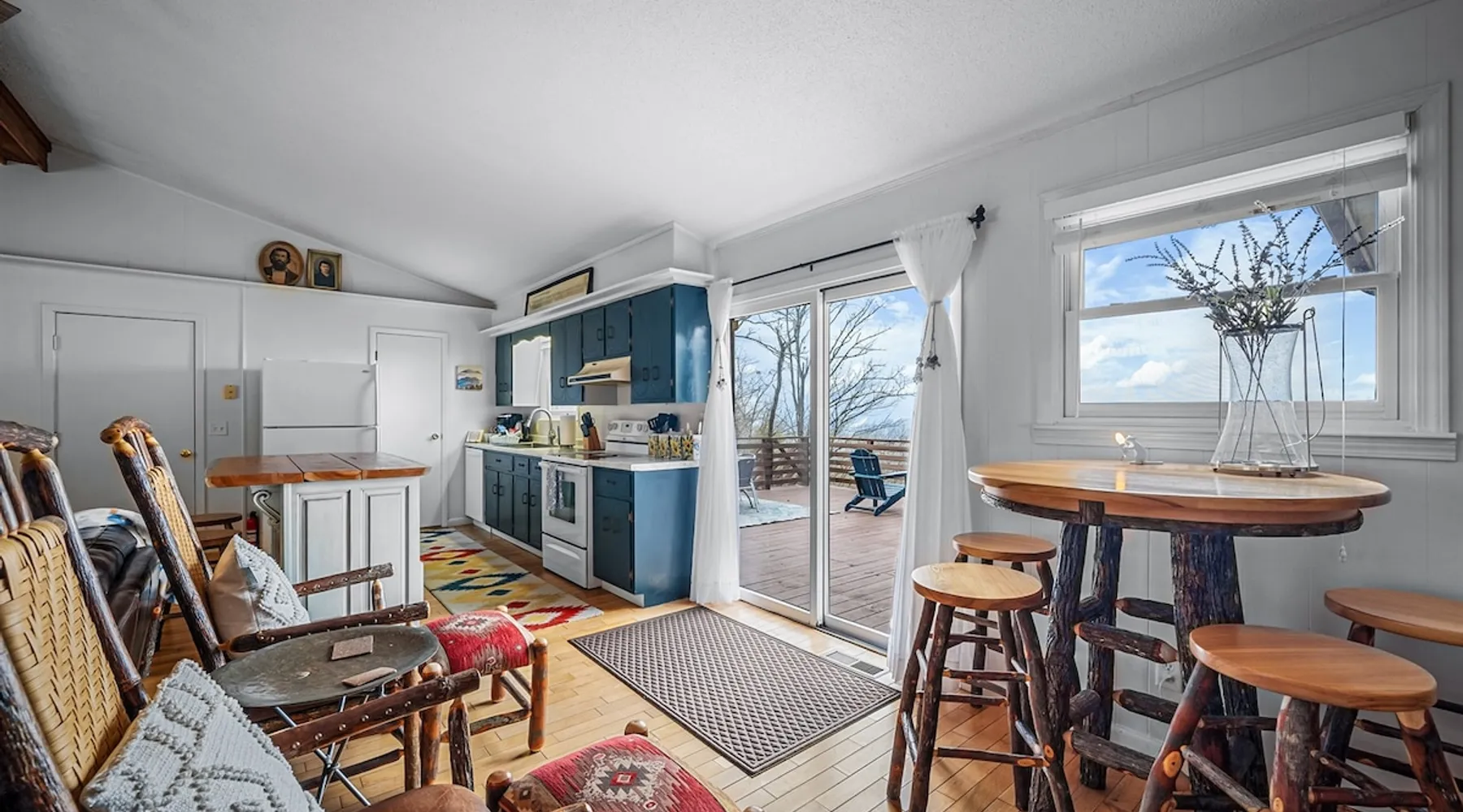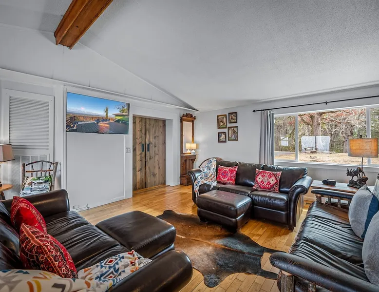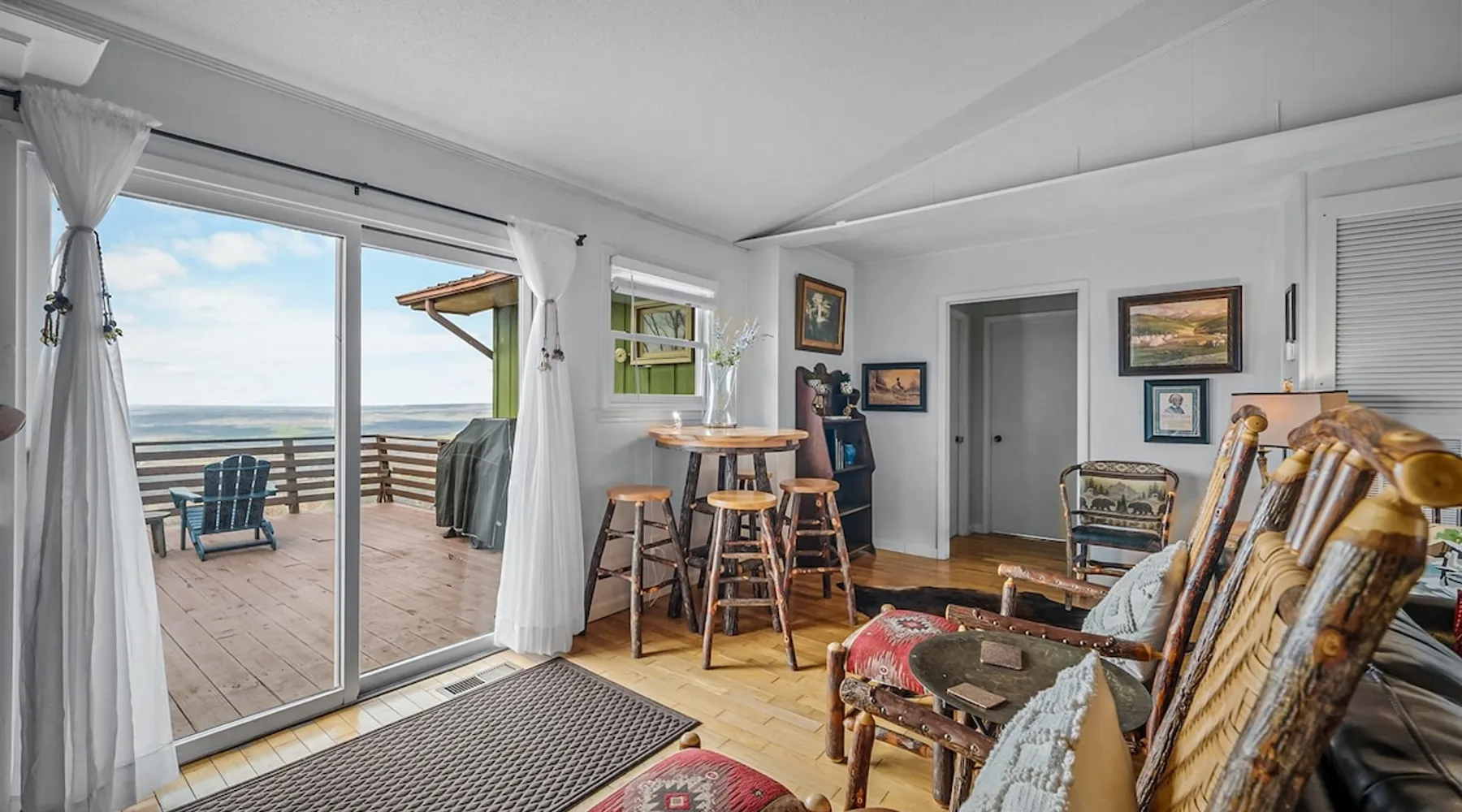 Talking Leaves Cottage is a uniquely-designed, one-level home with a no-stairs entrance that provides a peaceful retreat perched on the brow of Lookout Mountain. With breathtaking sunset views and effortless access, the home's spacious living, dining and deck areas offer the perfect family gathering spaces. Three family rooms, with multiple beds in each room, invite rest and relaxation at the end of each day. Explore waterfalls, parks, shops, and restaurants. Renew, refresh, and be restored! The space Mentone, AL | Talking Leaves Cottage | Scenic Highway | Spacious Deck Overlooking Brow | No-Stairs Entrance | Fire Pit | Fast Wi-Fi | 4 Roku TVs | BBQ Grill | 3 Family Rooms | 2 Bathrooms | Electric Log Fireplace | Front Porch with Rocking Chairs | Dog Friendly | Hosts up to 9 Guests Talking Leaves Cottage, perched on the brow of Lookout Mountain in Alabama and situated on Scenic Highway in Mentone, was built in 1955 and is a uniquely-designed, spacious one-level home. There is a no-stairs front entrance into one of the family bedrooms, so this home offers effortless access to breathtaking brow views. The spacious living, dining and deck areas offer the perfect family gathering spaces, and the three large family rooms, with multiple beds and a large Roku TV in each room, invite rest and relaxation at the end of each day. Talking Leaves Cottage is decorated with a collection of vintage art and antiques. The homeowners' love for history and art is evident throughout the home. Even the story of the "talking leaves" is in honor of Sequoyah, a Cherokee man who invented a written language for his people in the early 1800s. Sequoyah called his words on paper, "talking leaves." Explore waterfalls, parks, shops, and restaurants nearby. Enjoy al fresco dining on the spacious deck as you take in the beautiful sunsets. Relax by the fire pit or on the front covered patio with your morning cup of coffee or hot tea. Wildlife is spotted frequently on the property. Renew, refresh, and be restored! **THE RETREAT PROPERTY** When you turn into the shared graveled driveway, you will see Talking Leaves Cottage on the right, along with your own private parking area near the home (3 cars max). There is a patio area and covered front porch with rocking chairs. This outdoor seating area is an excellent place to unwind at the end of a day full of adventures or enjoy a cup of coffee or hot tea in the morning. Stepping inside the front door, you will love the no-stairs entrance, welcoming you to all that this peaceful retreat offers. The front entrance leads you directly into the Fireside Lodge Family Bedroom. In this room, you're greeted by a large stone fireplace with electric logs, and there is a swing-for-two next to the fireplace that makes this room even more unique and a favorite among guests :) There is a queen bed, and nearby there is a twin bed/reading nook. A 55" Roku TV is above the fireplace mantle for movie nights and streaming your own favorite channel subscriptions. Large sliding barn doors separate this front bedroom from the main living area, and there is also an entrance into the laundry room from this bedroom. In the main living area, there is plenty of lounge seating for up to 9 guests with 3 sofas. There is a 55" Roku TV on the wall for family movie nights, and a large farmhouse-style dining table for gathering. The best feature in this area is the mountain brow view through the sliding glass doors. Nearby, there is the well-equipped kitchen area with an island for meal preparations and a pantry. In the kitchen, there is a refrigerator, stove, microwave, dishwasher, coffee maker, electric water kettle, toaster, blender, cooking pots, can opener, pans and utensils, dishes, drinking glasses, wine glasses, eating utensils, cooking spices, coffee mugs, and more. Between the kitchen and the dining area, there is a door leading to The Patriot Family Bedroom. In this room, there is a queen bed, twin bed and a 43" smart TV in the corner for movie nights and streaming your own favorite channel subscriptions. There is an en suite bathroom with a tub/shower combo and toilet, and next to the bathroom is a larger vanity with sink as seen in photos. Back through the living area, there is an entrance into The Aristopup Family Bedroom. Named for the art in the room, this family room has a large king bed and twin bed. There is a 43" Roku TV on the wall for movie nights and streaming your own favorite channel subscriptions. There is also an en suite bathroom with a walk-in shower, toilet and double sink vanity. Through the sliding glass doors in the living area, there are no stairs required to step out on the back deck that overlooks the brow. The sunset views here are captivating, and there are lounging chairs to take in the views. There is also an outdoor dining table and chairs for al fresco dining, as well as a high-top table and 2 chairs. A propane BBQ grill is located nearby, and grilling utensils are located in a kitchen drawer. Back outside, there is a fire pit with comfortable seating area as seen in photos. You are welcomed to use any small pieces of fallen wood on the property that can safely fit inside the fire pit, and the homeowner has a stack of firewood near the front porch, and you are welcome to use some for your stay also. Please only burn firewood, as the homeowners and guests roast food over this fire pit. Extendable roasters are located in the kitchen for your convenience, so be sure to bring ingredients for s'more memories :) WHY GUESTS LOVE THIS PEACEFUL RETREAT PROPERTY: 1) It is situated on the brow with fantastic views! 2) It has a no-stairs front entrance, providing effortless access to the amazing views! 3) It has three spacious family rooms with multiple beds and a large TV in each room! 4) It has a fire pit area with brow views and comfortable seating! 5) It has spacious dining and living areas for gathering! **EXPLORE THE AREA** 2.1 miles - DeSoto Falls 3.0 miles - The Hatter Cafe in
