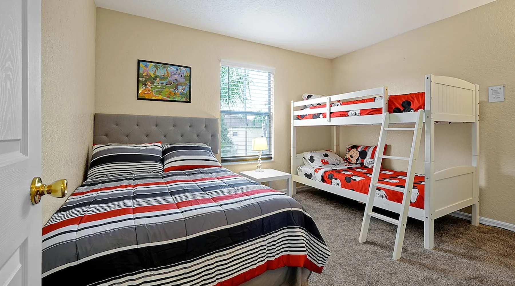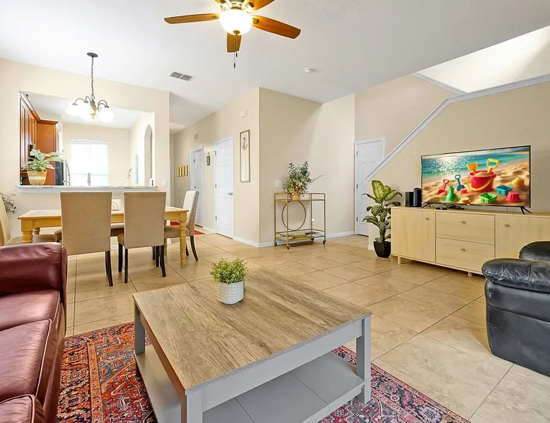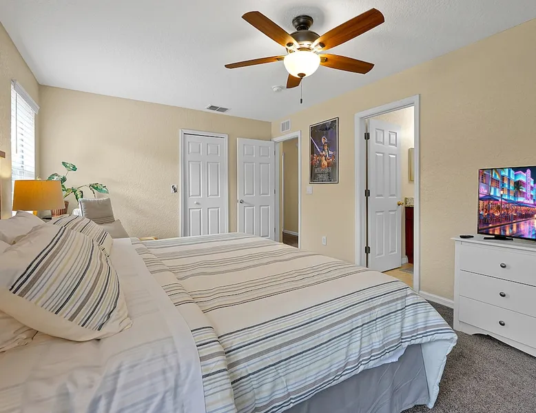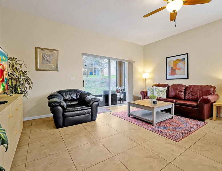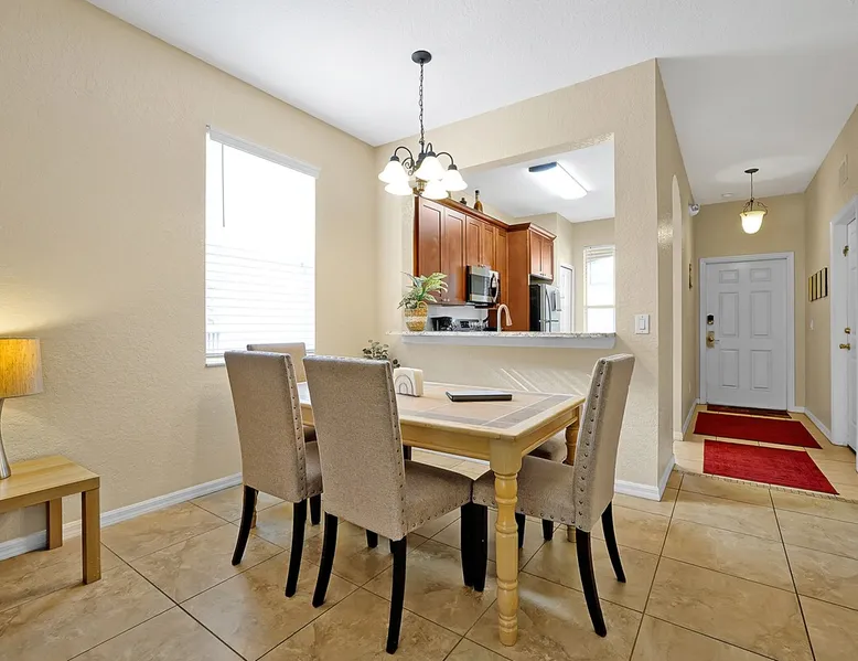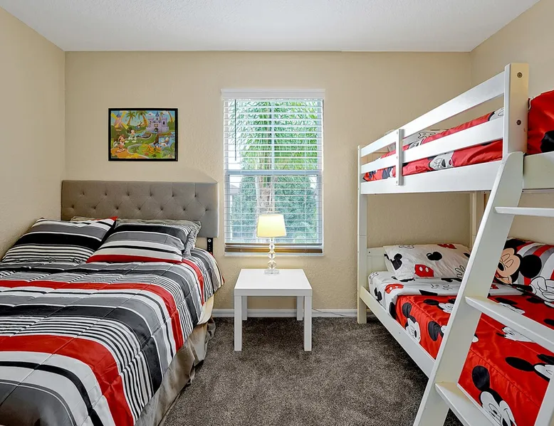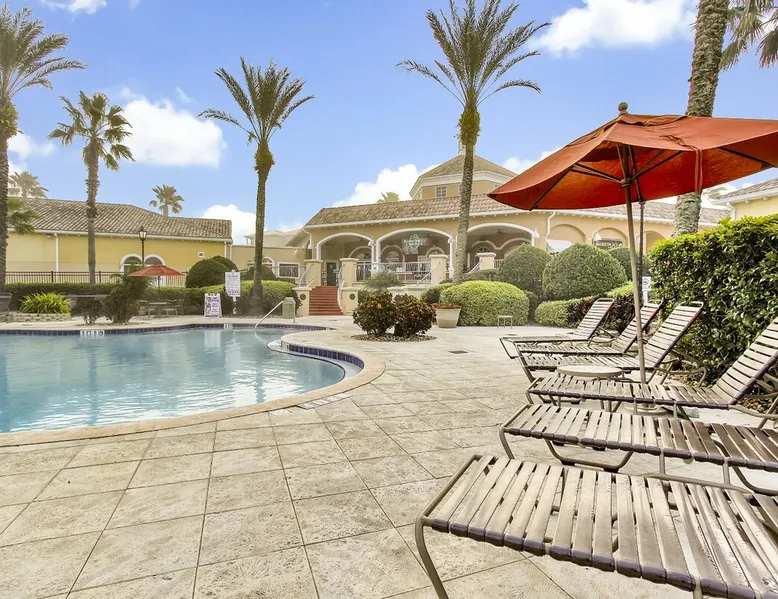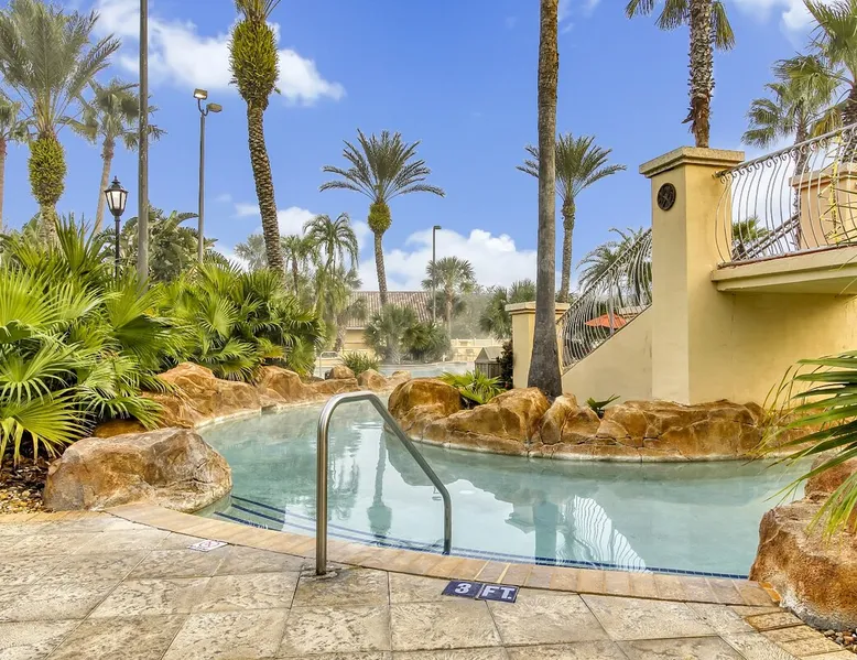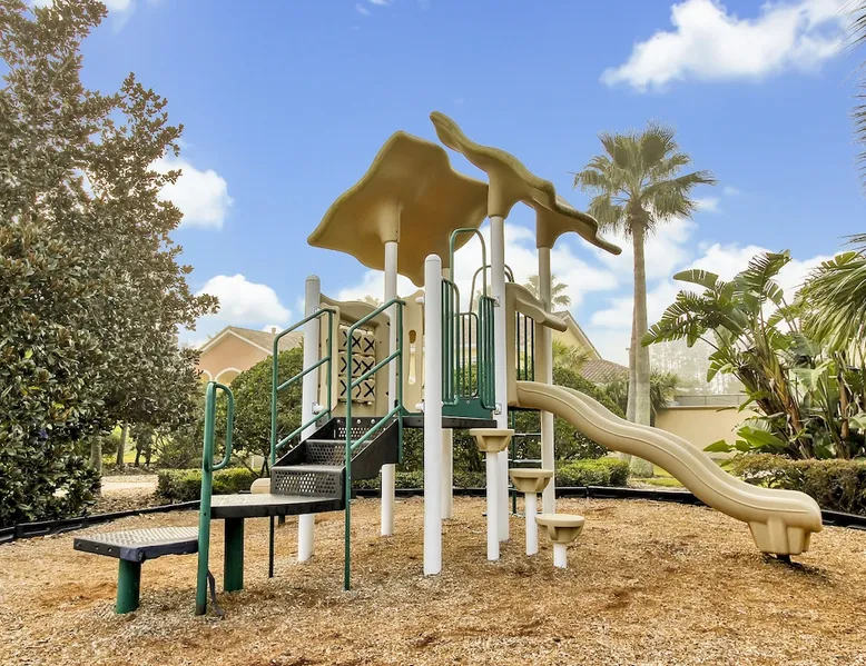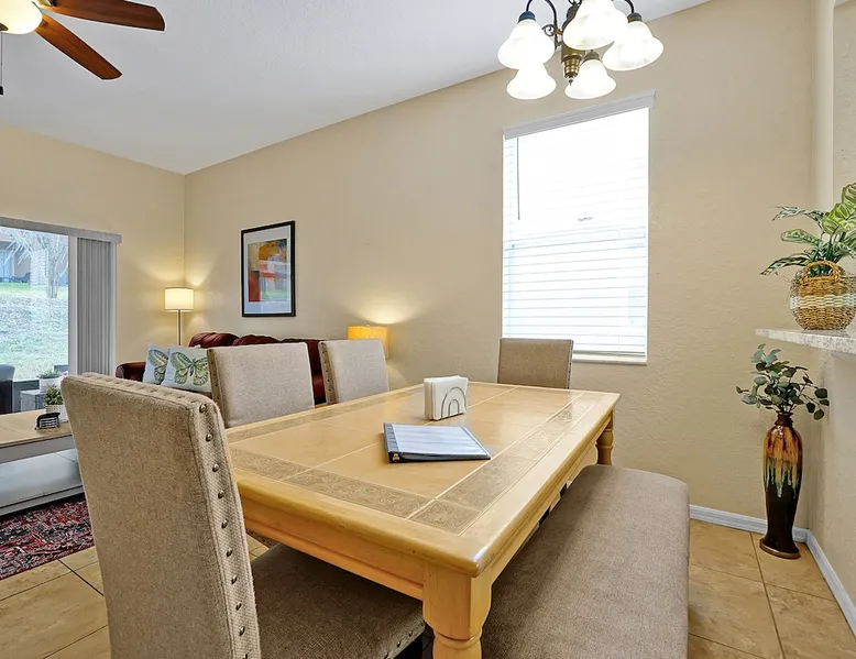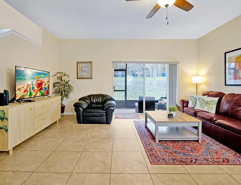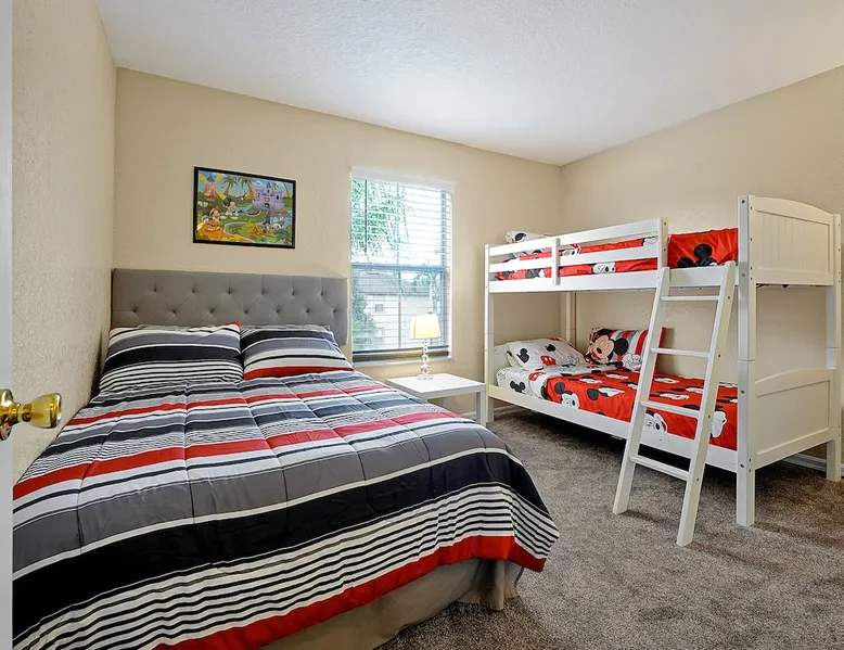 Regal Palms Resort with heated pool, lazy river, water slide, spa, gym, arcade, and on-site bar and restaurant. Just 25 minutes to Disney. Home includes fully equipped kitchen, balcony seating, spacious living areas, and ensuite bedrooms. Ideal for a comfortable family stay. The space BEDROOMS This 3-bedroom, 3-bathroom home in Regal Palms Resort is perfect for a relaxing family getaway. Enjoy access to a heated pool, lazy river, water slide, spa, gym, arcade, and on-site dining. The home features a fully equipped kitchen, balcony seating, and spacious living areas. Bedroom 1: King bed with ensuite (2nd floor) Bedroom 2: Queen bed (2nd floor) Bedroom 3: One full bed and a twin-over-twin bunk bed (2nd floor) KITCHEN, LOUNGE & DINING The living room offers a cozy and open space, with comfortable seating and direct access to the patio through sliding glass doors, allowing for natural light to brighten the area. The dining area is set just behind the living room, furnished with a simple yet functional table for shared meals. The kitchen is equipped with stainless steel appliances and granite countertops, providing a practical layout for daily cooking and basic meal prep. EXTERIOR This unit features two small outdoor seating areas—one fully screened for extra comfort and the other just outside the entrance. Both include cushioned chairs and offer a simple, cozy spot to relax with a garden view. UTILITIES This property includes essential utilities such as air conditioning, heating, and hot water for your comfort. The kitchen is fully equipped with stove, oven, dishwasher, and small appliances. Laundry facilities, Wi-Fi, and safety features like smoke and carbon monoxide detectors are provided. Security cameras and a smart lock offer added peace of mind. SECURITY For your safety, there’s a security camera at the front door monitoring the exterior. The home includes a smoke detector, carbon monoxide detector, fire extinguisher, and first aid kit. Your peace of mind is important to us. COMMUNITY DESCRIPTION Regal Palms Resort offers townhome-style accommodations with a wide array of family-friendly amenities. The highlight is a large pool area featuring a lazy river, waterslide, and hot tub. A full-service clubhouse includes a restaurant, fitness center, spa, and arcade. RESORT AMENITIES • Lazy river and waterslide • Zero-entry pool and hot tub • Clubhouse with restaurant and bar • Spa and fitness center • Game room • Playground DISTANCE TO NEARBY ATTRACTIONS • Walt Disney World Resort (20 min) – 13 miles • Universal Orlando Resort (35 min) – 26 miles • SeaWorld Orlando (30 min) – 22 miles • Disney Springs (25 min) – 16 miles • ChampionsGate Golf Club (10 min) – 5 miles • Posner Park (12 min) – 6 miles • LEGOLAND Florida (40 min) – 29 miles • Orlando Vineland Premium Outlets (30 min) – 20 miles • Old Town Kissimmee (20 min) – 14 miles • Lake Louisa State Park (30 min) – 21 miles EXTRA FEES Pet Fee: $100 / pet (However, due to severe allergies, cats are not allowed) Resort fee: $22 / day Create lifelong memories at this relaxing retreat, complete with resort-style amenities and close proximity to Orlando’s best attractions. Book your stay today and enjoy the perfect mix of relaxation and adventure! Guest access Upon your arrival, head to the clubhouse to check-in. There, you'll pay a $22 per day resort fee for your party—not per person. You'll also register your vehicle to receive a hanging tag and collect wristbands for your group. These wristbands grant access through the Sand Mine Rd. guard gate. After you've passed through, simply take a right to arrive at your townhome. Other things to note Additional Details: Pet-Friendly: Dogs welcome for $100/pet (no cats due to allergies). Christmas Tree Rental: Available for $200 (7ft tree). Pool Heating: Available through the resort for an additional fee. Starter amenities provided for your convenience, including toiletries and kitchen essentials. Enjoy the resort amenities for a $22 per day resort fee for your party