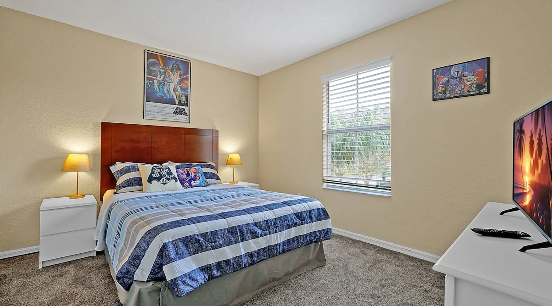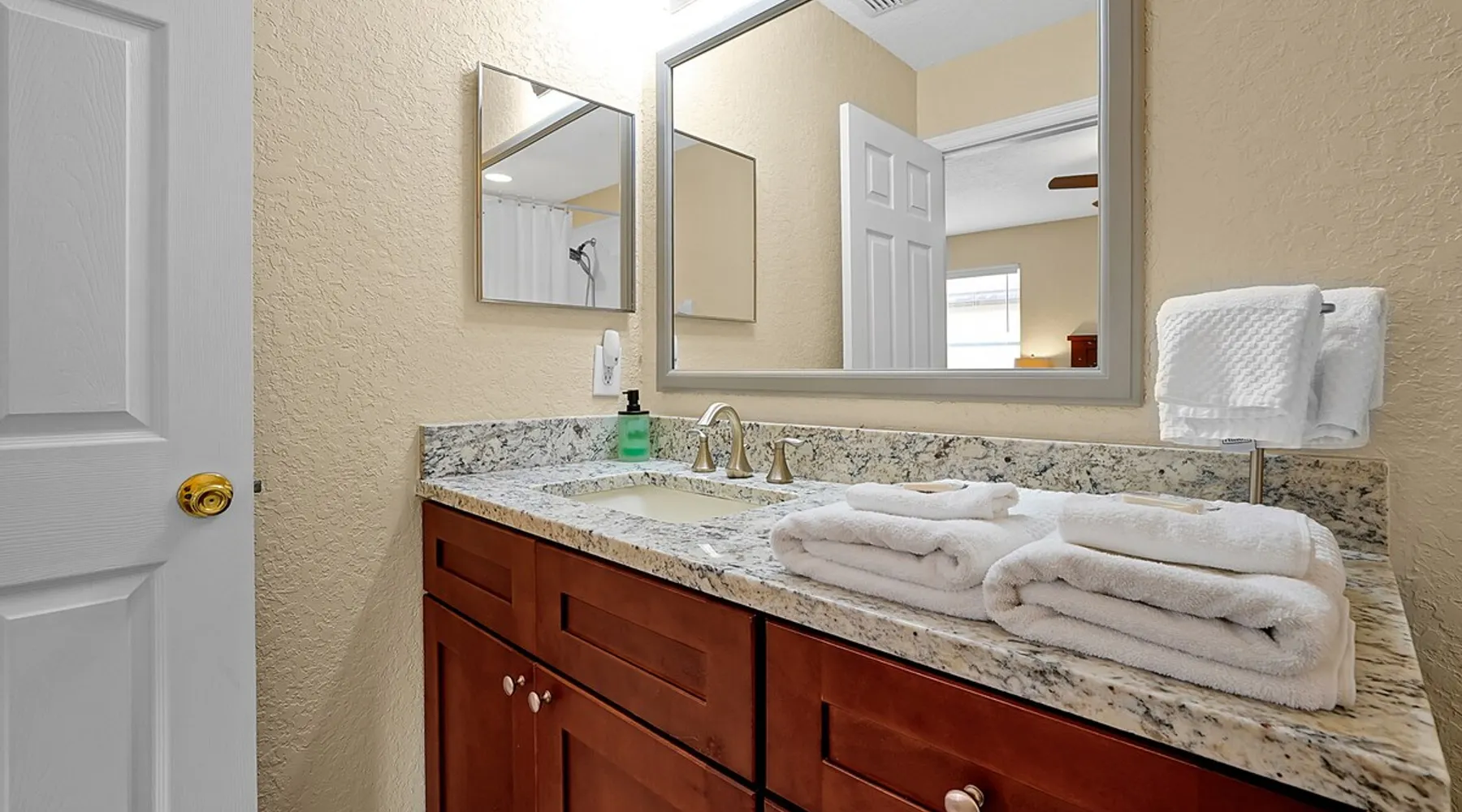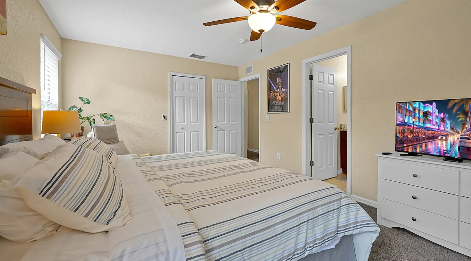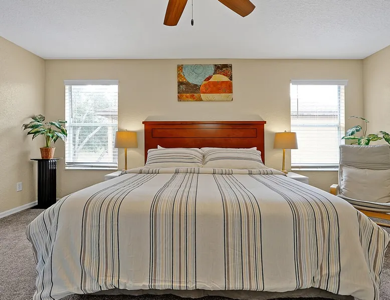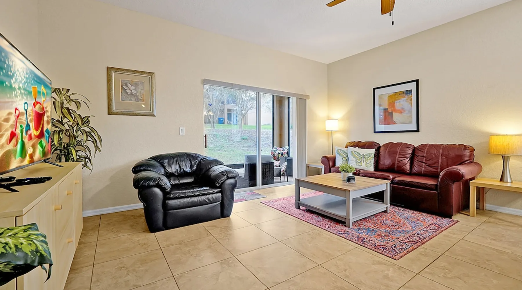 Regal Palms Resort with heated pool, lazy river, water slide, spa, gym, arcade, and on-site bar and restaurant. Just 25 minutes to Disney. Home includes fully equipped kitchen, balcony seating, spacious living areas, and ensuite bedrooms. Ideal for a comfortable family stay. The space BEDROOMS This 3-bedroom, 3-bathroom home in Regal Palms Resort is perfect for a relaxing family getaway. Enjoy access to a heated pool, lazy river, water slide, spa, gym, arcade, and on-site dining. The home features a fully equipped kitchen, balcony seating, and spacious living areas. Bedroom 1: King bed with ensuite (2nd floor) Bedroom 2: Queen bed (2nd floor) Bedroom 3: One full bed and a twin-over-twin bunk bed (2nd floor) KITCHEN, LOUNGE & DINING The living room offers a cozy and open space, with comfortable seating and direct access to the patio through sliding glass doors, allowing for natural light to brighten the area. The dining area is set just behind the living room, furnished with a simple yet functional table for shared meals. The kitchen is equipped with stainless steel appliances and granite countertops, providing a practical layout for daily cooking and basic meal prep. EXTERIOR This unit features two small outdoor seating areas—one fully screened for extra comfort and the other just outside the entrance. Both include cushioned chairs and offer a simple, cozy spot to relax with a garden view. UTILITIES This property includes essential utilities such as air conditioning, heating, and hot water for your comfort. The kitchen is fully equipped with stove, oven, dishwasher, and small appliances. Laundry facilities, Wi-Fi, and safety features like smoke and carbon monoxide detectors are provided. Security cameras and a smart lock offer added peace of mind. SECURITY For your safety, there’s a security camera at the front door monitoring the exterior. The home includes a smoke detector, carbon monoxide detector, fire extinguisher, and first aid kit. Your peace of mind is important to us. COMMUNITY DESCRIPTION Regal Palms Resort offers townhome-style accommodations with a wide array of family-friendly amenities. The highlight is a large pool area featuring a lazy river, waterslide, and hot tub. A full-service clubhouse includes a restaurant, fitness center, spa, and arcade. RESORT AMENITIES • Lazy river and waterslide • Zero-entry pool and hot tub • Clubhouse with restaurant and bar • Spa and fitness center • Game room • Playground DISTANCE TO NEARBY ATTRACTIONS • Walt Disney World Resort (20 min) – 13 miles • Universal Orlando Resort (35 min) – 26 miles • SeaWorld Orlando (30 min) – 22 miles • Disney Springs (25 min) – 16 miles • ChampionsGate Golf Club (10 min) – 5 miles • Posner Park (12 min) – 6 miles • LEGOLAND Florida (40 min) – 29 miles • Orlando Vineland Premium Outlets (30 min) – 20 miles • Old Town Kissimmee (20 min) – 14 miles • Lake Louisa State Park (30 min) – 21 miles EXTRA FEES Pet Fee: $100 / pet (However, due to severe allergies, cats are not allowed) Resort fee: $22 / day Create lifelong memories at this relaxing retreat, complete with resort-style amenities and close proximity to Orlando’s best attractions. Book your stay today and enjoy the perfect mix of relaxation and adventure! Guest access Upon your arrival, head to the clubhouse to check-in. There, you'll pay a $22 per day resort fee for your party—not per person. You'll also register your vehicle to receive a hanging tag and collect wristbands for your group. These wristbands grant access through the Sand Mine Rd. guard gate. After you've passed through, simply take a right to arrive at your townhome. Other things to note Additional Details: Pet-Friendly: Dogs welcome for $100/pet (no cats due to allergies). Christmas Tree Rental: Available for $200 (7ft tree). Pool Heating: Available through the resort for an additional fee. Starter amenities provided for your convenience, including toiletries and kitchen essentials. Enjoy the resort amenities for a $22 per day resort fee for your party