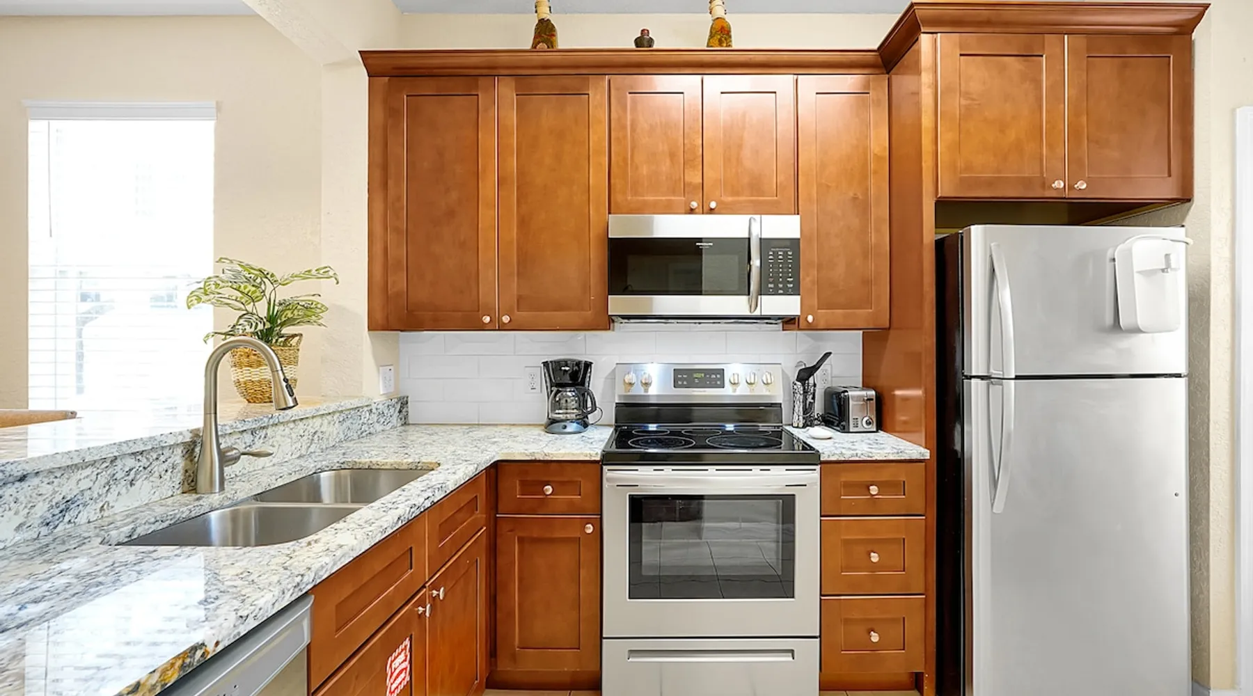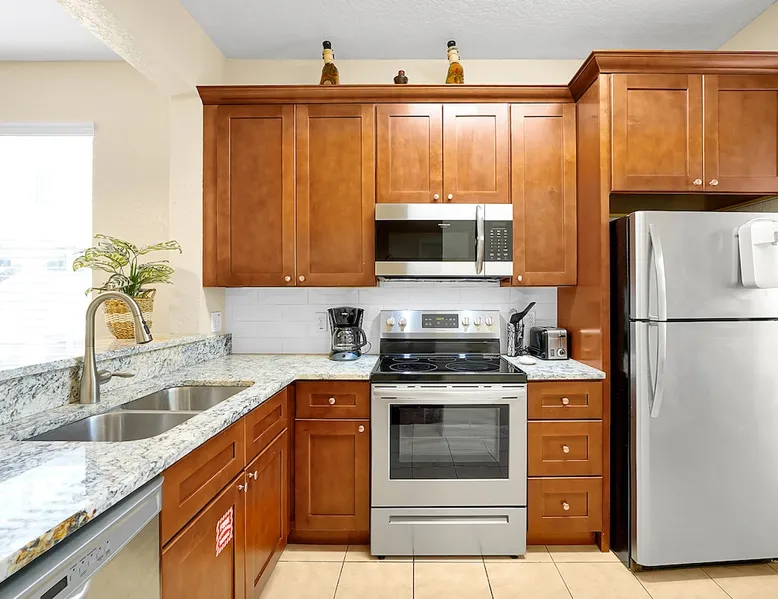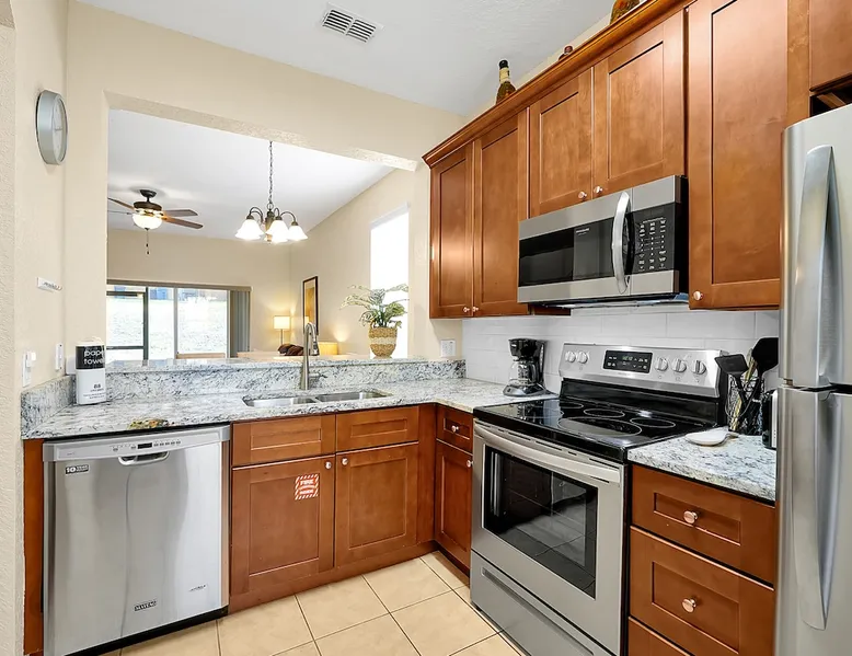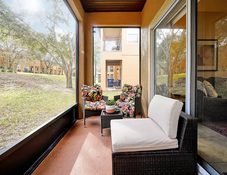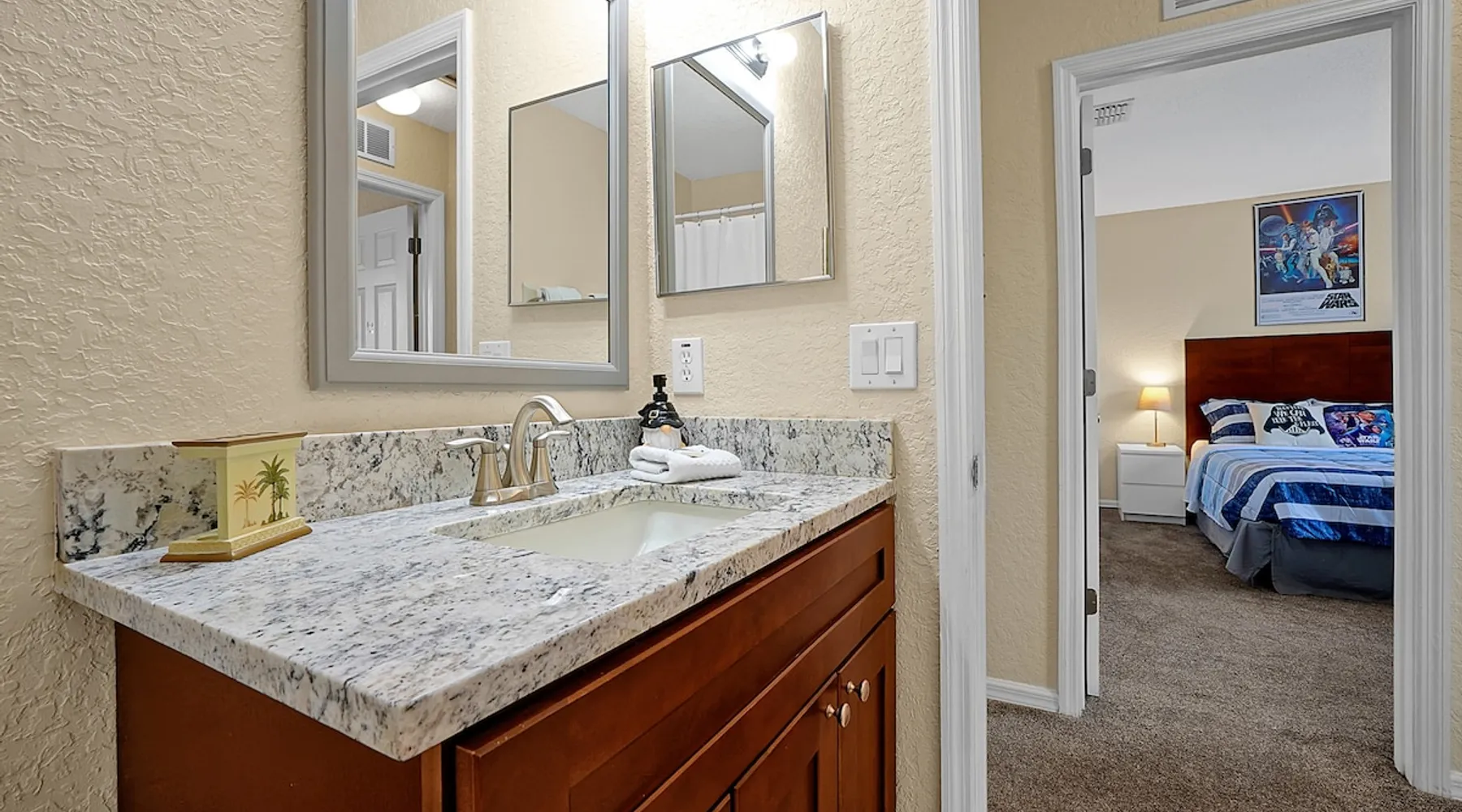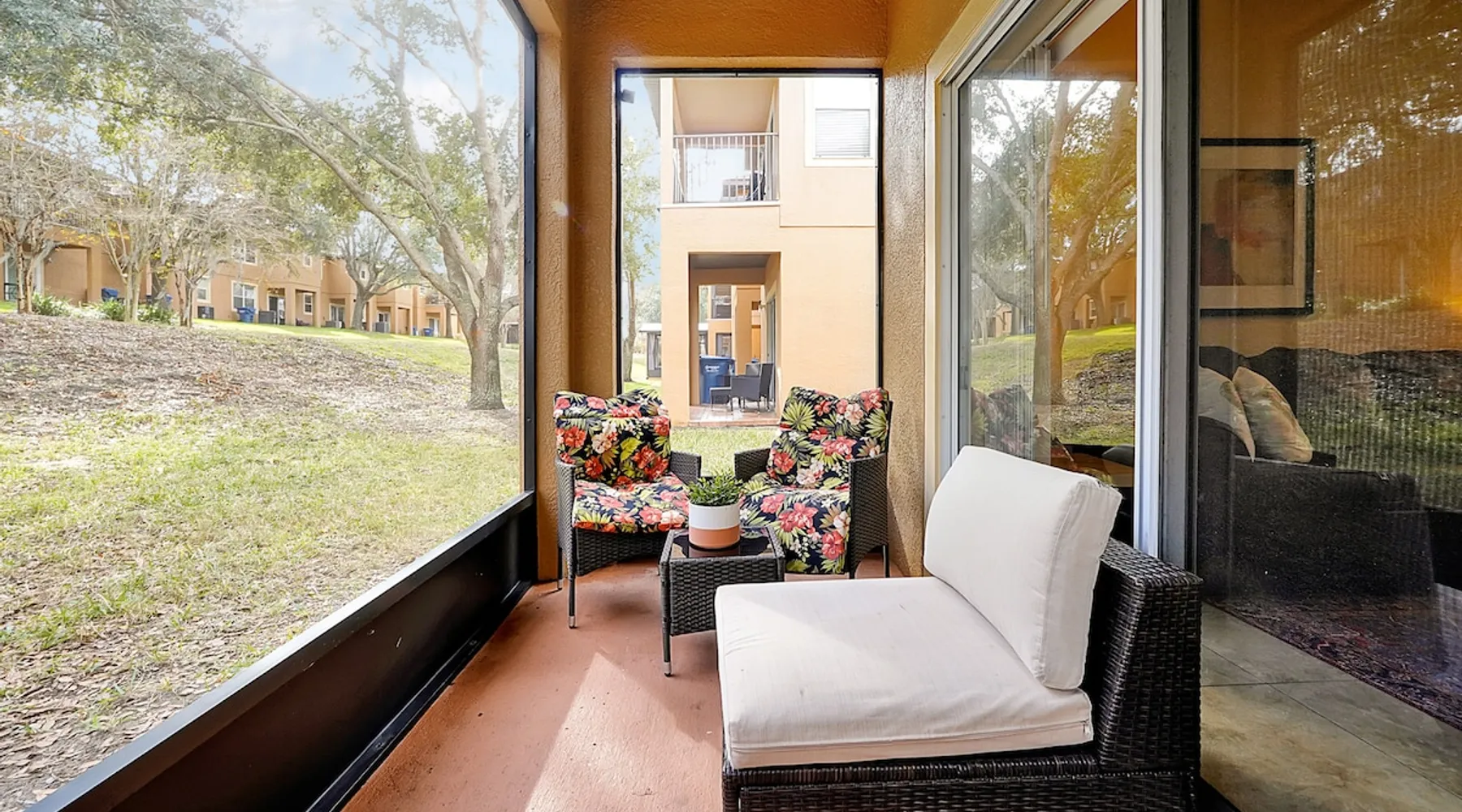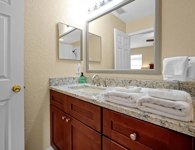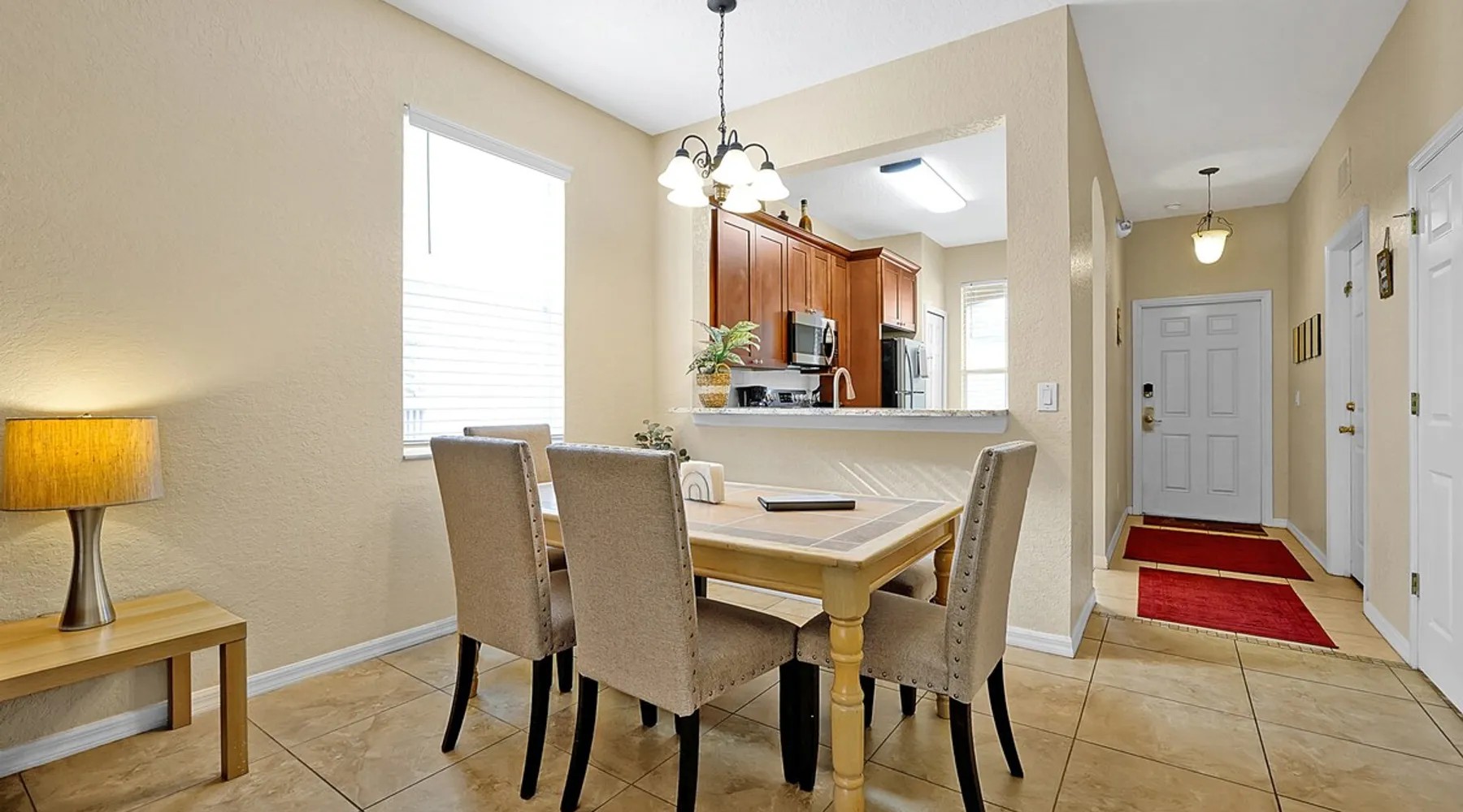 Regal Palms Resort with heated pool, lazy river, water slide, spa, gym, arcade, and on-site bar and restaurant. Just 25 minutes to Disney. Home includes fully equipped kitchen, balcony seating, spacious living areas, and ensuite bedrooms. Ideal for a comfortable family stay. The space BEDROOMS This 3-bedroom, 3-bathroom home in Regal Palms Resort is perfect for a relaxing family getaway. Enjoy access to a heated pool, lazy river, water slide, spa, gym, arcade, and on-site dining. The home features a fully equipped kitchen, balcony seating, and spacious living areas. Bedroom 1: King bed with ensuite (2nd floor) Bedroom 2: Queen bed (2nd floor) Bedroom 3: One full bed and a twin-over-twin bunk bed (2nd floor) KITCHEN, LOUNGE & DINING The living room offers a cozy and open space, with comfortable seating and direct access to the patio through sliding glass doors, allowing for natural light to brighten the area. The dining area is set just behind the living room, furnished with a simple yet functional table for shared meals. The kitchen is equipped with stainless steel appliances and granite countertops, providing a practical layout for daily cooking and basic meal prep. EXTERIOR This unit features two small outdoor seating areas—one fully screened for extra comfort and the other just outside the entrance. Both include cushioned chairs and offer a simple, cozy spot to relax with a garden view. UTILITIES This property includes essential utilities such as air conditioning, heating, and hot water for your comfort. The kitchen is fully equipped with stove, oven, dishwasher, and small appliances. Laundry facilities, Wi-Fi, and safety features like smoke and carbon monoxide detectors are provided. Security cameras and a smart lock offer added peace of mind. SECURITY For your safety, there’s a security camera at the front door monitoring the exterior. The home includes a smoke detector, carbon monoxide detector, fire extinguisher, and first aid kit. Your peace of mind is important to us. COMMUNITY DESCRIPTION Regal Palms Resort offers townhome-style accommodations with a wide array of family-friendly amenities. The highlight is a large pool area featuring a lazy river, waterslide, and hot tub. A full-service clubhouse includes a restaurant, fitness center, spa, and arcade. RESORT AMENITIES • Lazy river and waterslide • Zero-entry pool and hot tub • Clubhouse with restaurant and bar • Spa and fitness center • Game room • Playground DISTANCE TO NEARBY ATTRACTIONS • Walt Disney World Resort (20 min) – 13 miles • Universal Orlando Resort (35 min) – 26 miles • SeaWorld Orlando (30 min) – 22 miles • Disney Springs (25 min) – 16 miles • ChampionsGate Golf Club (10 min) – 5 miles • Posner Park (12 min) – 6 miles • LEGOLAND Florida (40 min) – 29 miles • Orlando Vineland Premium Outlets (30 min) – 20 miles • Old Town Kissimmee (20 min) – 14 miles • Lake Louisa State Park (30 min) – 21 miles EXTRA FEES Pet Fee: $100 / pet (However, due to severe allergies, cats are not allowed) Resort fee: $22 / day Create lifelong memories at this relaxing retreat, complete with resort-style amenities and close proximity to Orlando’s best attractions. Book your stay today and enjoy the perfect mix of relaxation and adventure! Guest access Upon your arrival, head to the clubhouse to check-in. There, you'll pay a $22 per day resort fee for your party—not per person. You'll also register your vehicle to receive a hanging tag and collect wristbands for your group. These wristbands grant access through the Sand Mine Rd. guard gate. After you've passed through, simply take a right to arrive at your townhome. Other things to note Additional Details: Pet-Friendly: Dogs welcome for $100/pet (no cats due to allergies). Christmas Tree Rental: Available for $200 (7ft tree). Pool Heating: Available through the resort for an additional fee. Starter amenities provided for your convenience, including toiletries and kitchen essentials. Enjoy the resort amenities for a $22 per day resort fee for your party