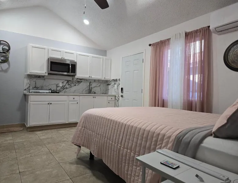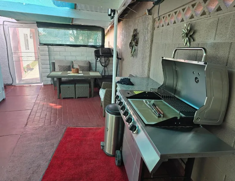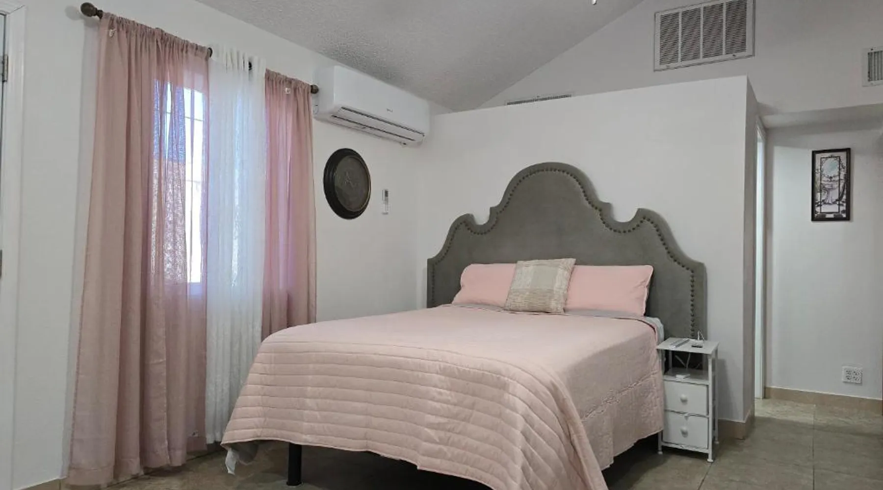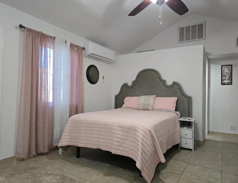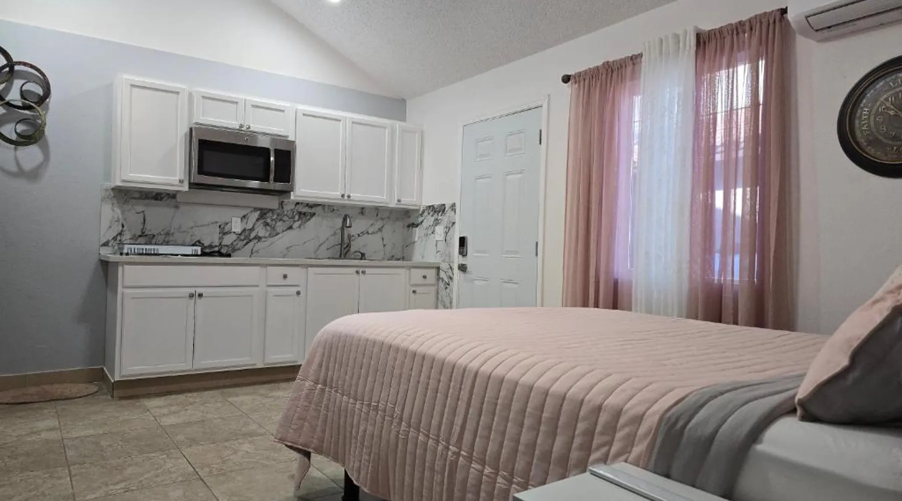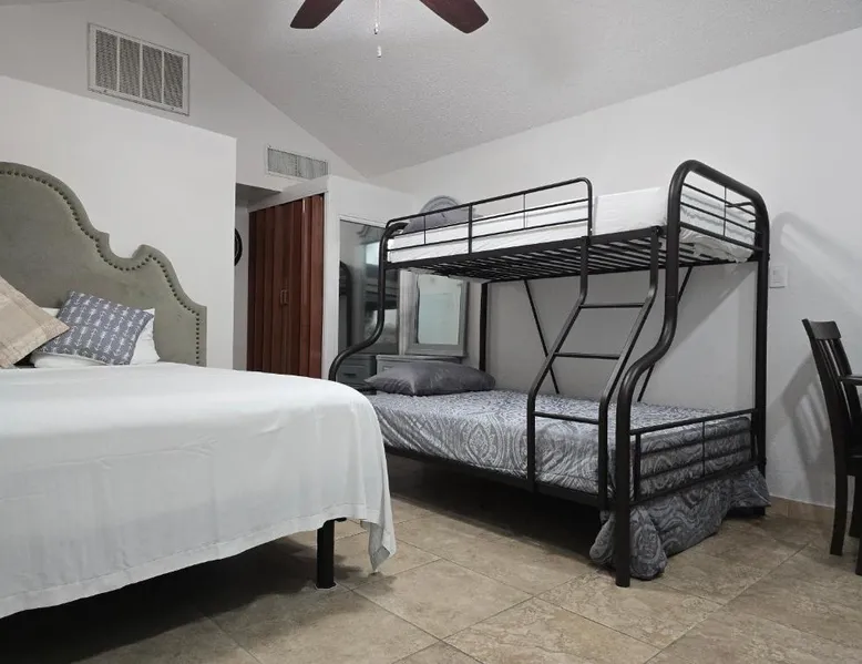 Comfortable Living: Rocas del sol in Las Vegas offers a one-bedroom apartment with a terrace and free WiFi. The property features family rooms, full-day security, and free on-site private parking. Modern Amenities: The apartment includes air-conditioning, a kitchenette, kitchen, hairdryer, seating area, free toiletries, shower, TV, tiled floors, and a wardrobe. Convenient Location: Located 11 mi from Harry Reid International Airport, the apartment is near attractions such as The Neon Museum (5.6 mi), Mob Museum (6.8 mi), and Fremont Street Experience (6.8 mi). This apartment comes with 1 living room, 1 separate bedroom and 1 bathroom with a shower and free toiletries. The apartment's kitchen is available for cooking and storing food. The apartment has tiled floors, a seating area with a flat-screen TV, air conditioning, a wardrobe, as well as heating. The unit has 2 beds.