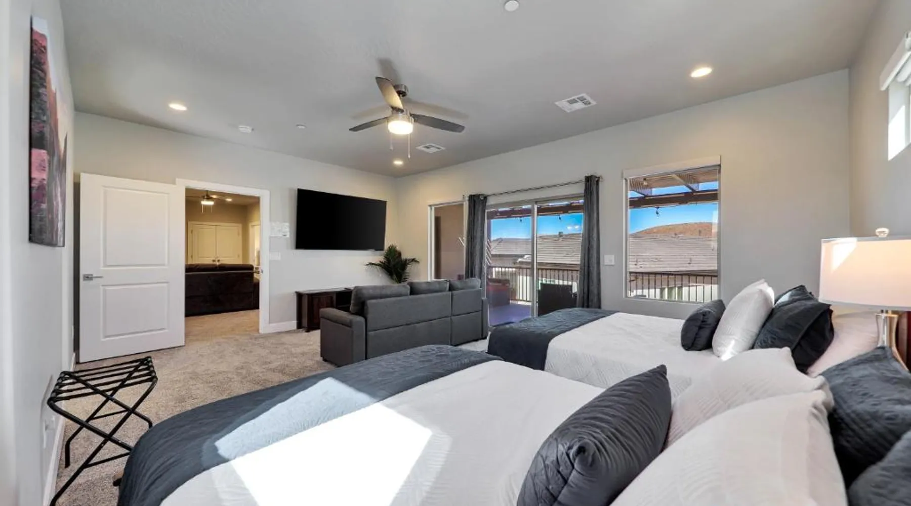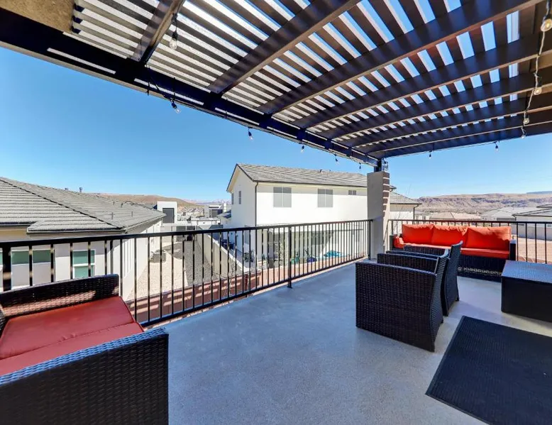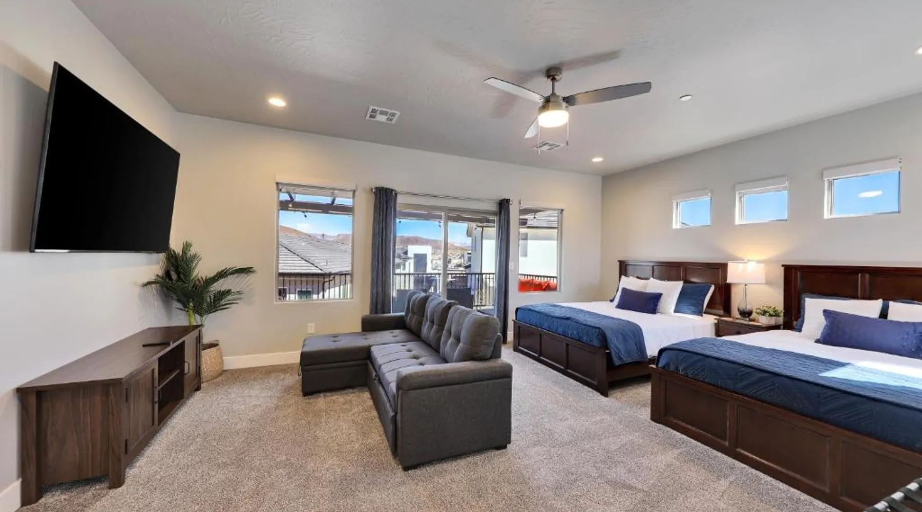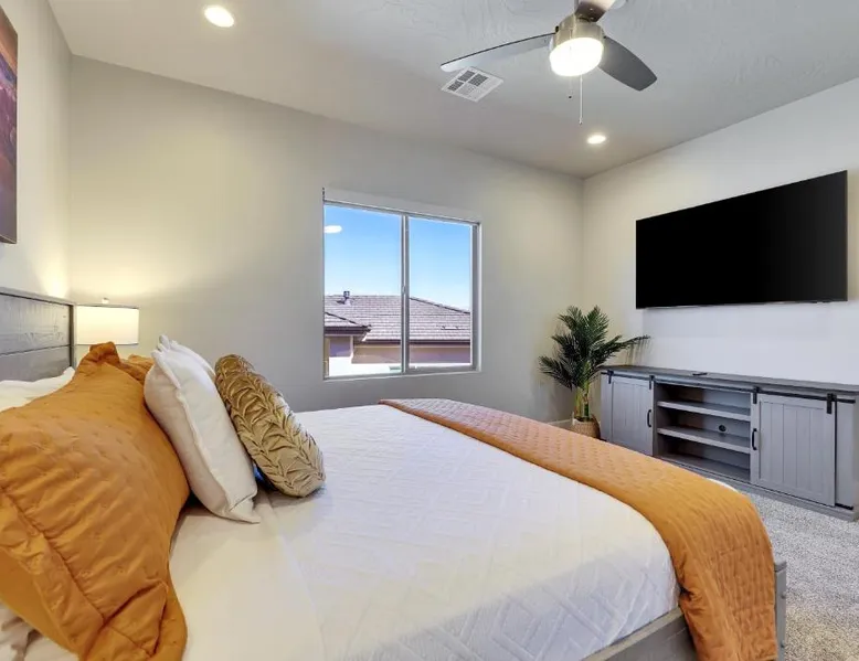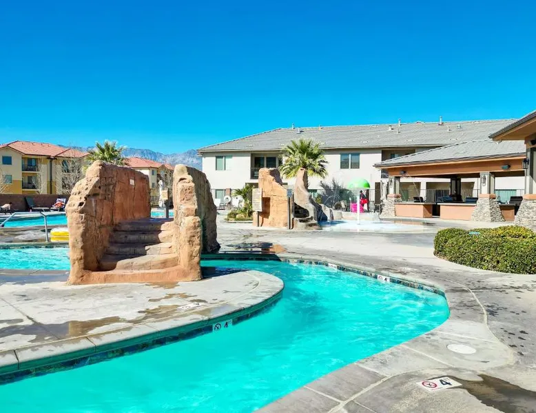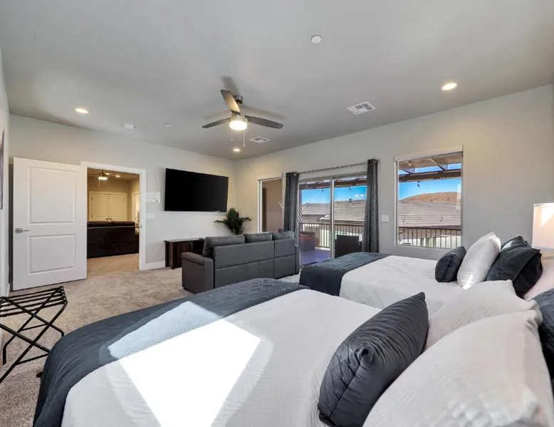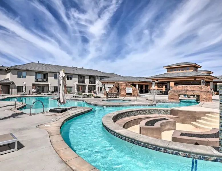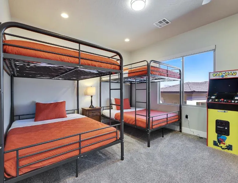 Spacious Accommodations: Zion Village PLAYcation - 2 in Hurricane offers a spacious holiday home with six bedrooms and four bathrooms. The property features a terrace, balcony, and mountain views. Leisure Facilities: Guests can enjoy an outdoor swimming pool, outdoor fireplace, steam room, fitness room, hot tub, and children's playground. Additional amenities include a games room and outdoor seating area. Convenient Location: Located 22 mi from St. George Regional Airport, the property is near attractions such as St George Temple (17 mi) and Pine Valley Chapel (13 mi). Skiing and cycling activities are available nearby. This holiday home's special feature is the hot tub. Featuring a private entrance, this spacious holiday home also consists of 6 bedrooms, a seating area and 4 bathrooms with a walk-in shower and a hairdryer. Guests will find a stovetop, a refrigerator, a dishwasher and kitchenware in the fully equipped kitchen. The holiday home also provides guests with a barbecue. This air-conditioned holiday home consists of a dining area, a TV with streaming services a washing machine and a terrace. The unit offers 13 beds.