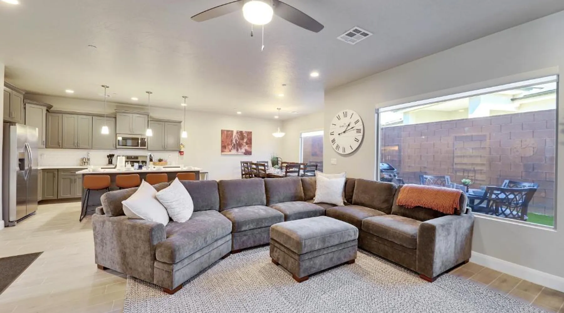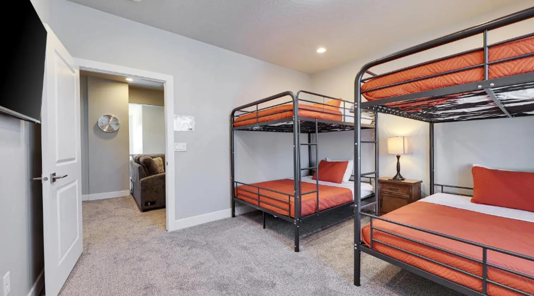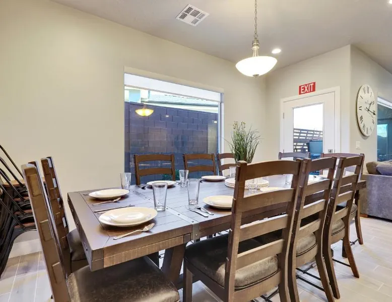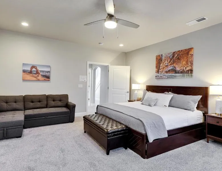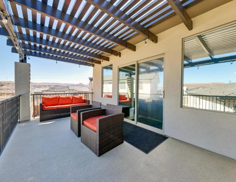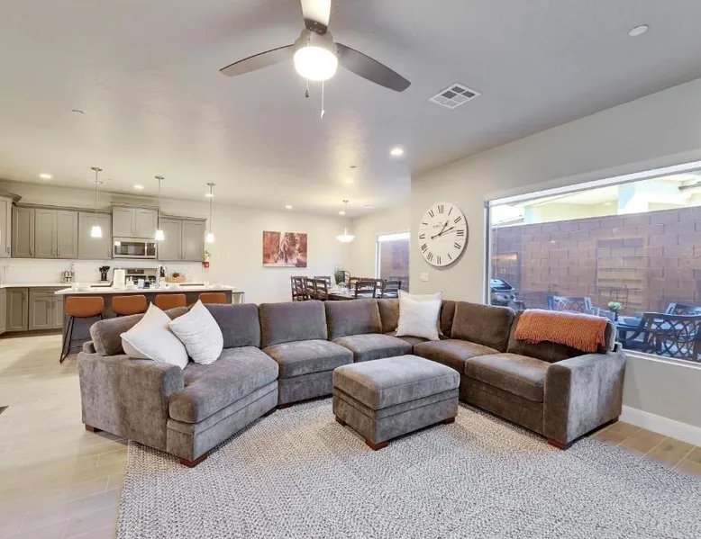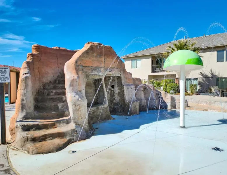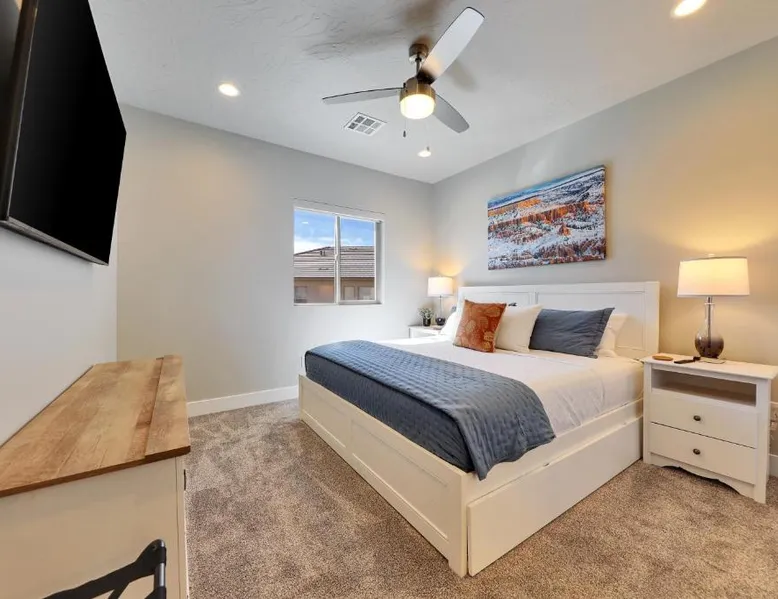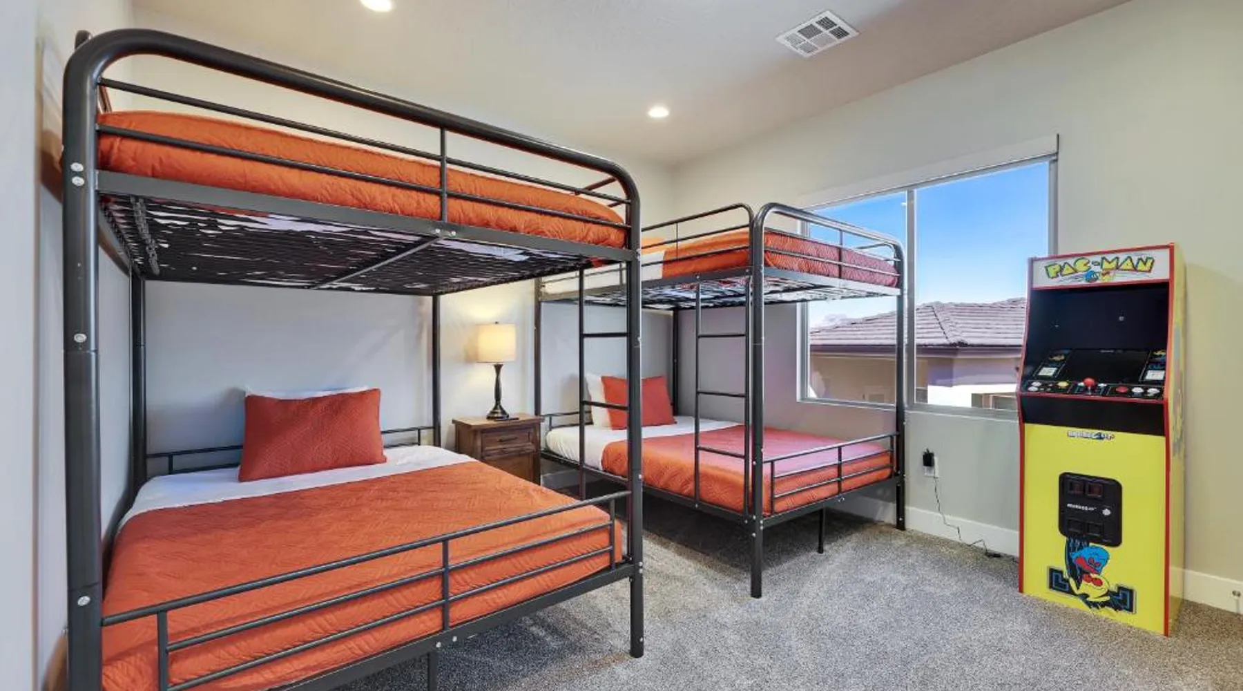Spacious Accommodations: Zion Village PLAYcation - 2 in Hurricane offers a spacious holiday home with six bedrooms and four bathrooms. The property features a terrace, balcony, and mountain views. Leisure Facilities: Guests can enjoy an outdoor swimming pool, outdoor fireplace, steam room, fitness room, hot tub, and children's playground. Additional amenities include a games room and outdoor seating area. Convenient Location: Located 22 mi from St. George Regional Airport, the property is near attractions such as St George Temple (17 mi) and Pine Valley Chapel (13 mi). Skiing and cycling activities are available nearby. This holiday home's special feature is the hot tub. Featuring a private entrance, this spacious holiday home also consists of 6 bedrooms, a seating area and 4 bathrooms with a walk-in shower and a hairdryer. Guests will find a stovetop, a refrigerator, a dishwasher and kitchenware in the fully equipped kitchen. The holiday home also provides guests with a barbecue. This air-conditioned holiday home consists of a dining area, a TV with streaming services a washing machine and a terrace. The unit offers 13 beds.