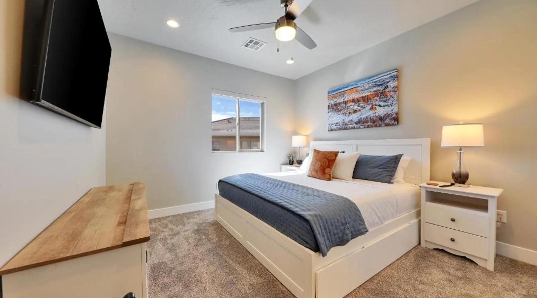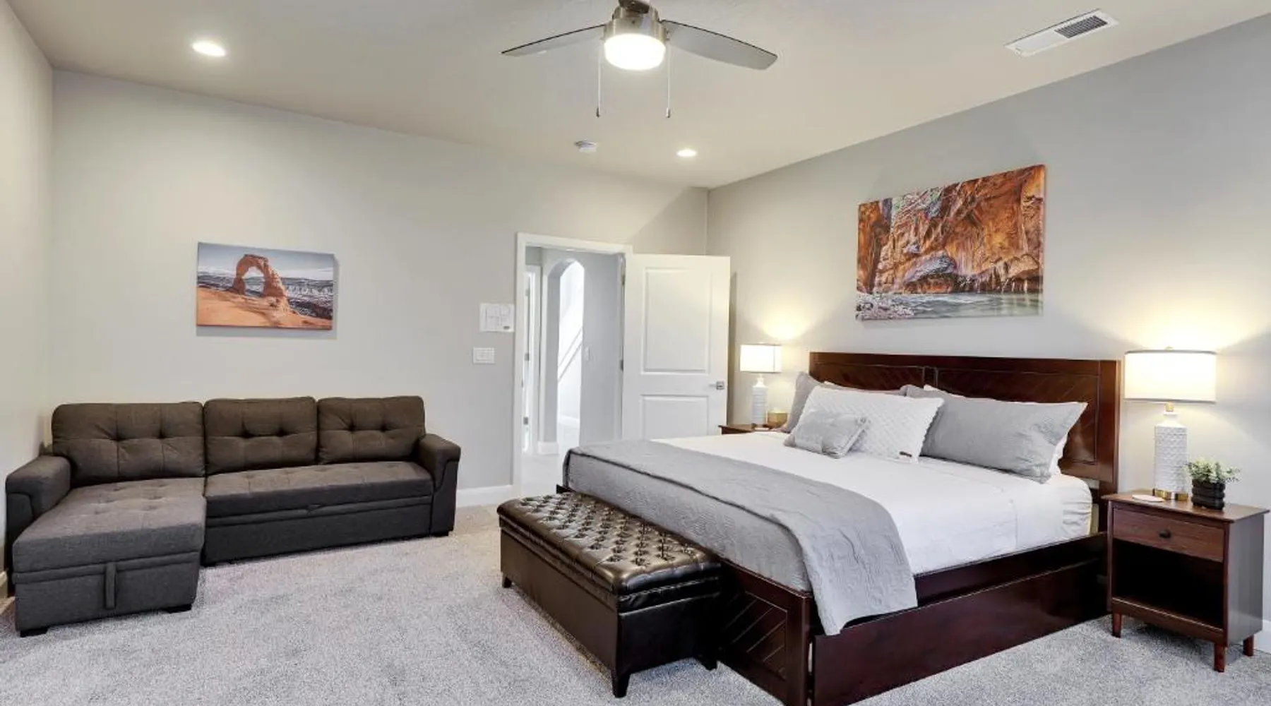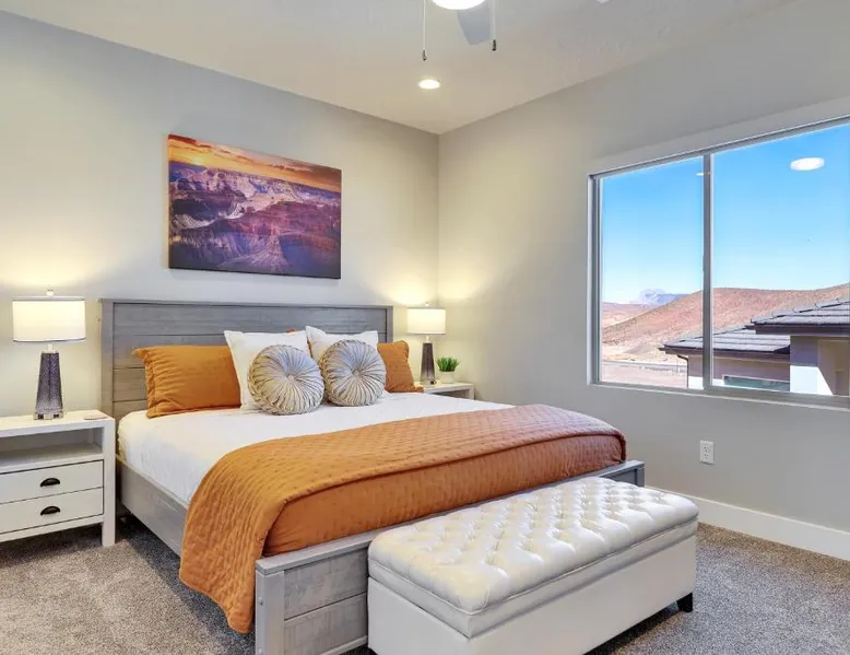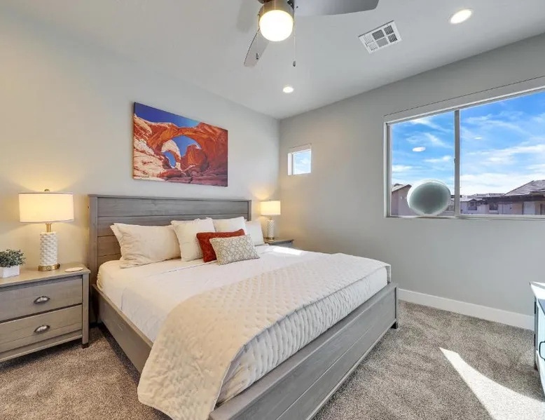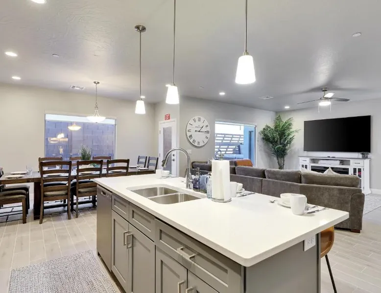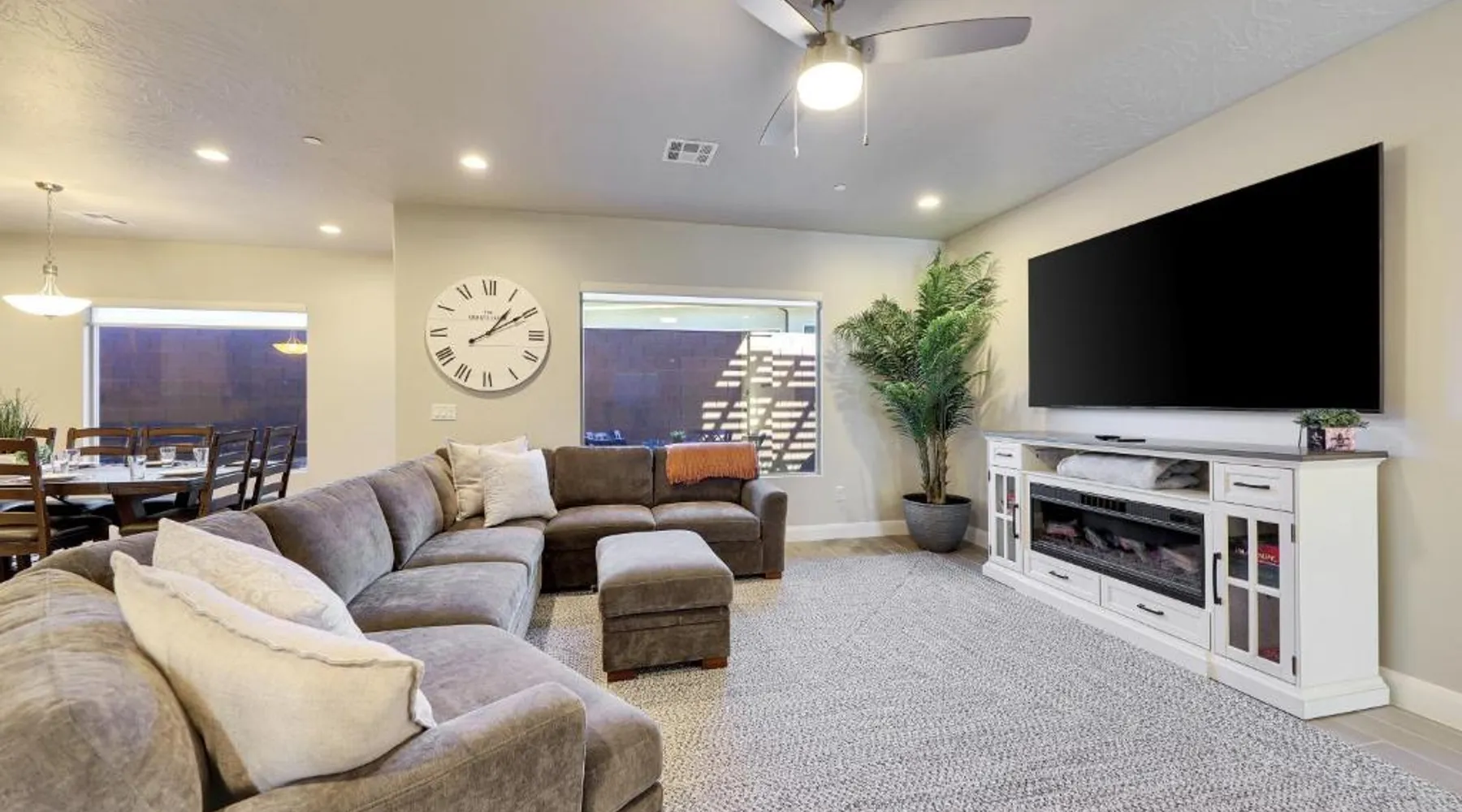 Spacious Accommodations: Zion Village PLAYcation - 2 in Hurricane offers a spacious holiday home with six bedrooms and four bathrooms. The property features a terrace, balcony, and mountain views. Leisure Facilities: Guests can enjoy an outdoor swimming pool, outdoor fireplace, steam room, fitness room, hot tub, and children's playground. Additional amenities include a games room and outdoor seating area. Convenient Location: Located 22 mi from St. George Regional Airport, the property is near attractions such as St George Temple (17 mi) and Pine Valley Chapel (13 mi). Skiing and cycling activities are available nearby. This holiday home's special feature is the hot tub. Featuring a private entrance, this spacious holiday home also consists of 6 bedrooms, a seating area and 4 bathrooms with a walk-in shower and a hairdryer. Guests will find a stovetop, a refrigerator, a dishwasher and kitchenware in the fully equipped kitchen. The holiday home also provides guests with a barbecue. This air-conditioned holiday home consists of a dining area, a TV with streaming services a washing machine and a terrace. The unit offers 13 beds.