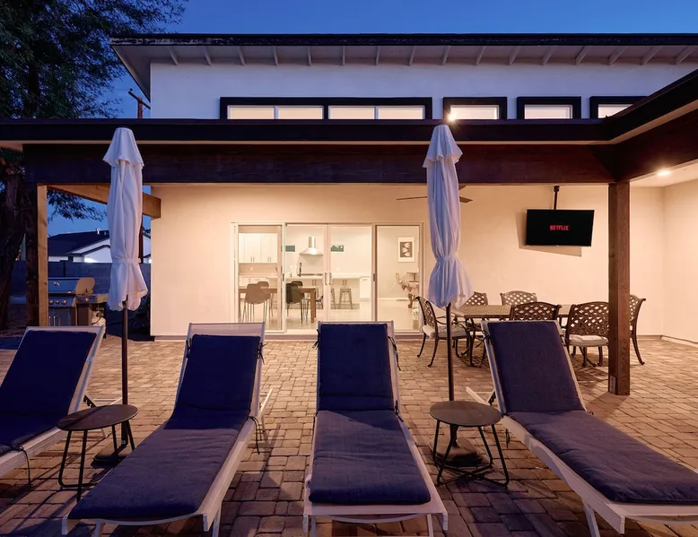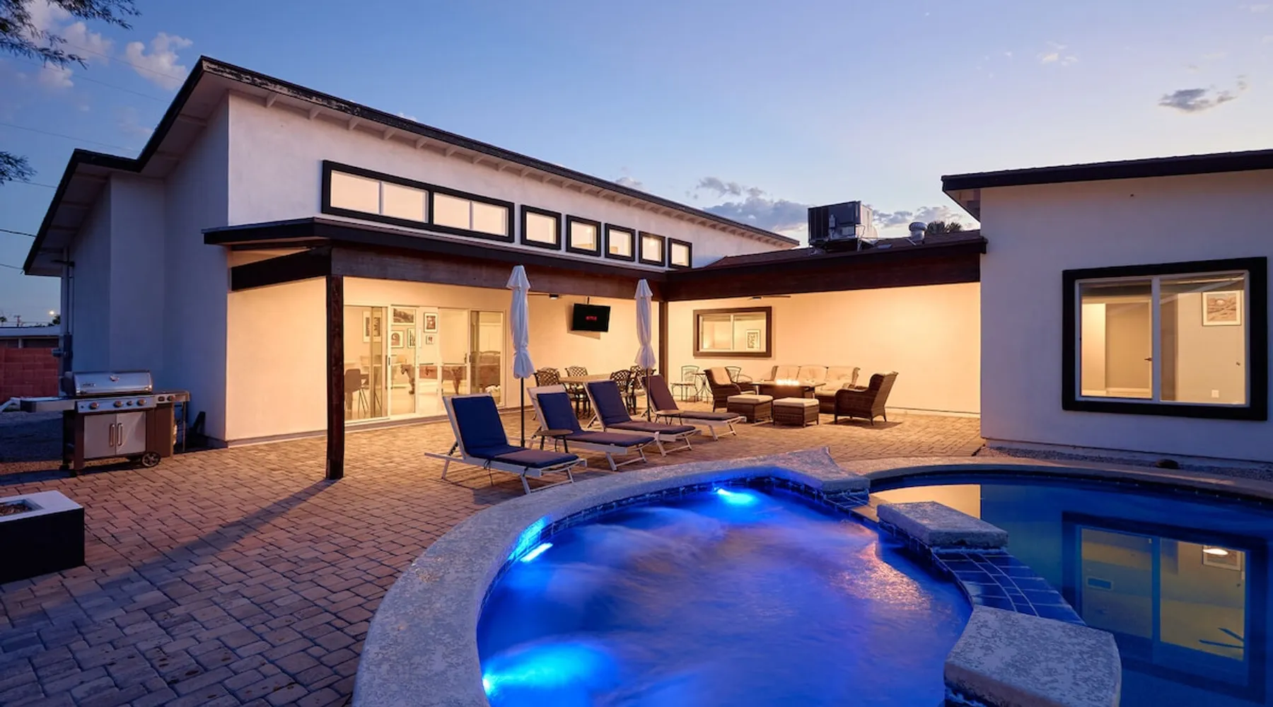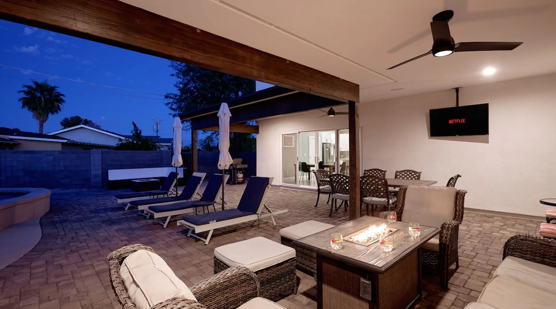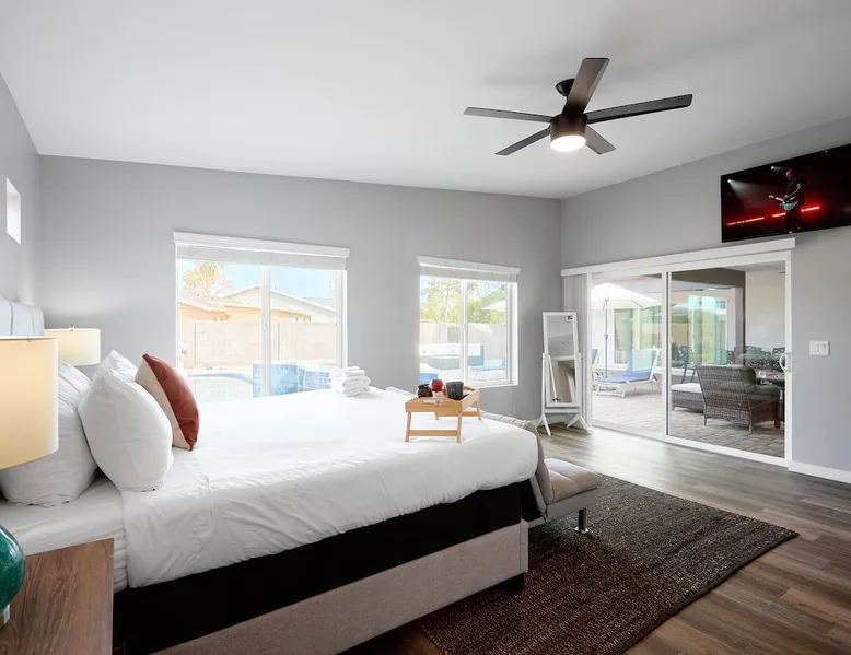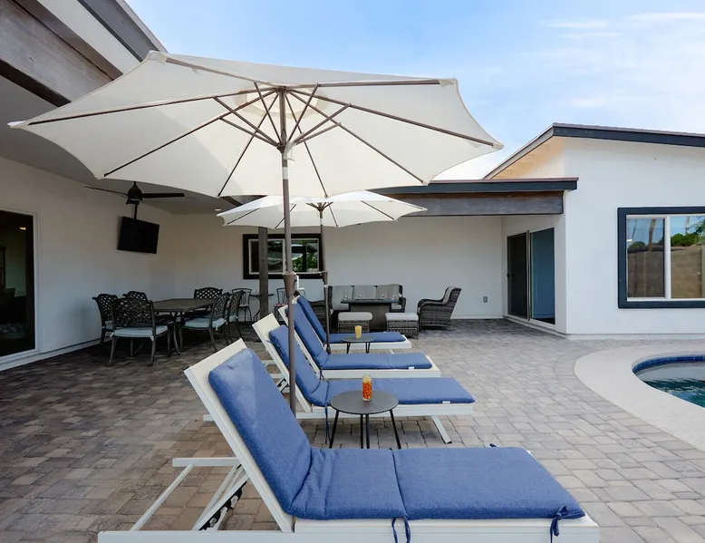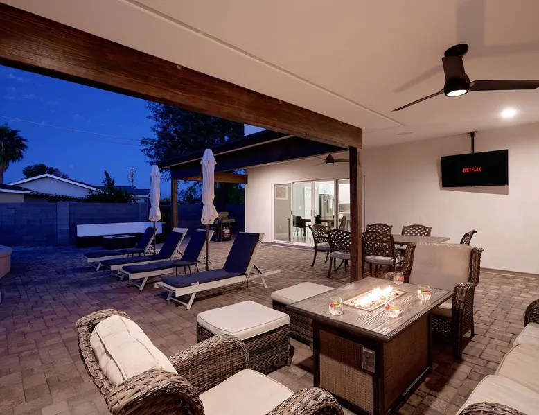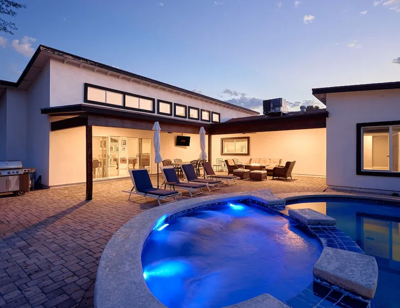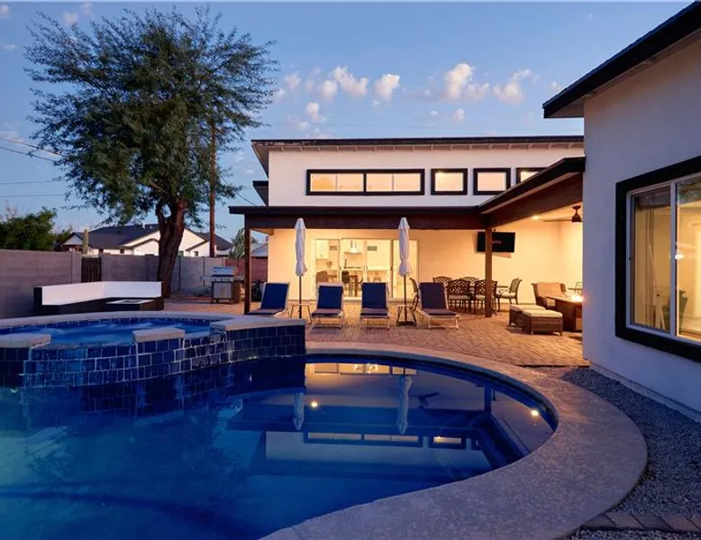 Welcome to Elysium, your Scottsdale escape where fun, relaxation, and style come together. Just minutes from Old Town Scottsdale and Fashion Square, spend your days lounging poolside under Arizona’s sunshine. In the evenings, gather around the fire pit for cozy stories or soak in the hot tub under the stars. Inside, the open-concept living areas are perfect for holiday celebrations, bachelorette parties, or any festive getaway. Your ultimate Arizona retreat begins at Elysium. The space IF YOU ARE INTERESTED IN THIS PROPERTY, PLEASE READ THE LISTING ENTIRELY. By booking, the guest agrees they have read all the details about the property and agree to our terms and conditions. ⭐ Amenities: - 5 mins to Old Town Scottsdale! - Private pool & hot tub – spa heat available for $50 a night - Fully fenced private yard with fire pit, corn hole, horse shoes, pool loungers and more - Covered patio with outdoor dining, BBQ grill, outdoor ceiling fans, and smart TV - Fully equipped kitchen with large island, bar seating & formal dining area - Smart TVs in all bedrooms - Open floor living area connecting dining area, living area, and kitchen - perfect for entertaining! - Indoor pool table - Ceiling fans throughout the whole house 🛋️ Living Areas: - Open concept living space - Cozy furnishings and smart TV - Pool table for game nights - Direct access to the backyard 🍽️ Kitchen & Dining: - Fully equipped kitchen - Stainless steel appliances - Fridge, dishwasher, single oven, 6-burner stove, microwave, & toaster - Drip coffee maker with coffee - Dining table for 6 guests - Bar seating for 5 guests - Open counter space - Kitchen Starter Kit: 2 dishwashing tablet, dish soap, 1 dish sponge, 2 laundry detergent pods, disinfectant wipes, 2 paper towel rolls, 2 trash bags, 1 coffee bag, and 4 coffee filters. 🛌 Bedrooms: - Primary Bedroom: King bed with a smart TV and en-suite bathroom - 2nd Bedroom: 2 Queen beds with a smart TV and en-suite bathroom - 3rd Bedroom: Full bed with a smart TV - 4th Bedroom: Queen bed with a smart TV - 5th Bedroom: Queen bed with a smart TV 🛁 Bathrooms: - Primary Bathroom: Dual vanity with a large stand-in shower - 2nd Bathroom: Single vanity with a stand-in shower 3rd Bathroom: Dual vanity with a shower/tub combo - Bathroom Starter Kits: 1 shampoo, 1 conditioner, 1 body wash, 1 body bar soap, 1 hand bar soap, 1 makeup wipe, 1 liner for trash can. 🚗 Parking: - 2 parking spots in the driveway - Additional street parking is available ❗️Notes to Guests & Important Details: - In compliance with city regulations, one of the outdoor firepits is currently unavailable for use. We apologize for any inconvenience. Interested in Pool Heat? This particular home does offer spa heat, spa heat is $50/night and only available for the full duration of your stay. We require 5 days' notice from check-in if you wish to add this amenity to your stay. This home does not currently have a pool heater. GoodNight Stay manages hundreds of homes throughout the Scottsdale/Phoenix Metropolitan area. If this is a required amenity for your stay, please inquire for alternative options. 🗺️ Explore the Area: 3 mins: The Eleanor 3 mins: Continental Golf Club 3 mins: Uncle Sal's 4 mins: Scottsdale Stadium 5 mins: Old Town Scottsdale 5 mins: Arizona Canal 6 mins: Entertainment District 6 mins: Chaparral Park 7 mins: Scottsdale Fashion Square 7 mins: Sloan Park 8 mins: OdySea Aquarium 8 mins: Butterfly Wonderland 8 mins: Octane Raceway 8 mins: Mavrix Entertainment 8 mins: Topgolf 8 mins: Talking Stick Resort and Casino 8 mins: Talking Stick Golf Club 8 mins: Salt River Fields 8 mins: Tempe Town Lake 8 mins: Arizona State University 10 mins: Arcadia, Arizona 10 mins: Paradise Valley, Arizona 10 mins: Phoenician Golf Club 10 mins: Desert Botanical Garden 11 mins: Phoenix Zoo 11 mins: Silverado Golf Club 12 mins: Phoenix Sky Harbor 13 mins: StarFire Golf Club 13 mins: Barrett Jackson Westworld - Arabian Horse Show 14 mins: Camelback Mountain 15 mins: TPC Scottsdale - Waste Management - Phoenix Open 17 mins: Scottsdale Quarter 17 mins: Kierland Commons 19 mins: Chase Field - Diamondbacks 19 mins: Footprint Center - Phoenix Suns 30 mins: State Farm Stadium - Arizona Cardinals Add Ons: - Air Mattresses ($50 - 1 per reservation) - GoodNight Stay is partnered with the best baby equipment rental service for additional equipment! Please inquire if you'd like to take advantage of this amenity using our special link. Please note: This is an add-on and not included in your reservation. Additional House Rules: - Booking guests must be at least 25 years old. - Same-day move-ins shall not be honored after 10 am Arizona Time. - All guests with a confirmed criminal record shall be declined and asked to cancel the booking at their own expense. - The guest agrees to provide identity authentication via a third-party platform operating for GoodNight Stay. They will authenticate the name, address, phone number, and photo ID verification. If this is not provided within 48 hours of booking, GoodNight Stay has the right to cancel the booking without penalty. - Maximum of 2 pets under 35lbs each, $100 fee per pet required. - Unfortunately, additional items cannot be provided if requested as these are to kick-start your stay. - All listed amenities are to be used at the guest s risk. The homeowner and GoodNight Stay are not liable in any way for the risk, danger, injury, or damages caused to the other party. - Parties, events, or weddings are not allowed. - City of Scottsdale requires no more than 6 non-related adults per home not including children TPT License Number:21187591 Guest access Guests have access to the entire property and outdoor space. Other things to note All our properties include all the essentials and needs to allow for a comfortable and enjoyable stay! The items listed below are provided in every single one of our properties: o Starter Kits for kitchen and bathrooms! - Kitchen set includes: 2 dishw