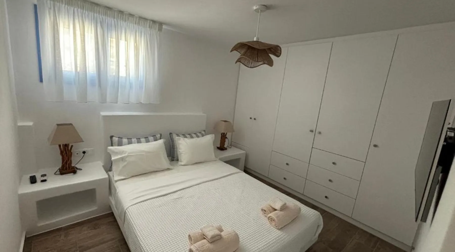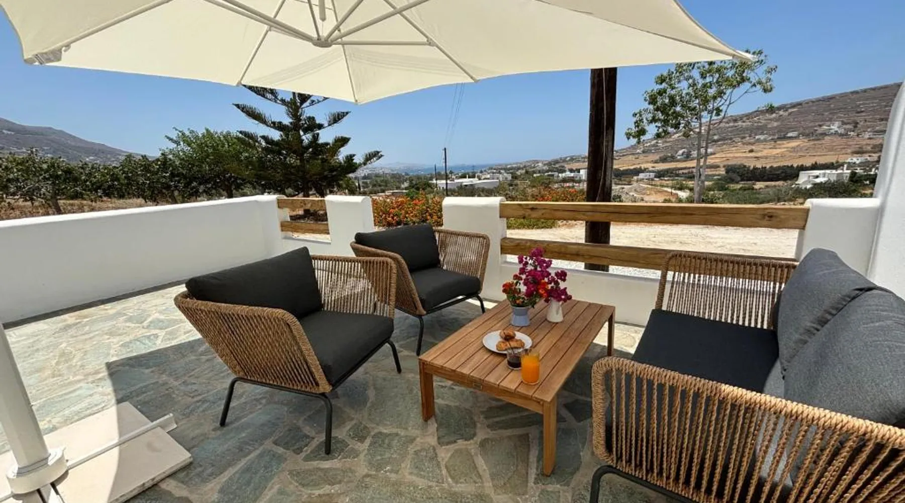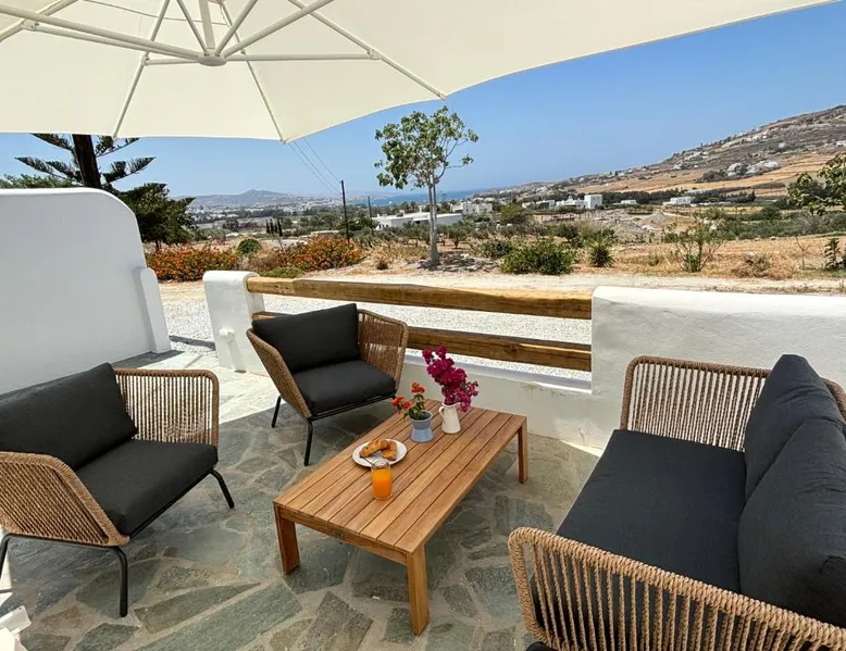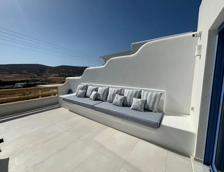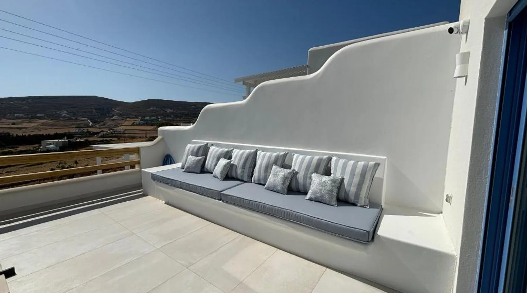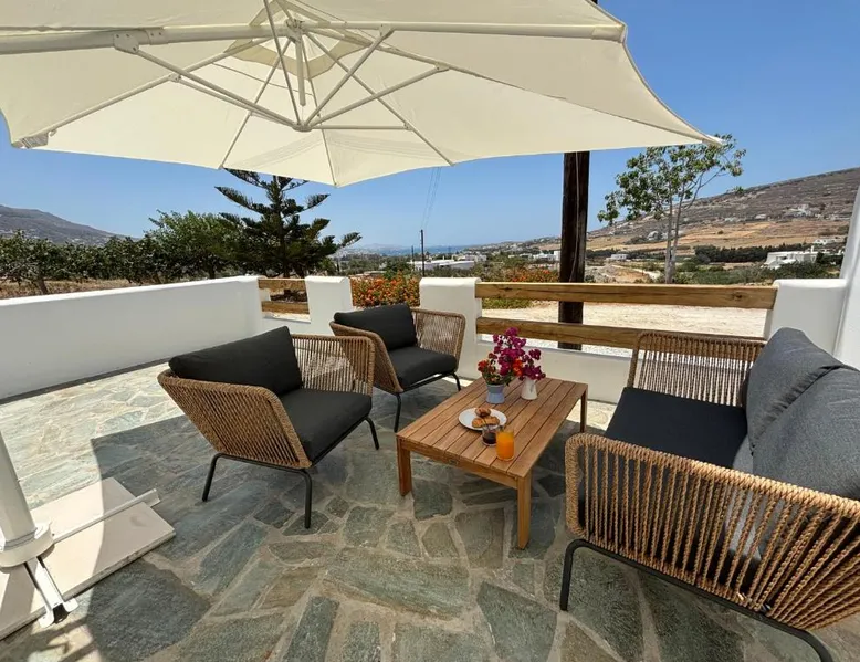 Sun Terrace and Garden: Paros Relux in Kampos Paros offers a sun terrace and a lush garden. Guests can relax in the outdoor seating area and enjoy sea views. Free WiFi is available throughout the apartment. Comfortable Amenities: The apartment features air-conditioning, a terrace, and a kitchenette. Additional amenities include a balcony, washing machine, and private bathroom. Free on-site private parking is provided. Convenient Location: Located 8.1 mi from Paros National Airport, the property is near Livadia (1.3 mi), Archaeological Museum of Paros and Church of Ekatontapyliani (1.8 mi), Venetian Harbor and Castle (5 mi), and Paros Park (5 mi). Featuring a private entrance, this air-conditioned apartment consists of 1 living room, 2 separate bedrooms and 1 bathroom with a walk-in shower and a bath. Guests can make meals in the kitchen that is equipped with a stovetop, a refrigerator, a dishwasher and kitchenware. The spacious apartment provides a washing machine, soundproof walls, a tea and coffee maker as well as a terrace with sea views. The unit offers 5 beds.